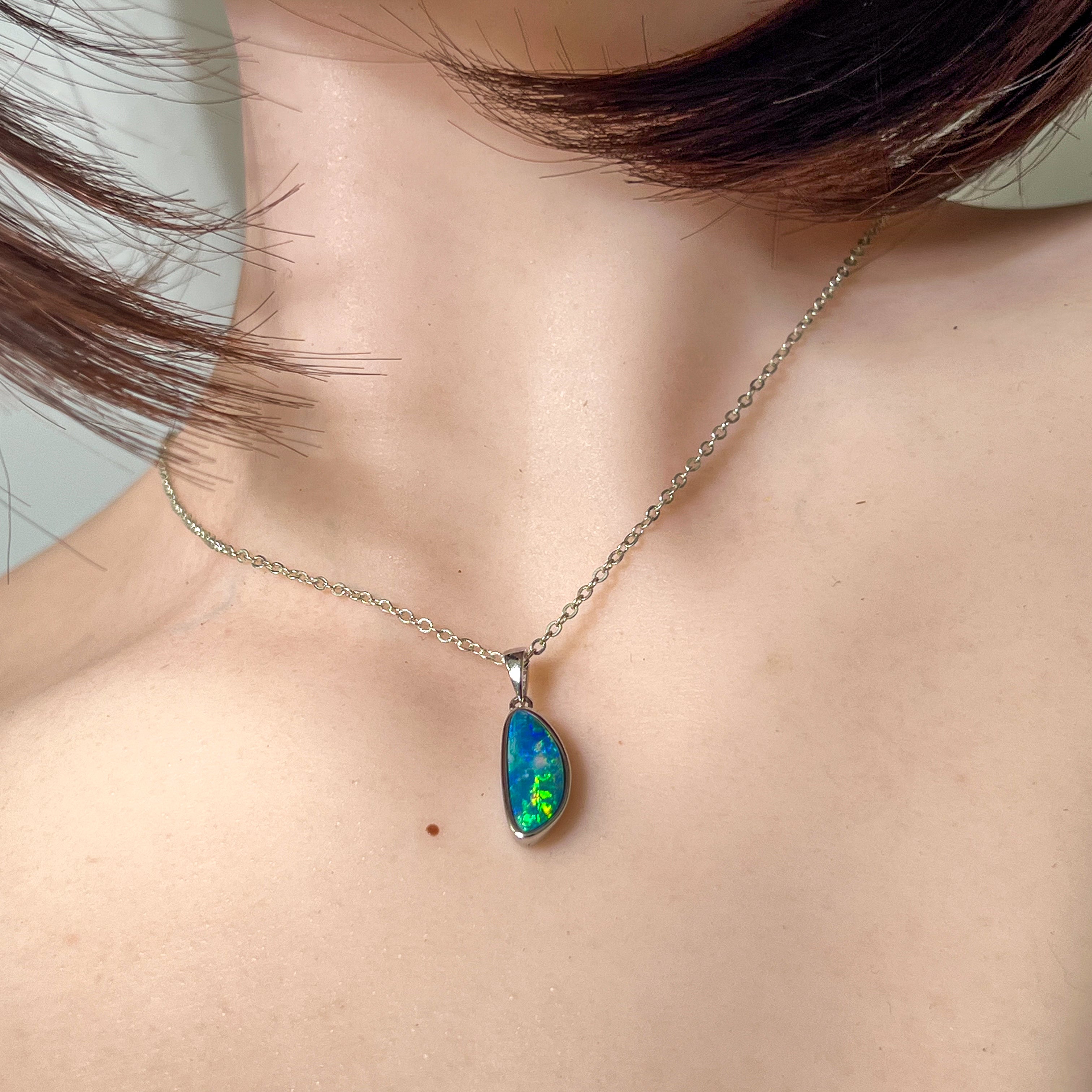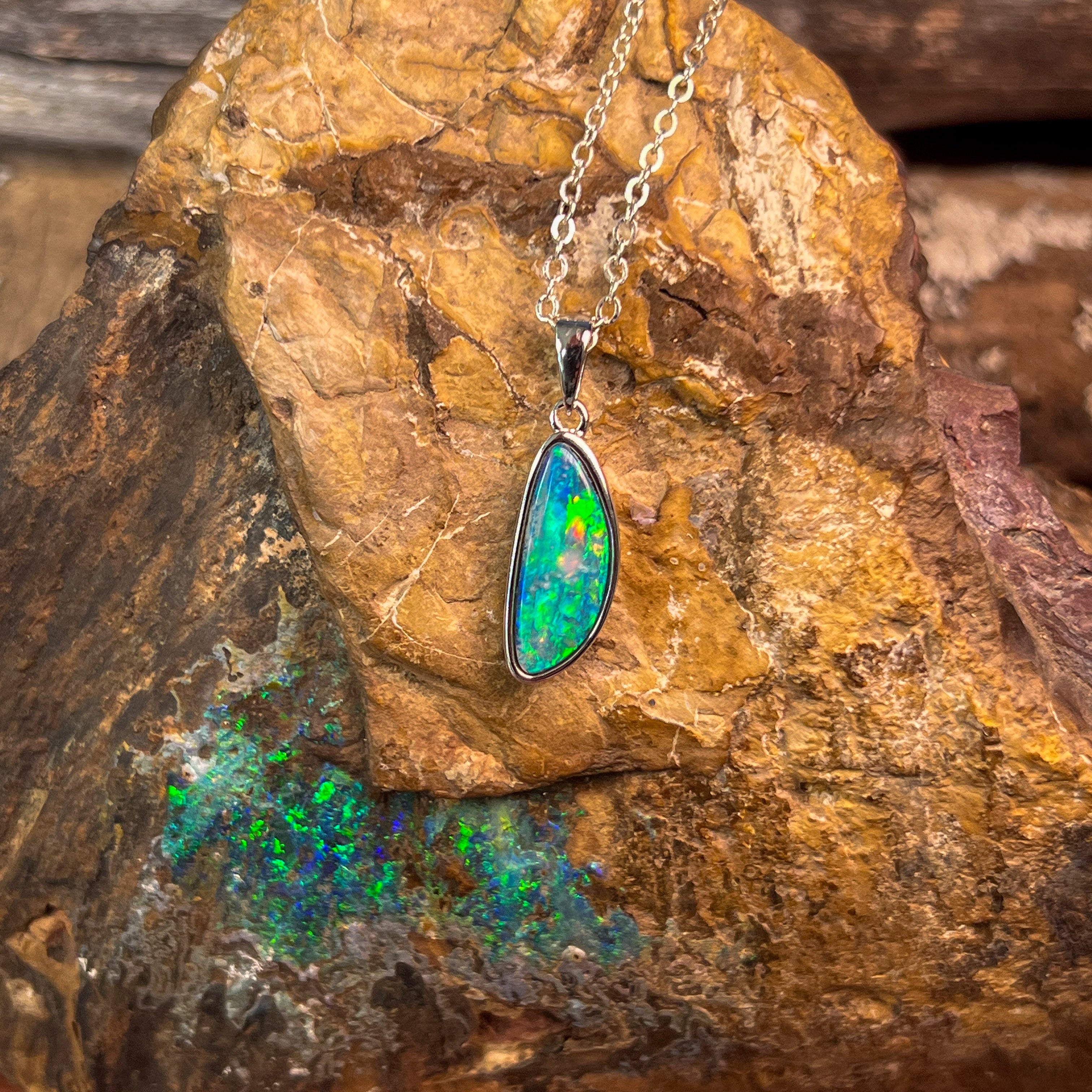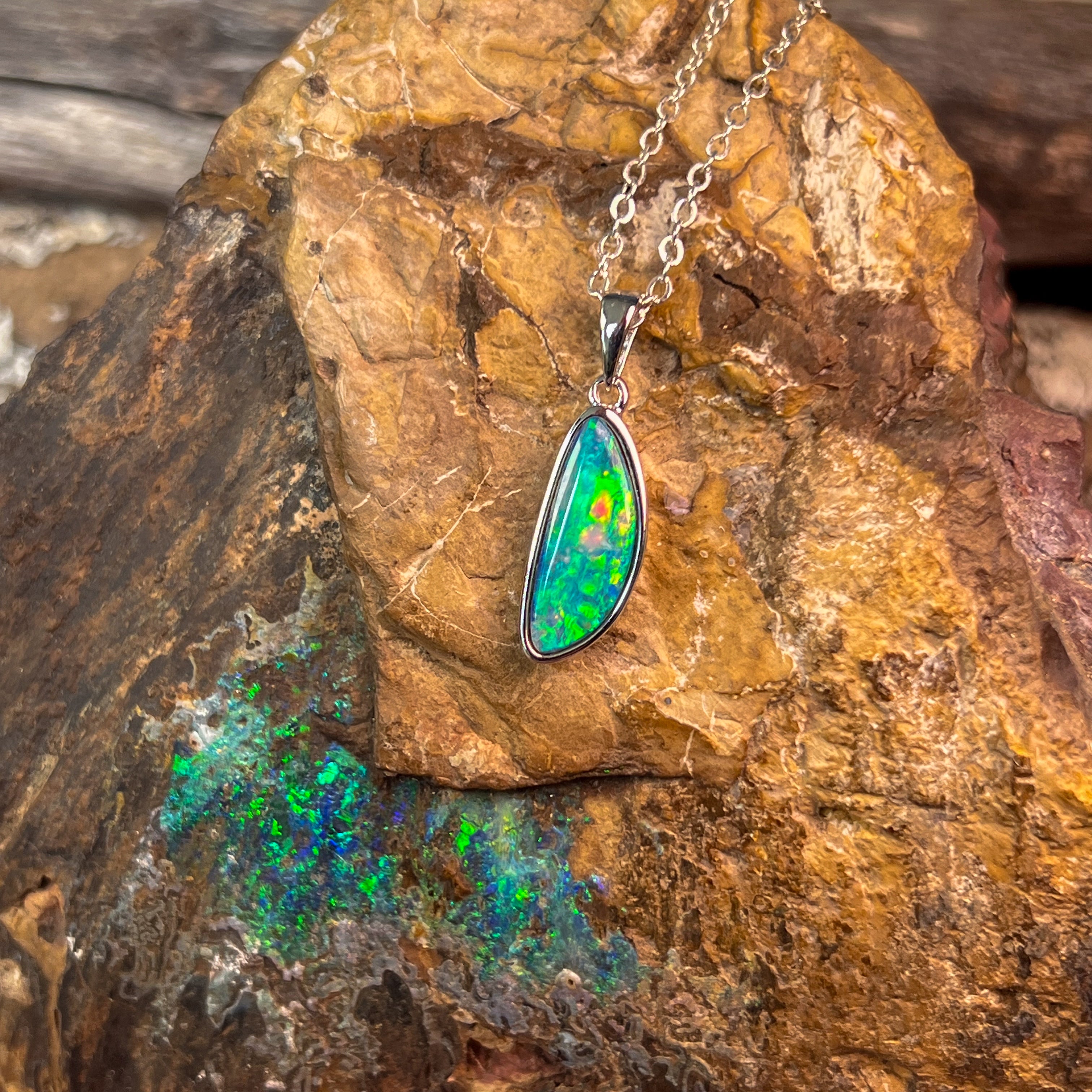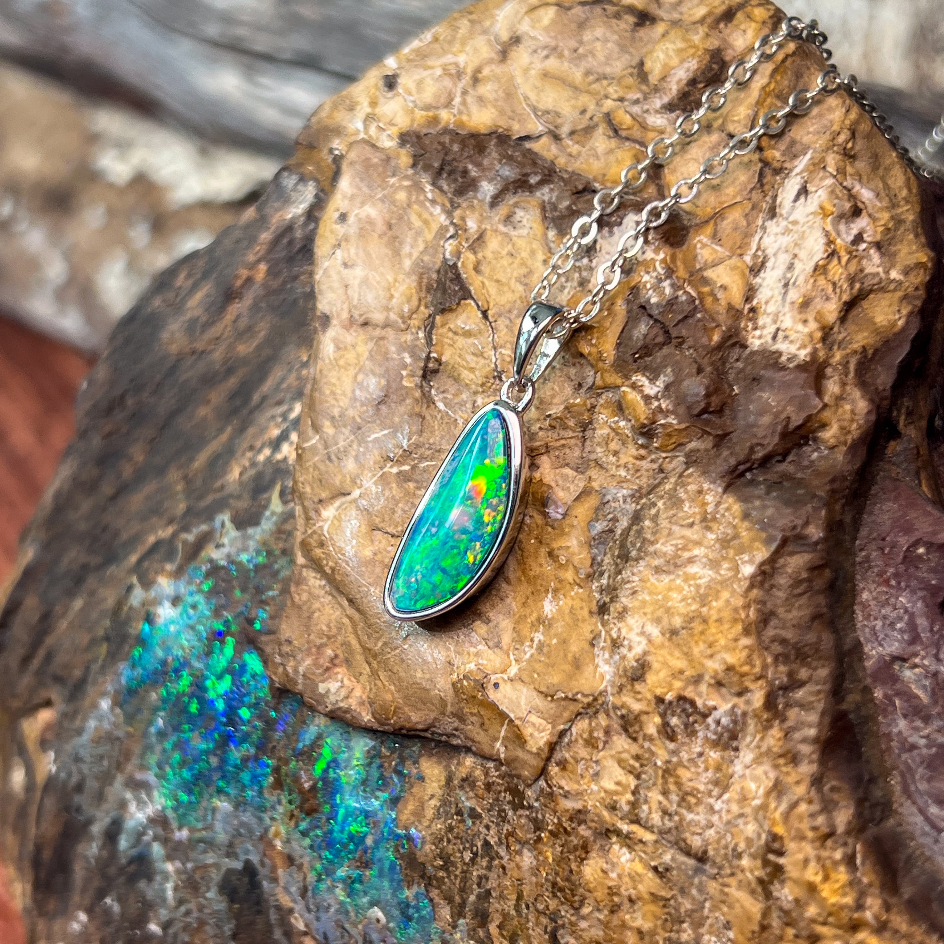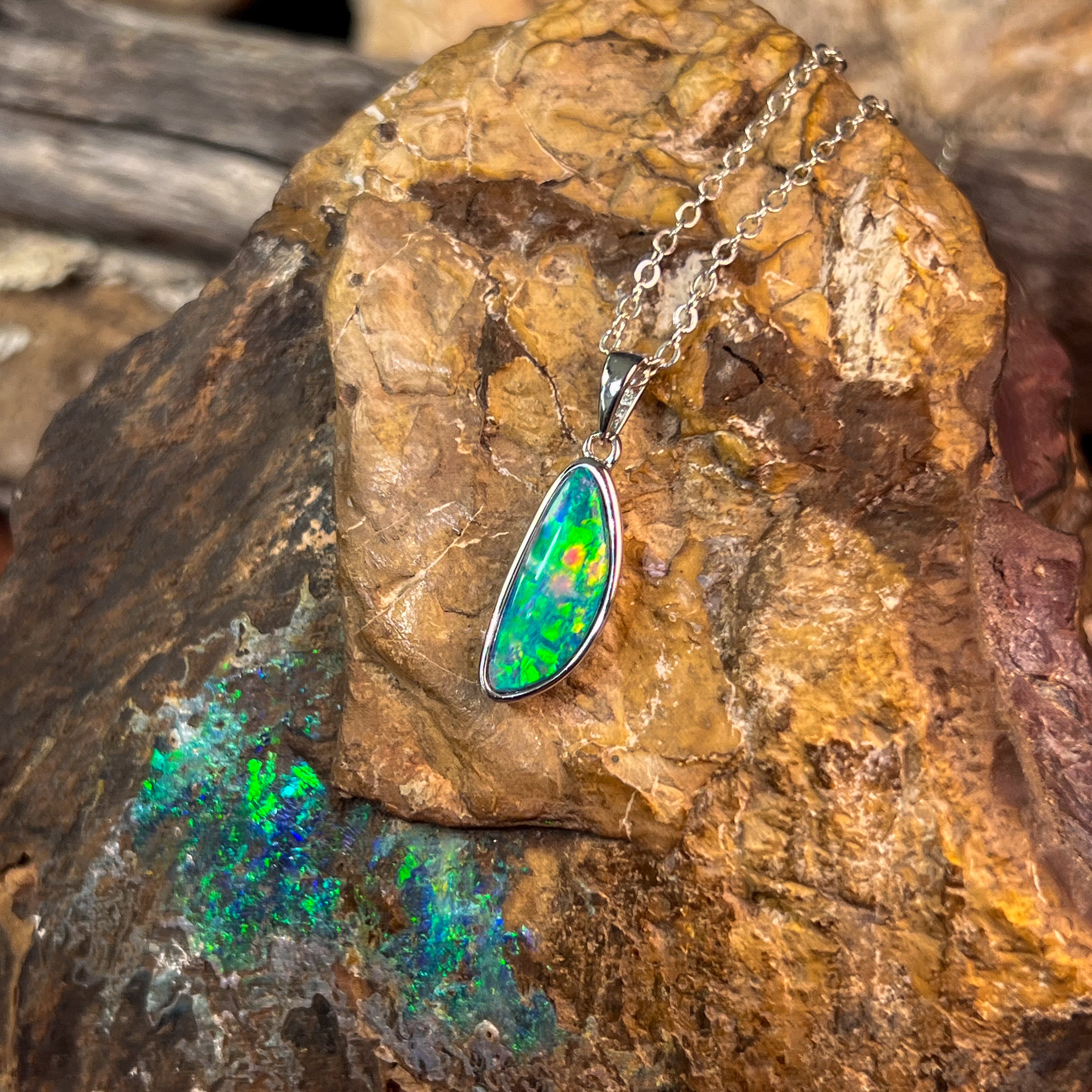 This sterling silver pendant features a stunning opal doublet showcasing a vibrant play of green, orange, and yellow hues. Expertly crafted, the opal’s dynamic colors create a captivating effect that enhances any collection. The durable doublet design ensures lasting beauty while the sterling silver setting offers both elegance and strength, making it an exceptional choice for those who appreciate fine opal jewellery with vivid green play of colour.