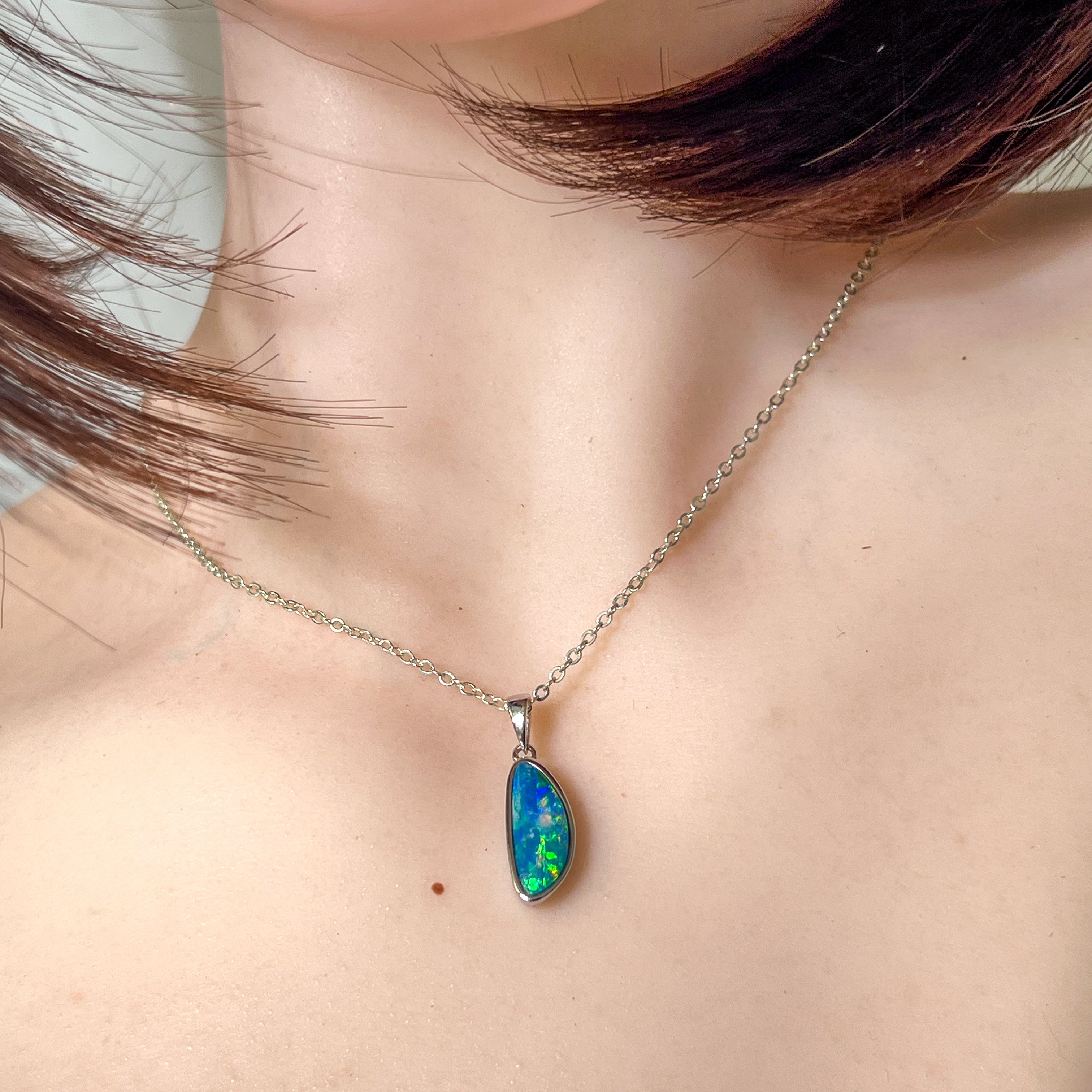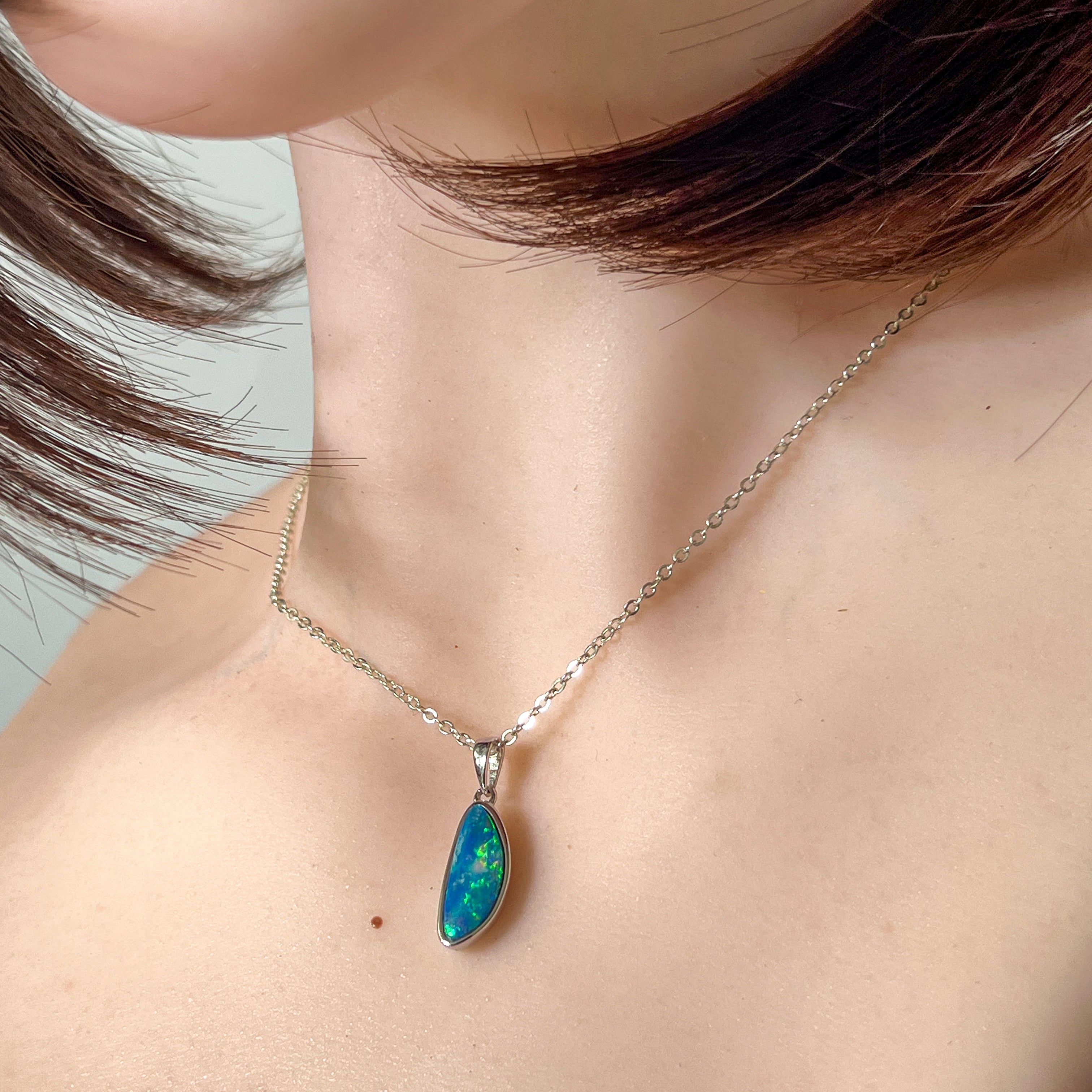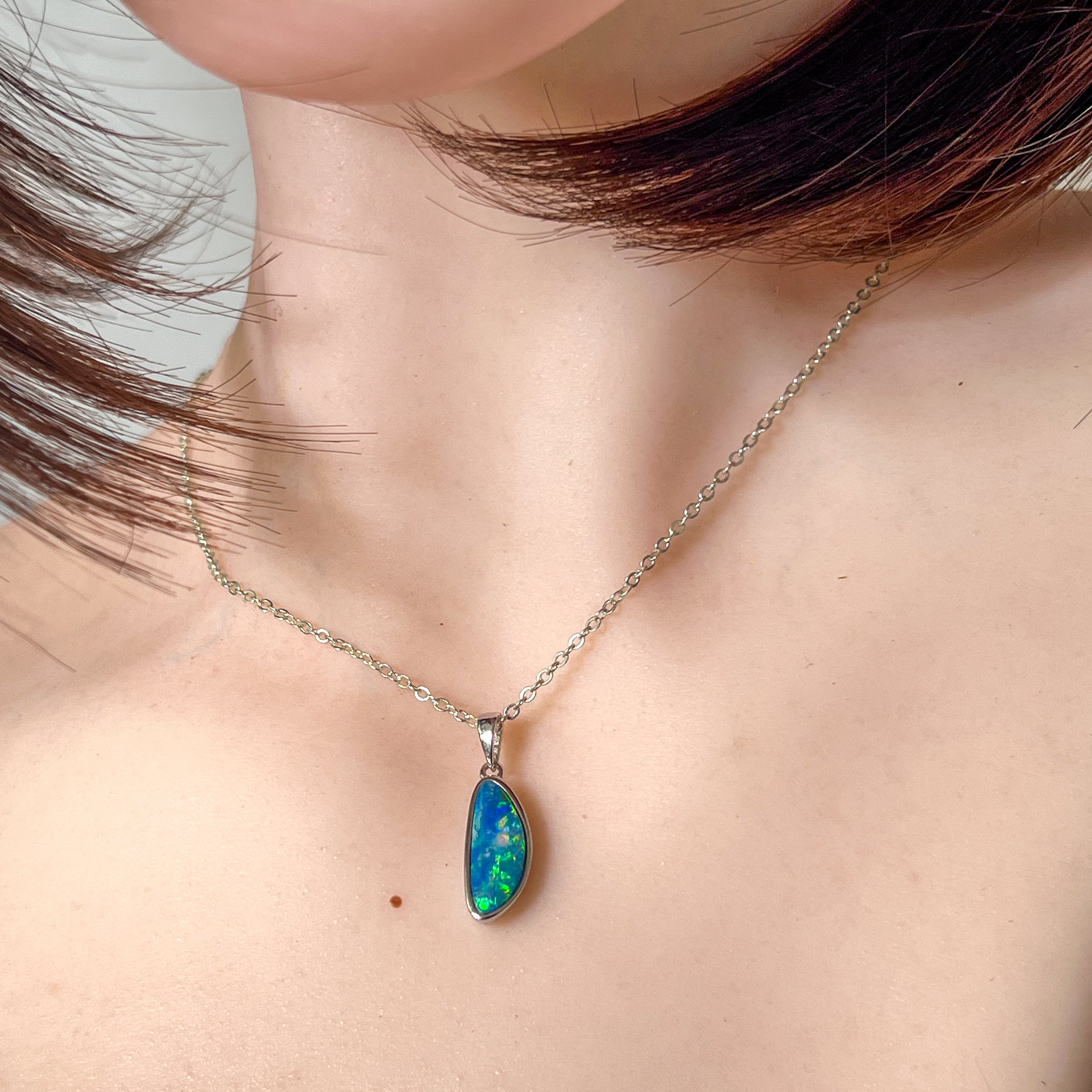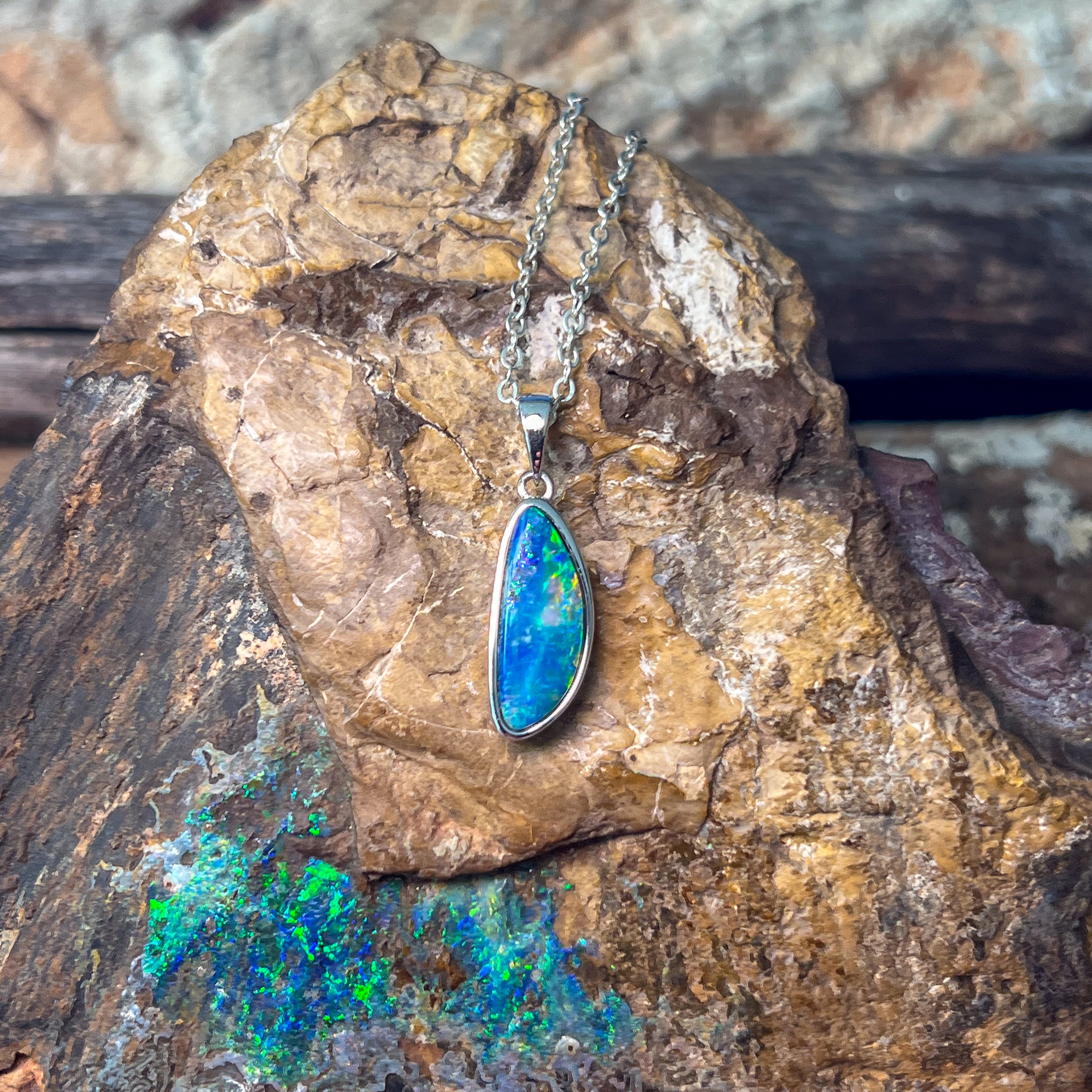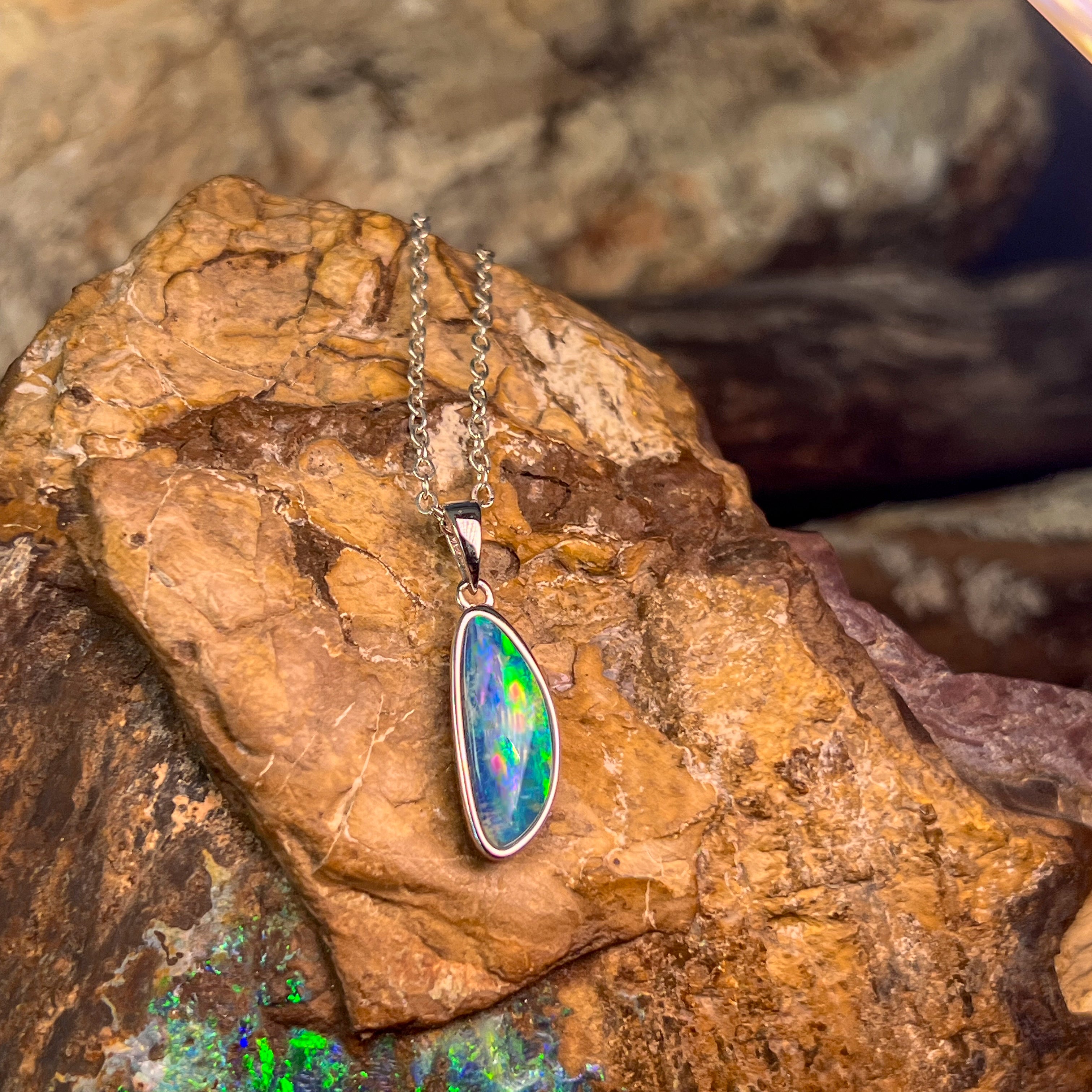 This sterling silver pendant features a stunning opal doublet showcasing a vibrant play of green, orange, and yellow hues. Expertly crafted, the opal’s dynamic colors create a captivating effect that enhances any collection. The durable doublet design ensures lasting beauty while the sterling silver setting offers both elegance and strength, making it an exceptional choice for those who appreciate fine opal jewellery with vivid green play of colour.