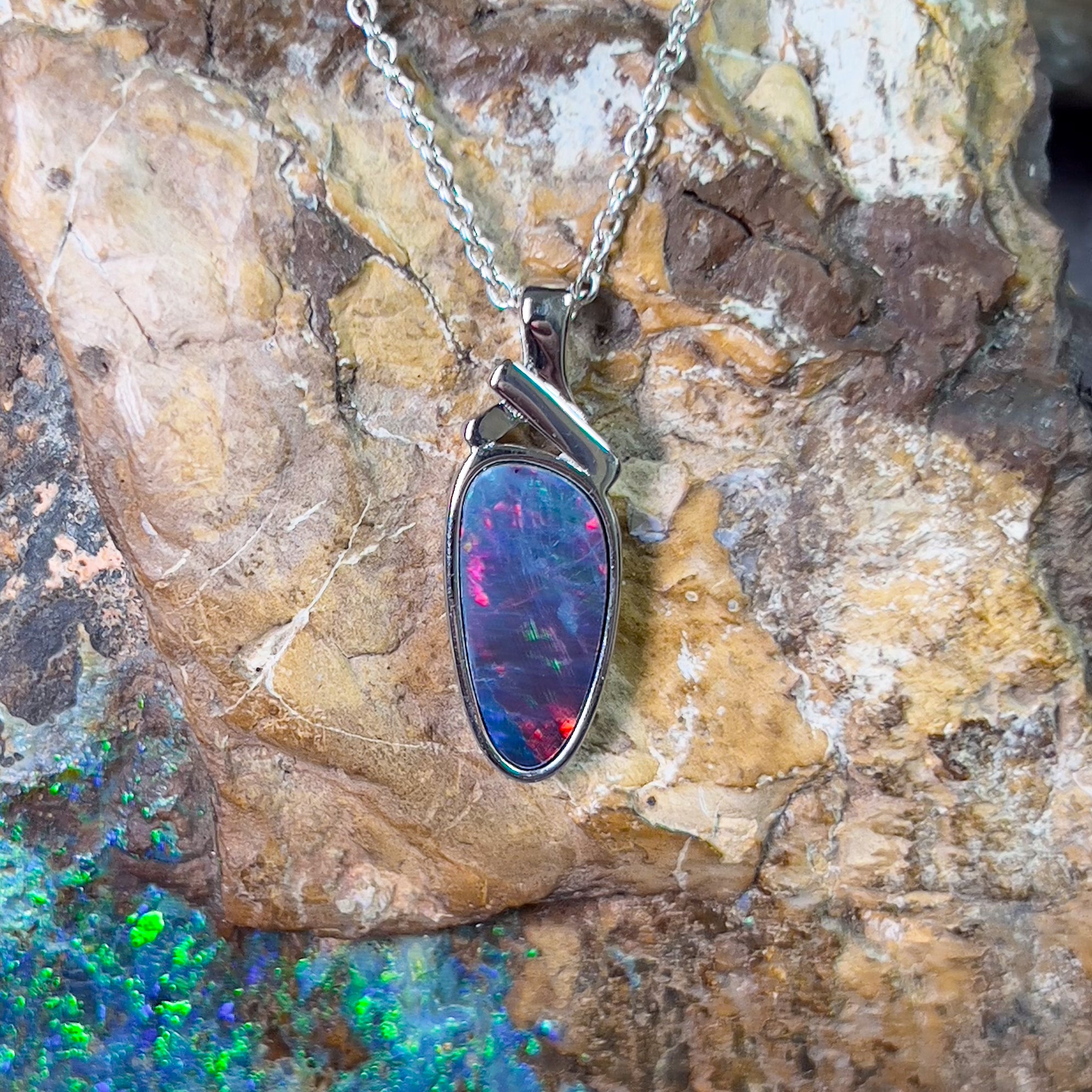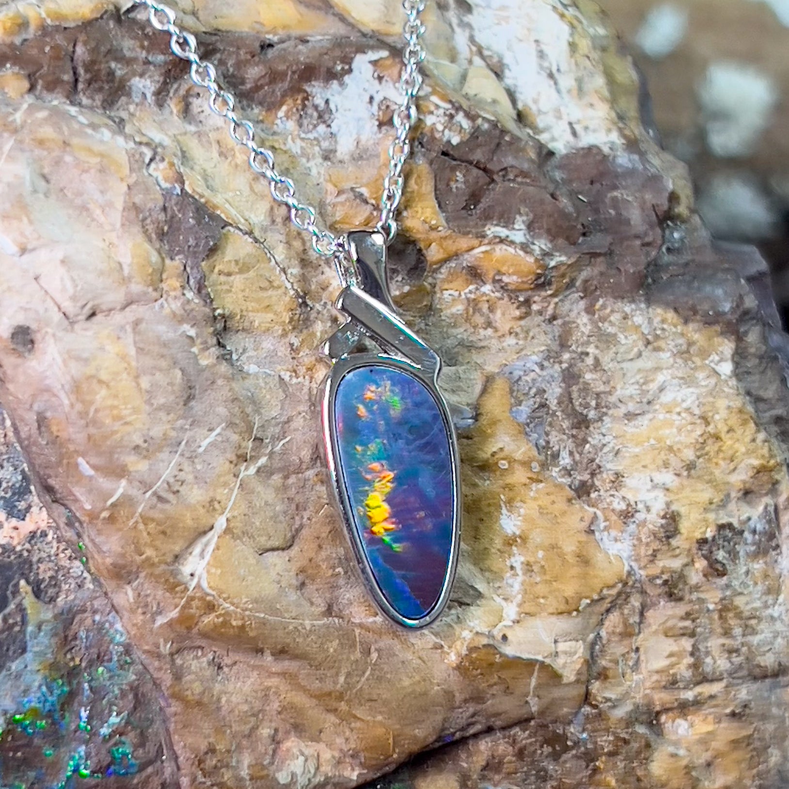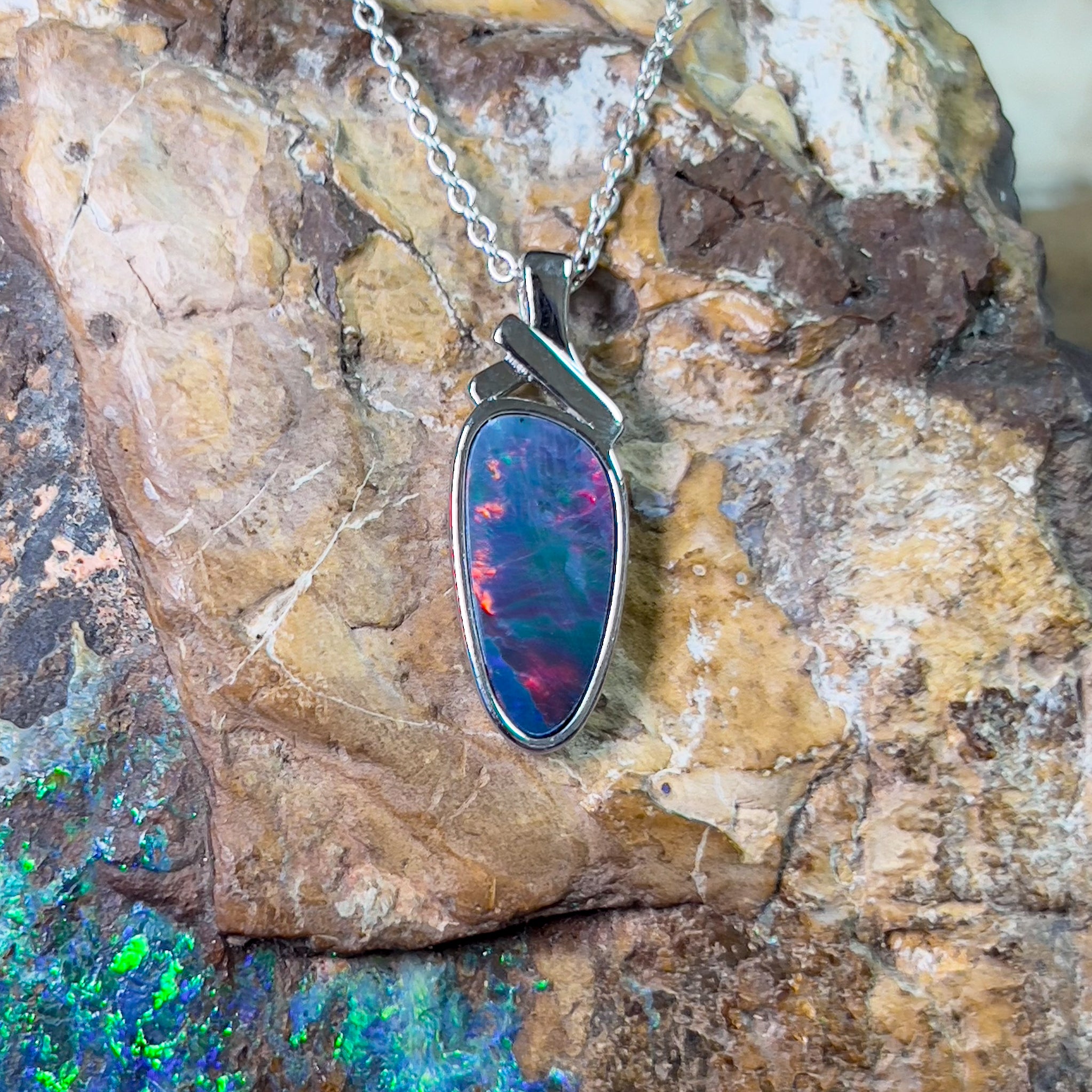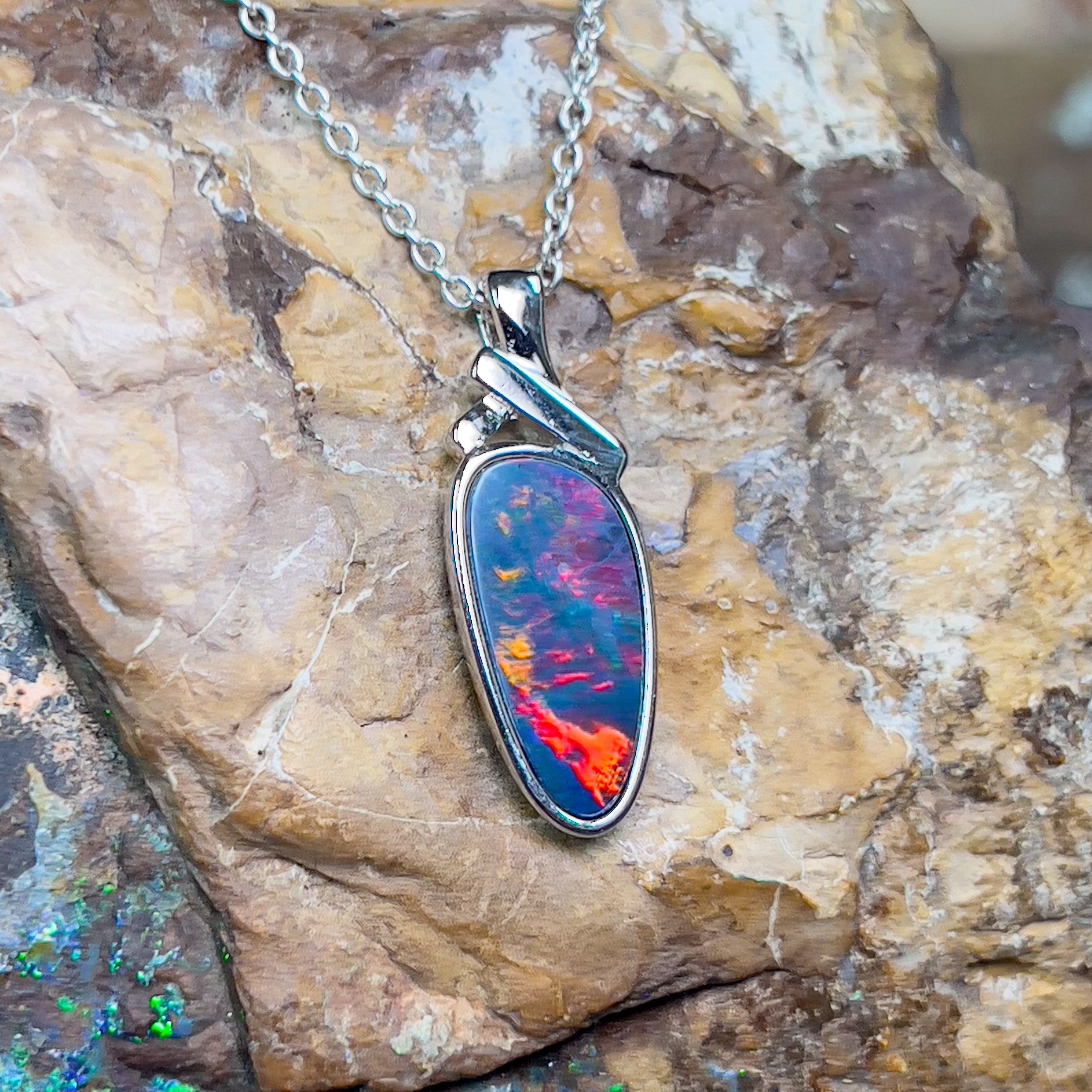 Add a touch of intrigue and elegance to your look with our Sterling Silver Opal doublet long drop shape pendant. Its stunning red and blue fire will catch everyone's eye. Elevate your accessory game and be the center of attention!