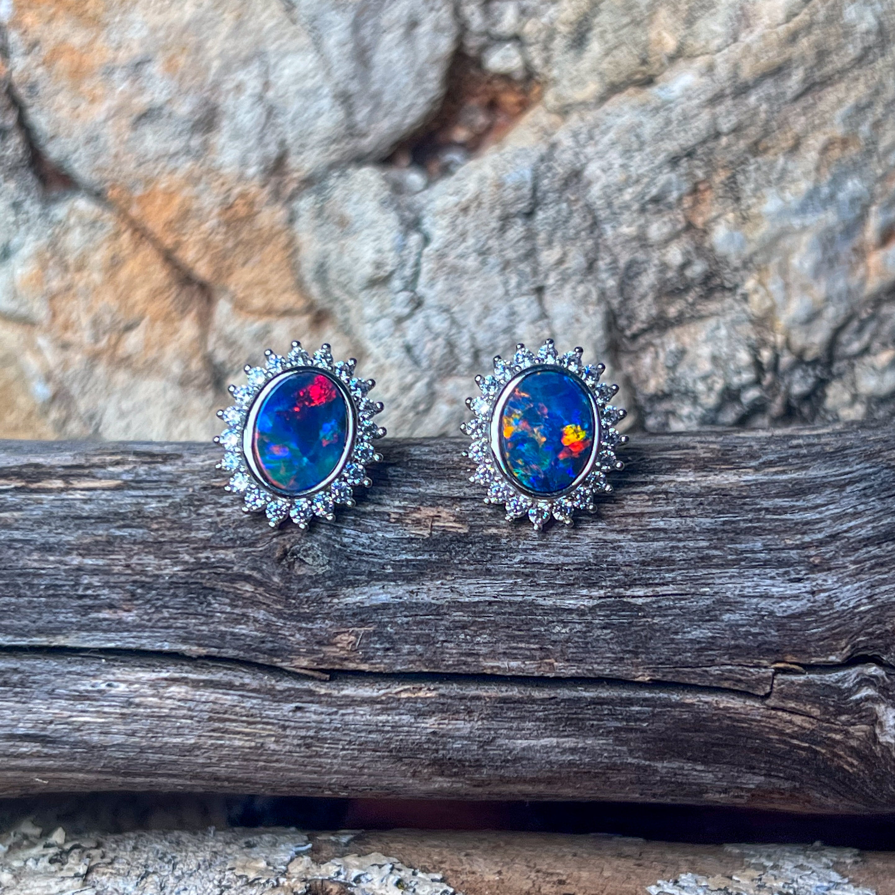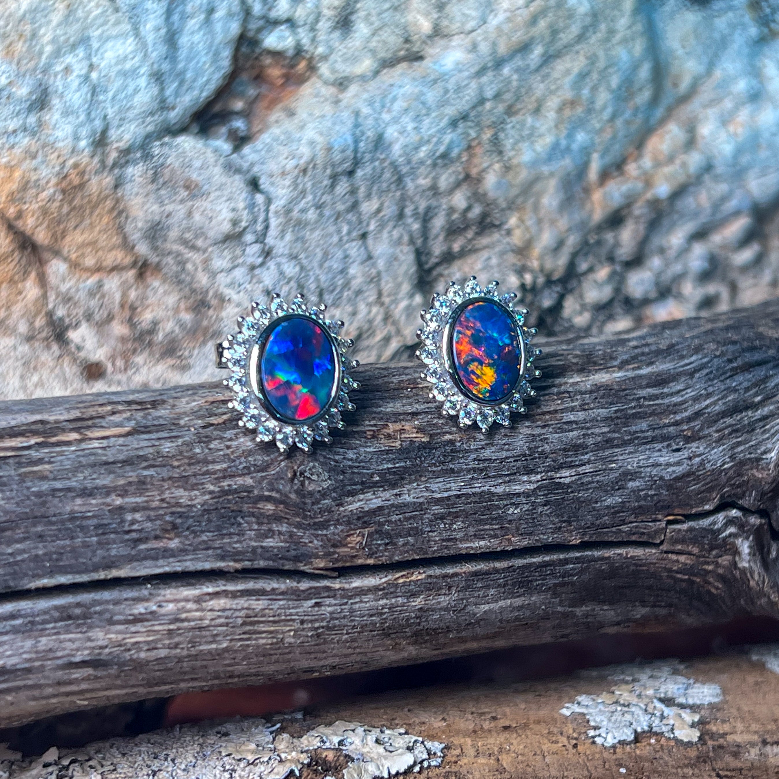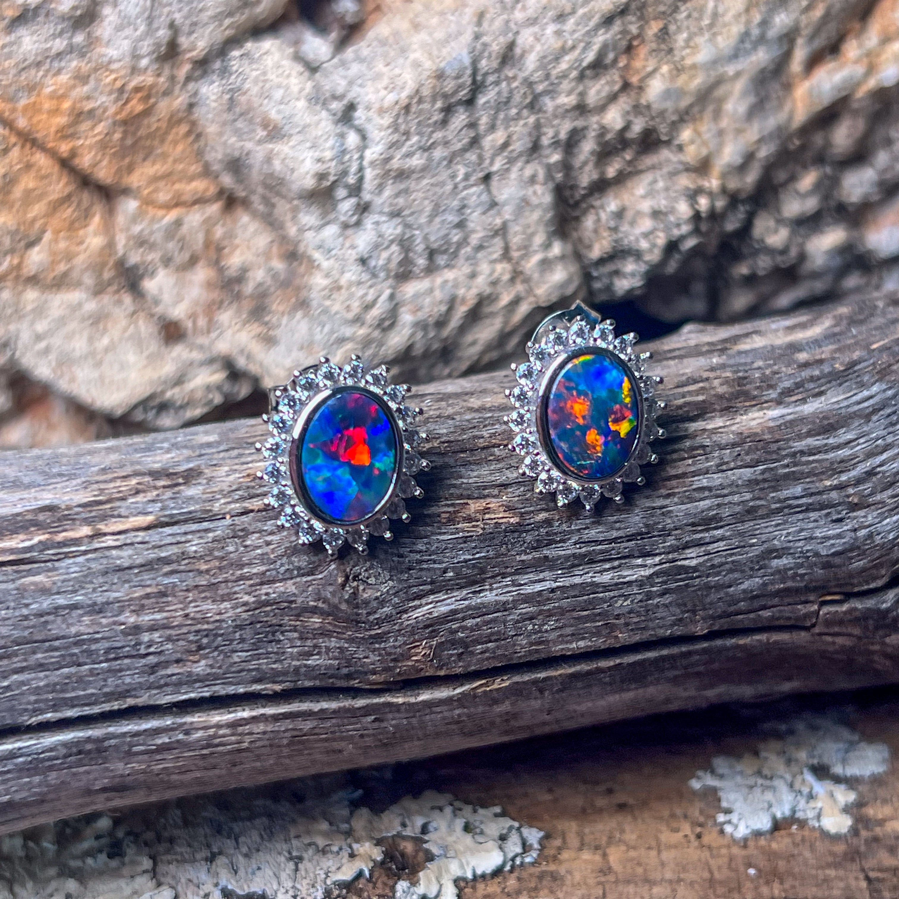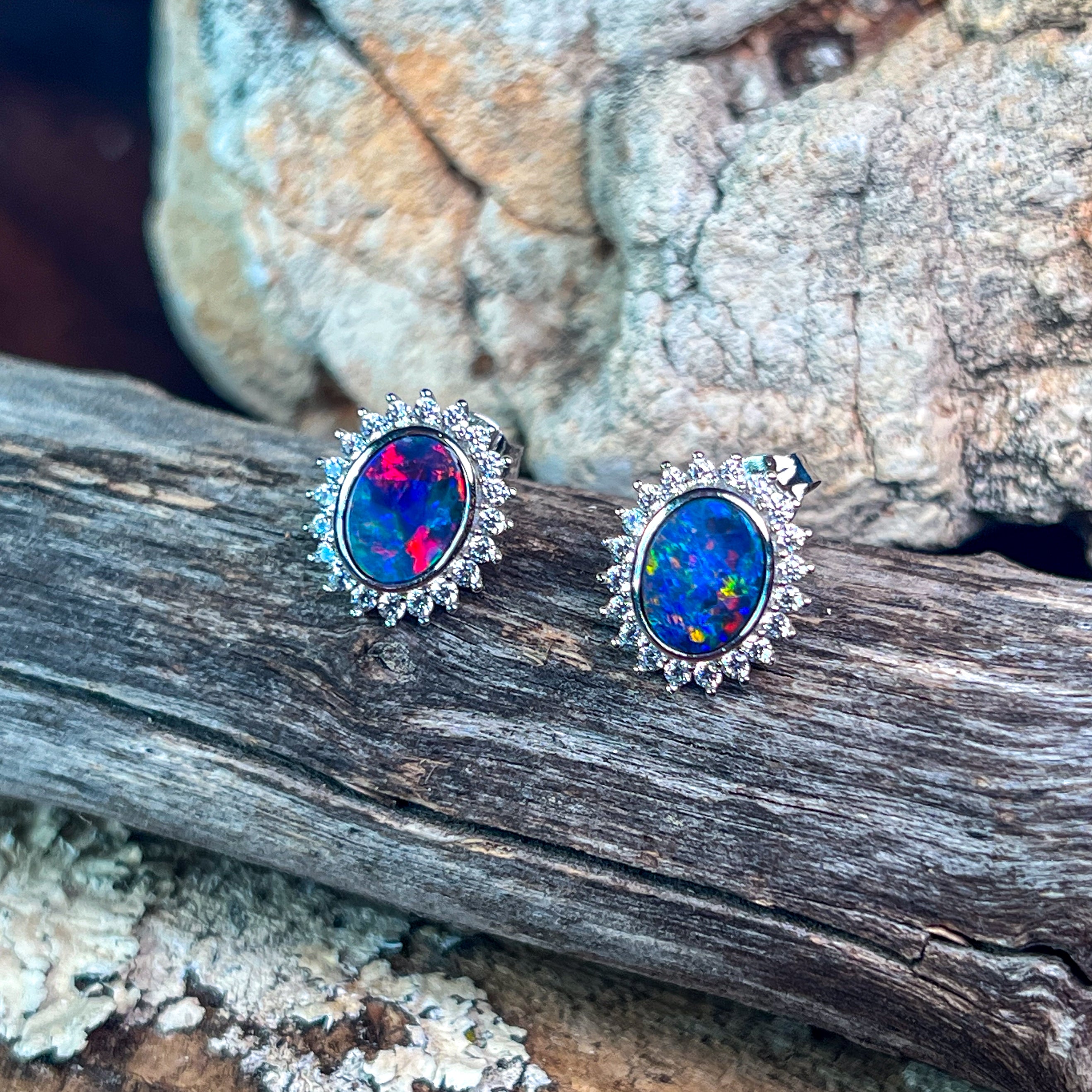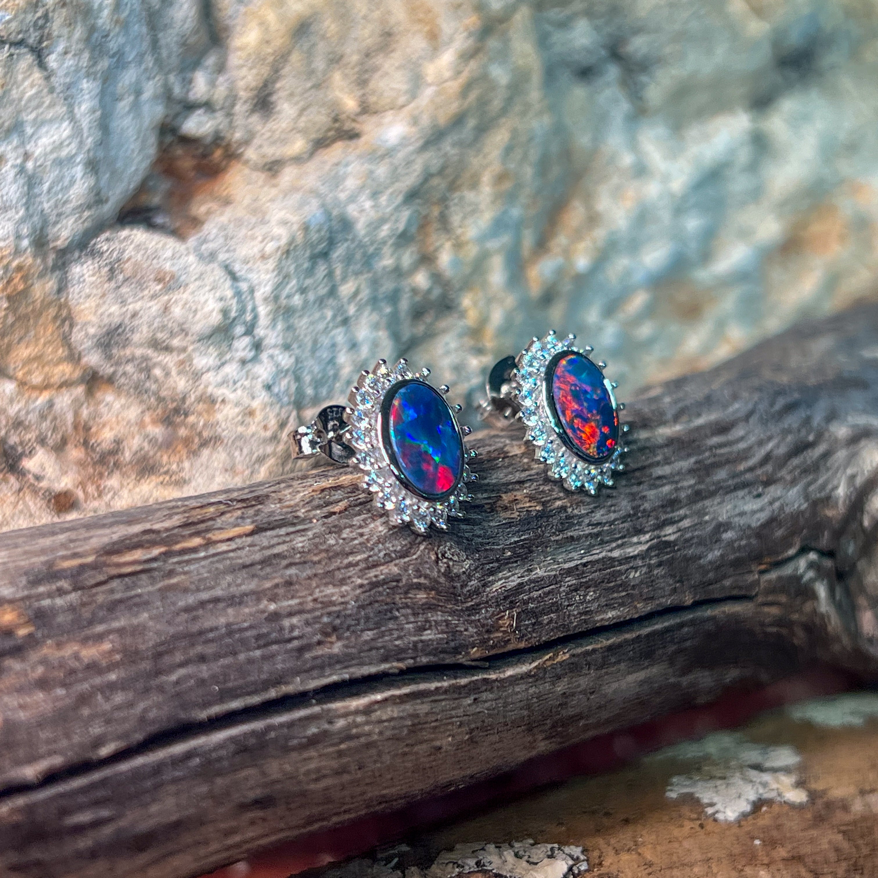 Elevate your elegance with these Sterling Silver Opal Doublet Oval Cluster Earrings. Featuring a harmonious blend of classic red and blue hues, each oval opal doublet is expertly set in a refined cluster design. These earrings offer a timeless sophistication, perfect for adding a subtle yet striking touch to any ensemble. Crafted with sterling silver, they promise lasting quality and a graceful finish.