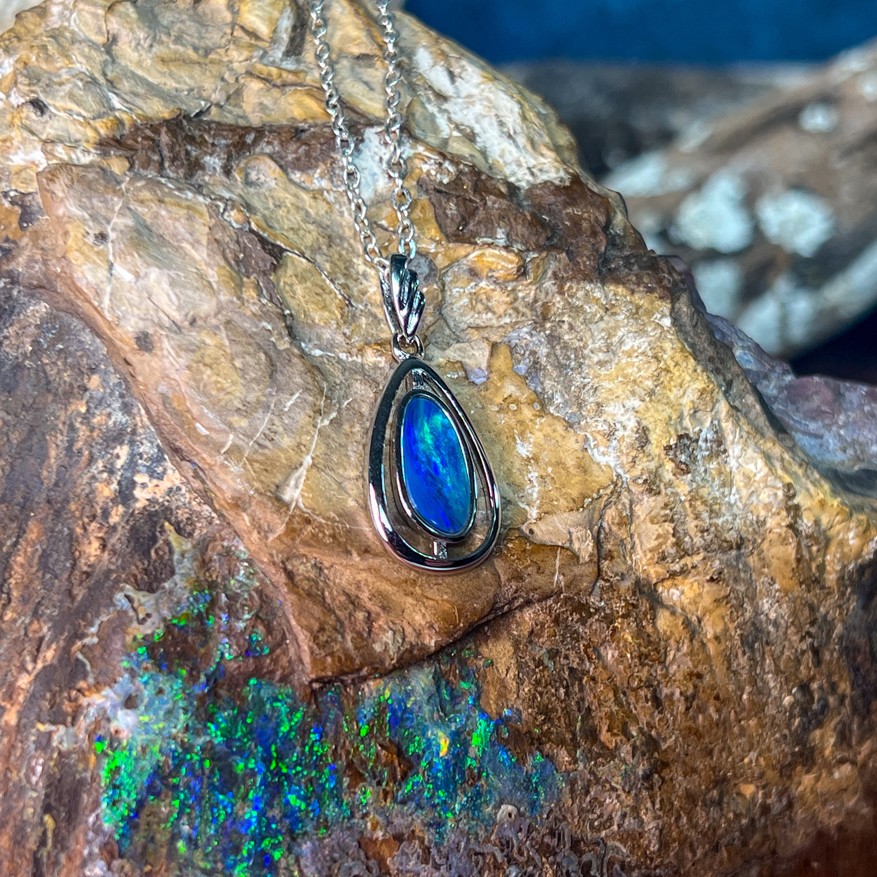 Elevate your style with this sterling silver pendant featuring a pear-shaped opal doublet in a striking teardrop cut-out design. Its modern silhouette enhances the opal’s vibrant hues, making it a captivating centerpiece. Perfect for adding a touch of sophistication and unique elegance to any outfit.
