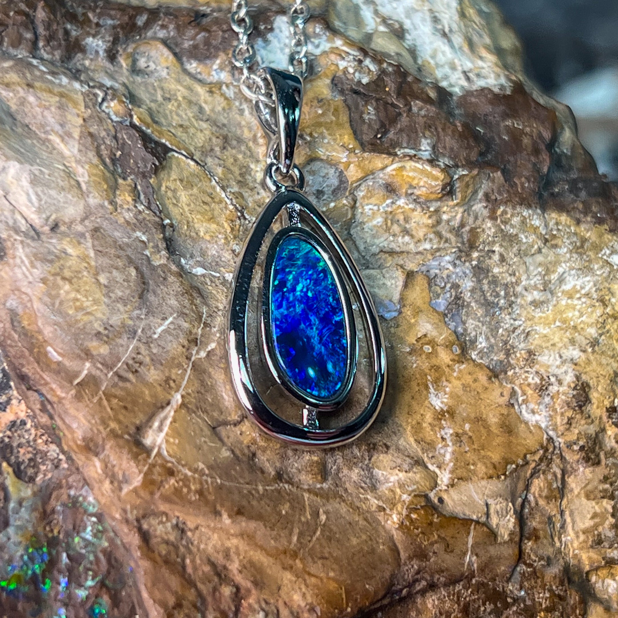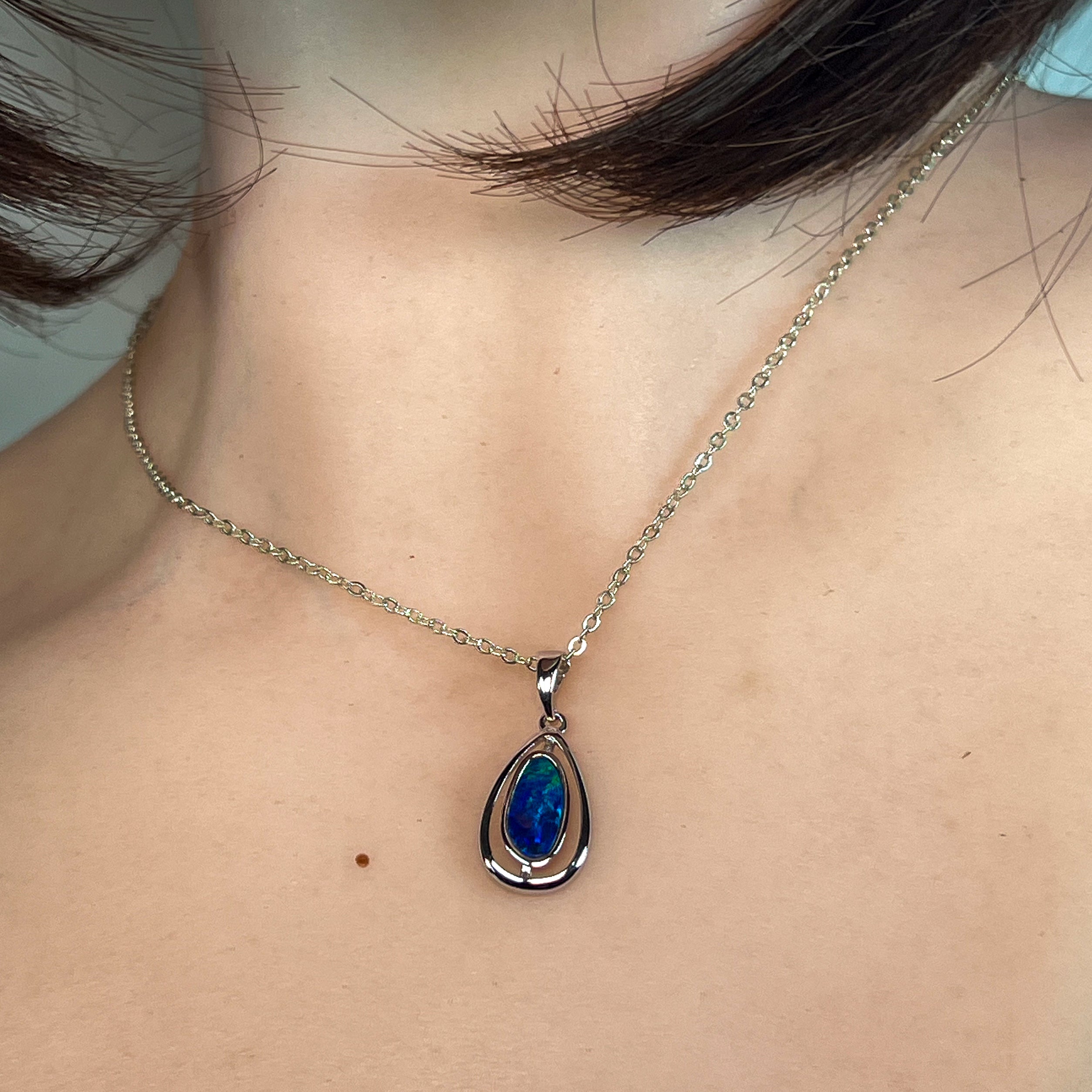 This stunning sterling silver pendant features a pear-shaped cutout design that beautifully showcases a blue-green opal doublet. Its elegant teardrop shape highlights the opal’s vibrant play of colors, making it a captivating accessory for any occasion. Crafted with precision, this pendant adds a touch of sophistication and unique charm to your jewelry collection.