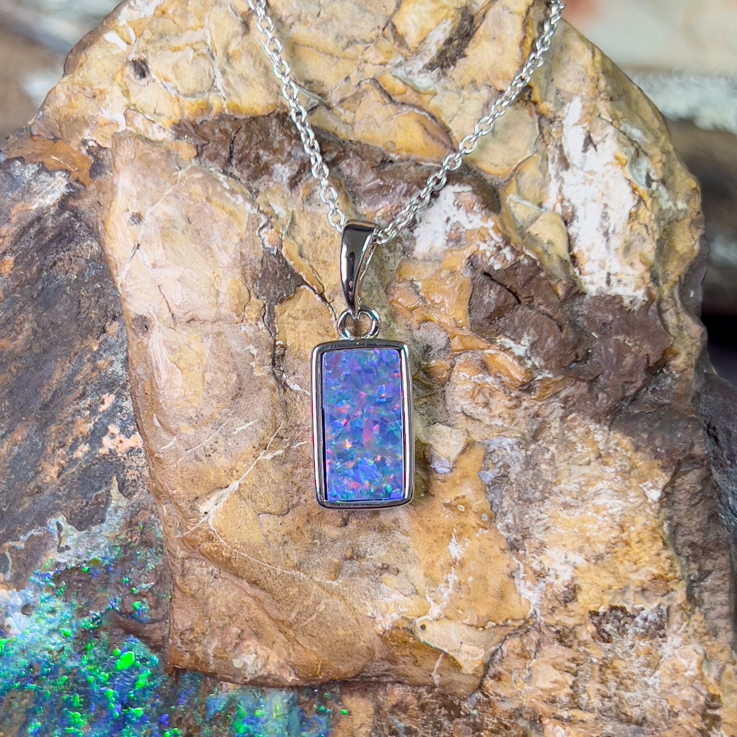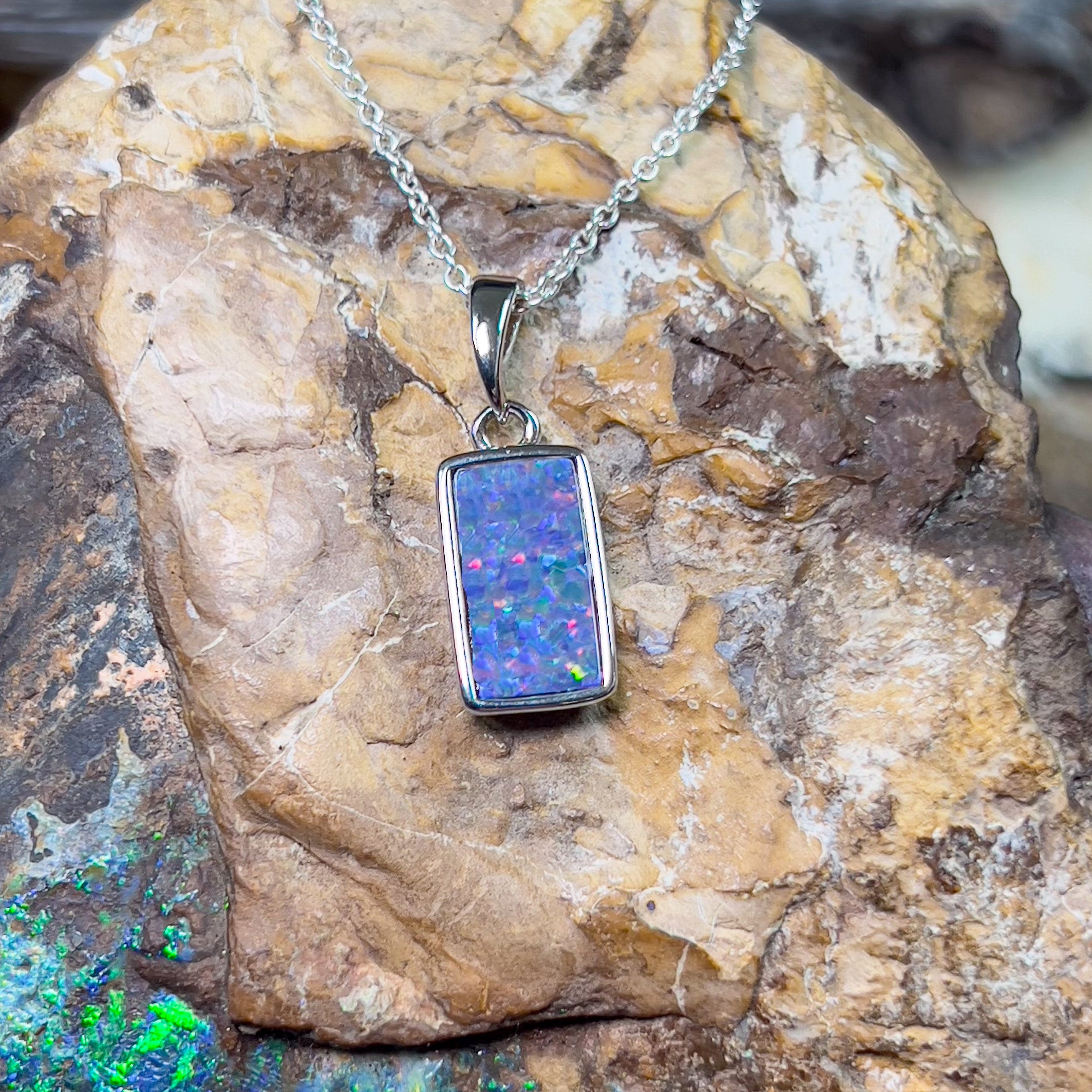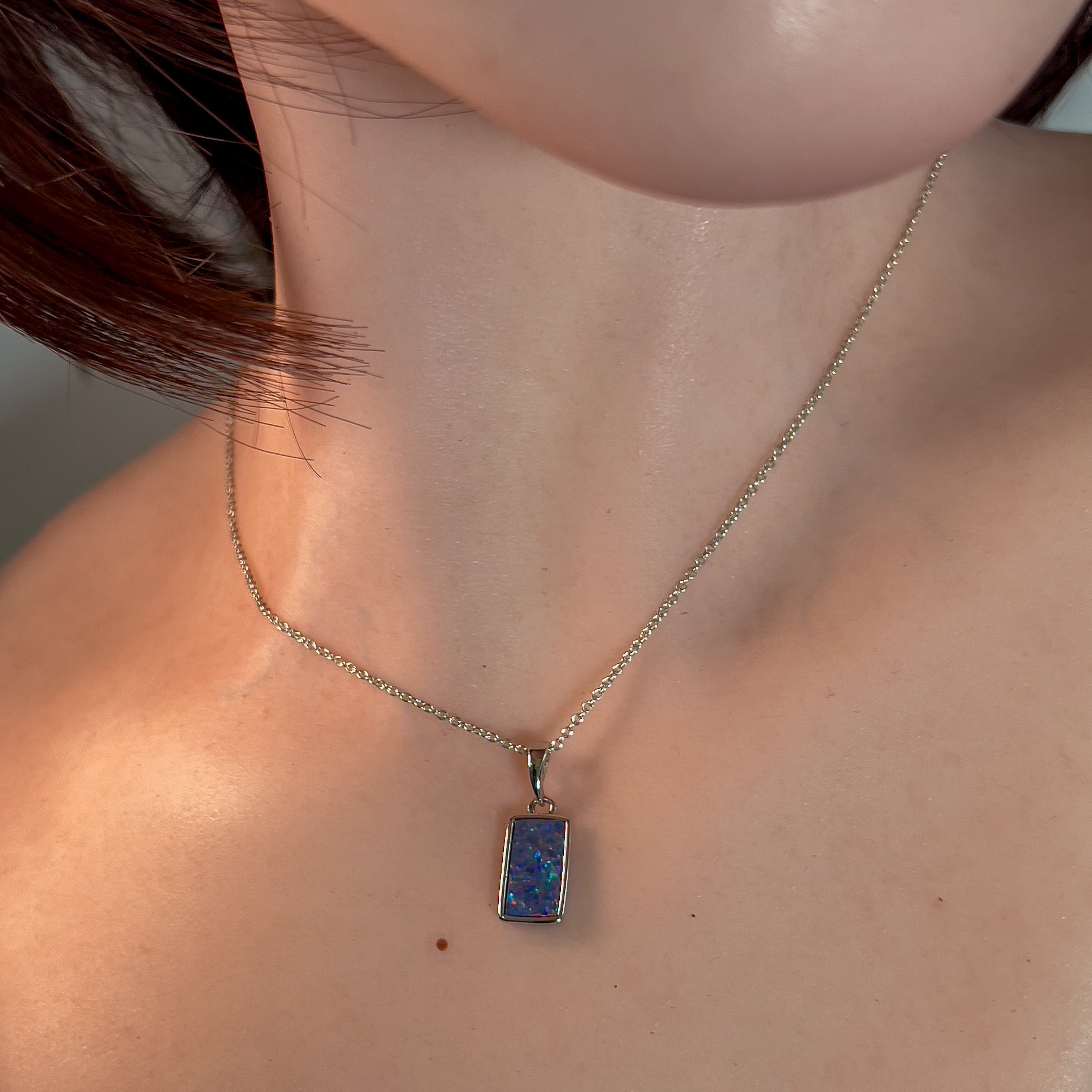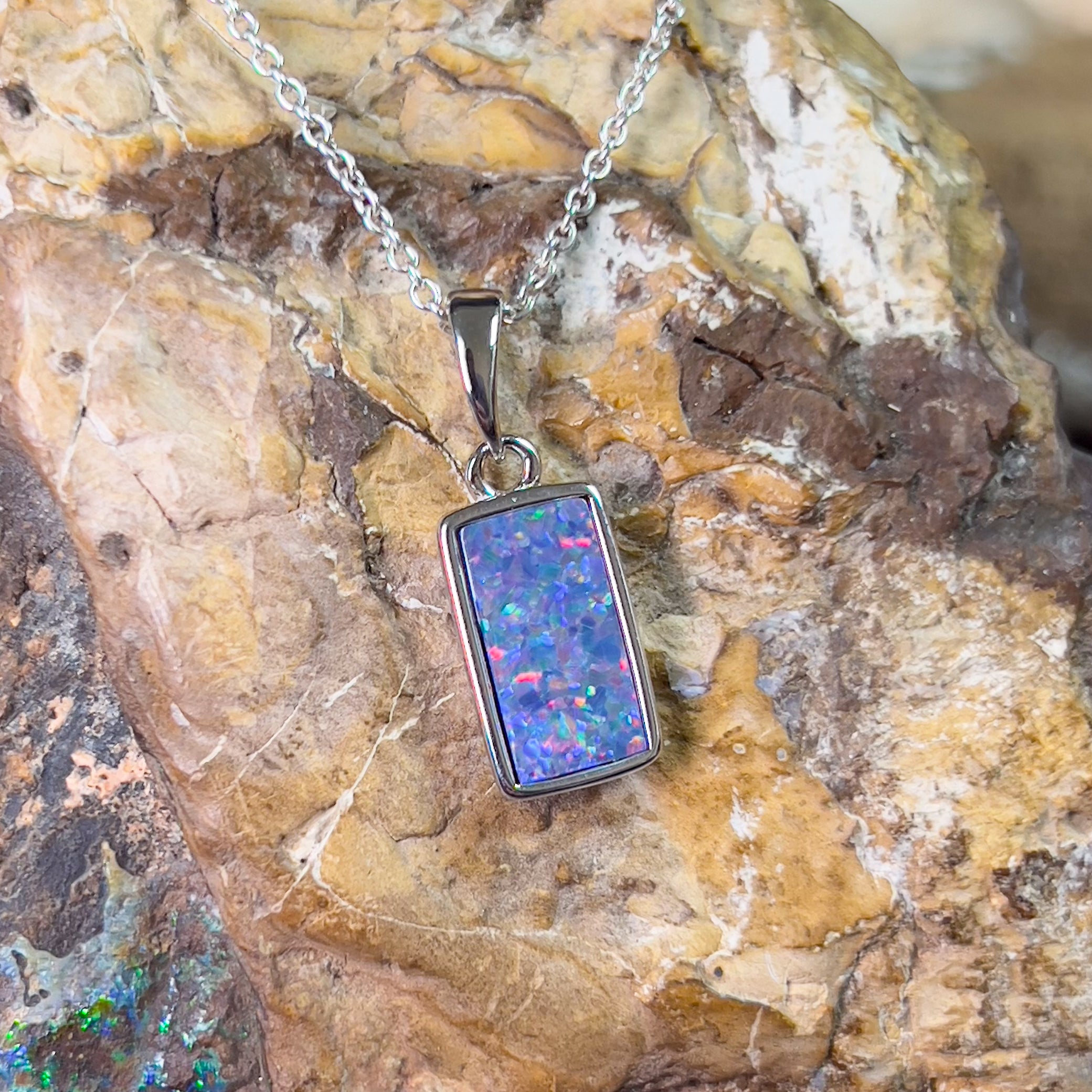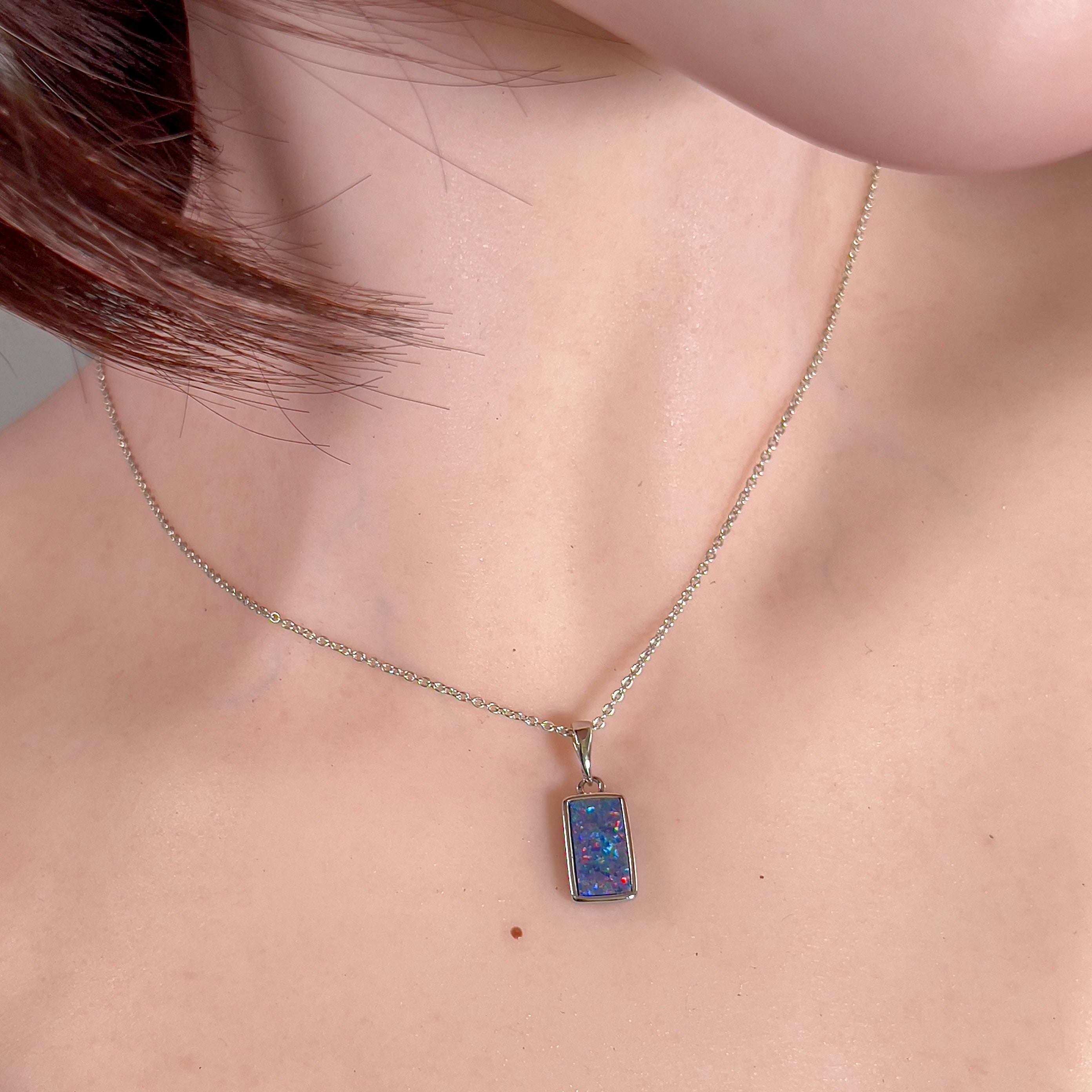 Experience the captivating beauty of our Sterling Silver Rectangular Opal doublet 12x7mm pendant. Its unique rectangle shape adds a touch of elegance to any outfit. This stunning pendant will make you stand out and feel confident in any setting. Don't miss out on this timeless accessory!