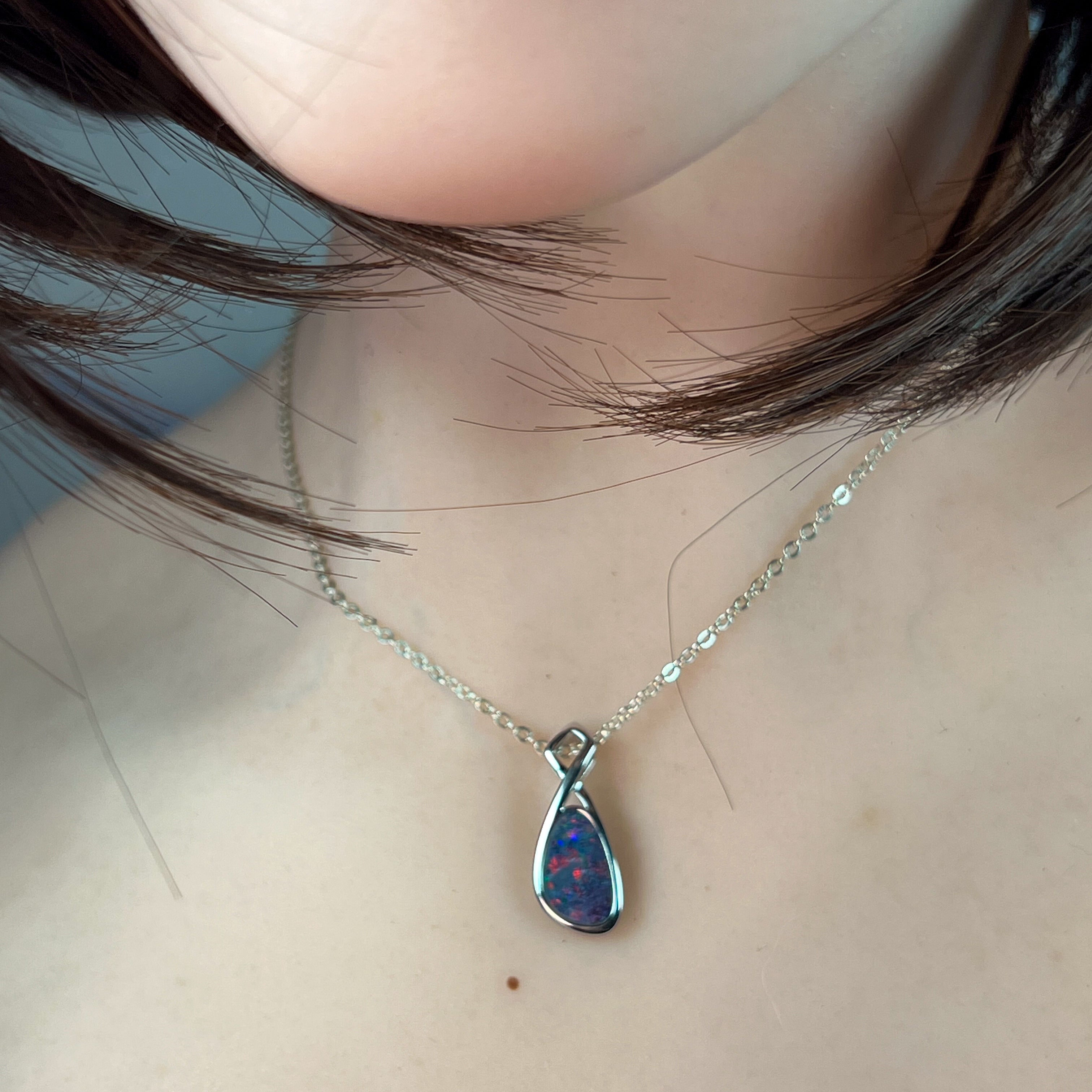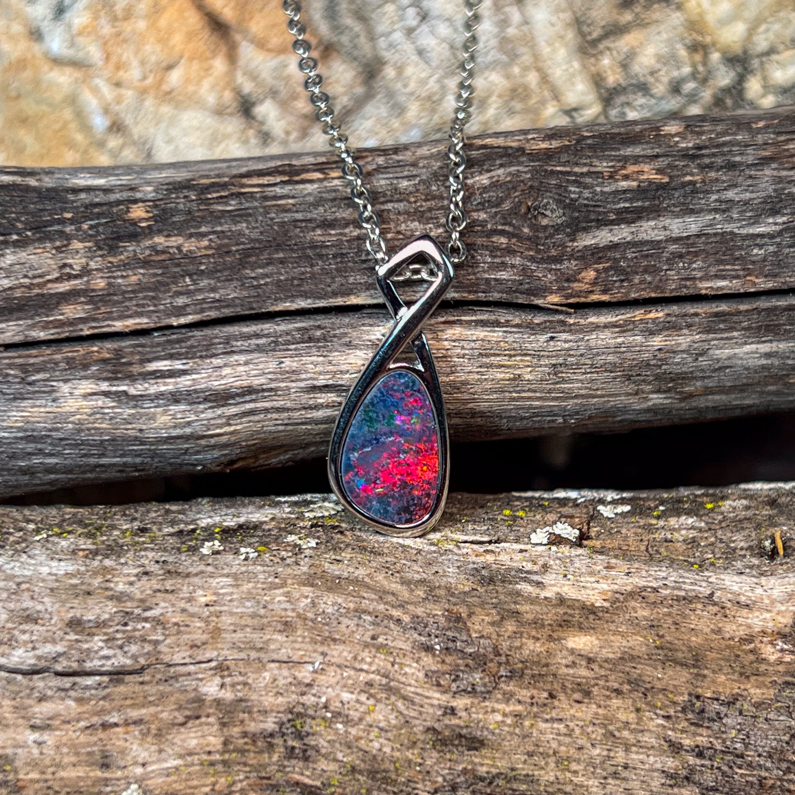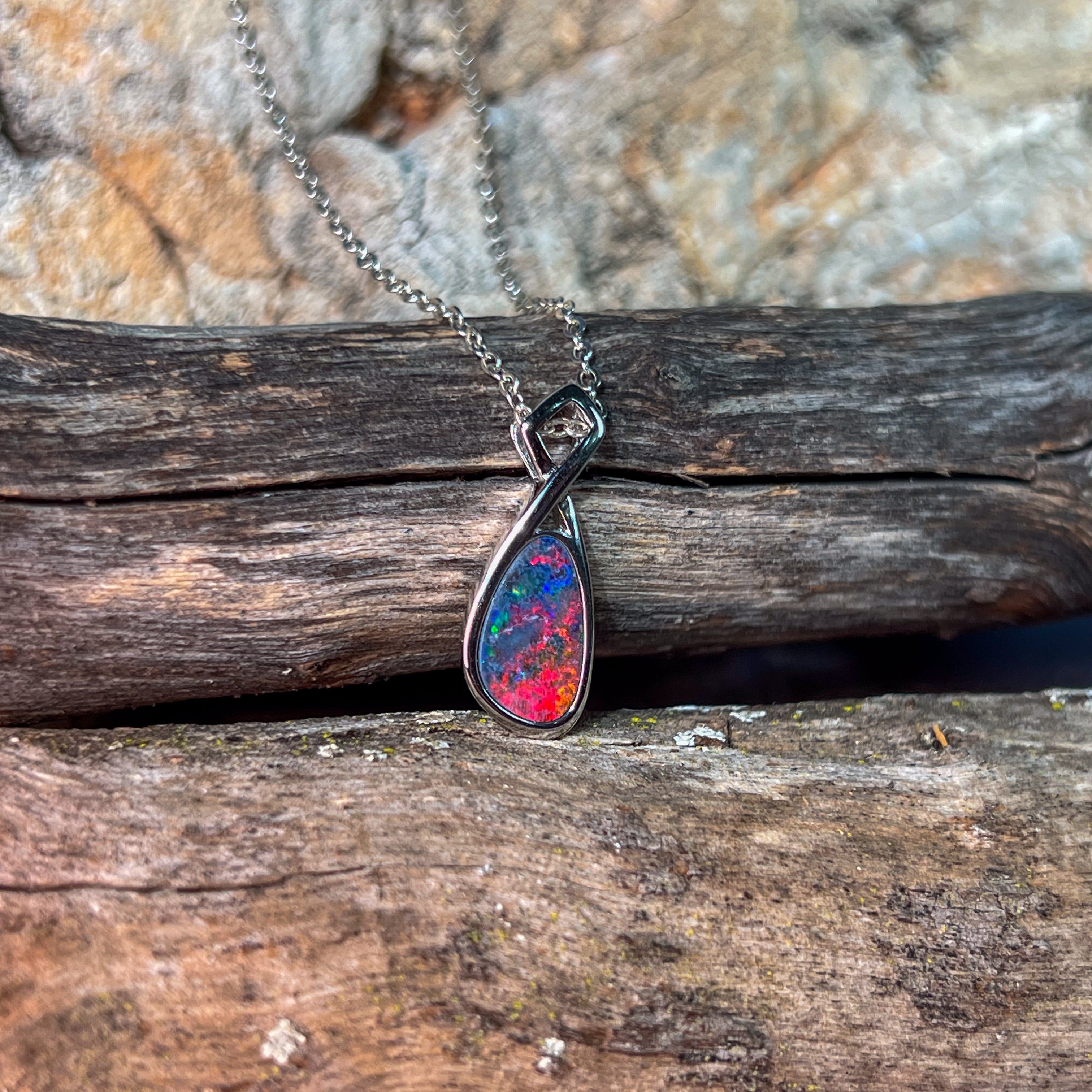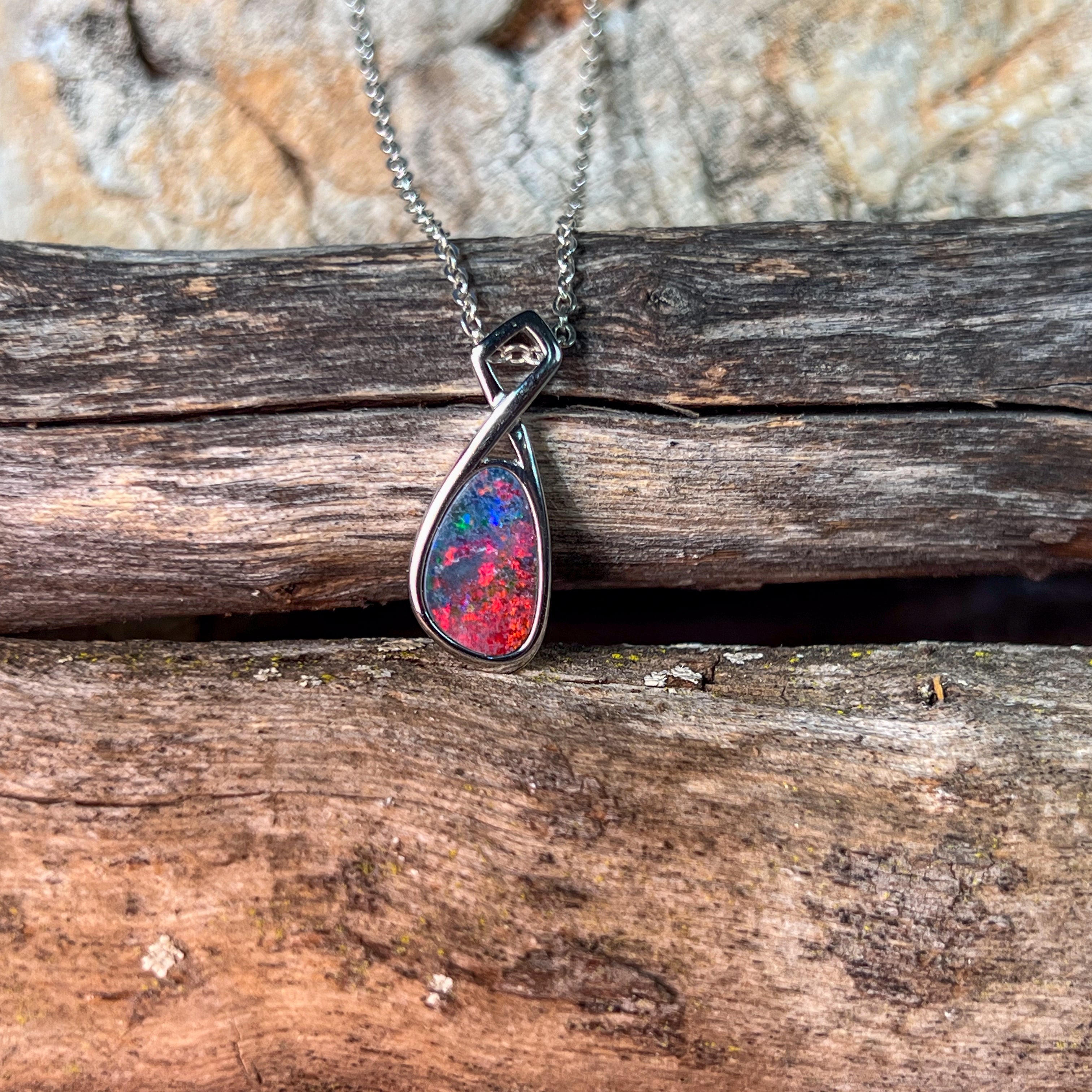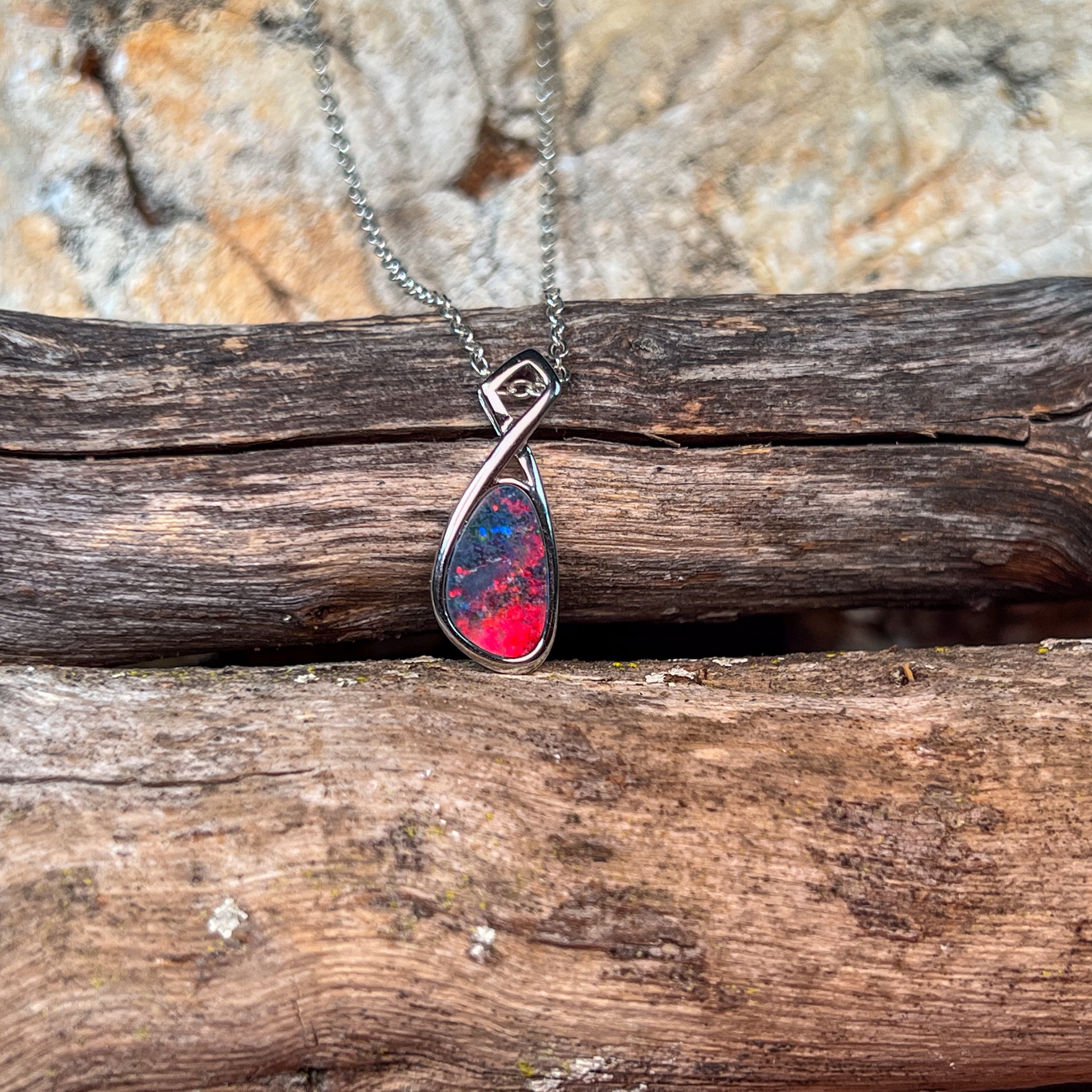 Captivate with the mesmerizing dance of colour in this sterling silver red flash opal doublet pendant. The vibrant red and orange hues burst through the stone's surface, creating a dynamic display that shifts with every movement. Crafted from genuine opal and expertly set in lustrous sterling silver, this piece combines natural beauty with timeless elegance. Perfect for those who appreciate bold, statement-making jewellery that celebrates the raw magic of Australian gemstones. A wearable work of art that transforms any outfit into something extraordinary.