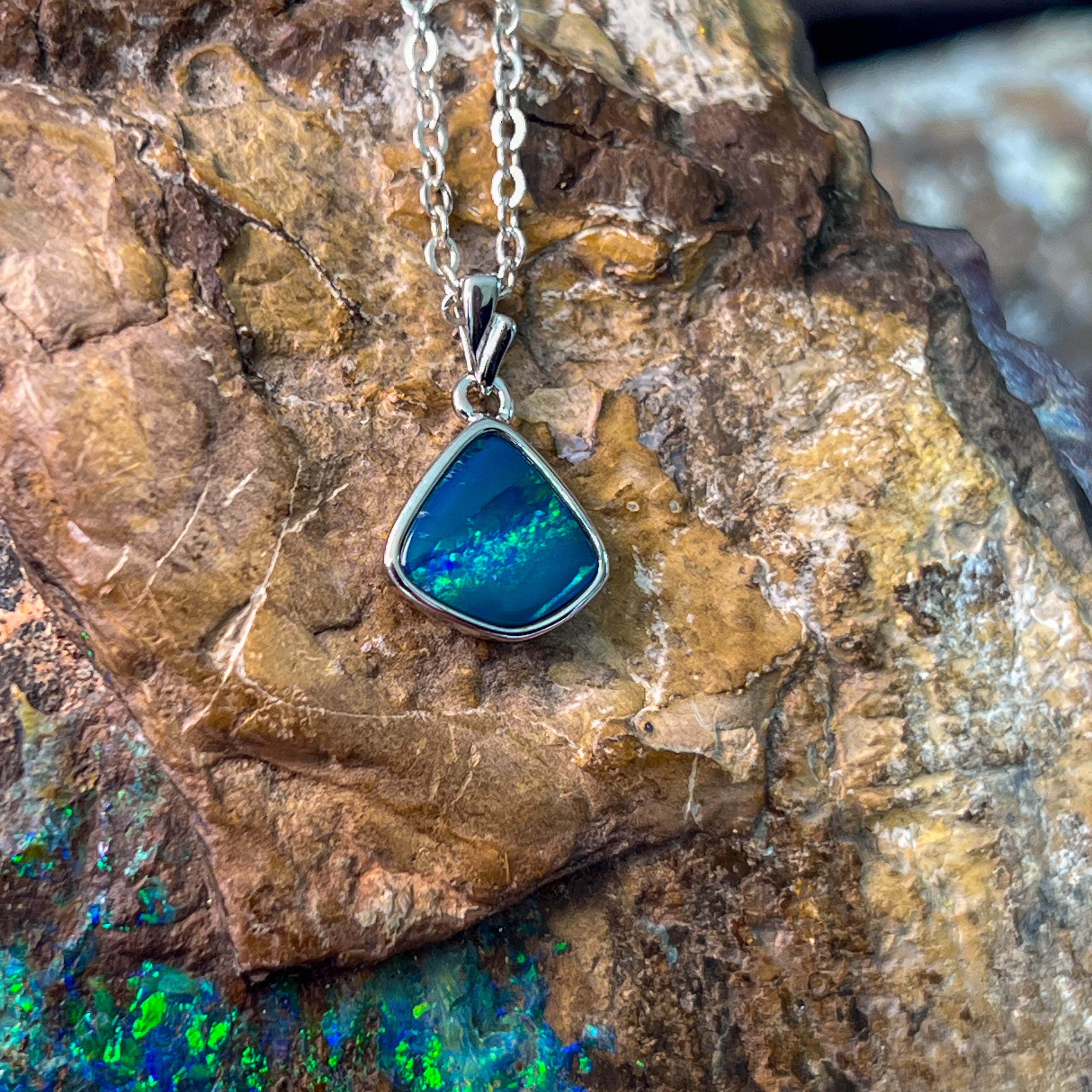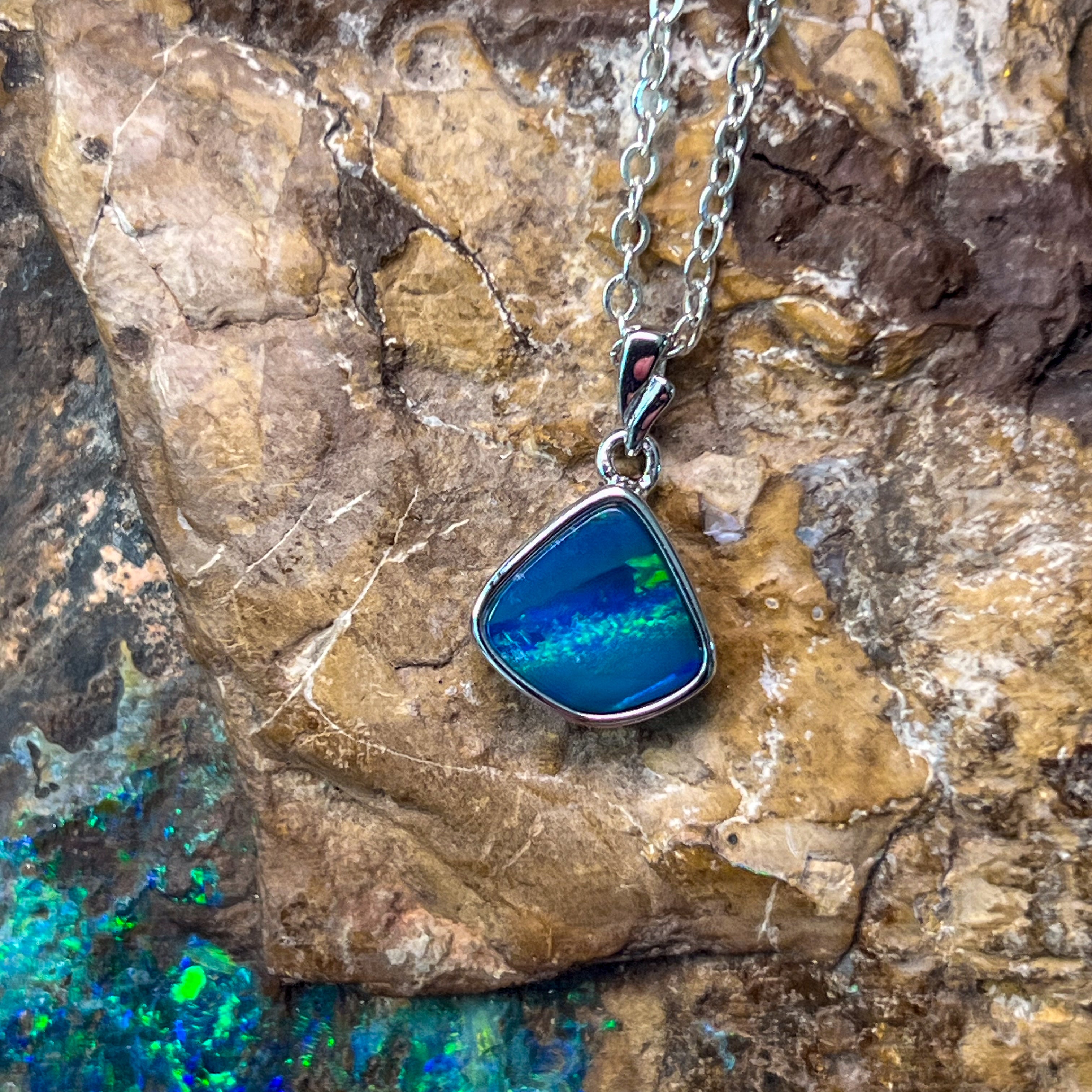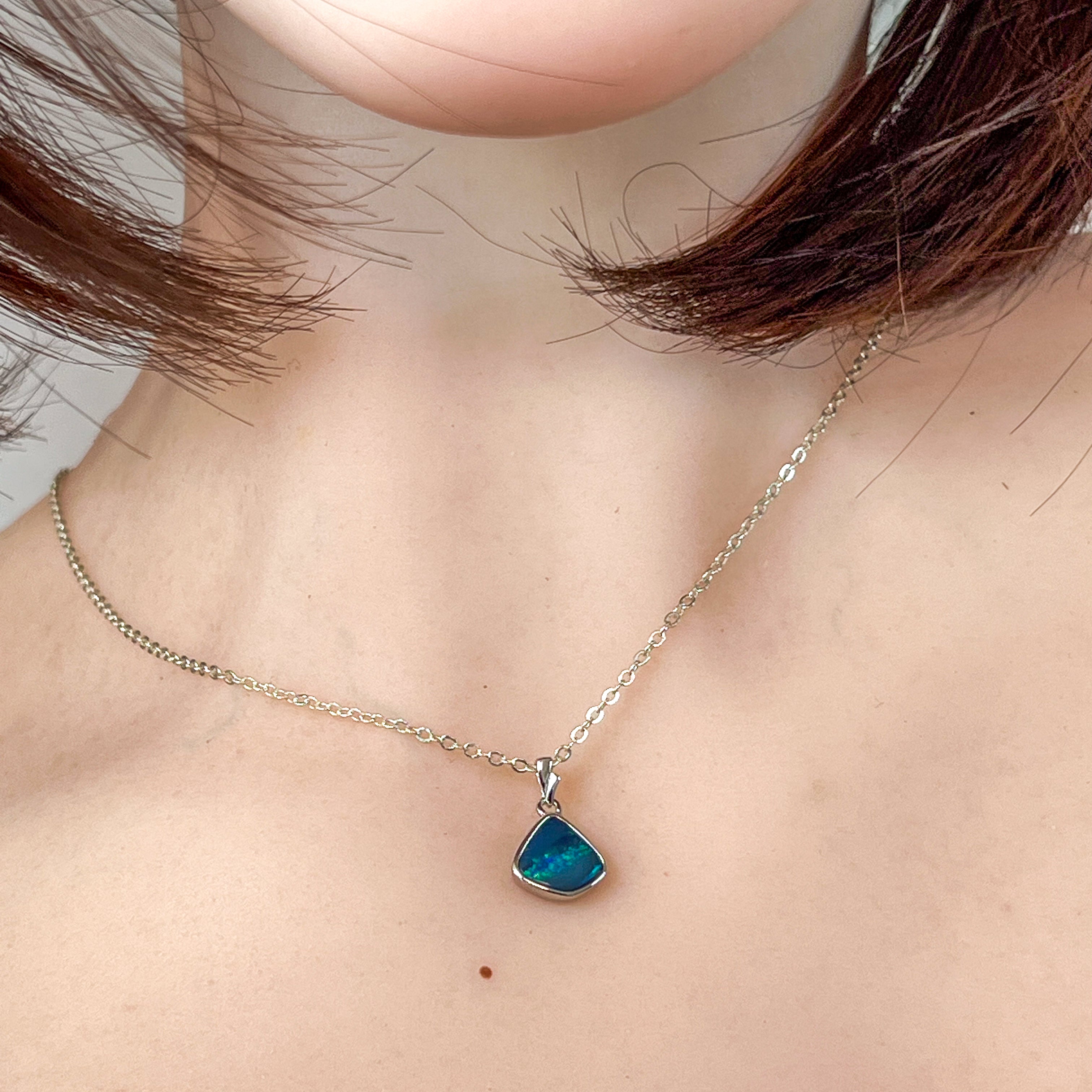 This sterling silver pendant features a striking triangle shape with a blue-green striped opal doublet, evoking the serene hues of the ocean. Its elegant design and vibrant colors make it a refined accessory that adds a touch of sophistication to any ensemble. Perfect for those who appreciate unique craftsmanship and timeless style.