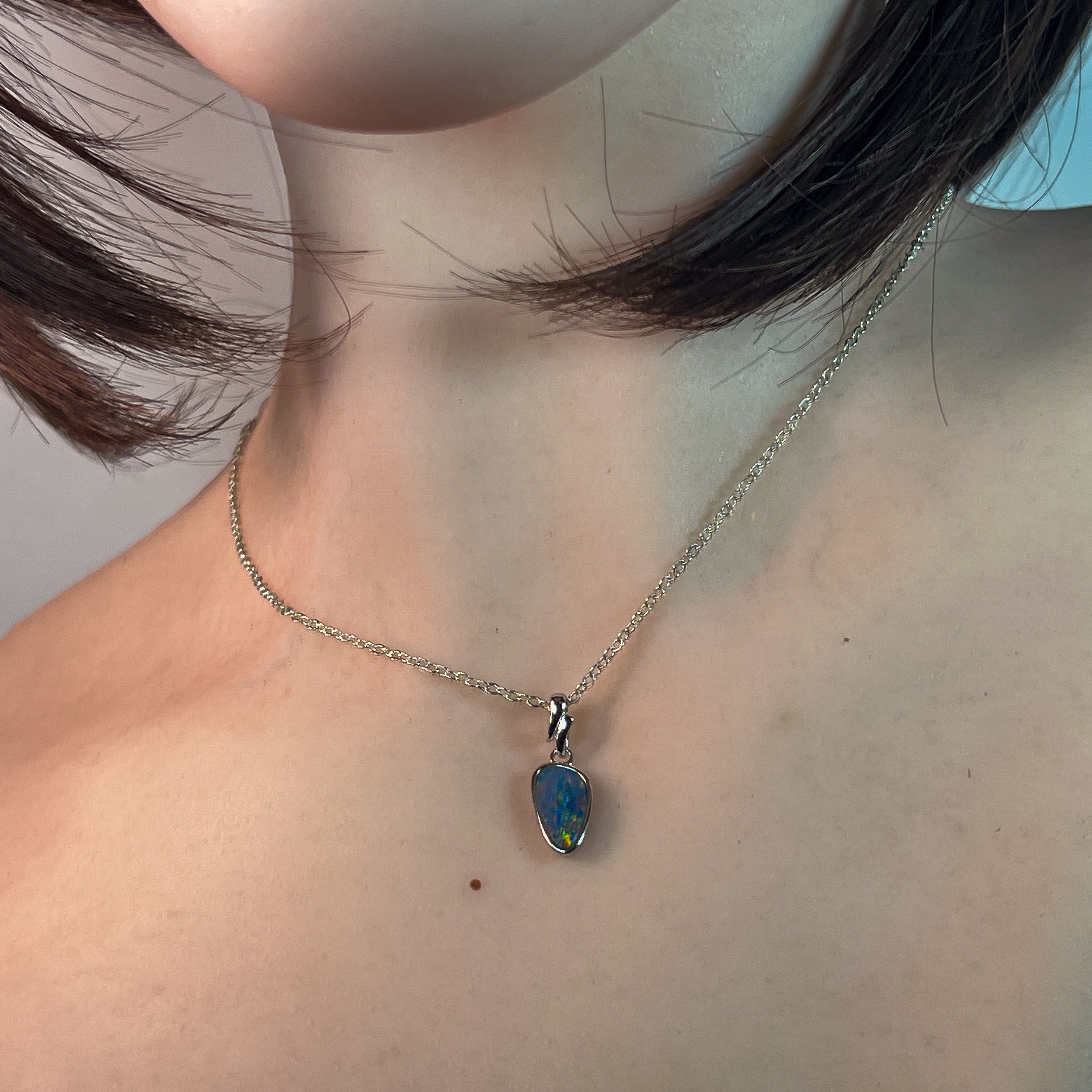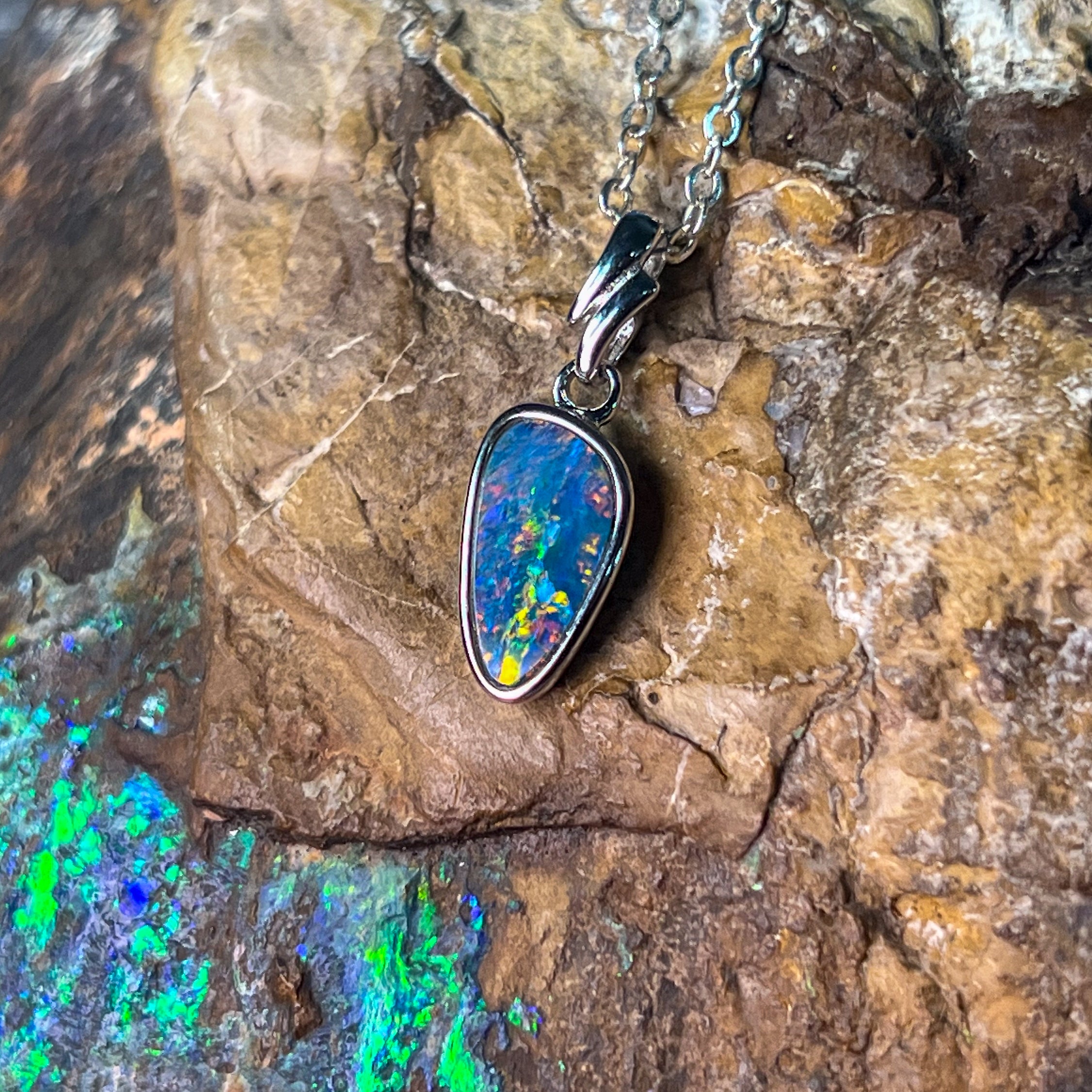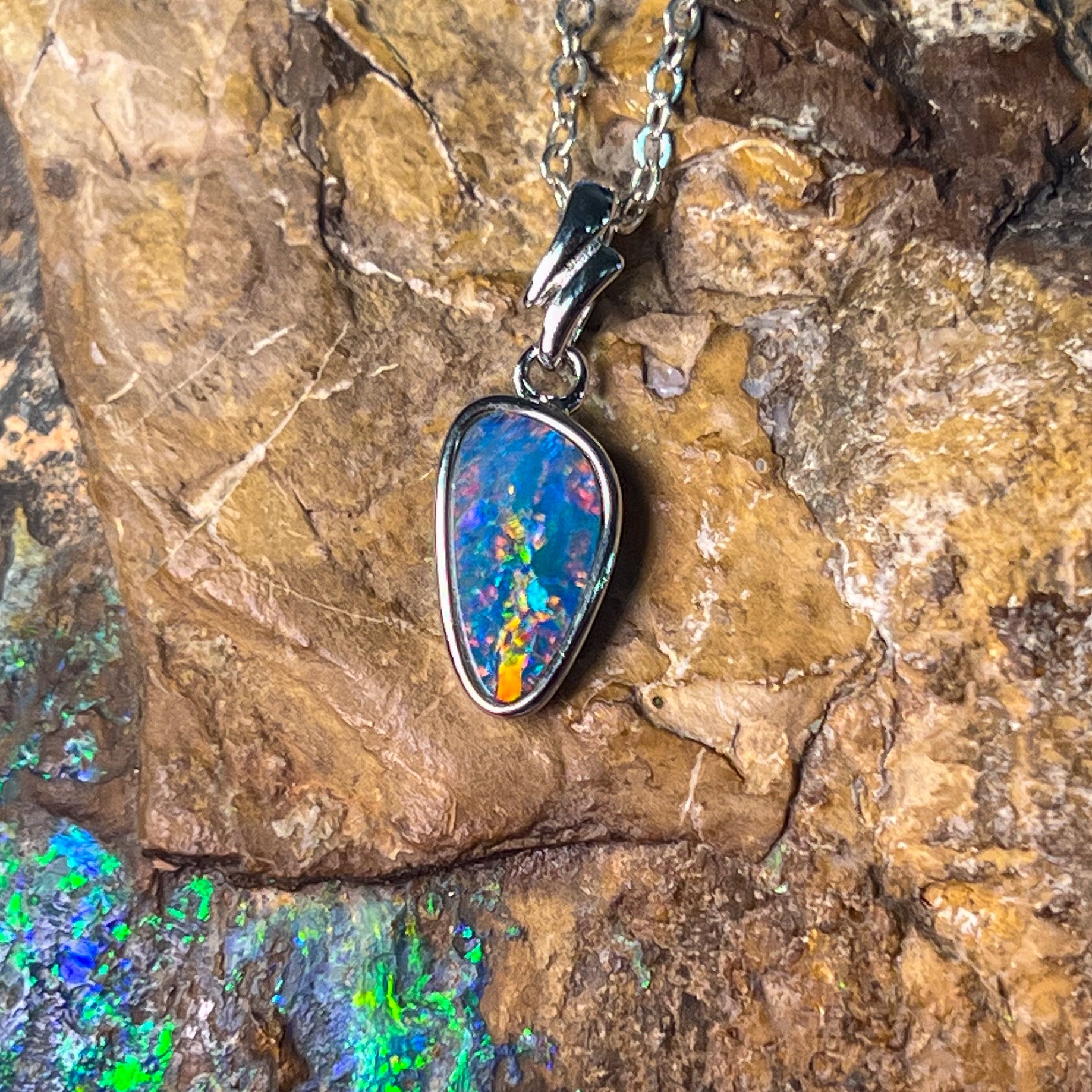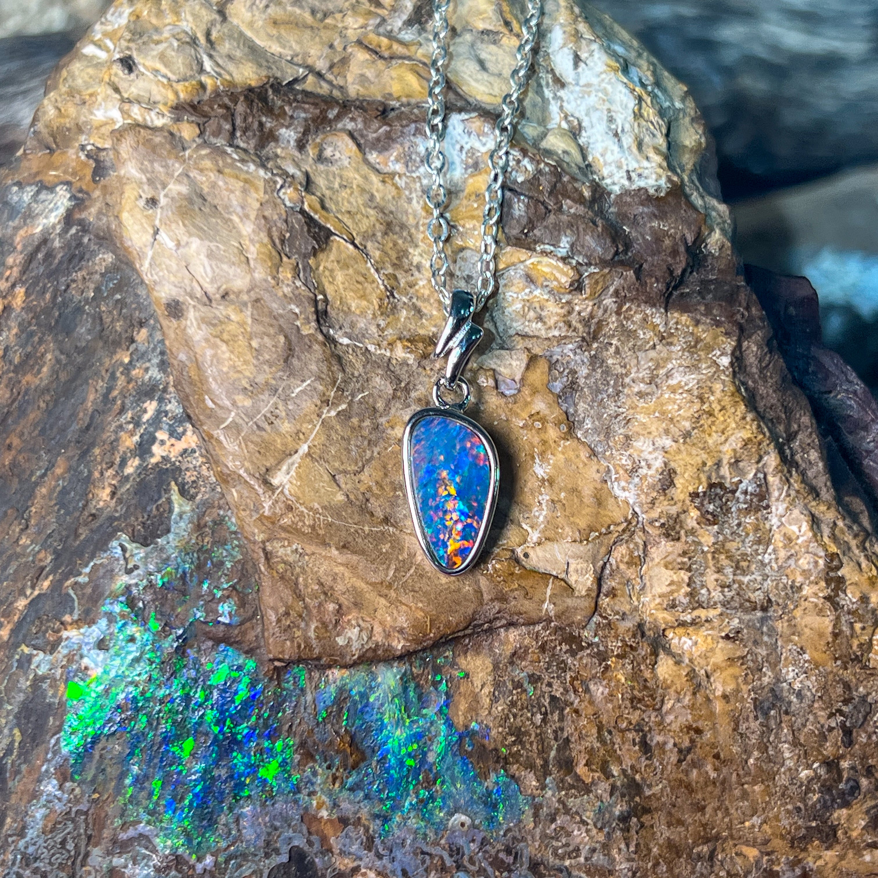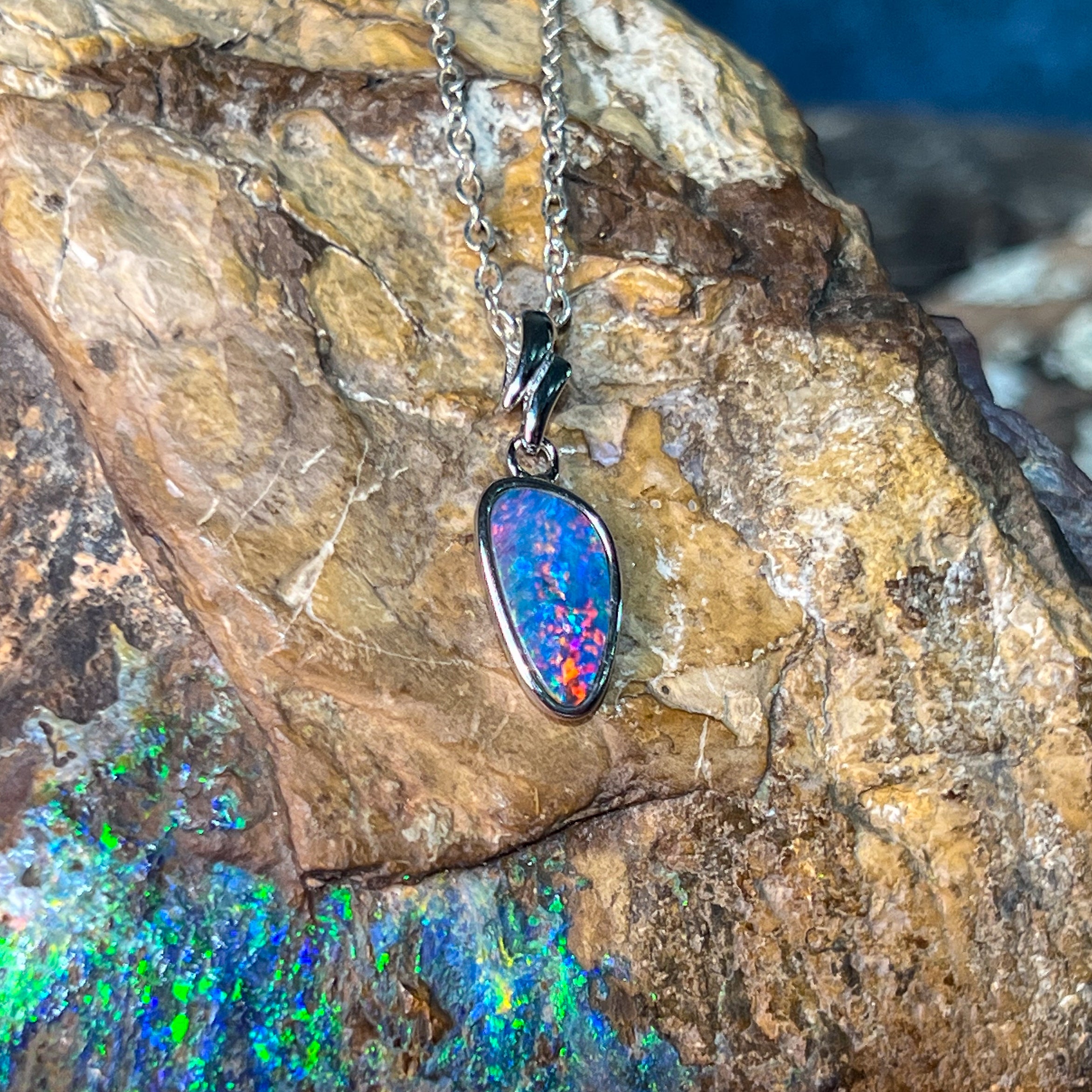 This sterling silver pendant features a striking triangle-shaped opal doublet, showcasing vibrant red and green flashes. Its elegant design adds a unique touch to any outfit, making it a perfect accessory for everyday wear or special occasions.