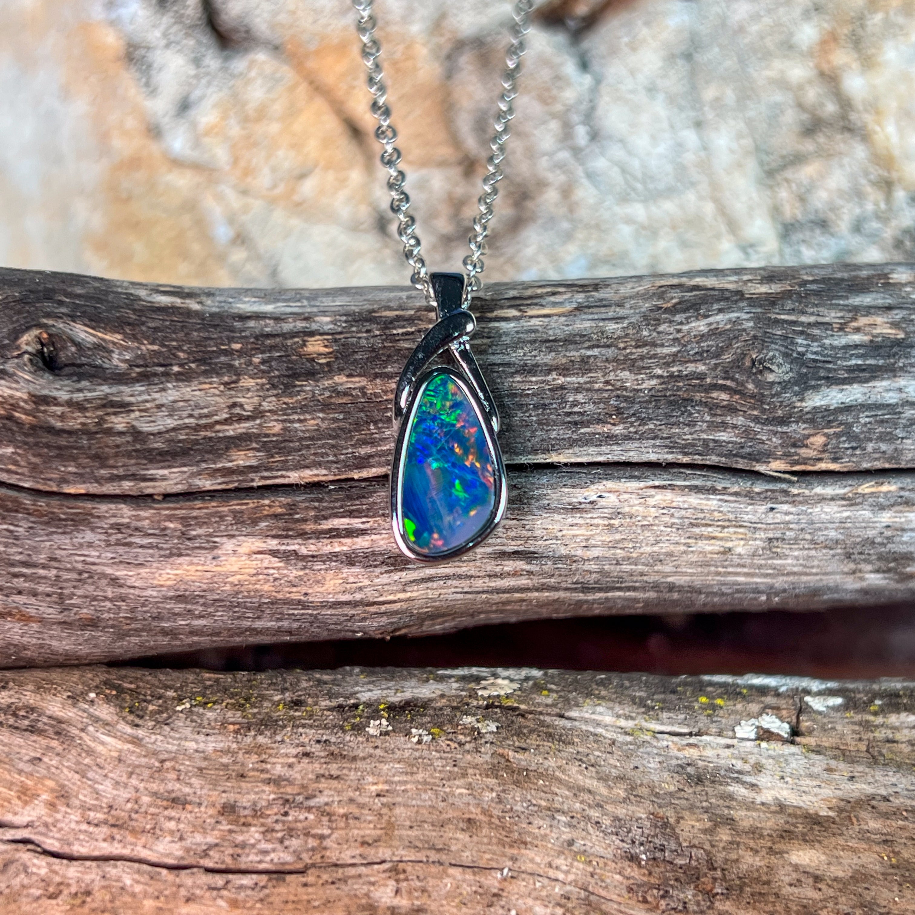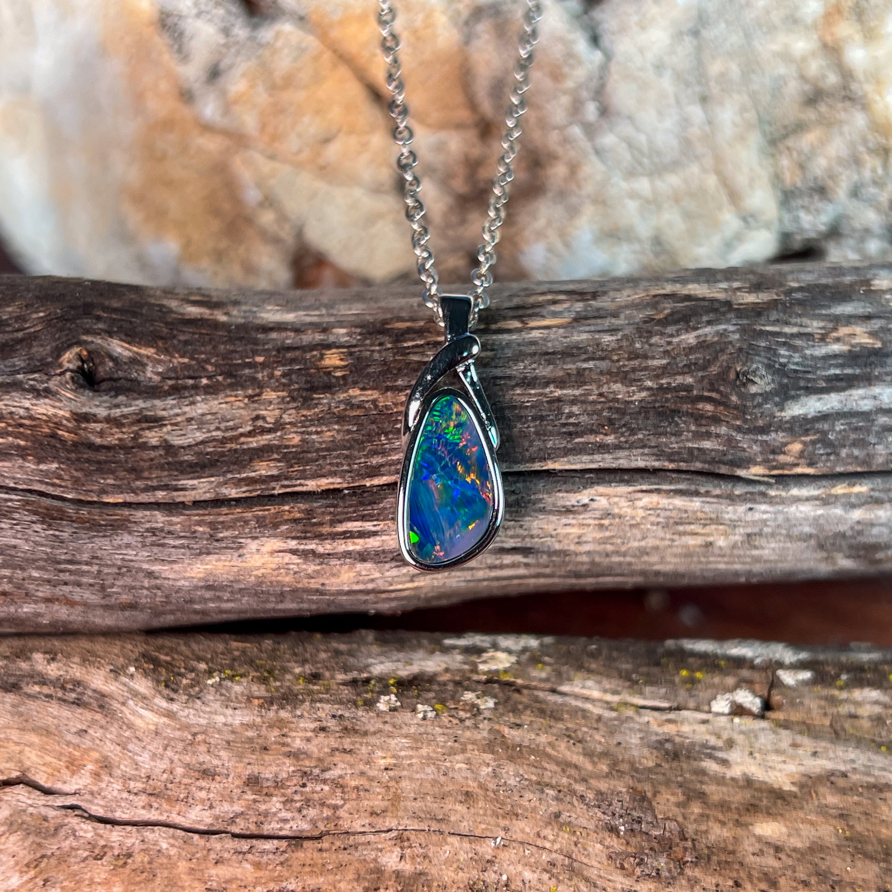 Elevate your jewellery collection with this stunning Sterling Silver twist loop Opal doublet pendant. Featuring a mesmerising play of multi-coloured light, each opal doublet displays its own unique palette of vibrant hues that shift and dance with every movement. The elegant twist loop design adds contemporary sophistication, while the precious opal showcases nature's most captivating colour spectrum. Perfect for those who appreciate individuality and natural beauty, this pendant transforms any outfit into something truly extraordinary. A timeless piece that celebrates the magic of Australian opals.