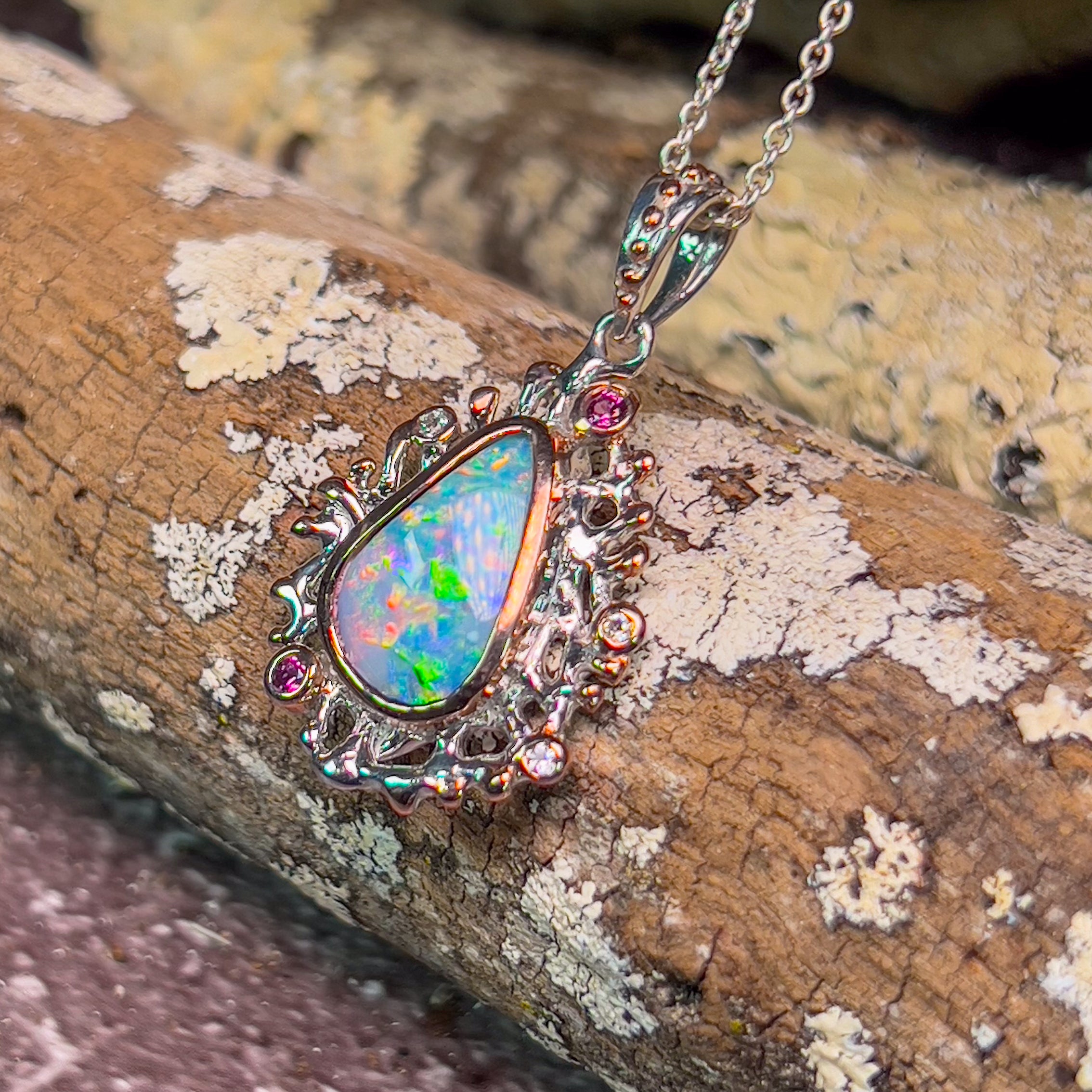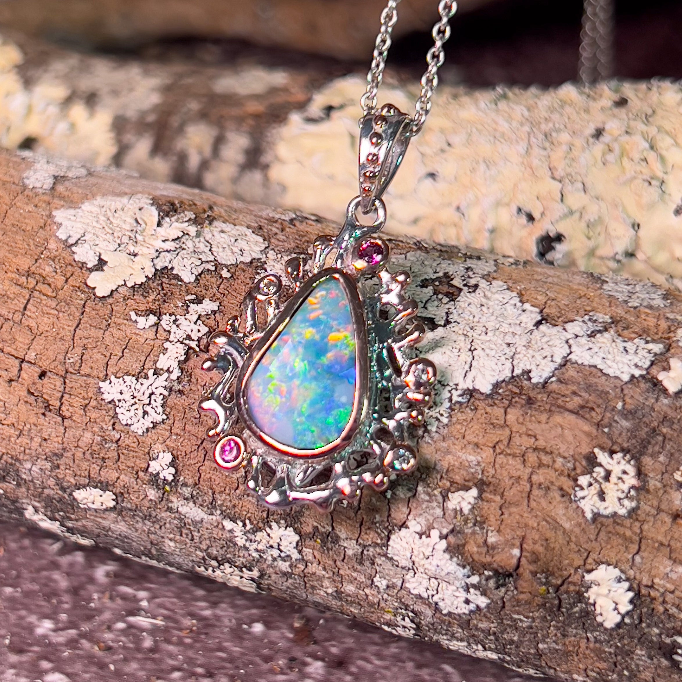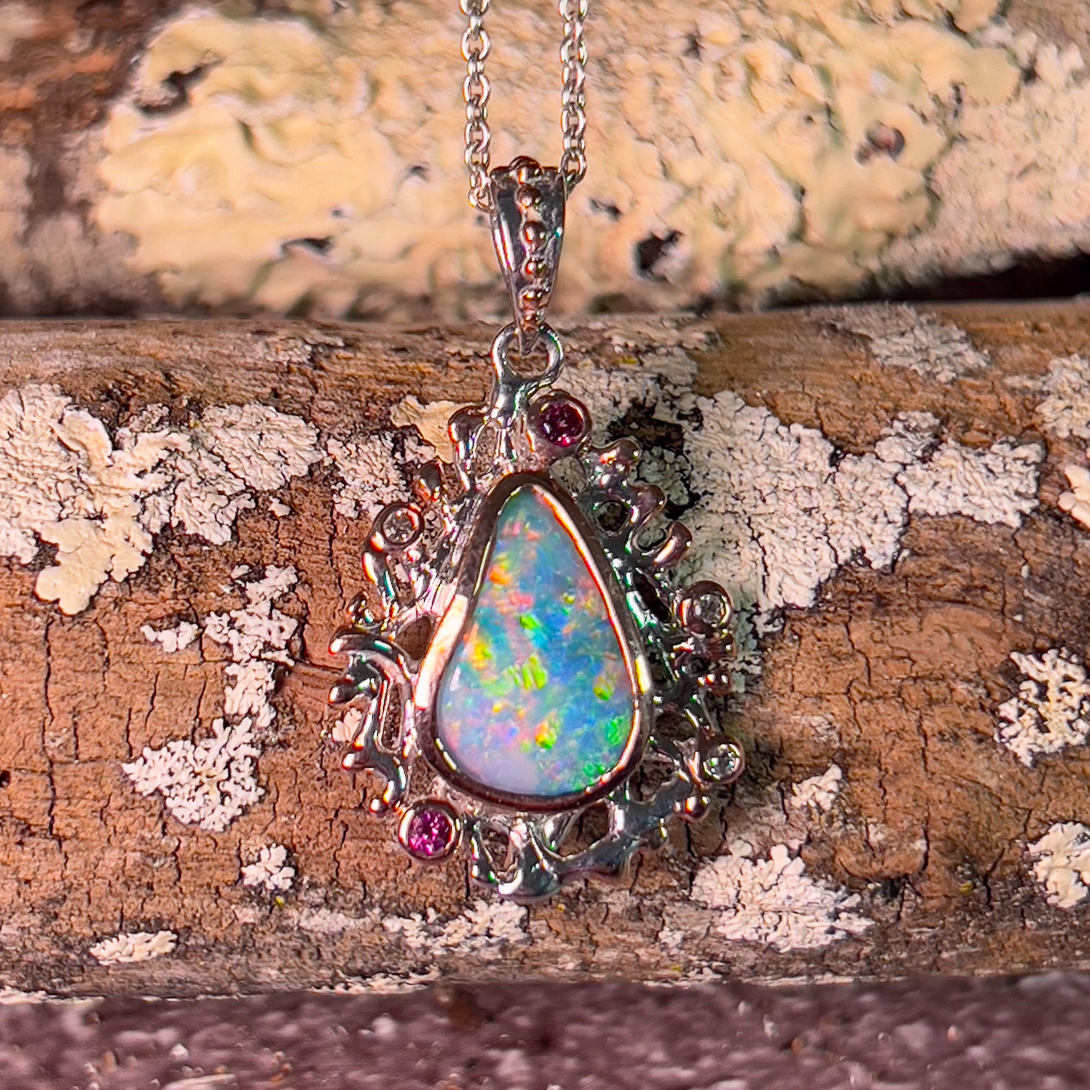 Sterling Silver Two tone coral design Opal and colour stone pendant