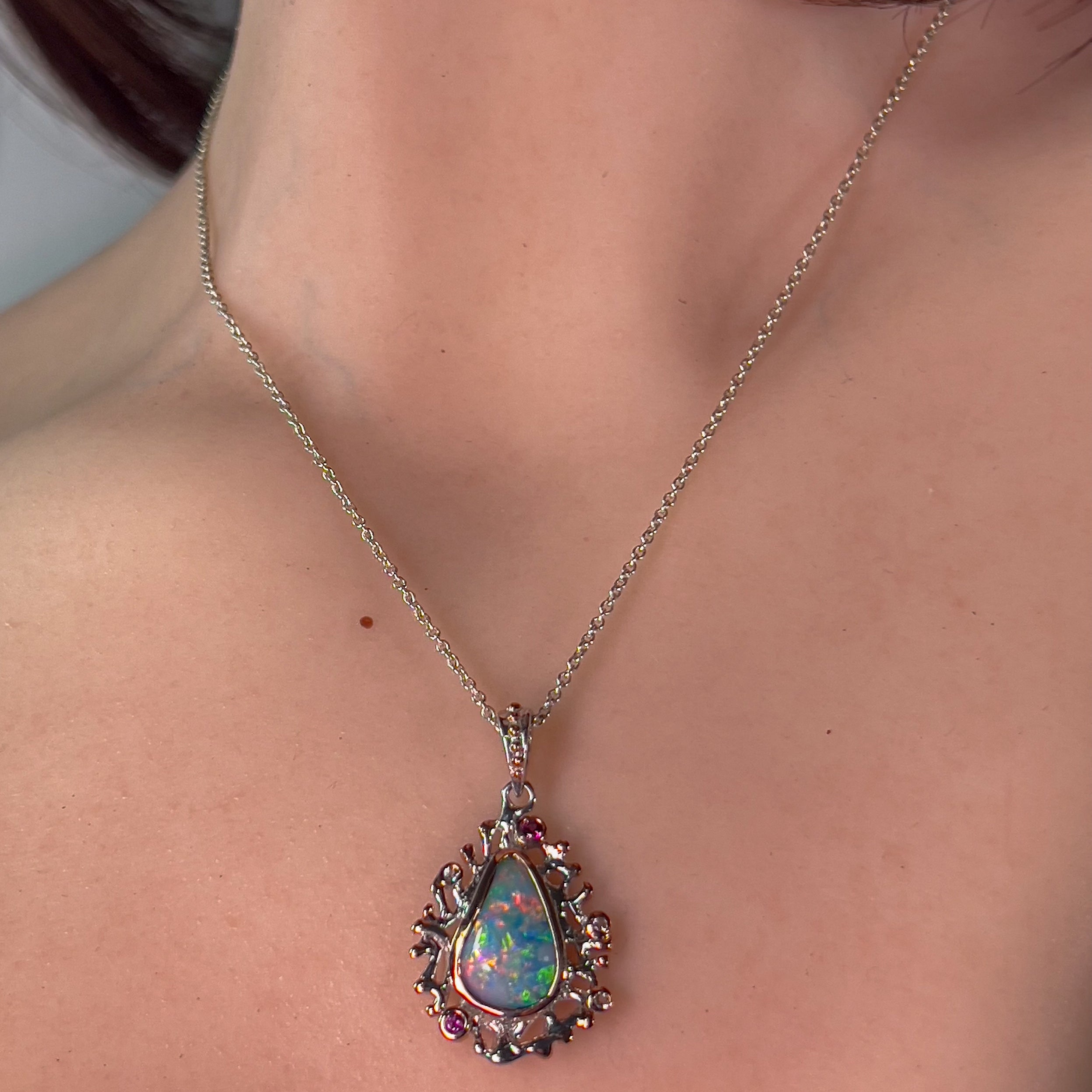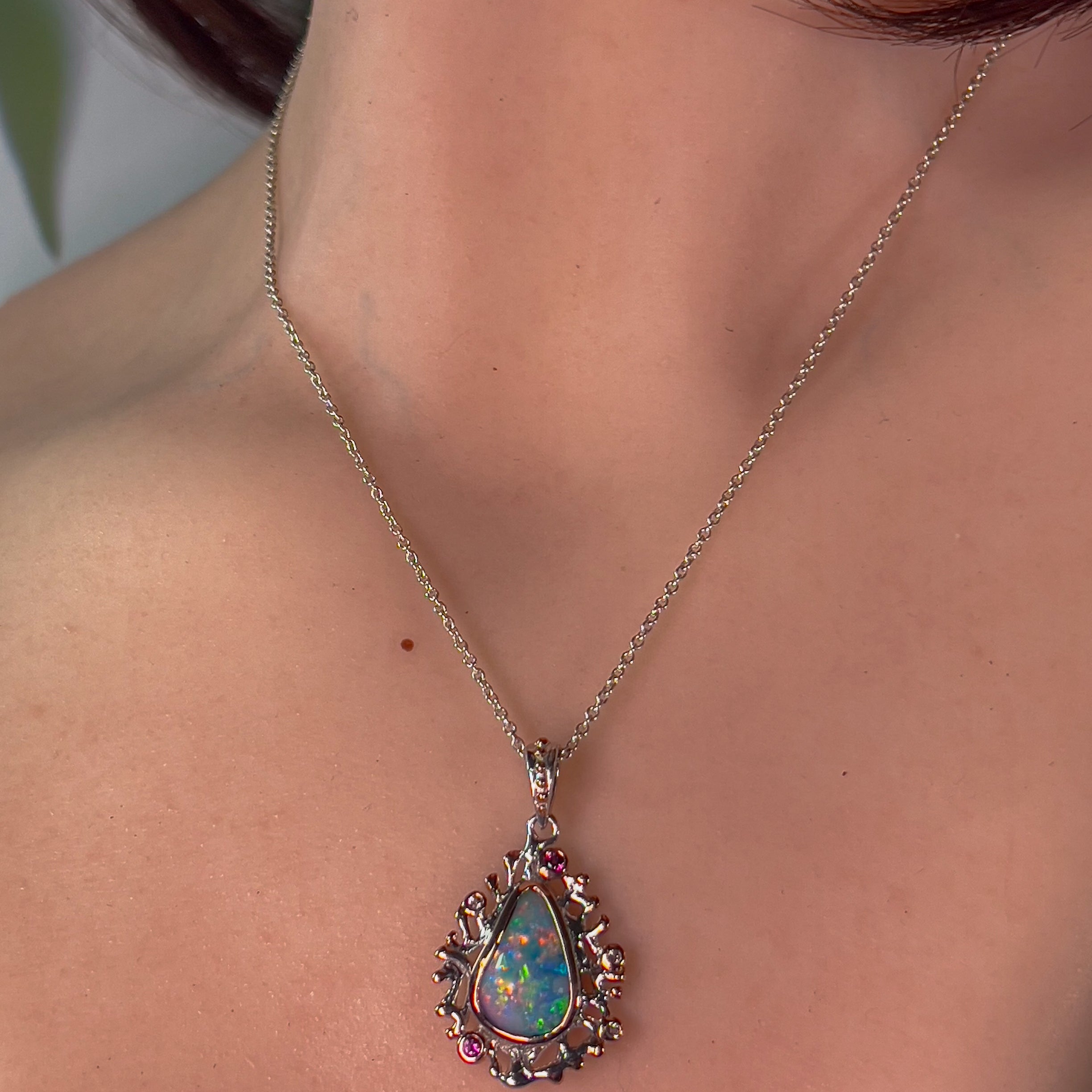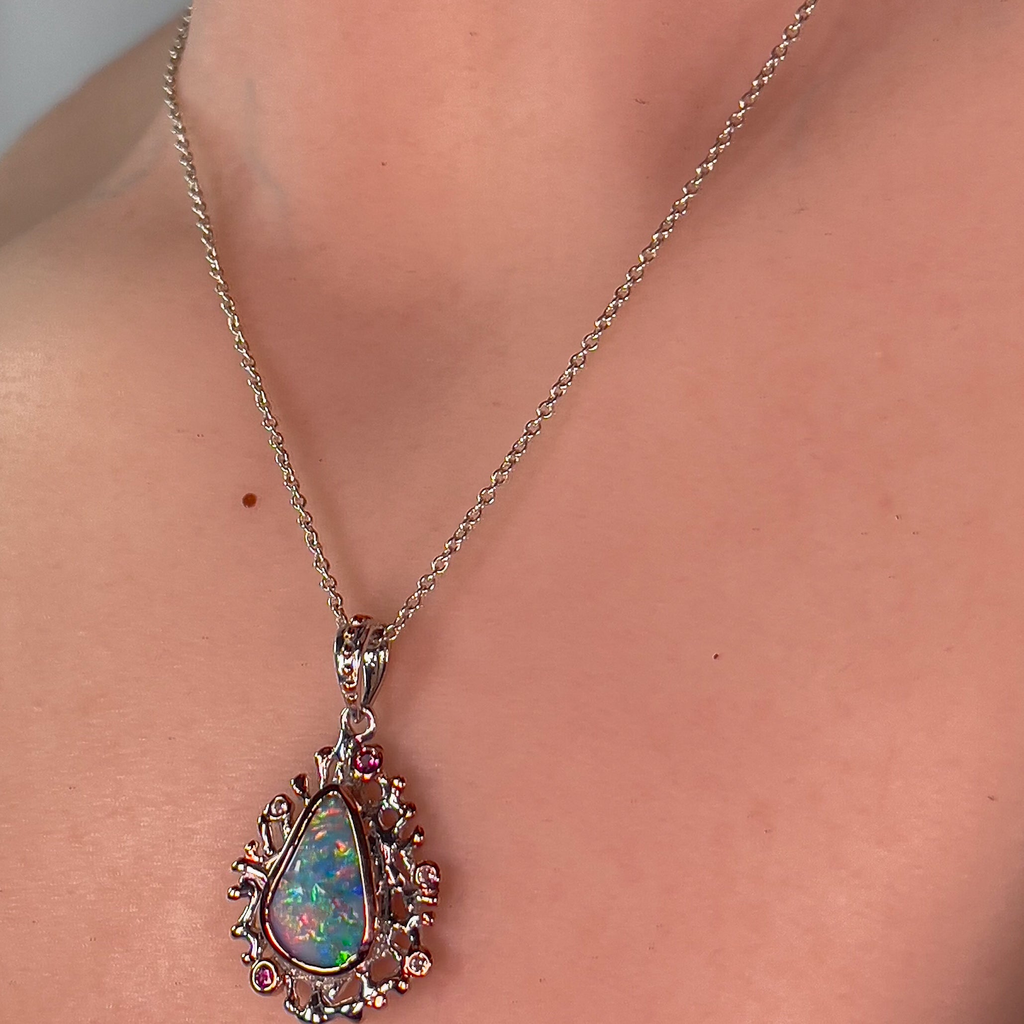 This stunning Sterling Silver Two tone coral design pendant features a captivating coral ocean motif. Expertly crafted with vibrant opals and colorful stones, it's the perfect statement piece for anyone who loves the beauty of the ocean.