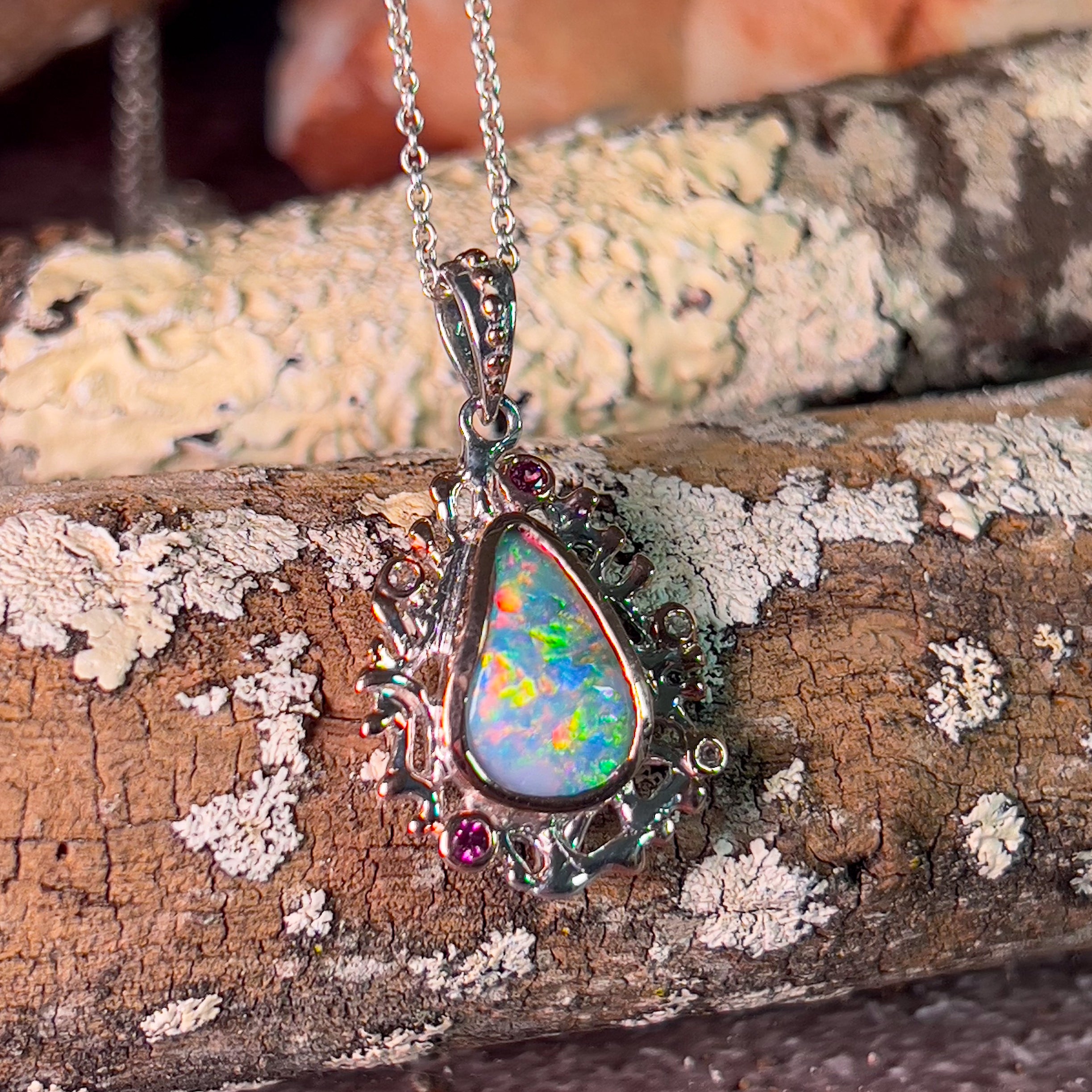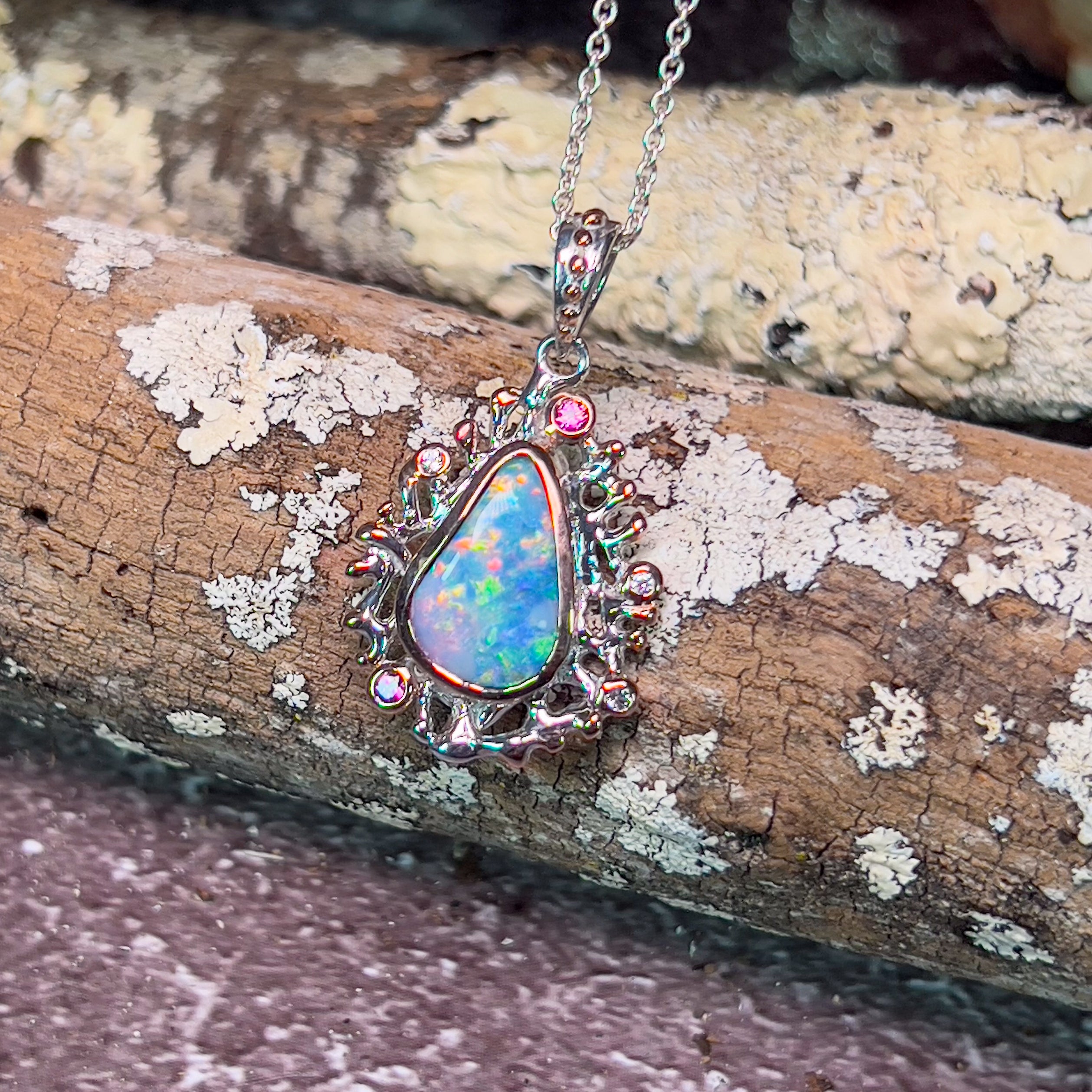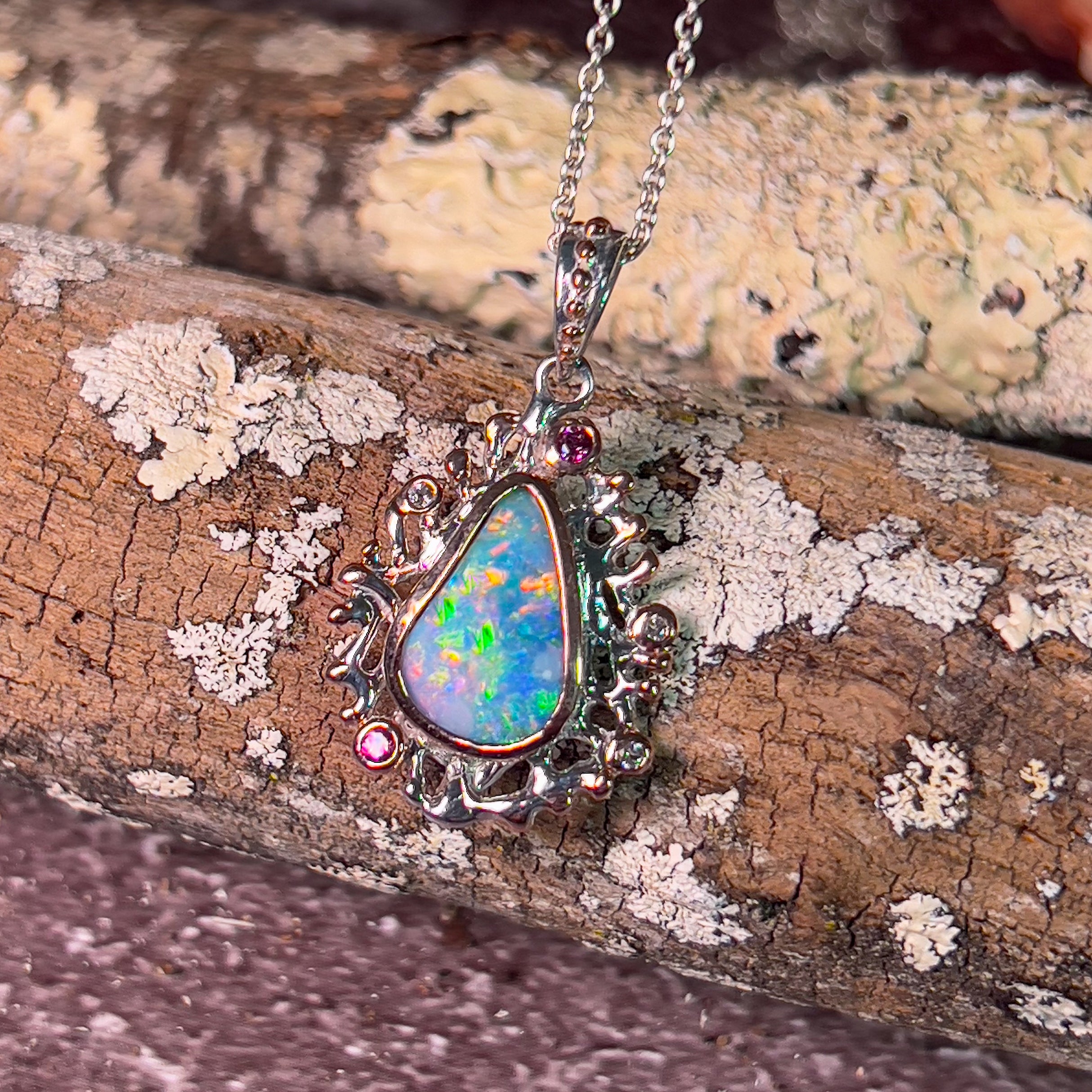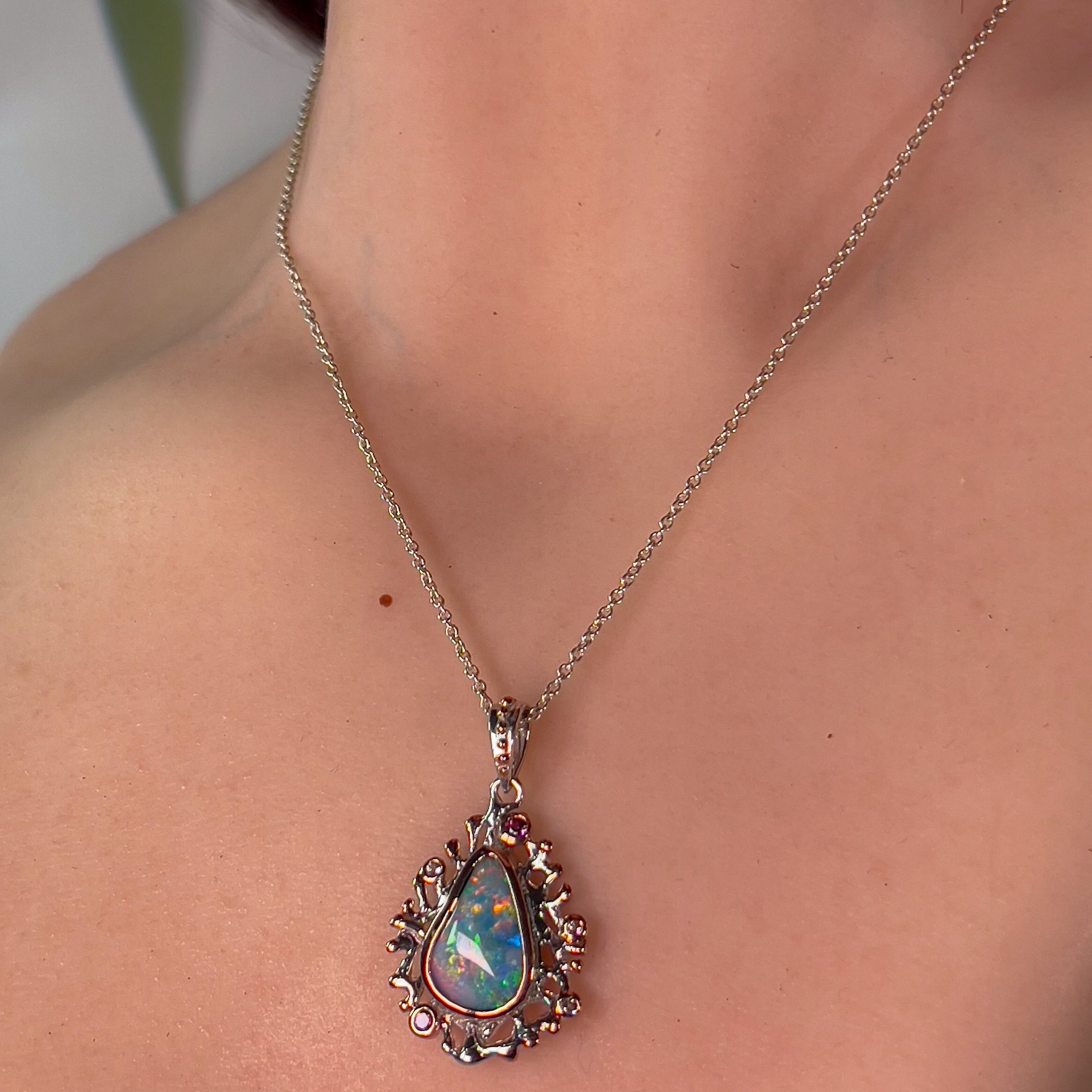 This stunning Sterling Silver Two tone coral design pendant features a captivating coral ocean motif. Expertly crafted with vibrant opals and colorful stones, it's the perfect statement piece for anyone who loves the beauty of the ocean.