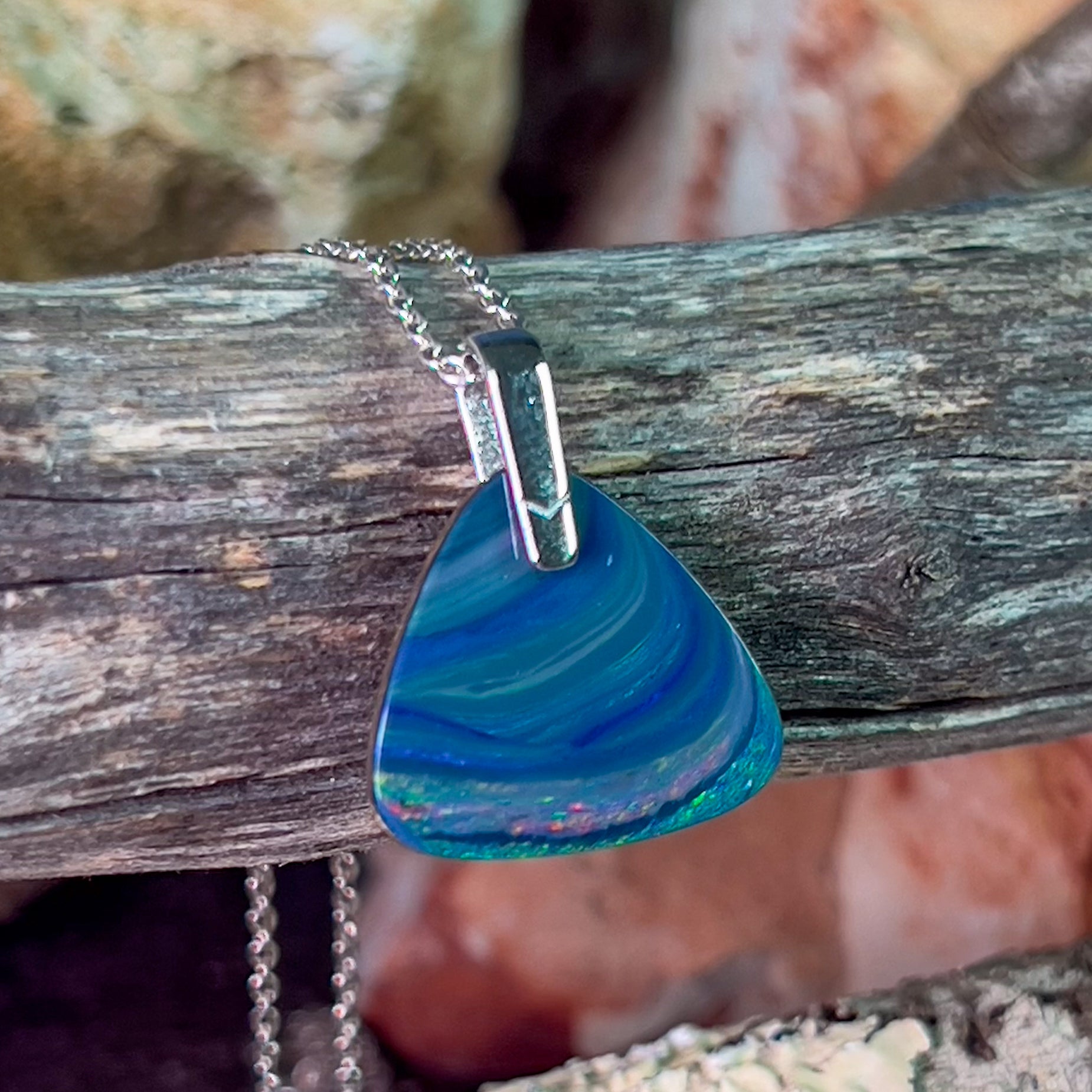 Elevate your style game with our Sterling Silver Triangle Opal doublet. The wave line patterns add a touch of elegance to this unique design. Shine and stand out with this beautiful piece that will complement any outfit.