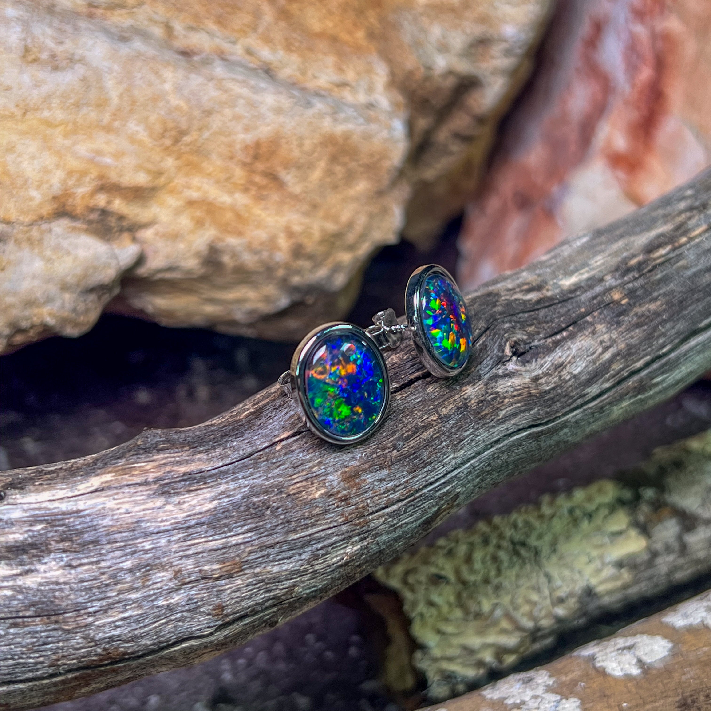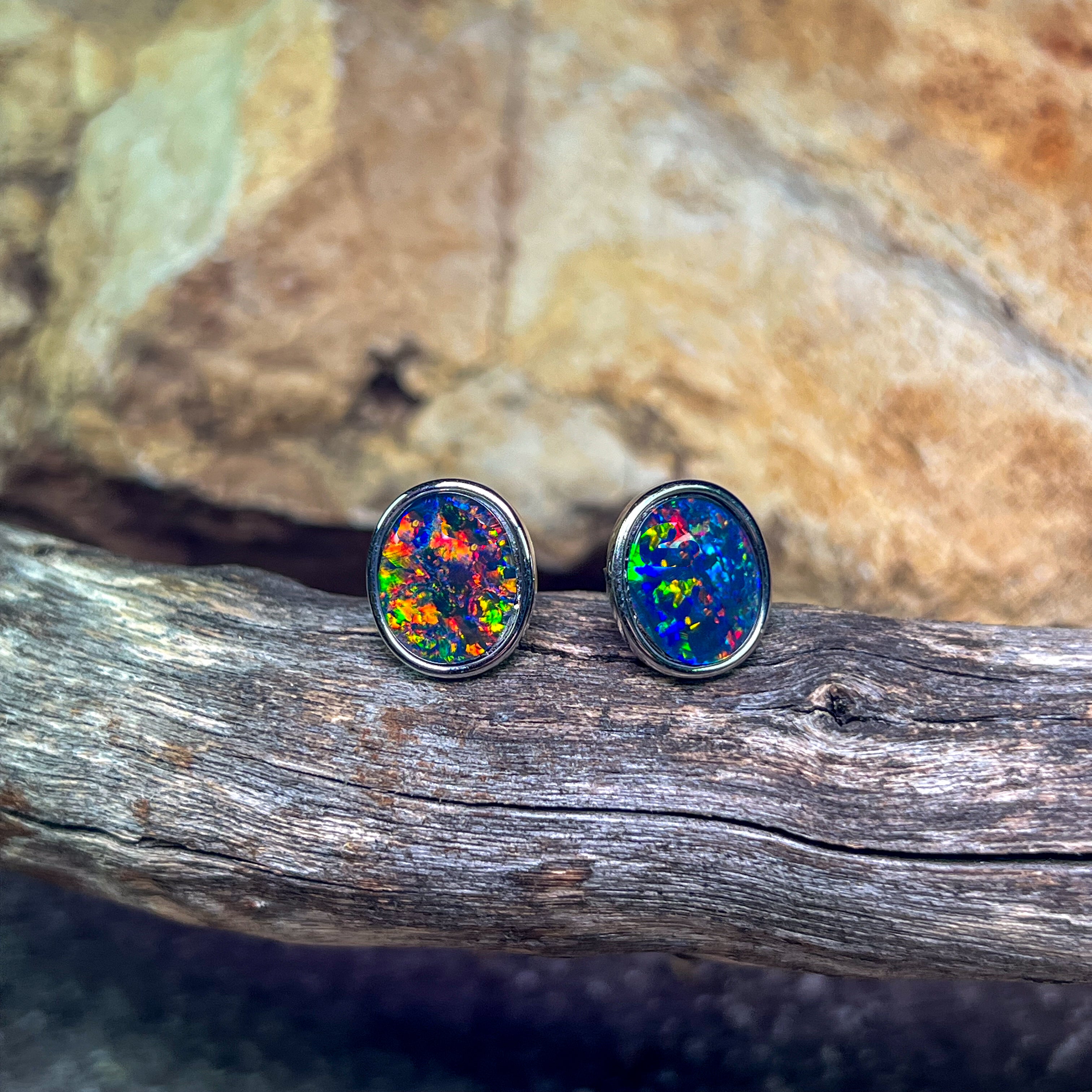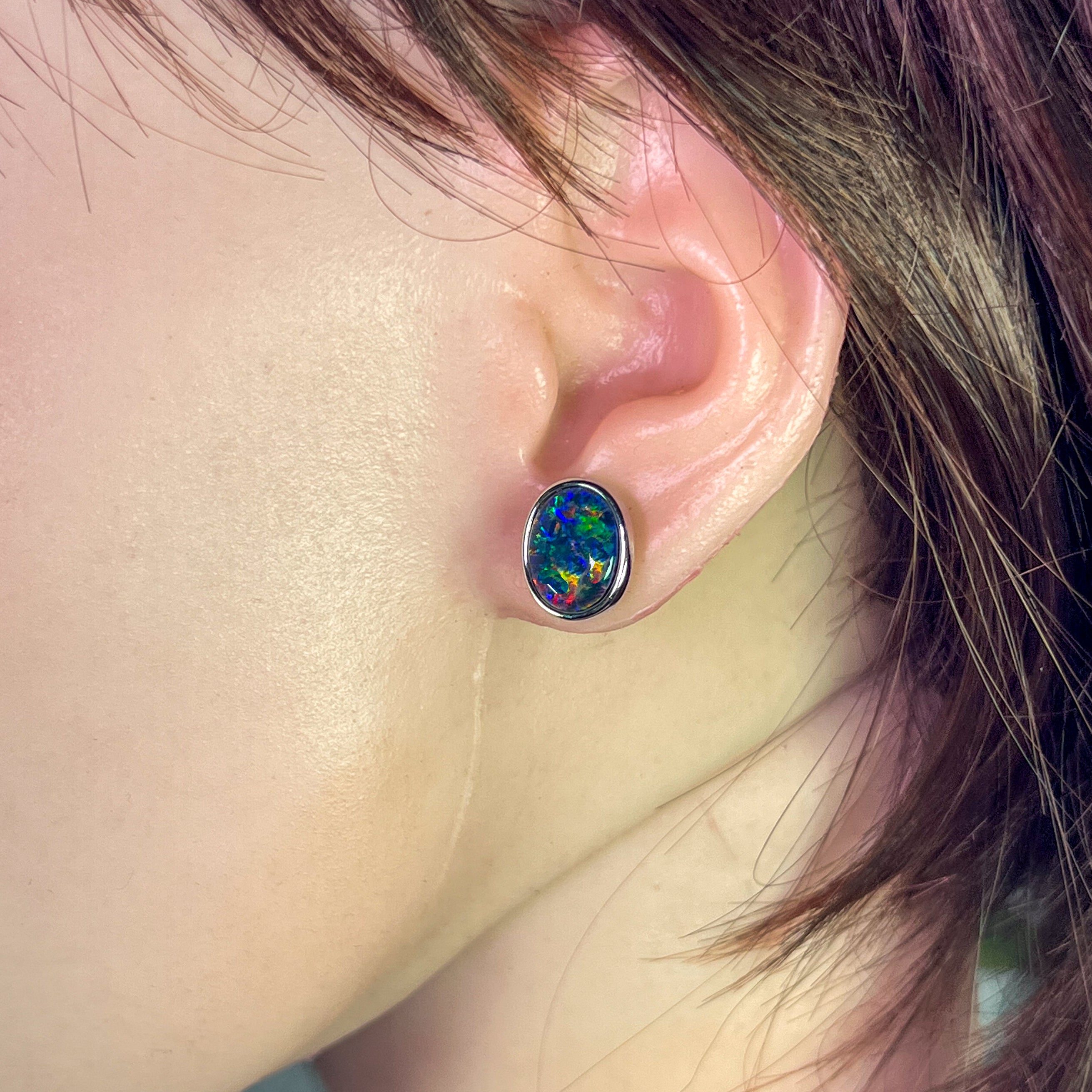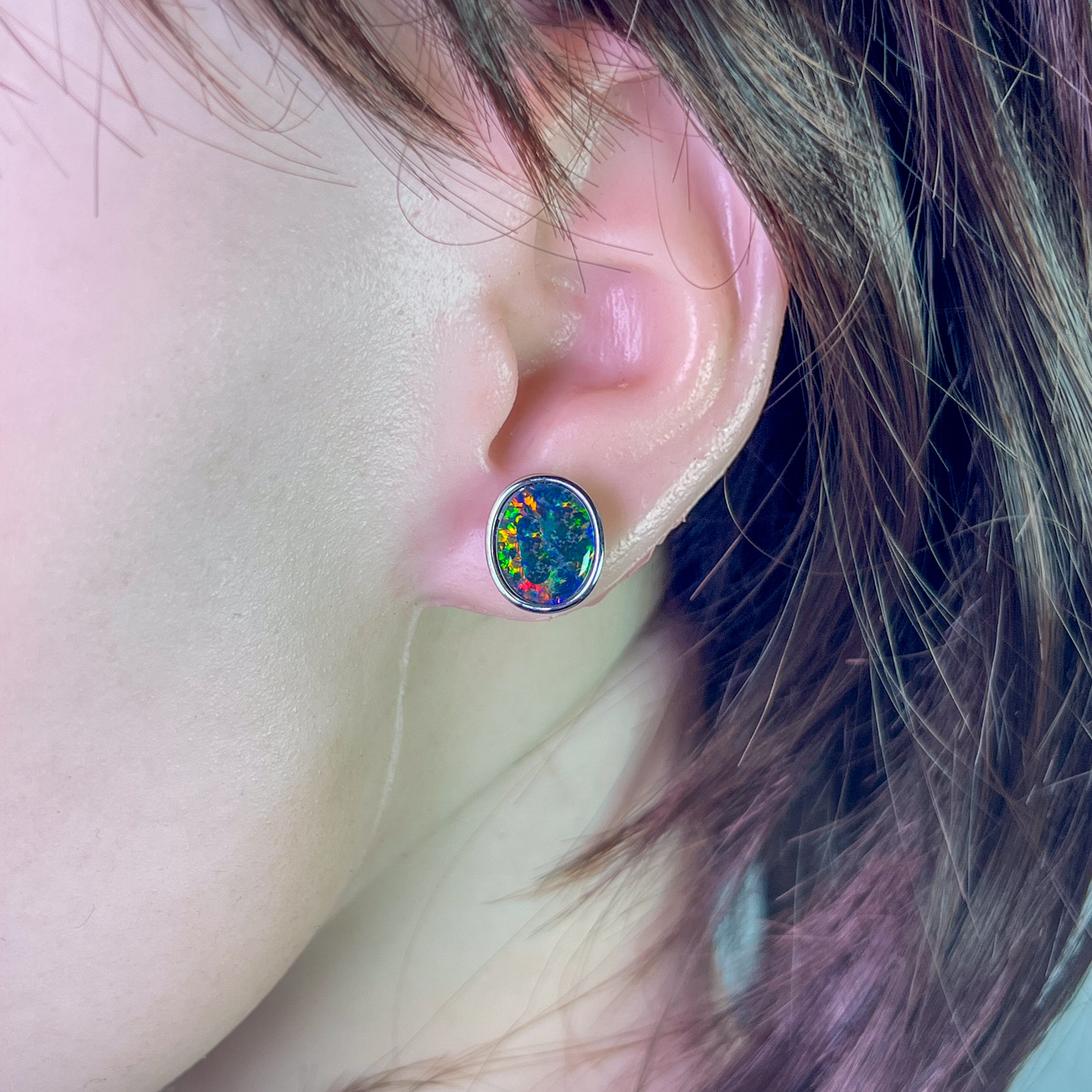 ONE PAIR OS STERLING SILVER EARRING STUDS 12X10MM AUSTRALIAN OPAL TRIPLET BEZEL SET