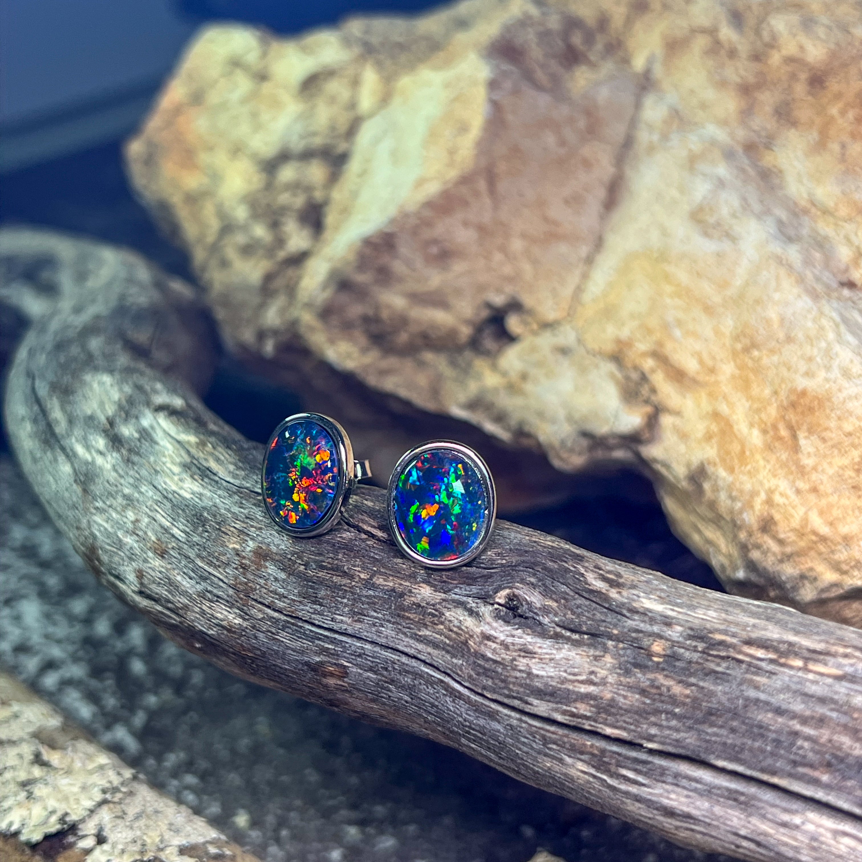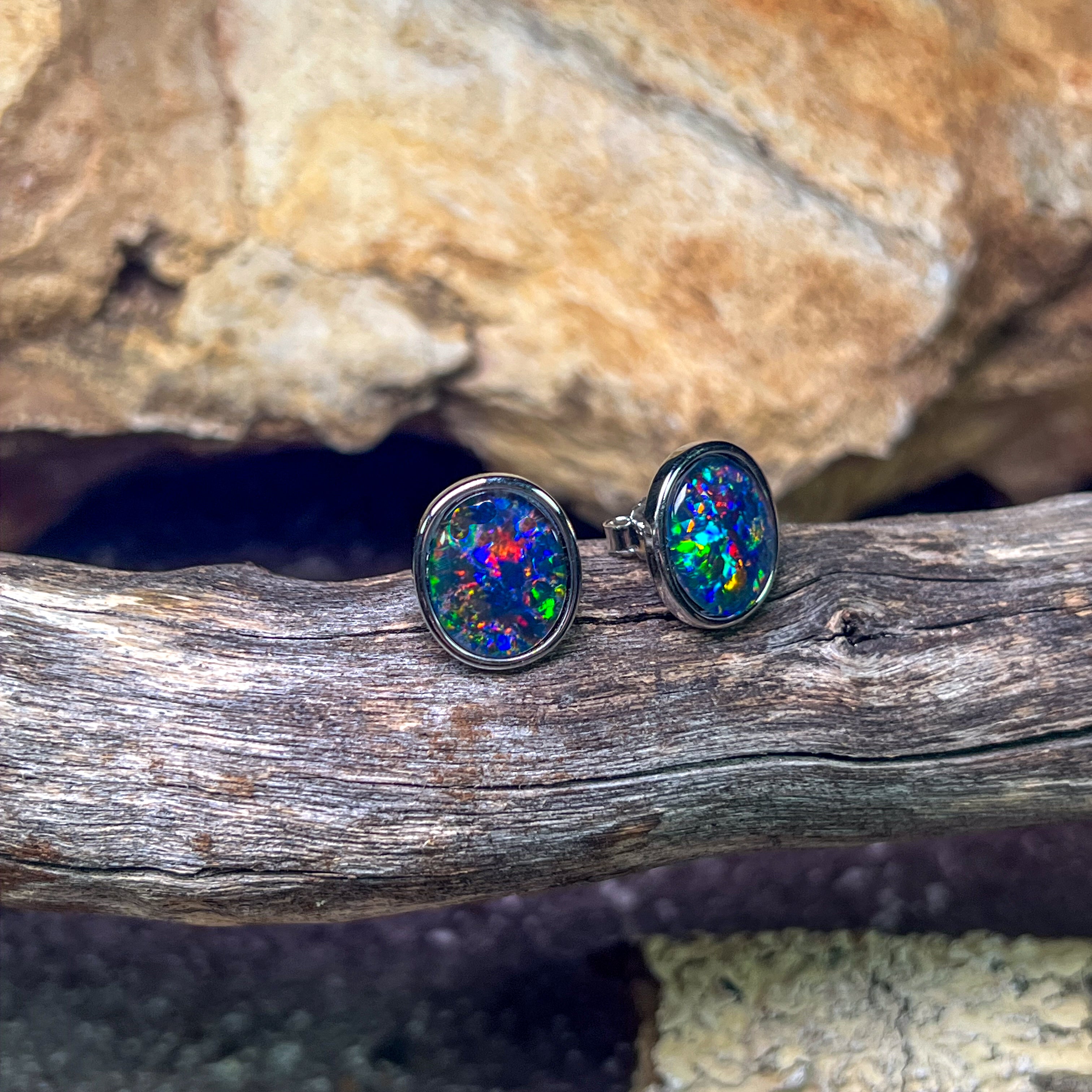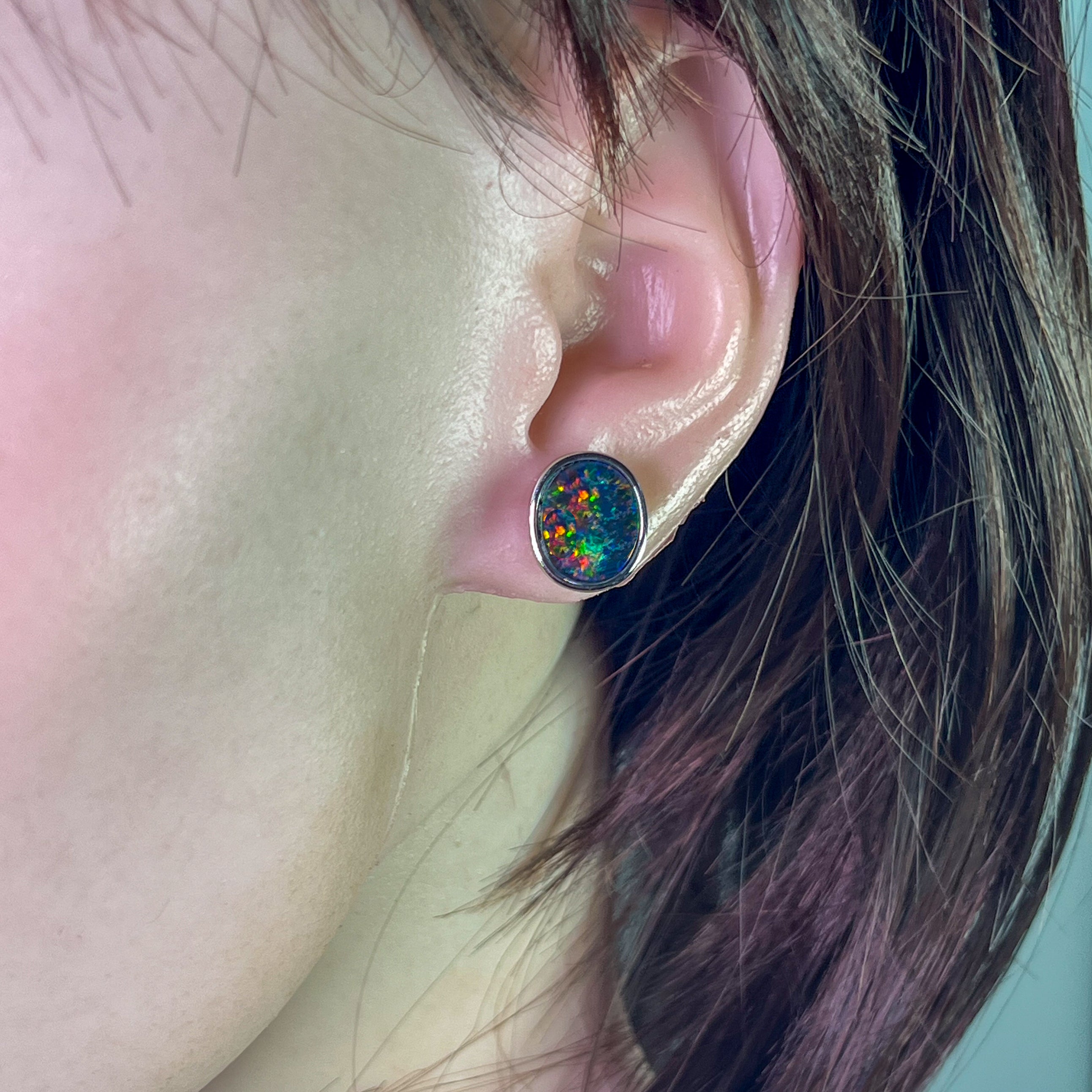 ONE PAIR OS STERLING SILVER EARRING STUDS 12X10MM AUSTRALIAN OPAL TRIPLET BEZEL SET