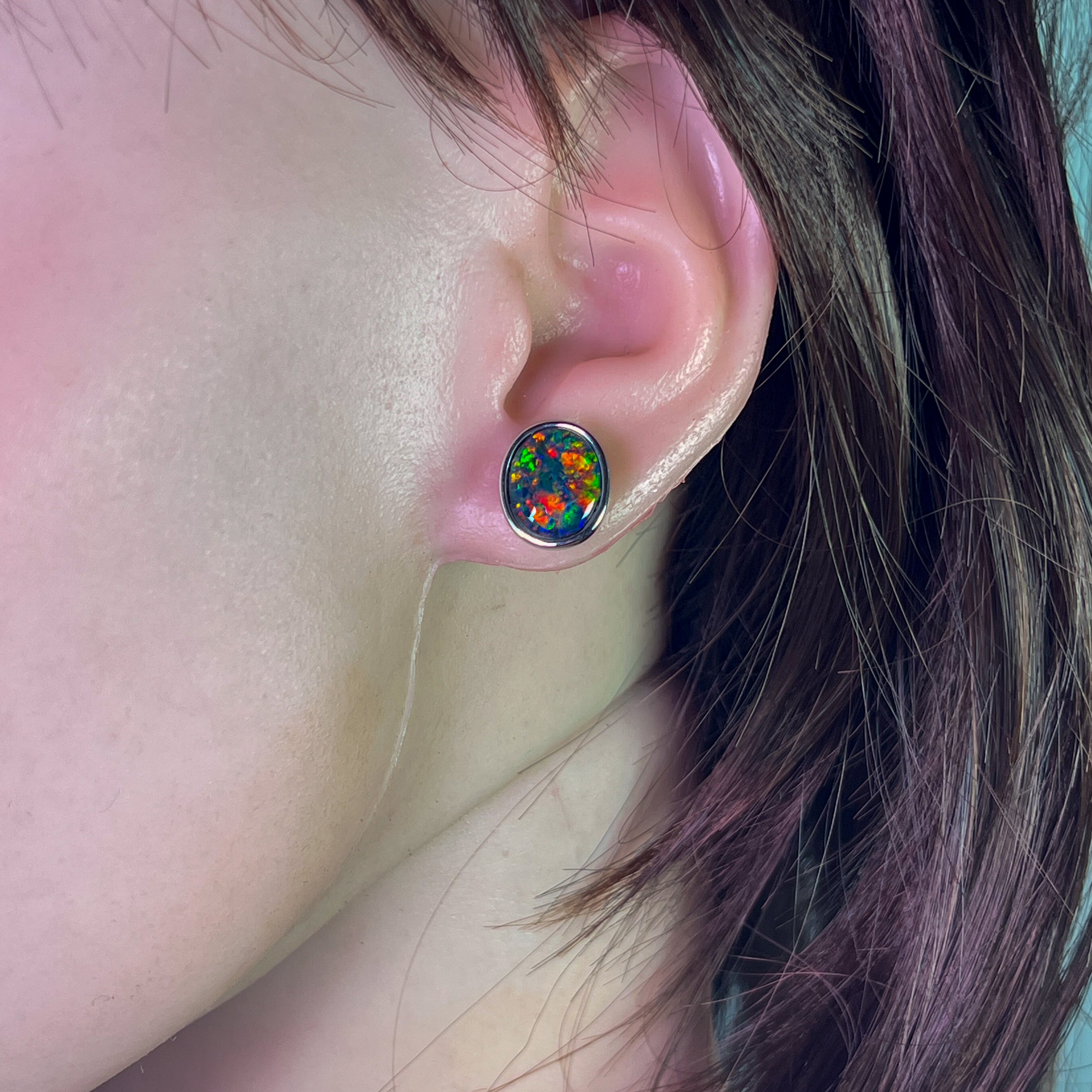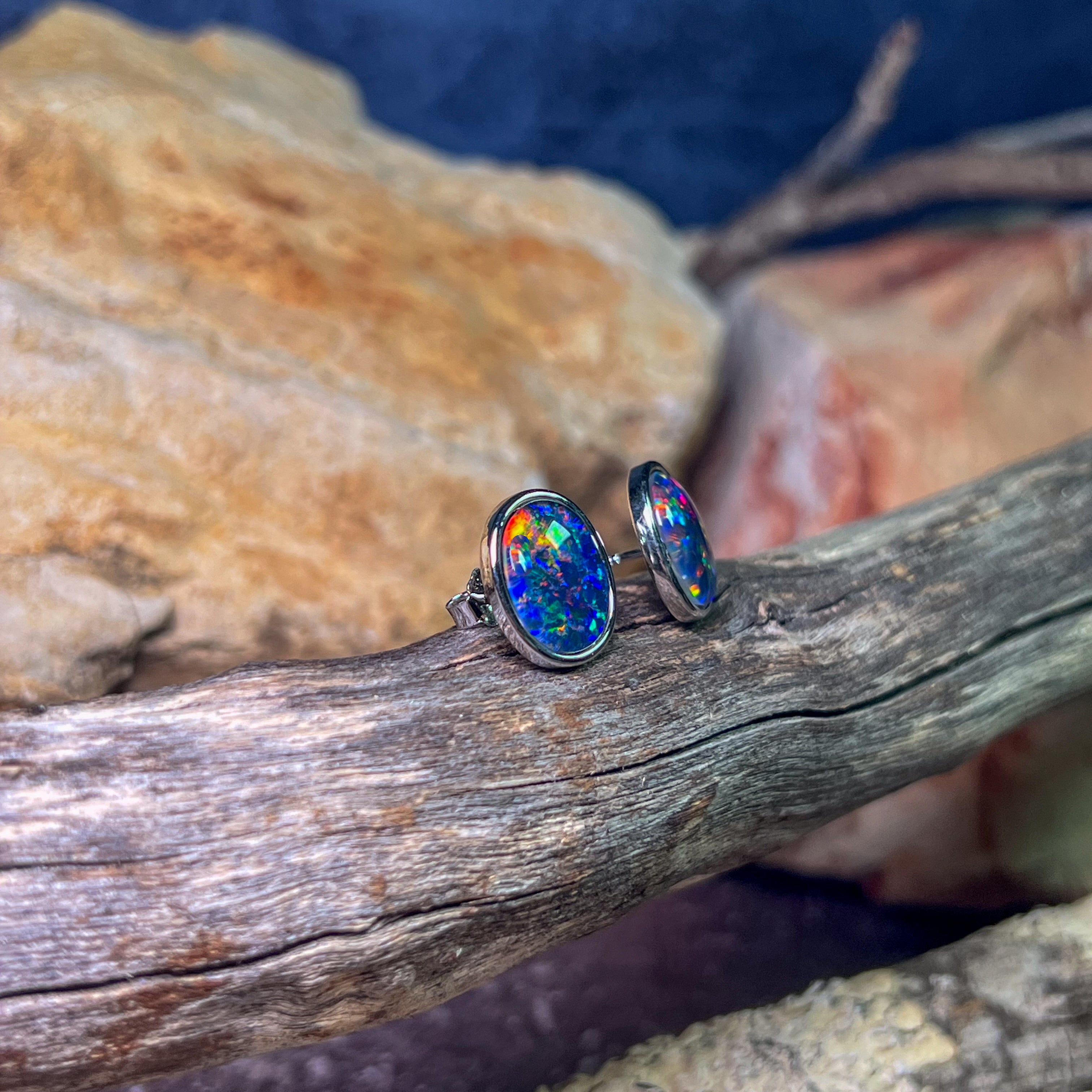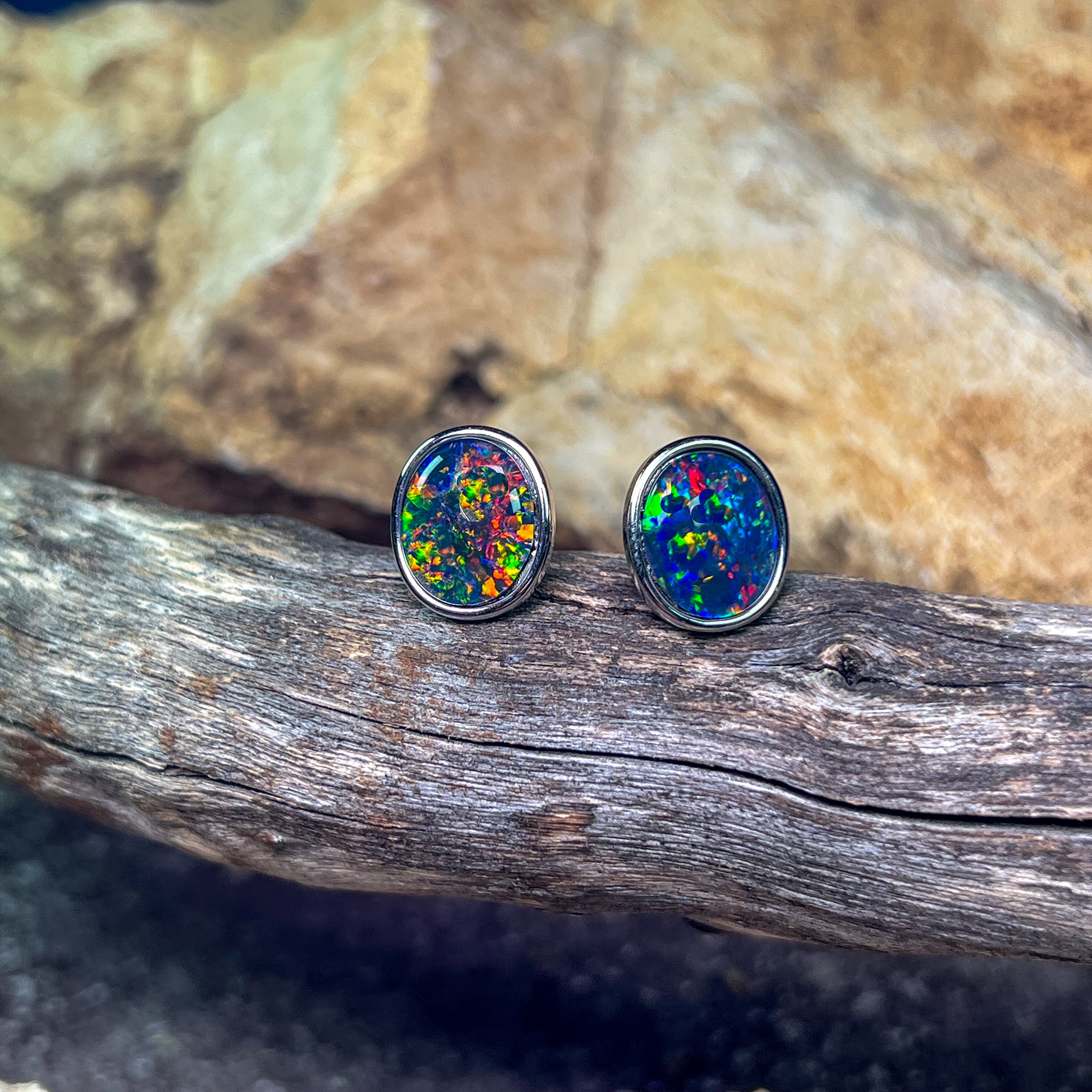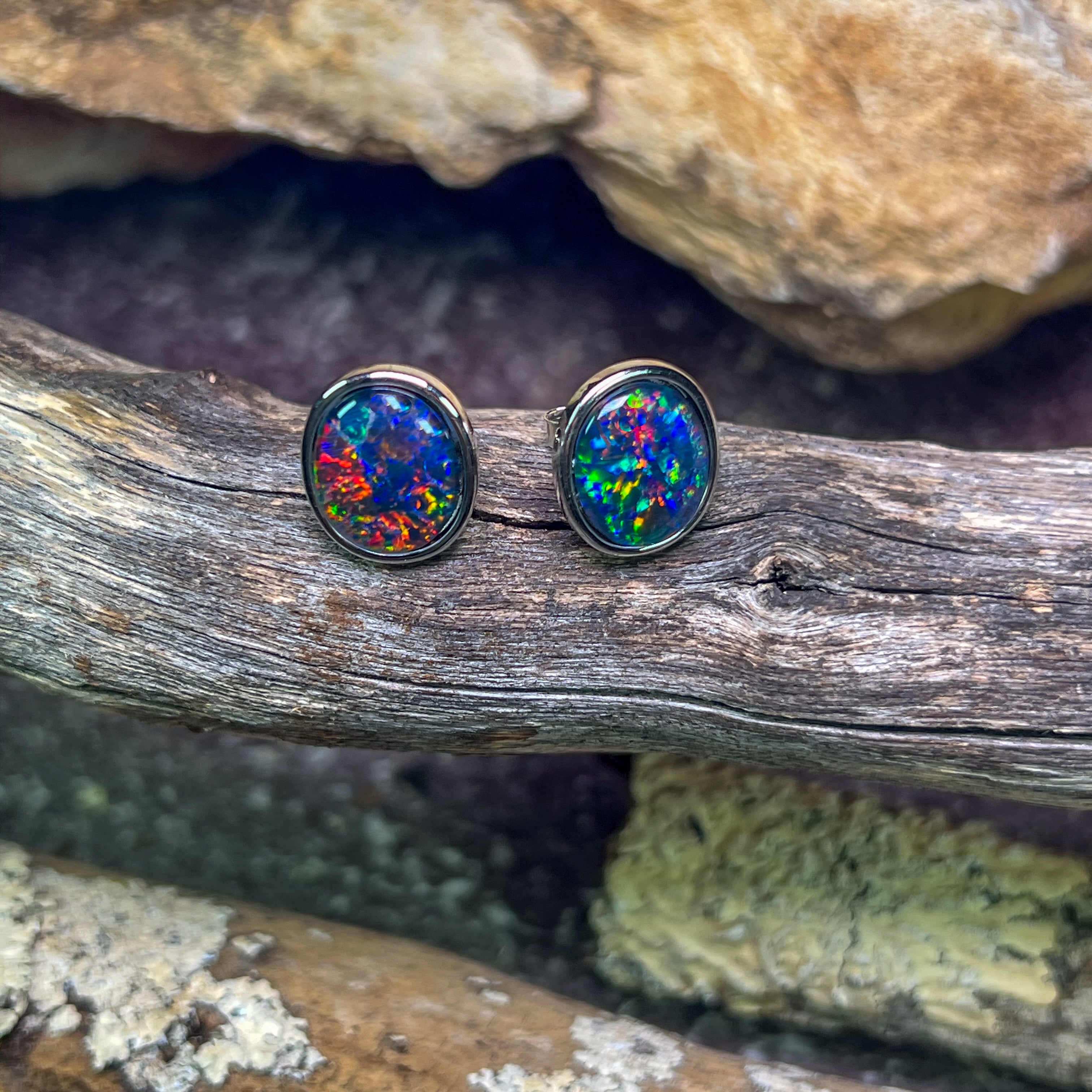 ONE PAIR OS STERLING SILVER EARRING STUDS 12X10MM AUSTRALIAN OPAL TRIPLET BEZEL SET