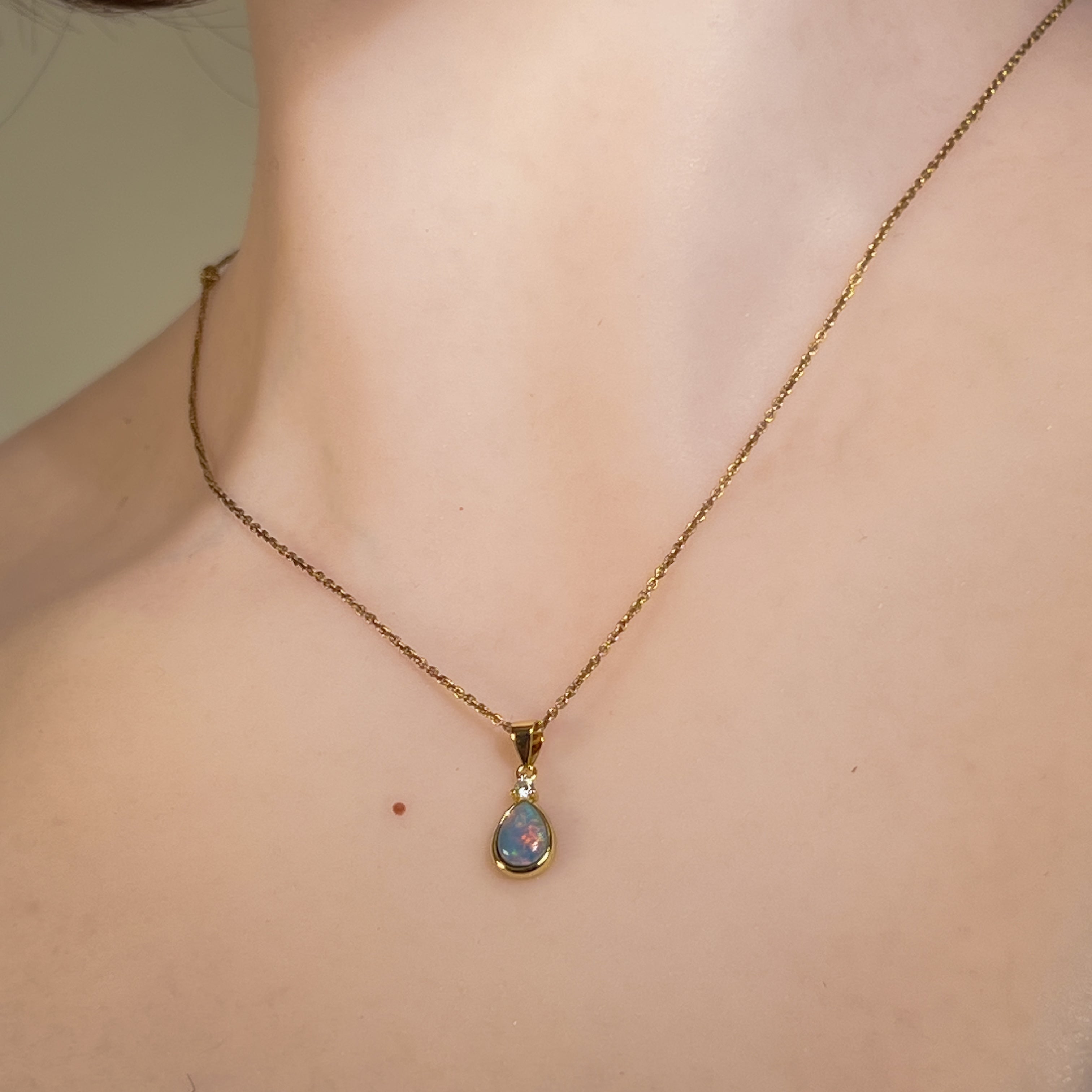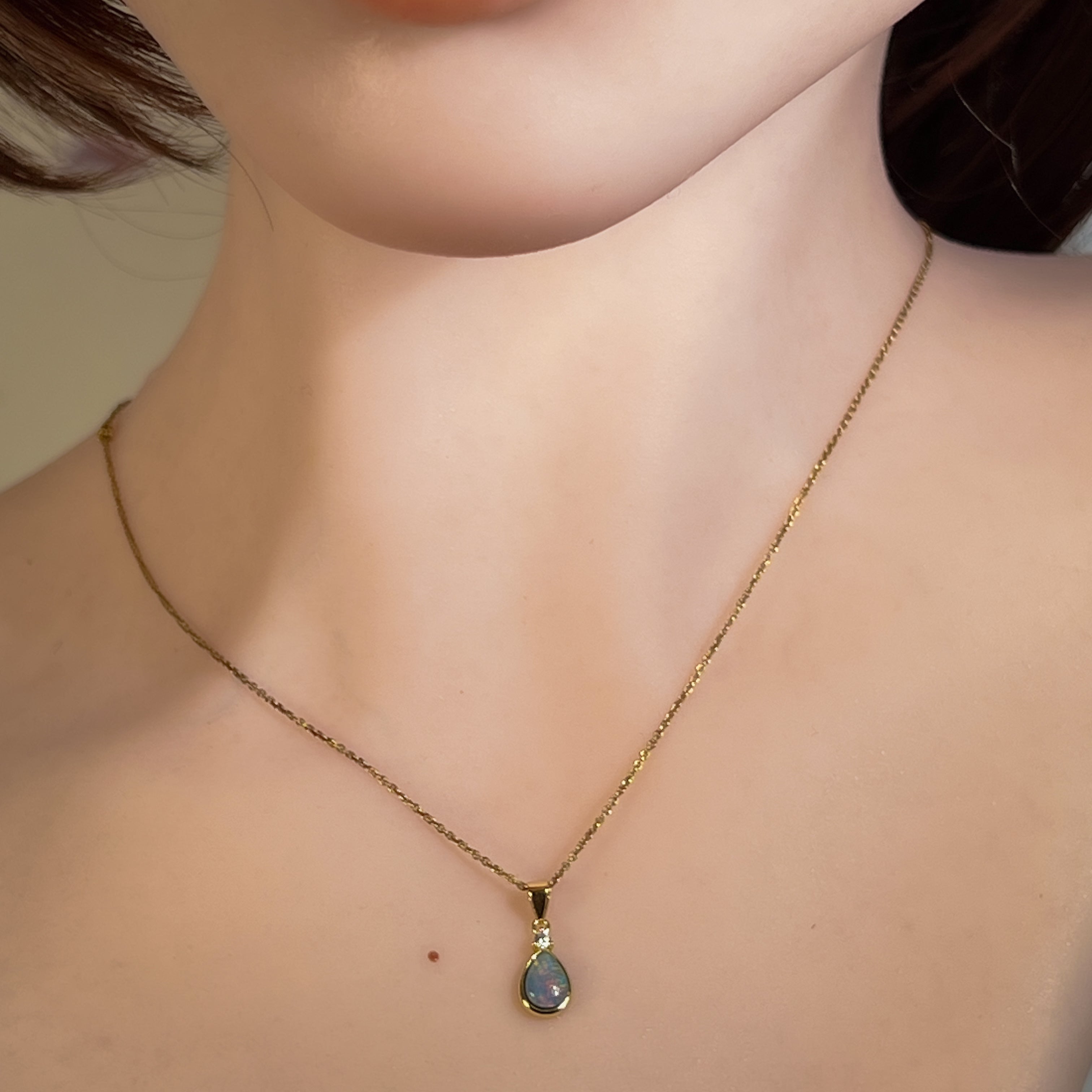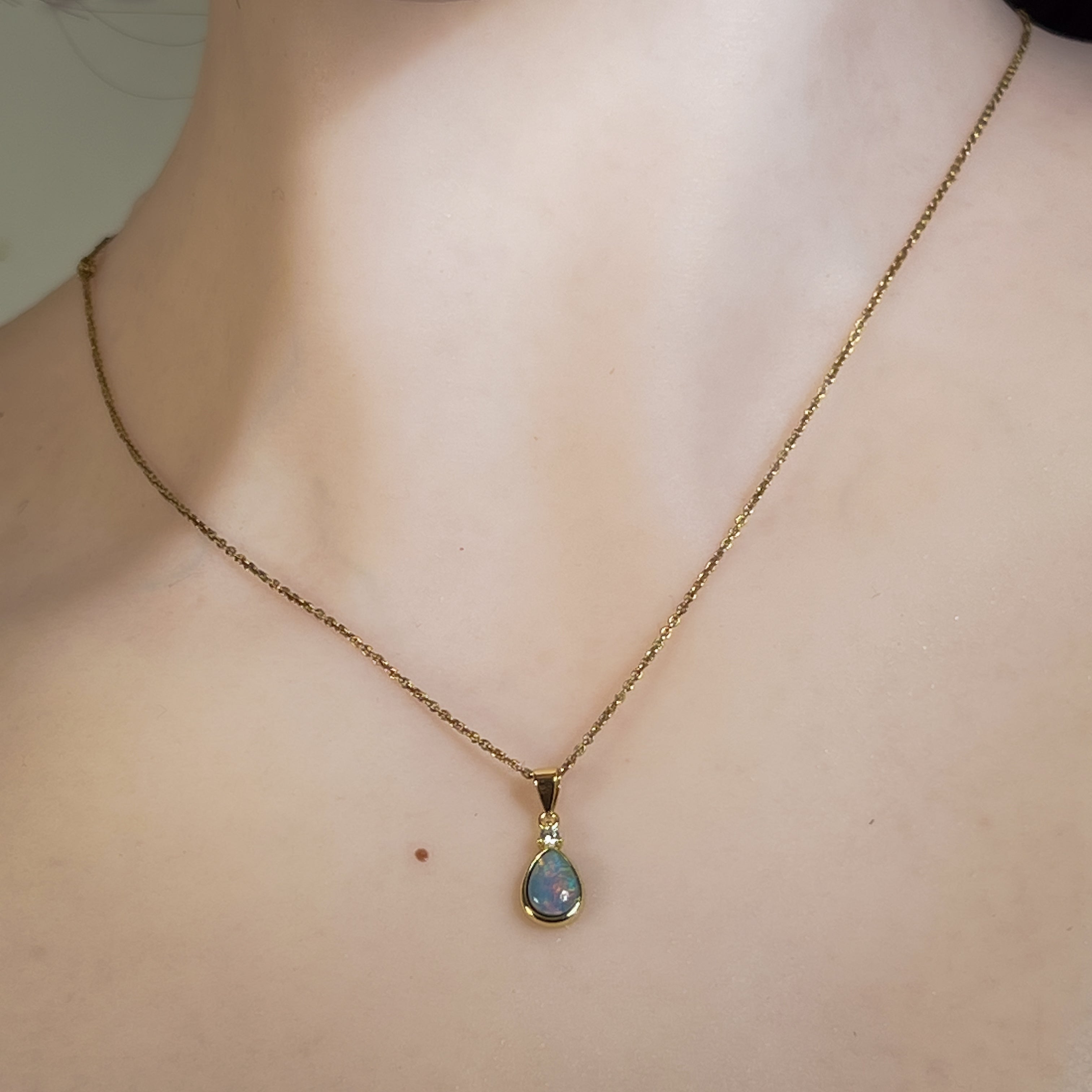 Elegantly showcase your style with our Yellow Gold plated silver pearshape bezel set opal triplet pendant. The dainty classic design adds a touch of sophistication to any outfit. Enhance your look with the beauty and charm of this pendant.