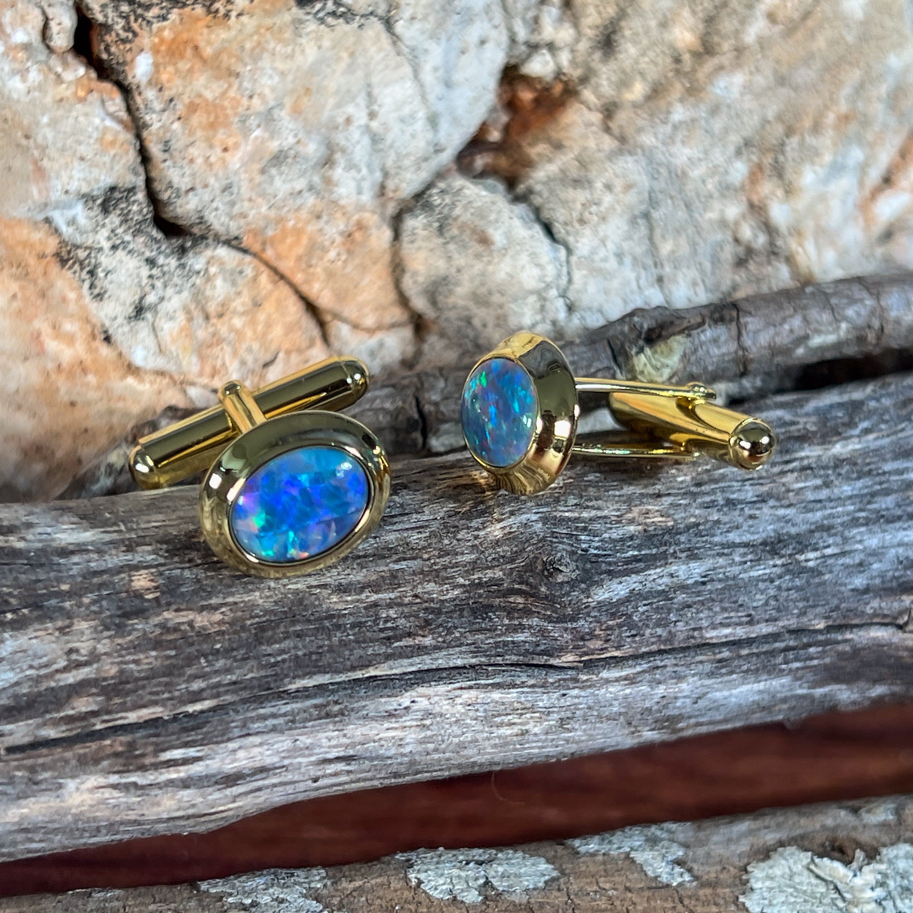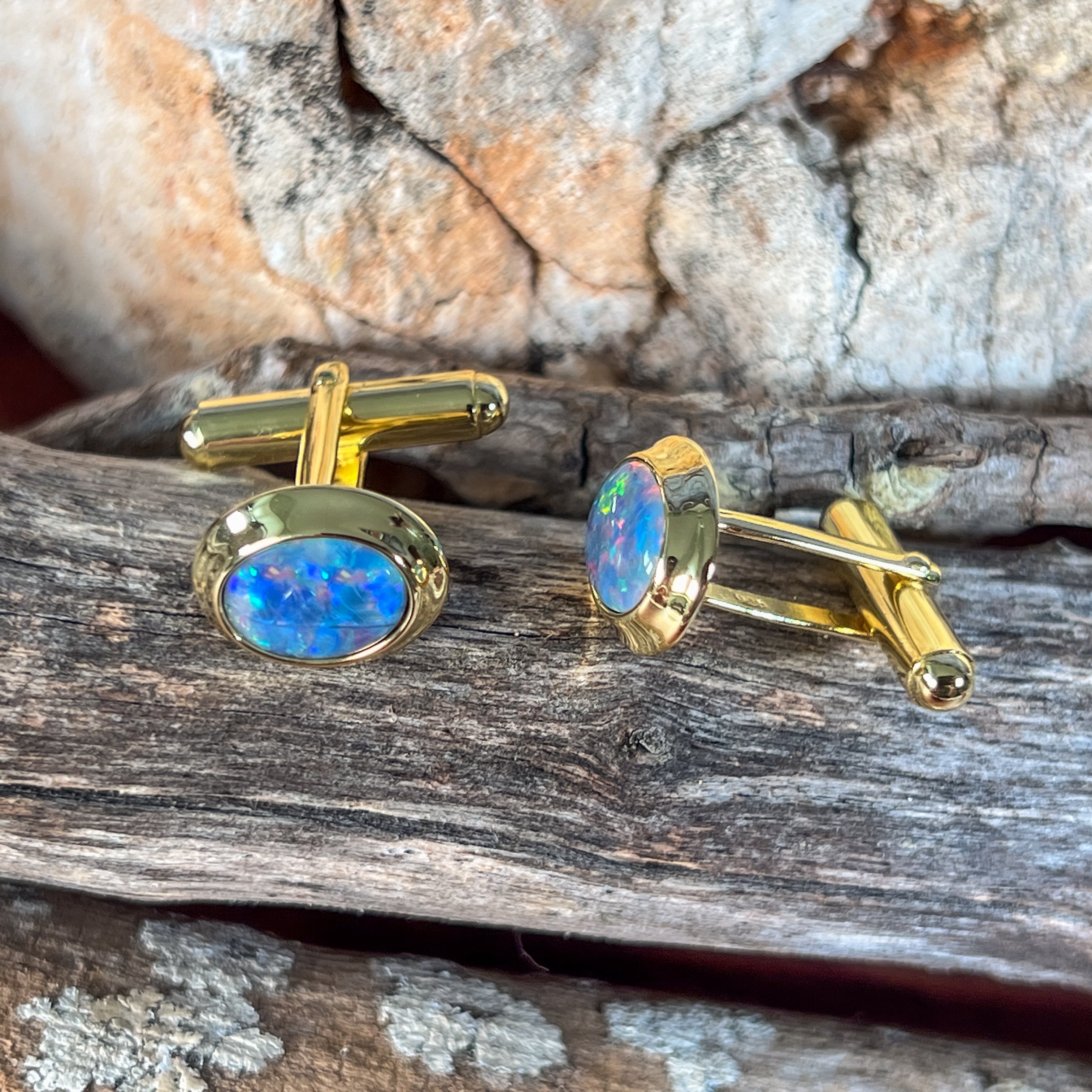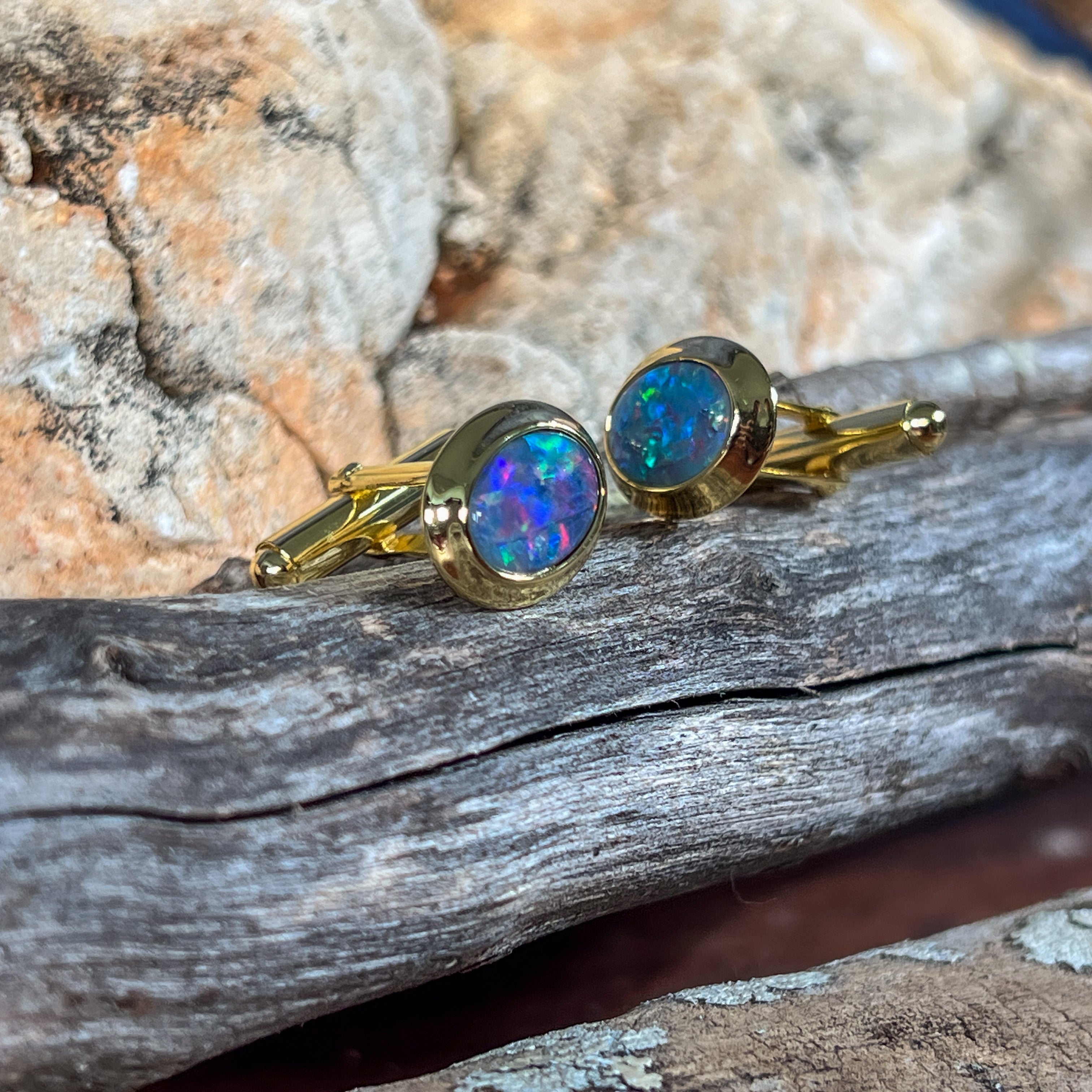 Elevate your style with our classic gold plated sterling silver cufflinks. The double tube design adds dimension to any outfit, and the 10x8mm opal triplets bring a touch of elegance. Make a statement with these luxurious cufflinks and stand out from the crowd.