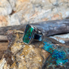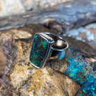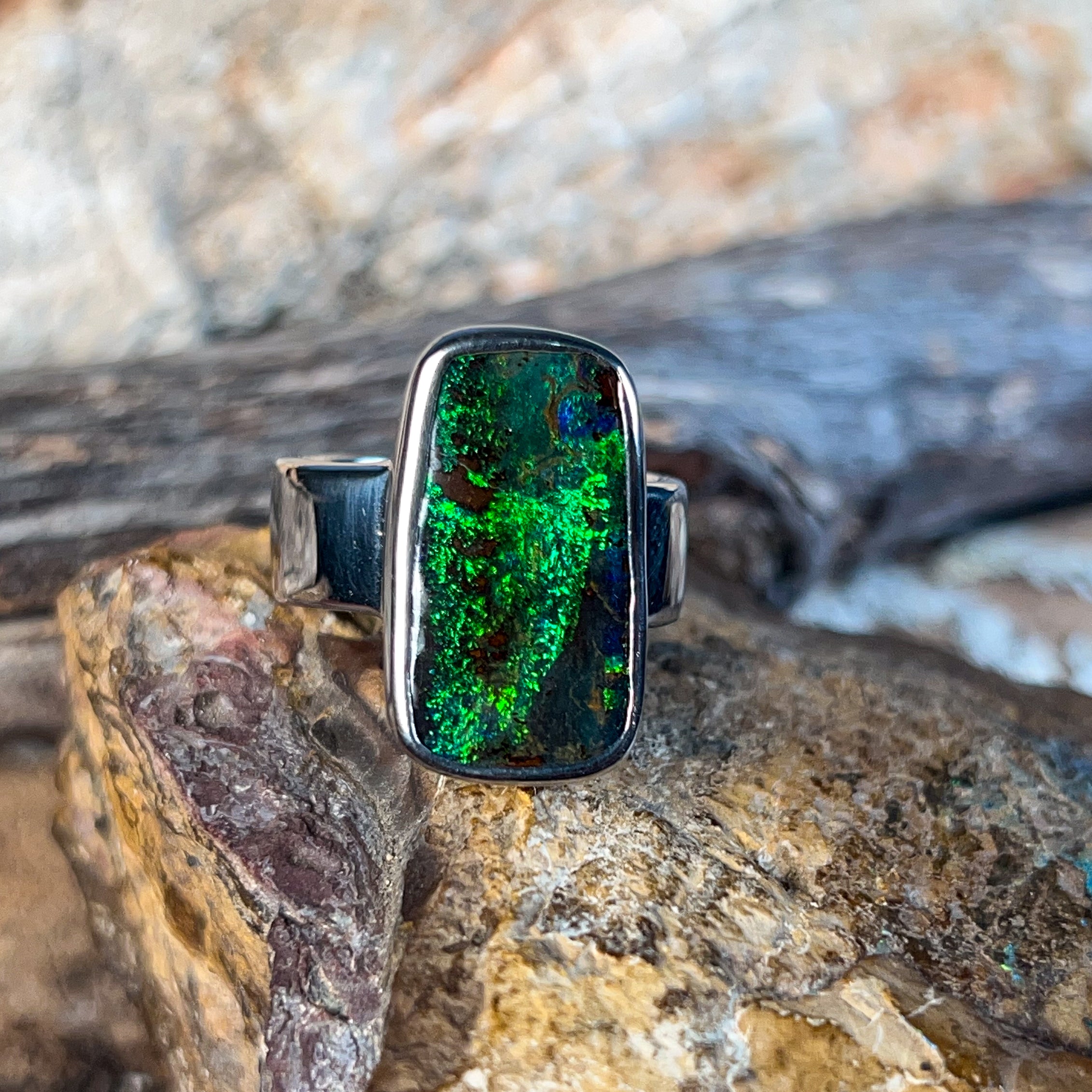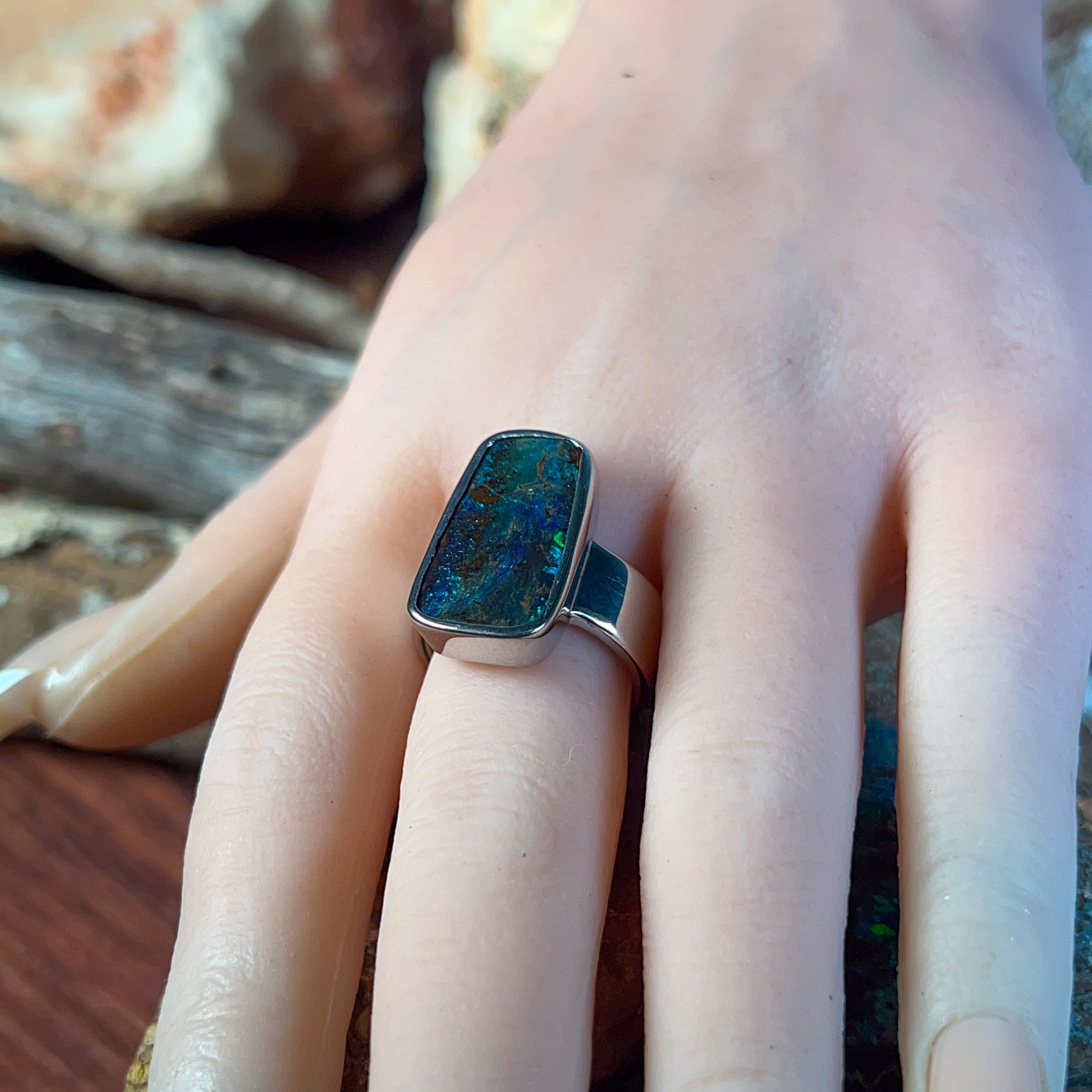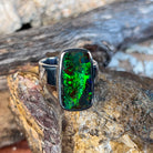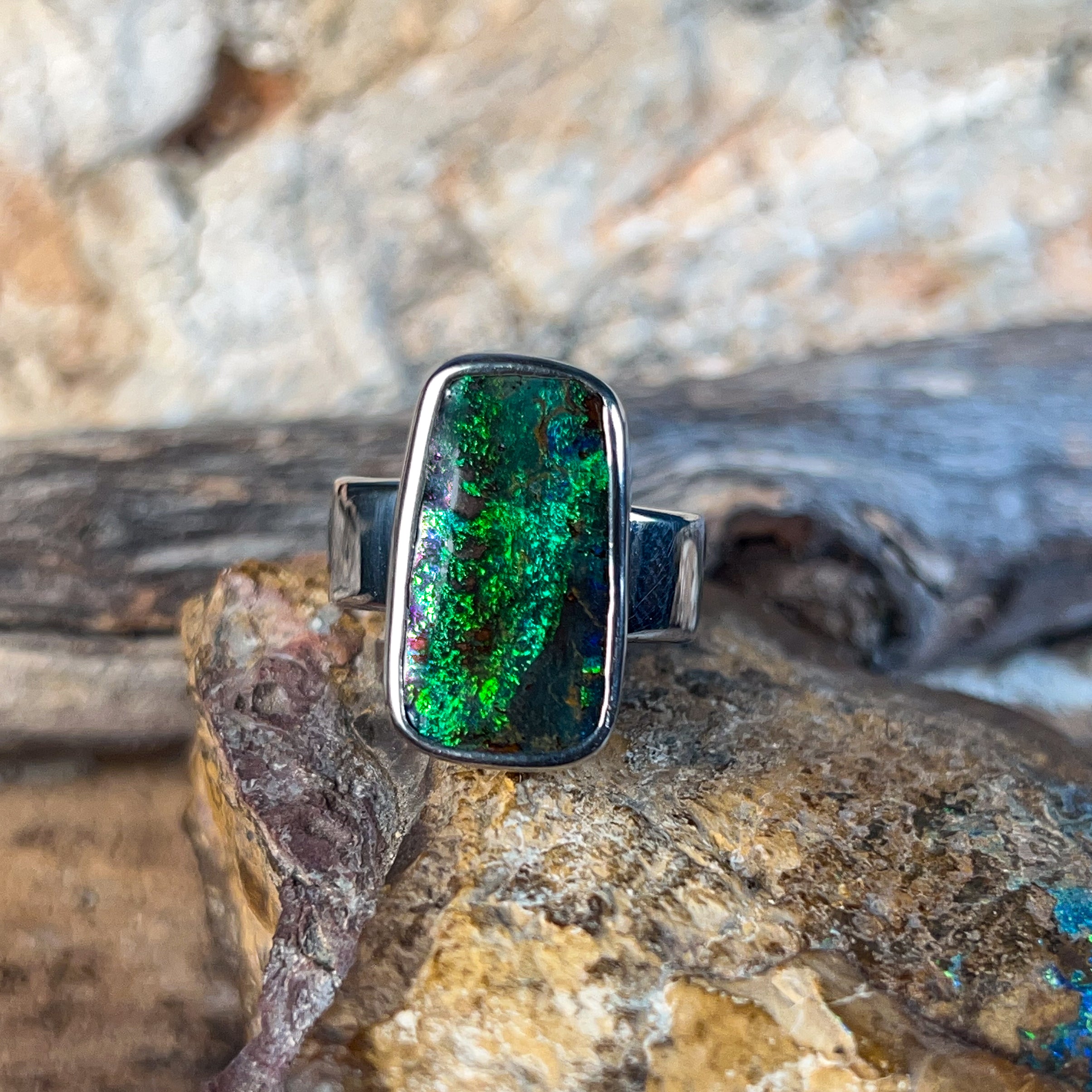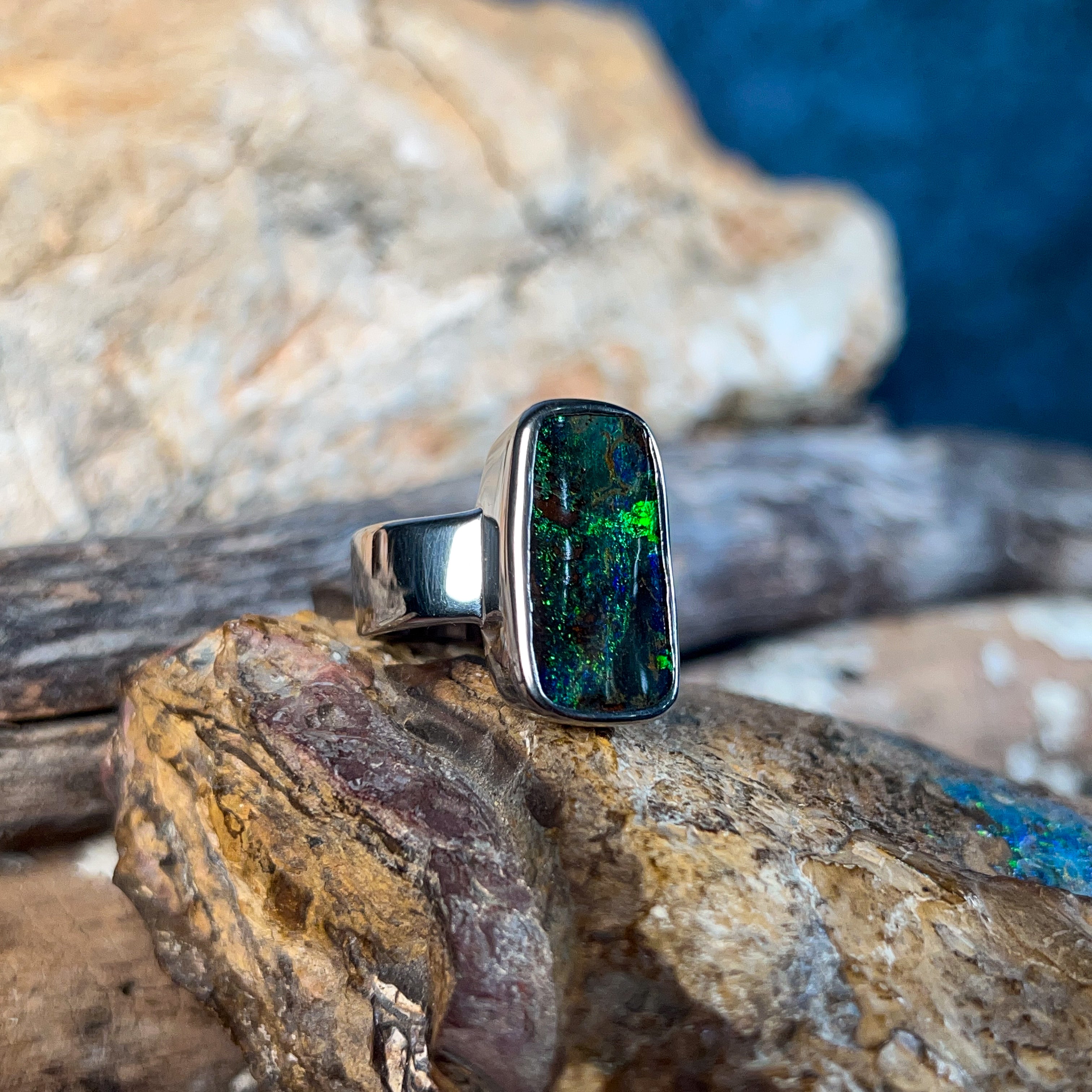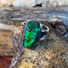 Sterling Silver Bezel set Boulder Opal green flashes ring