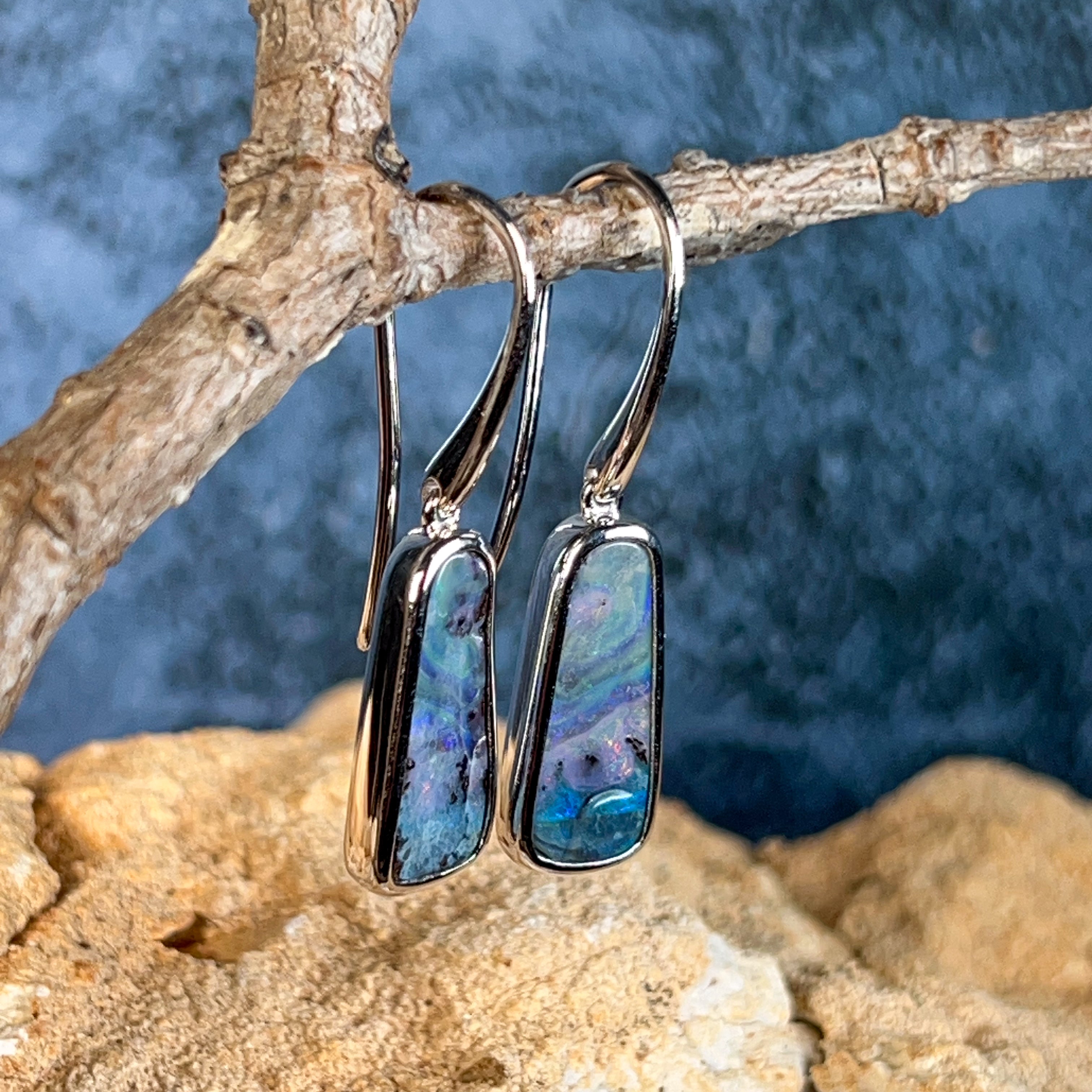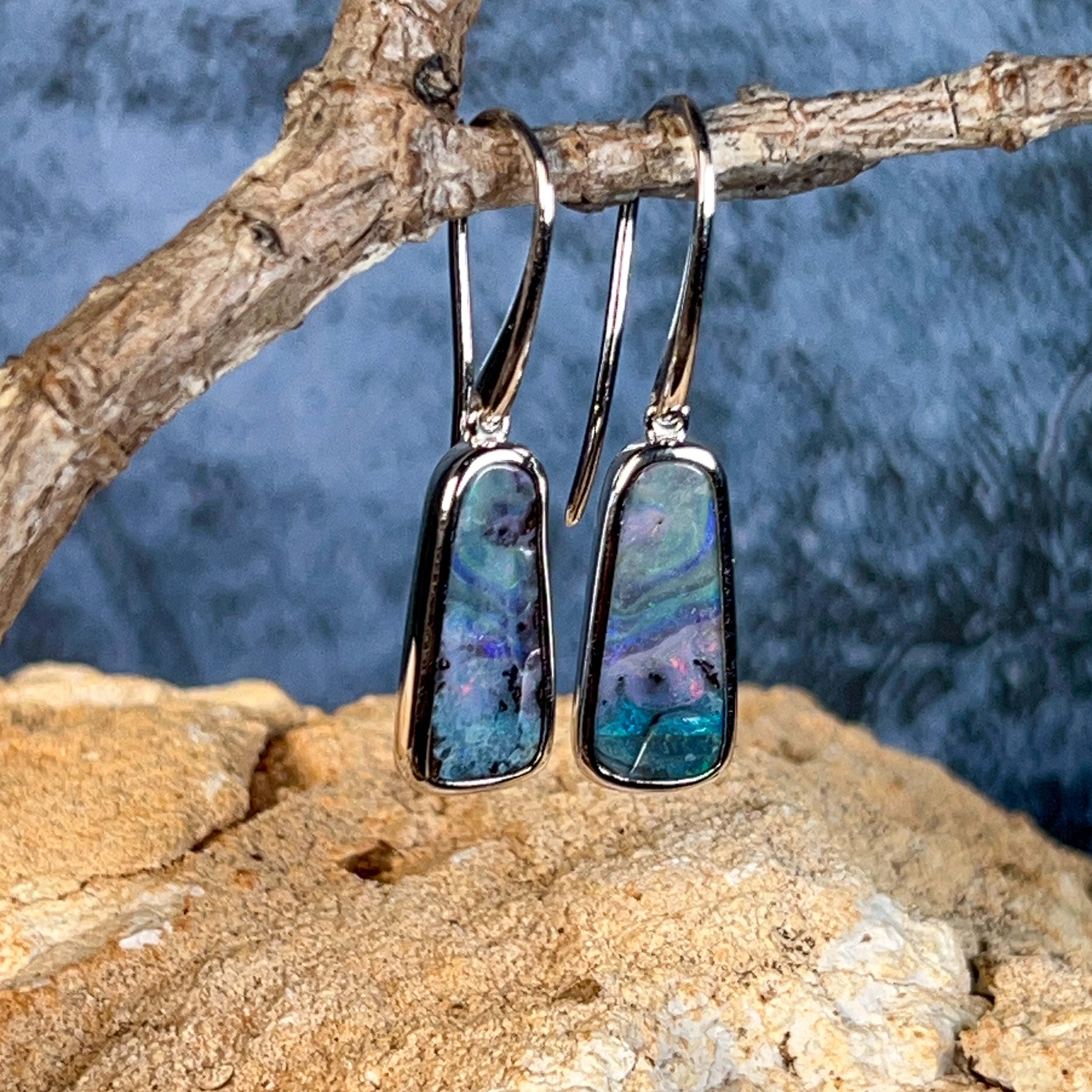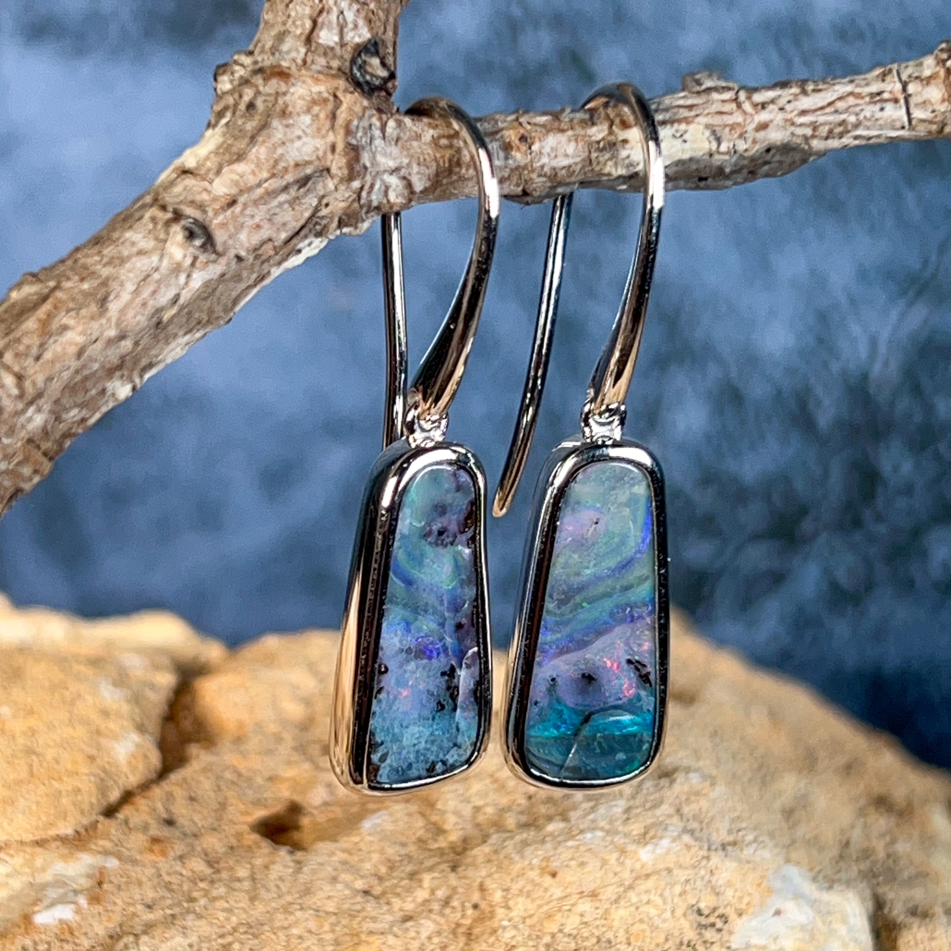 Catch everyone's eye with these playful sterling silver drop earrings featuring stunning boulder opals that dance with every move. The natural colour play in each stone makes them genuinely one-of-a-kind, while the smooth hook style keeps them comfortable for all-day wear. Perfect for adding a touch of Australian gemstone magic to your everyday look or special occasions.