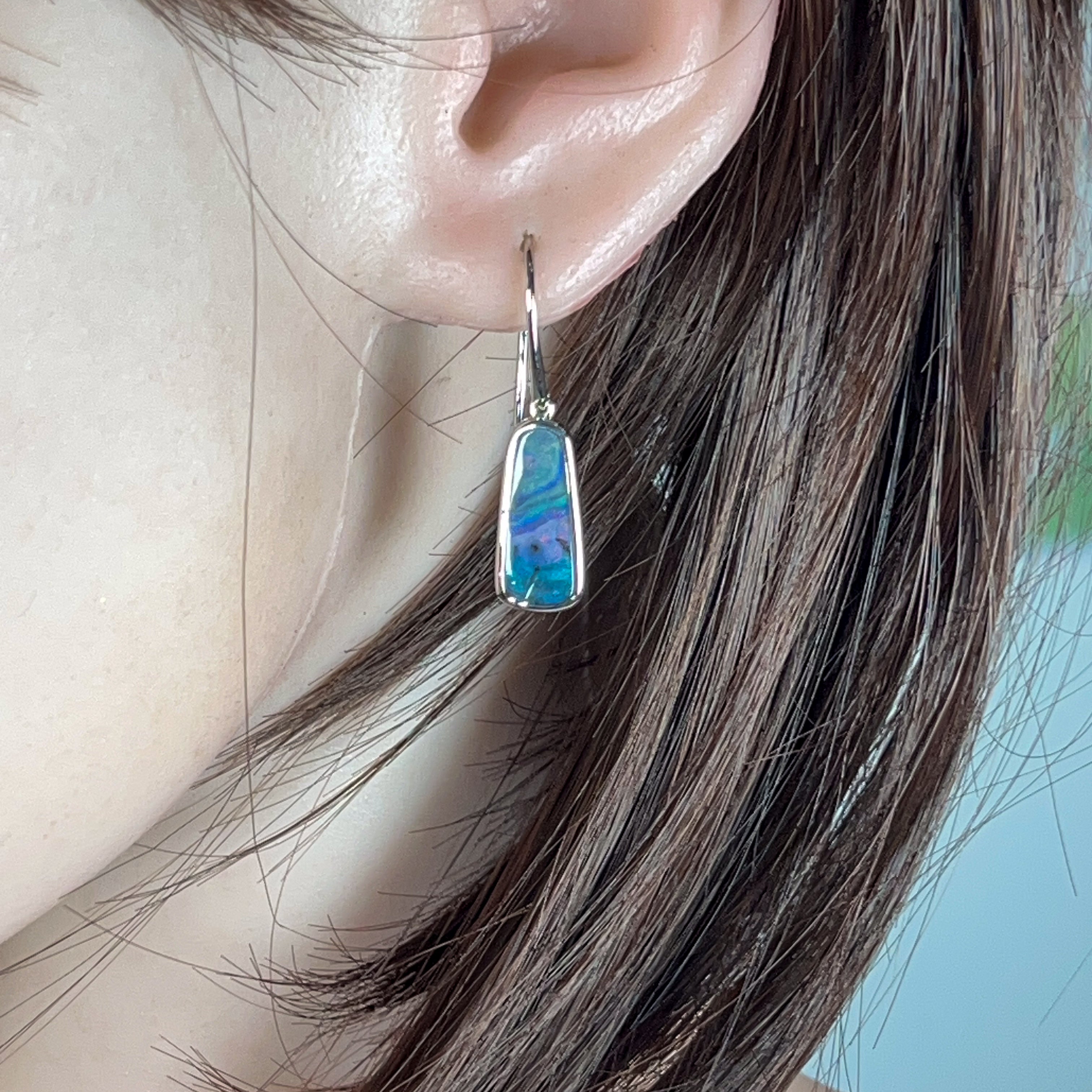 One Sterling Silver drop Boulder Opal earrings bezel set on Hooks