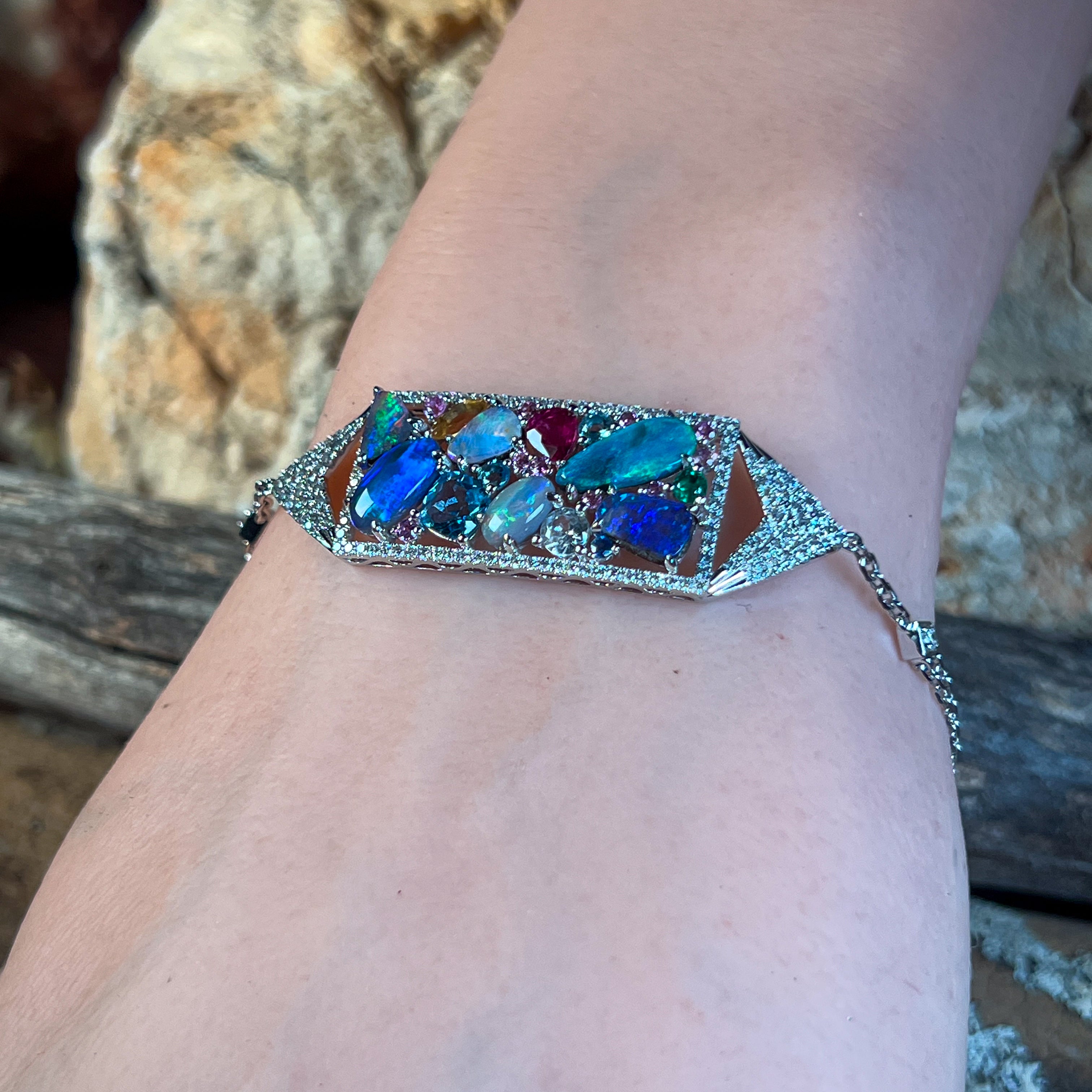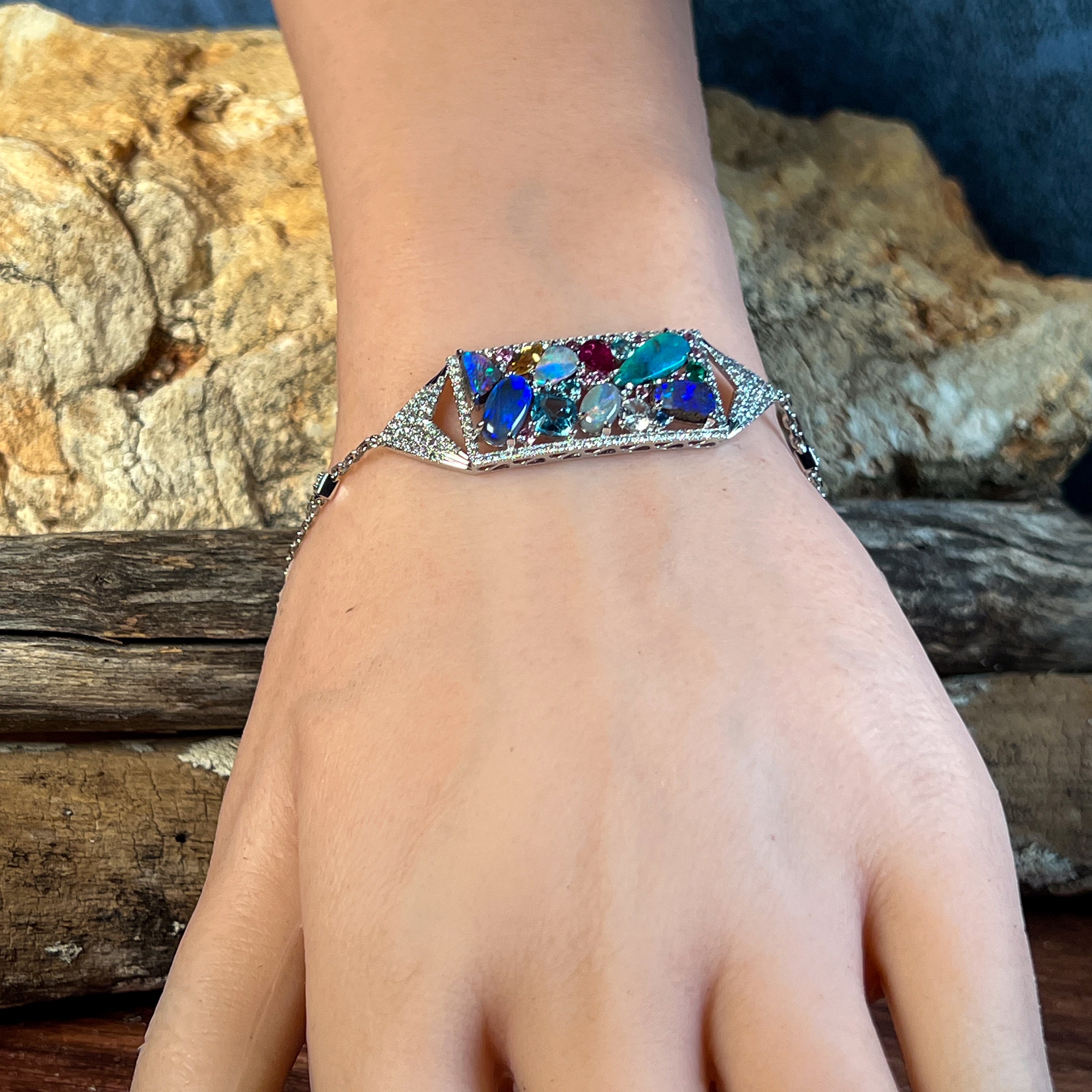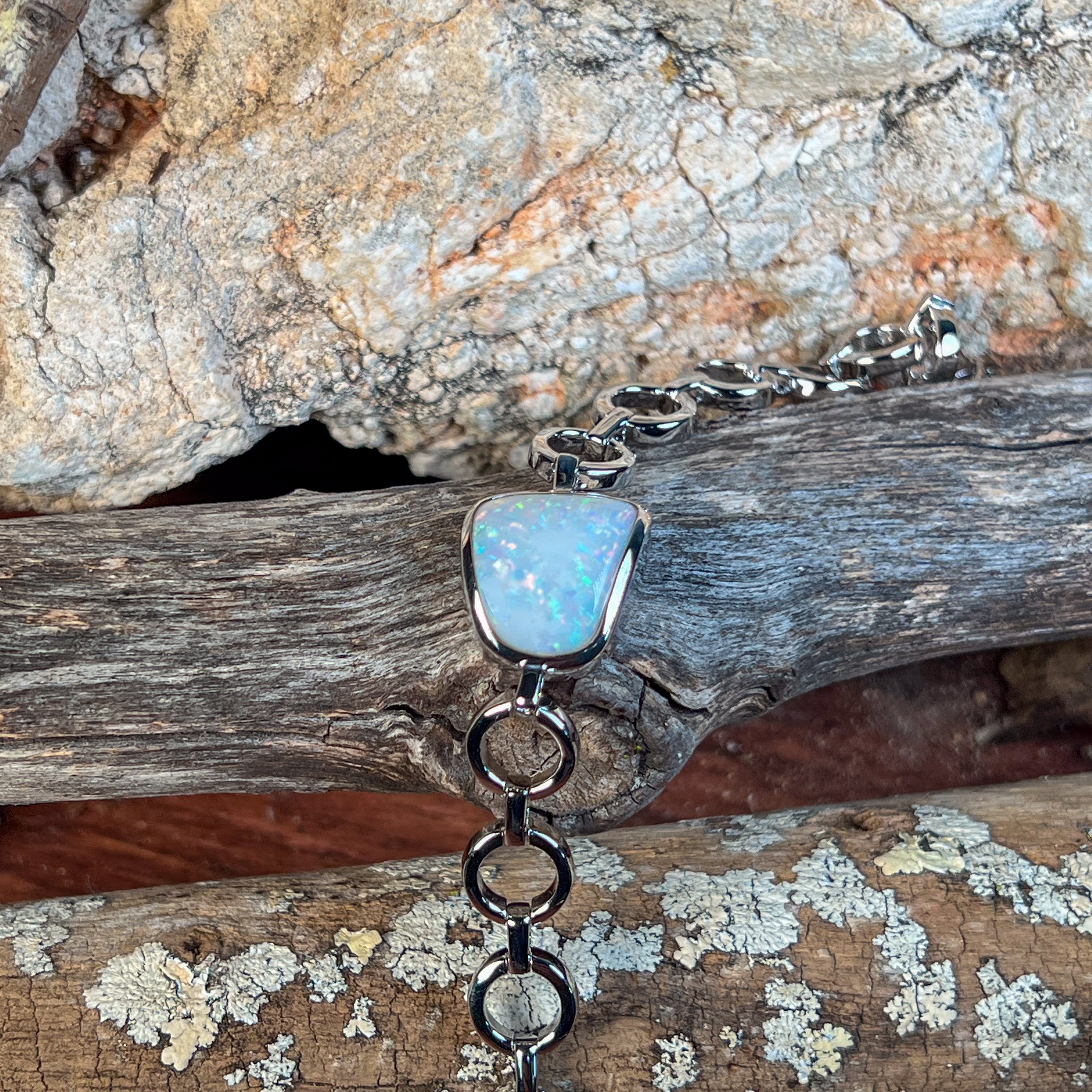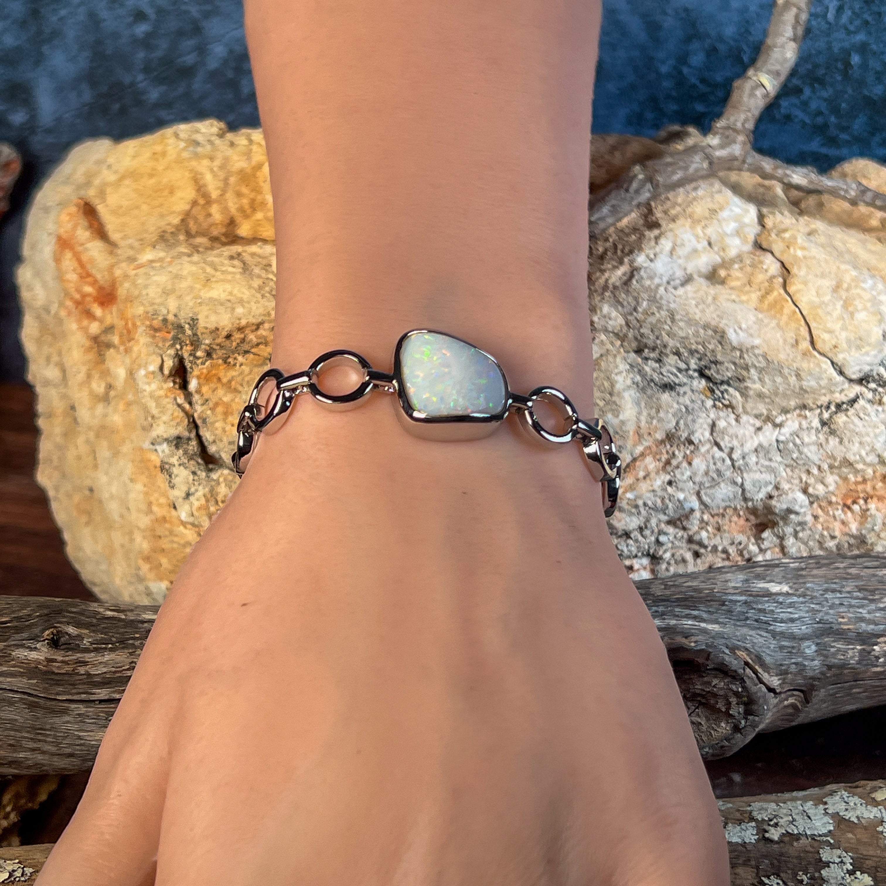 14kt White Gold rectangular Crystal Opals half bezel set bracelet 21cm