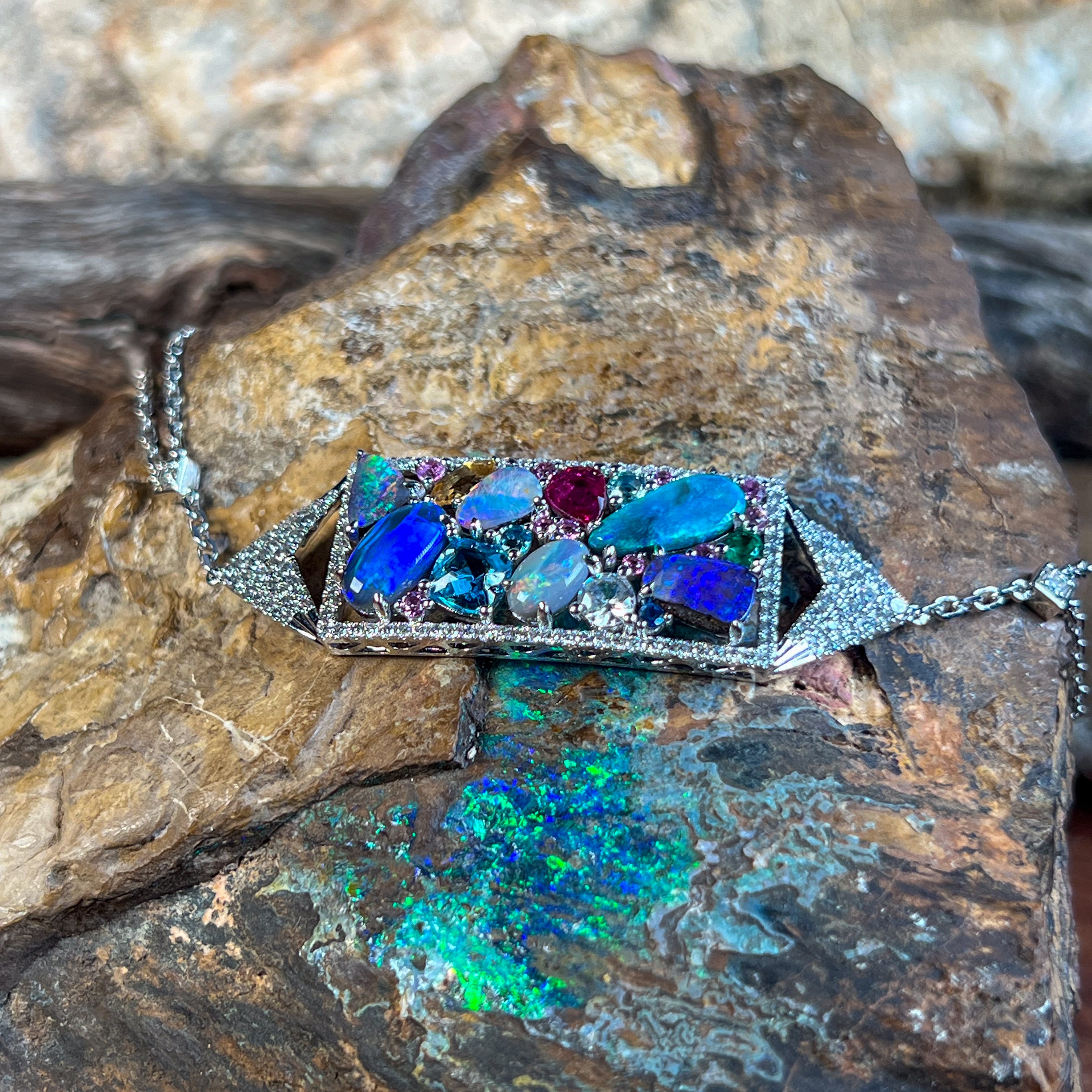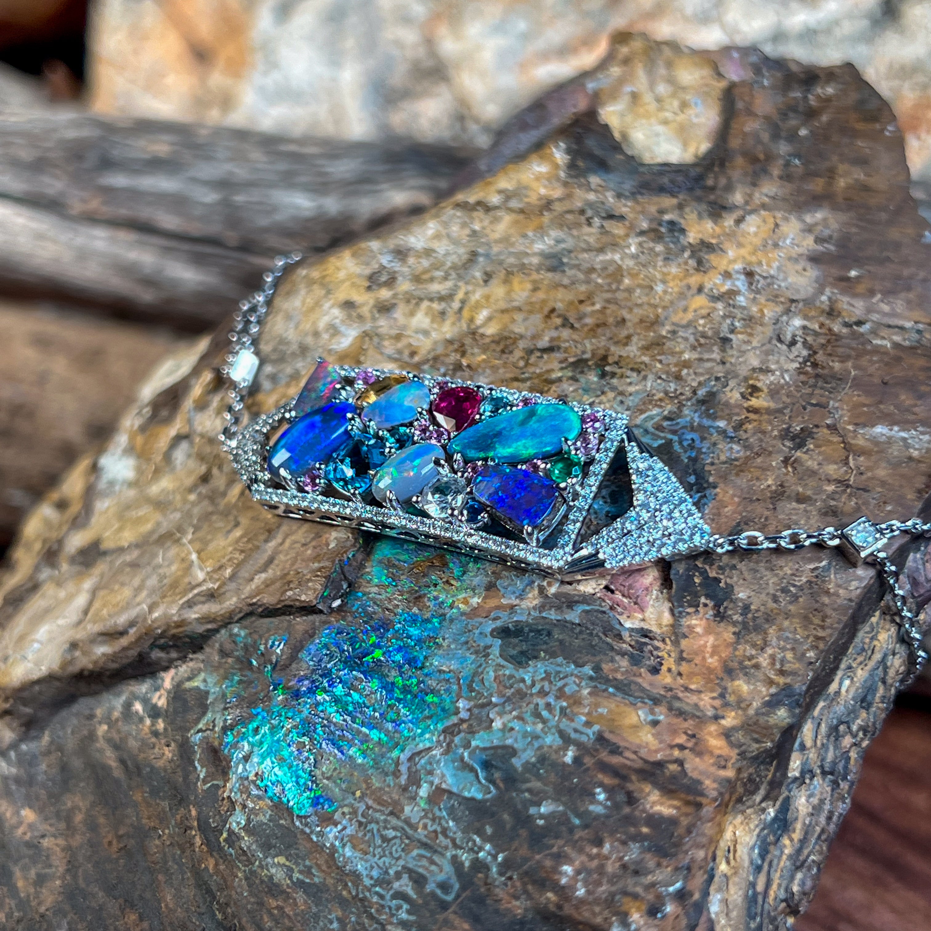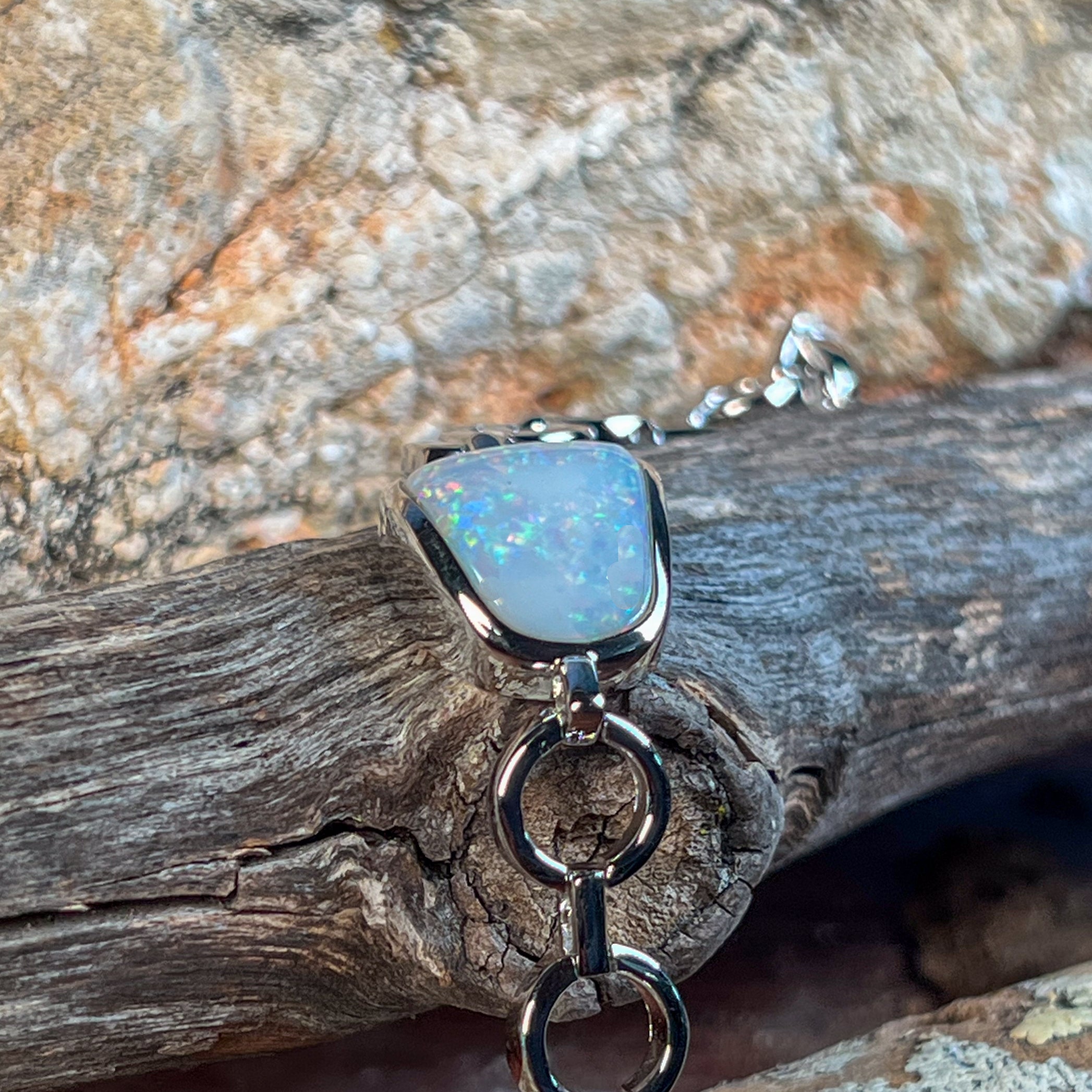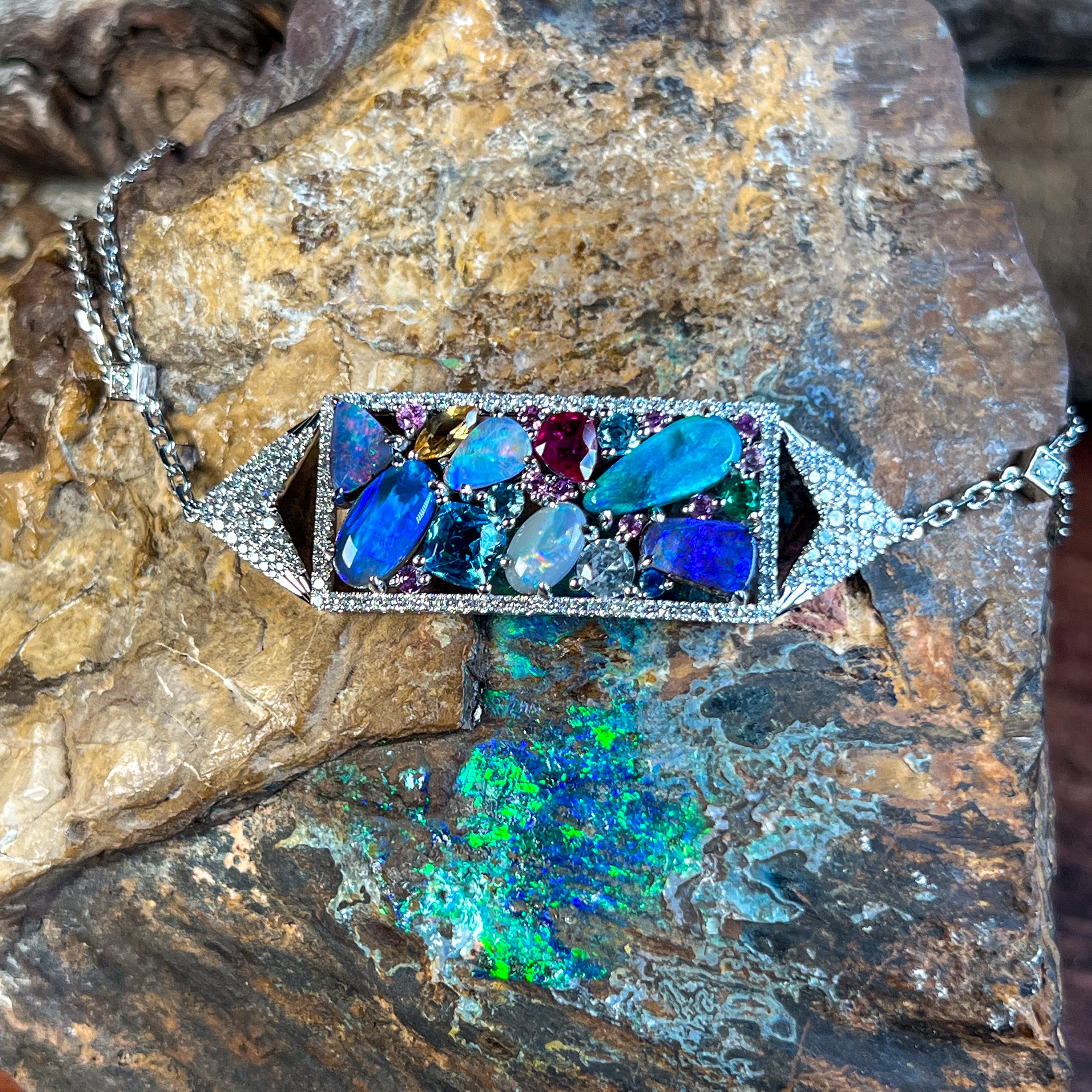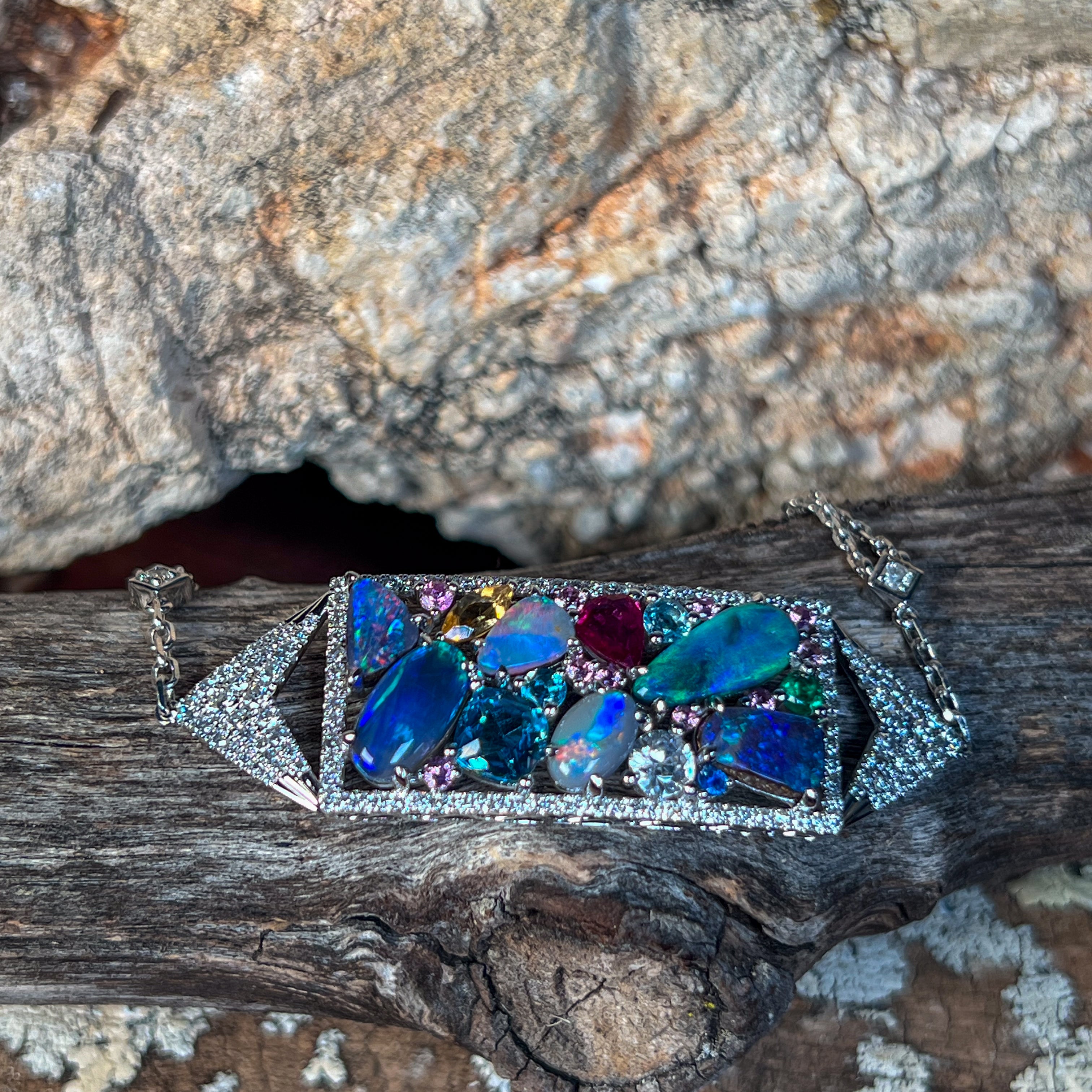 14kt White Gold rectangular Crystal Opals half bezel set bracelet 21cm