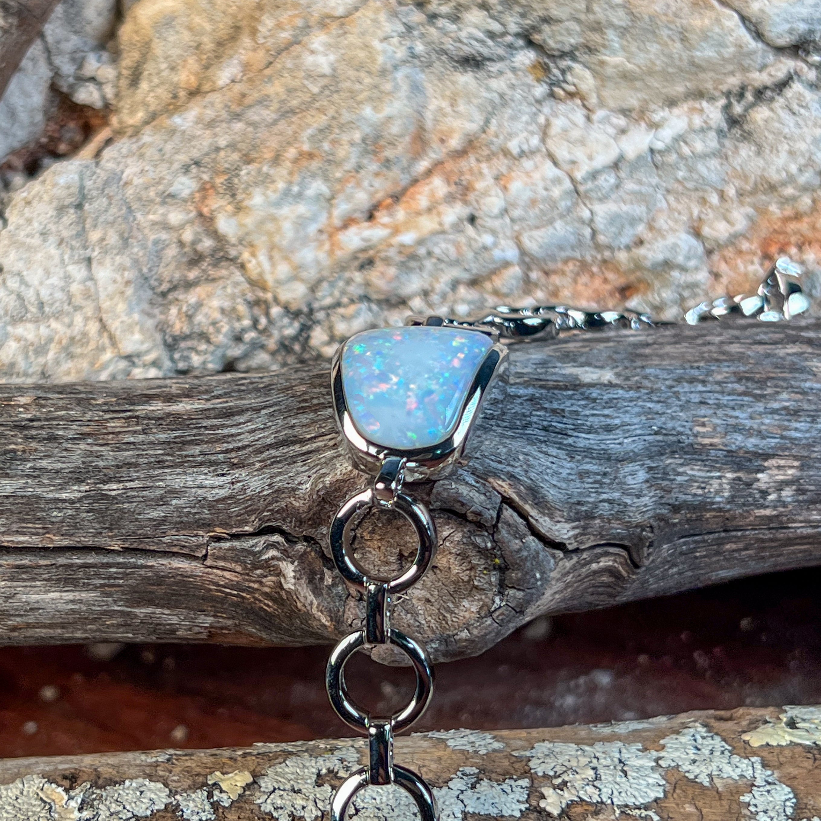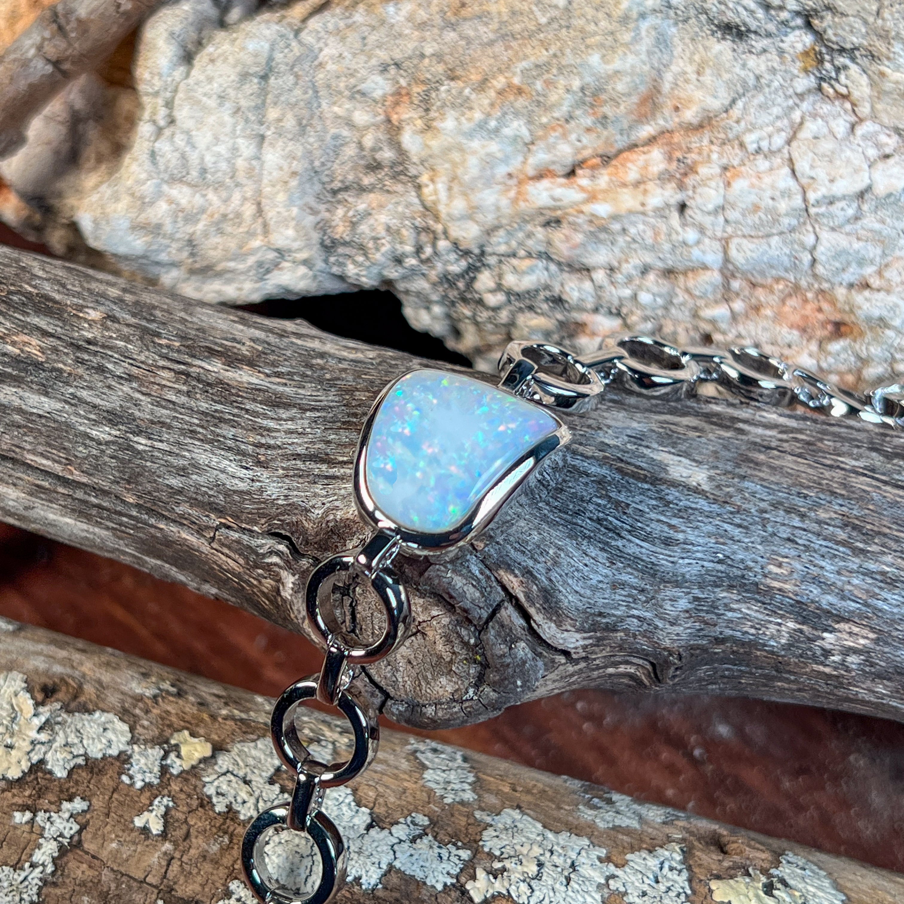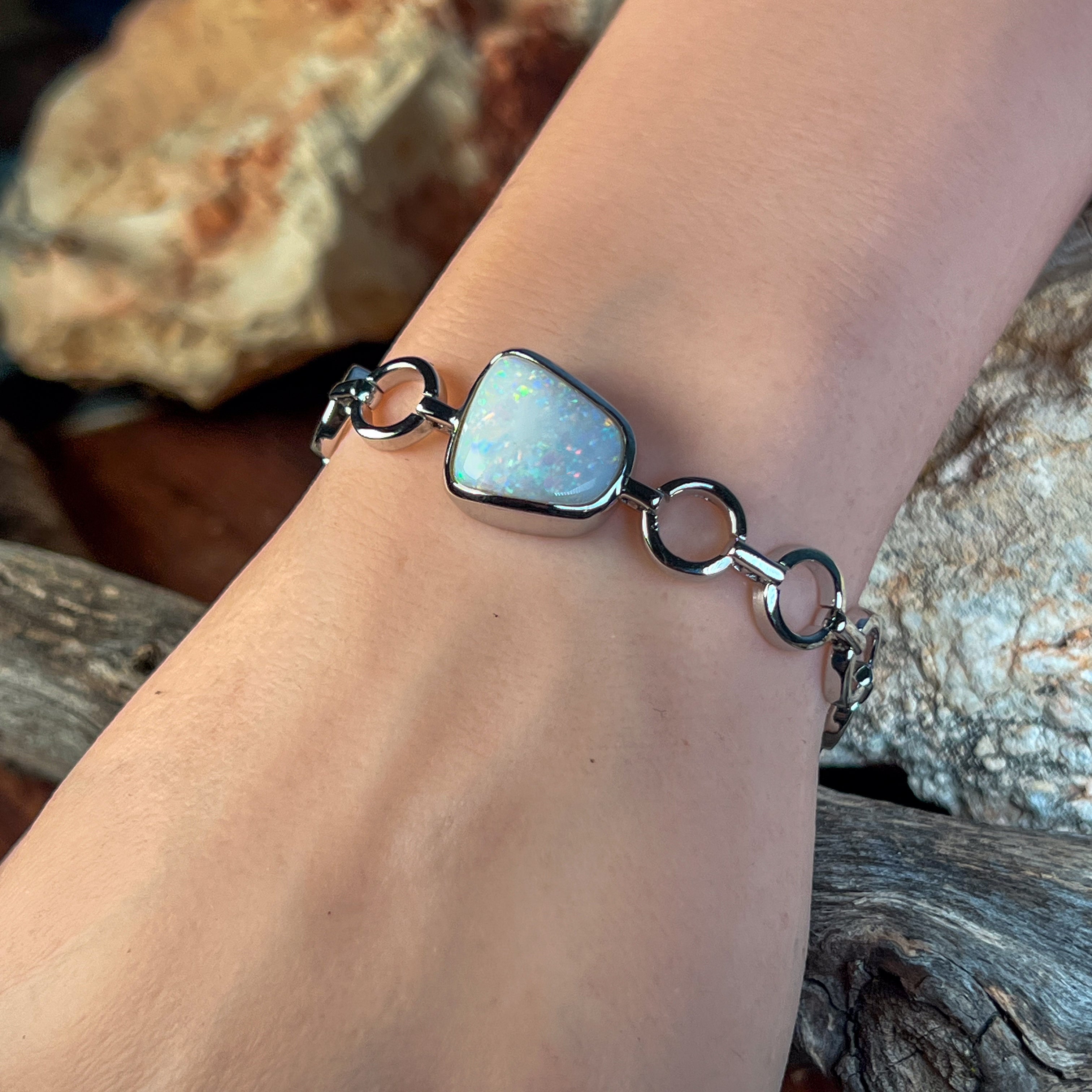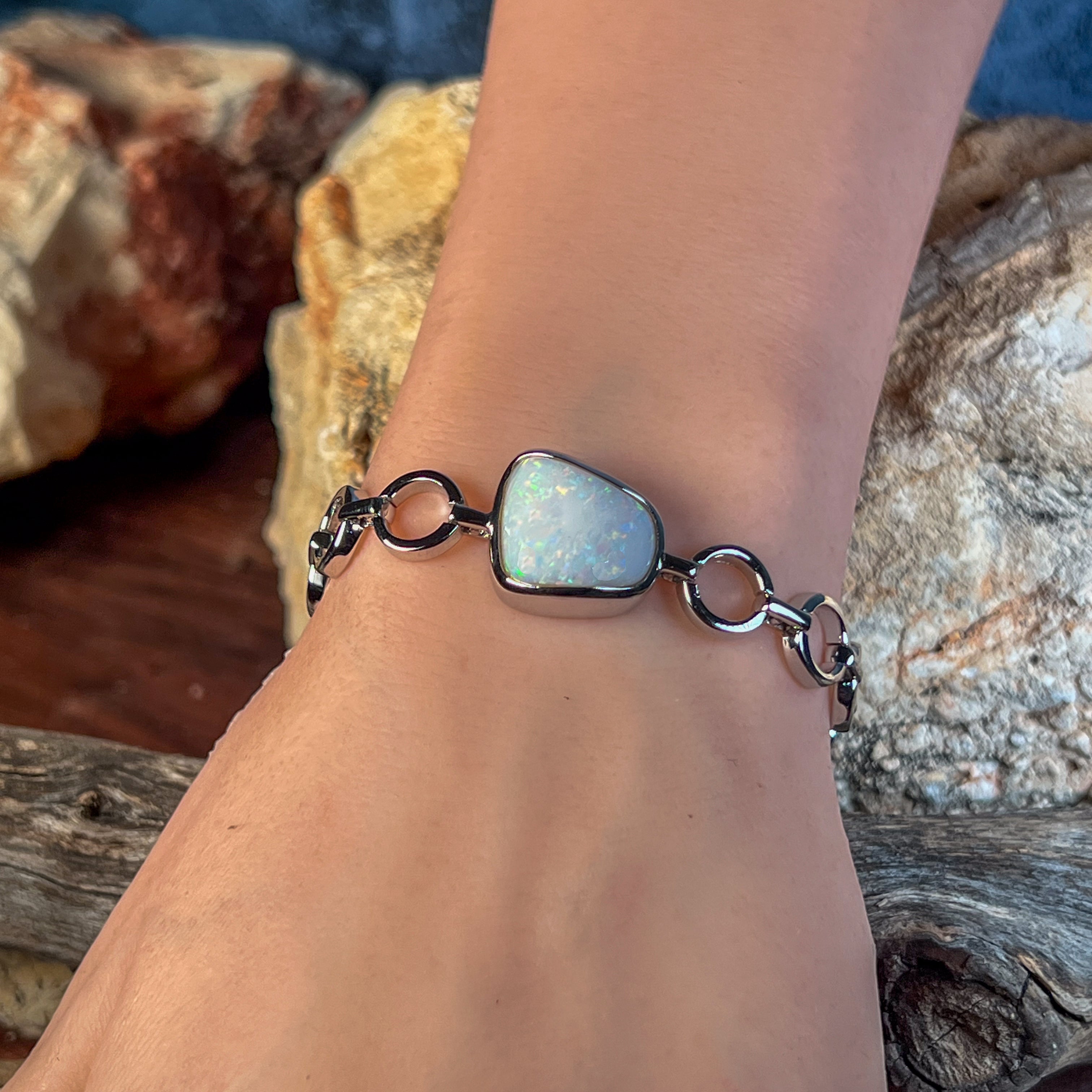 Embrace the natural beauty of white opal with this stunning sterling silver freeform solitaire bracelet. Each piece showcases a captivating white opal stone set in elegant sterling silver, celebrating the gem's unique play of colour and light. The freeform design adds an artistic, organic touch that sets it apart from conventional jewellery. Perfect for those who appreciate one-of-a-kind pieces that make a statement. Whether worn daily or reserved for special occasions, this bracelet combines timeless sophistication with the mesmerising allure of genuine opal. A true masterpiece for opal lovers.