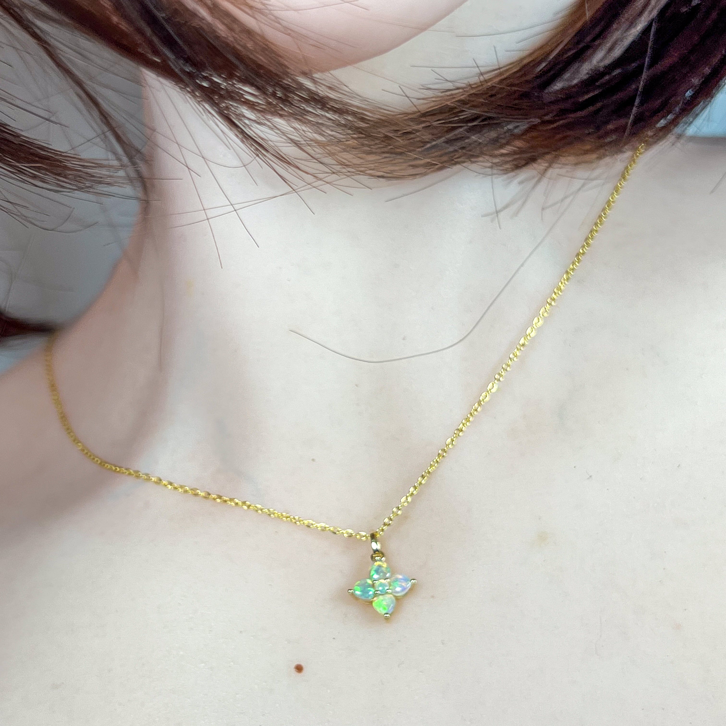 An opal gold necklace with a short pendant, such as the 18KT Yellow Gold Crystal Opal and Diamond Pendant, is excellent for people with short necklines.