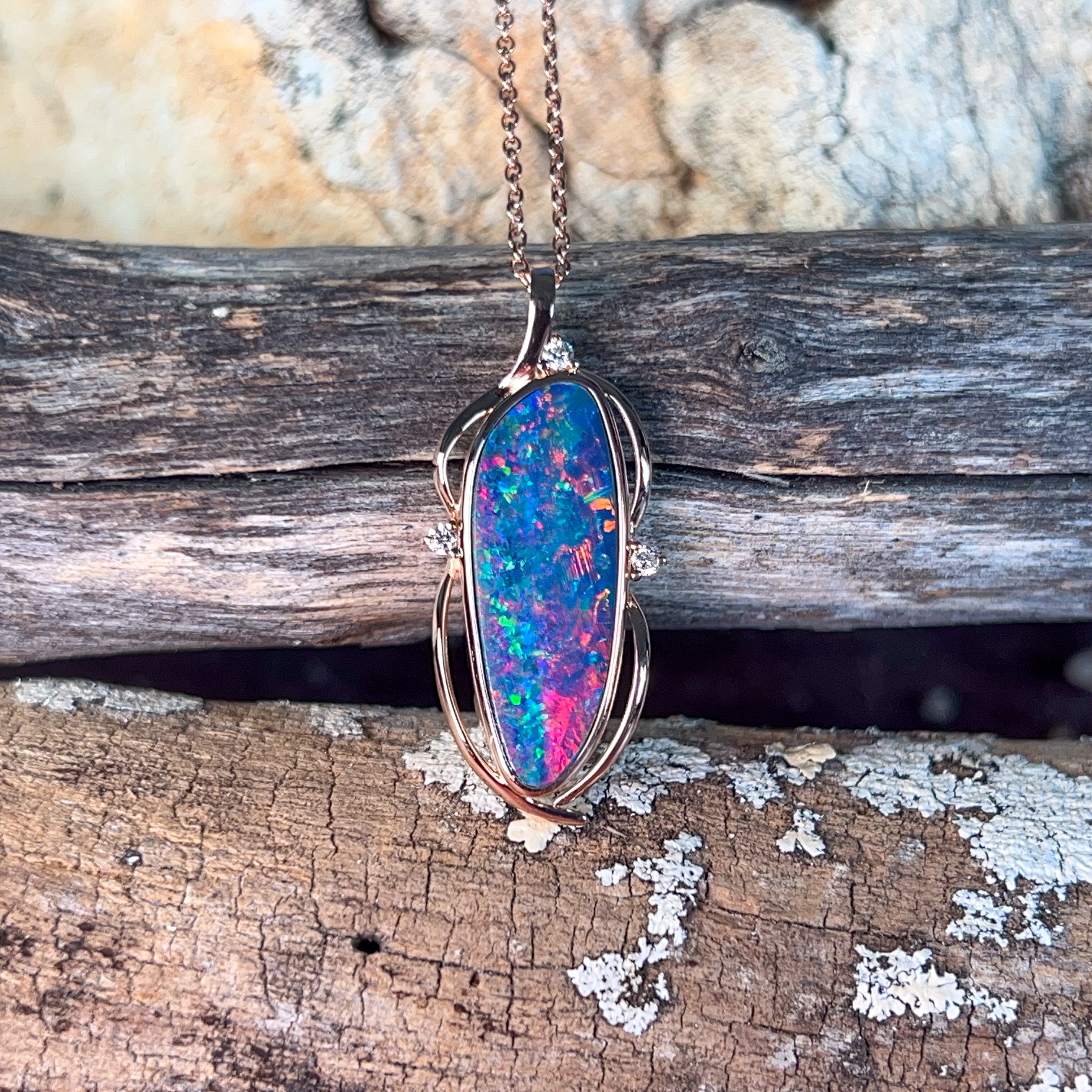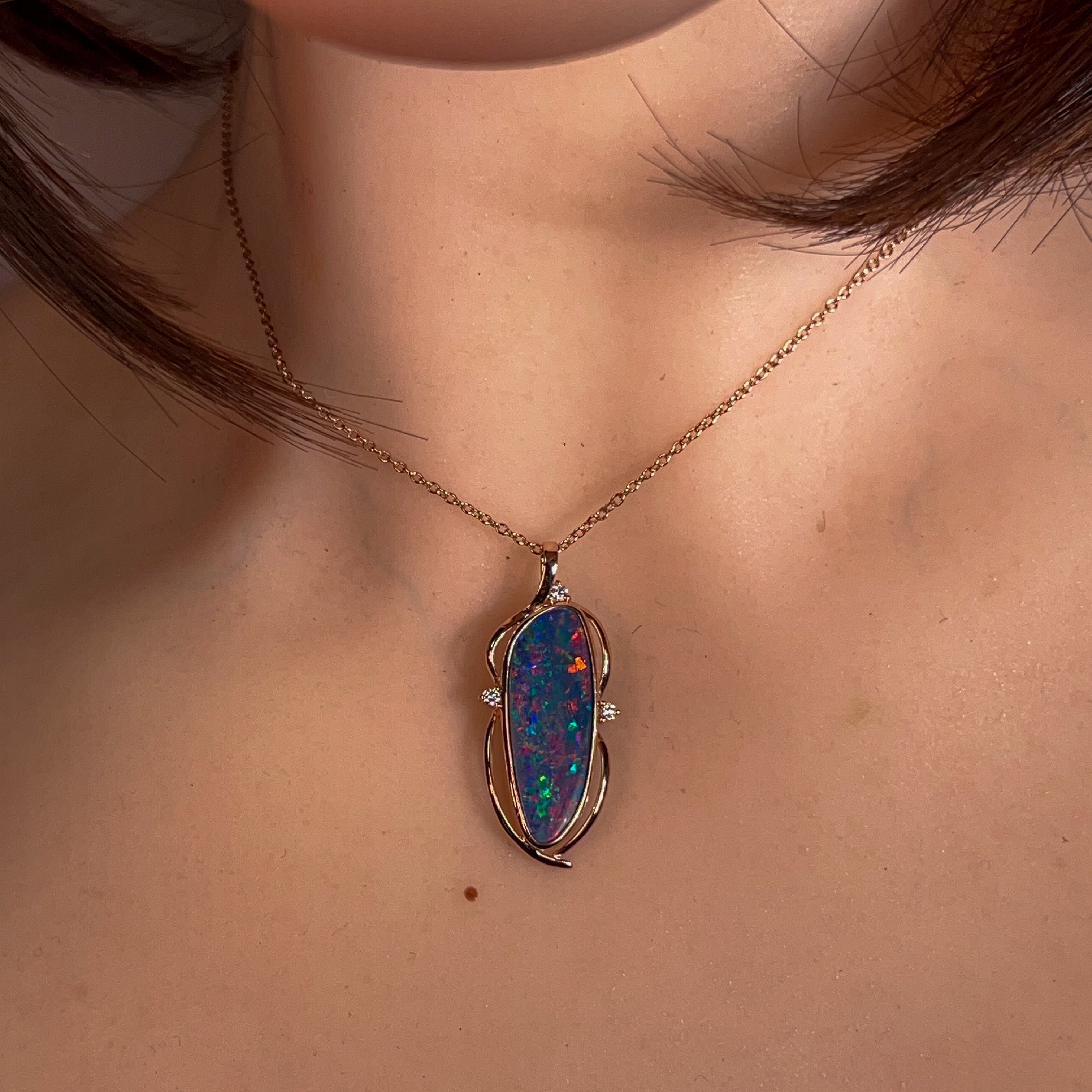 Discover the captivating allure of this exquisite 14kt rose gold pendant, featuring a stunning 4.8ct opal doublet that radiates vibrant colours with every movement. The play of light across the opal's surface creates a mesmerising display of blues, greens, and fiery hues, while complementary diamonds add sophisticated sparkle and elegance. This piece seamlessly blends the organic beauty of precious opal with the timeless refinement of rose gold, making it an unforgettable statement for those who appreciate nature's most colourful gemstones. Perfect for elevating any occasion with genuine luxury and distinctive style.