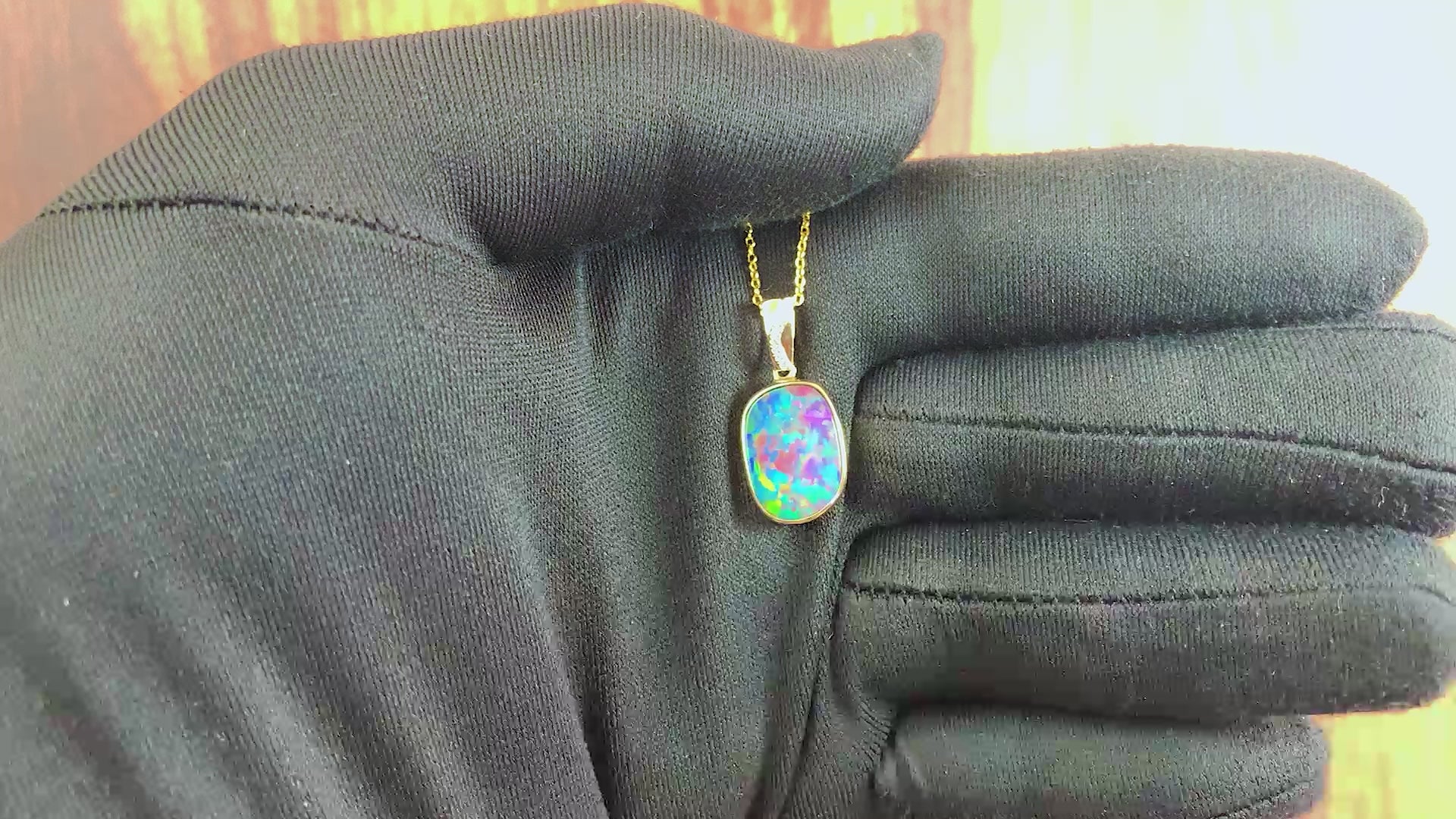 One 14kt Yellow Gold Opal bezel set pendantOne Firey South Australian Light Opal doublet rectangular multi colour with Red