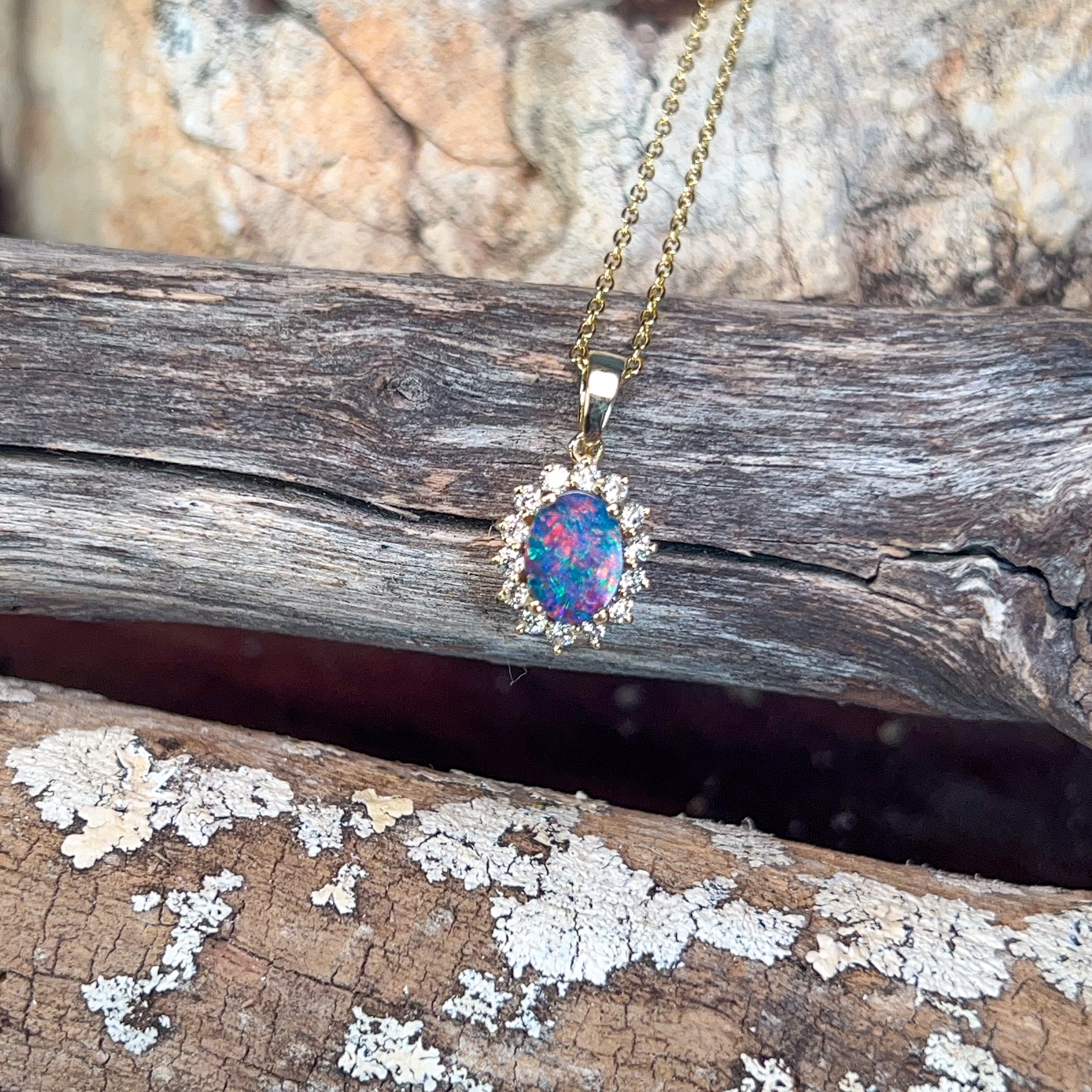 Capture the magic of Australian opals in this charming 18kt yellow gold pendant. Featuring a stunning 8x6mm opal doublet paired with sparkling diamonds, this piece brings together timeless elegance and playful colour. The warm glow of yellow gold complements the opal's mesmerising rainbow fire, making it perfect for everyday wear or special occasions. A true masterpiece that celebrates the natural beauty of gemstones.