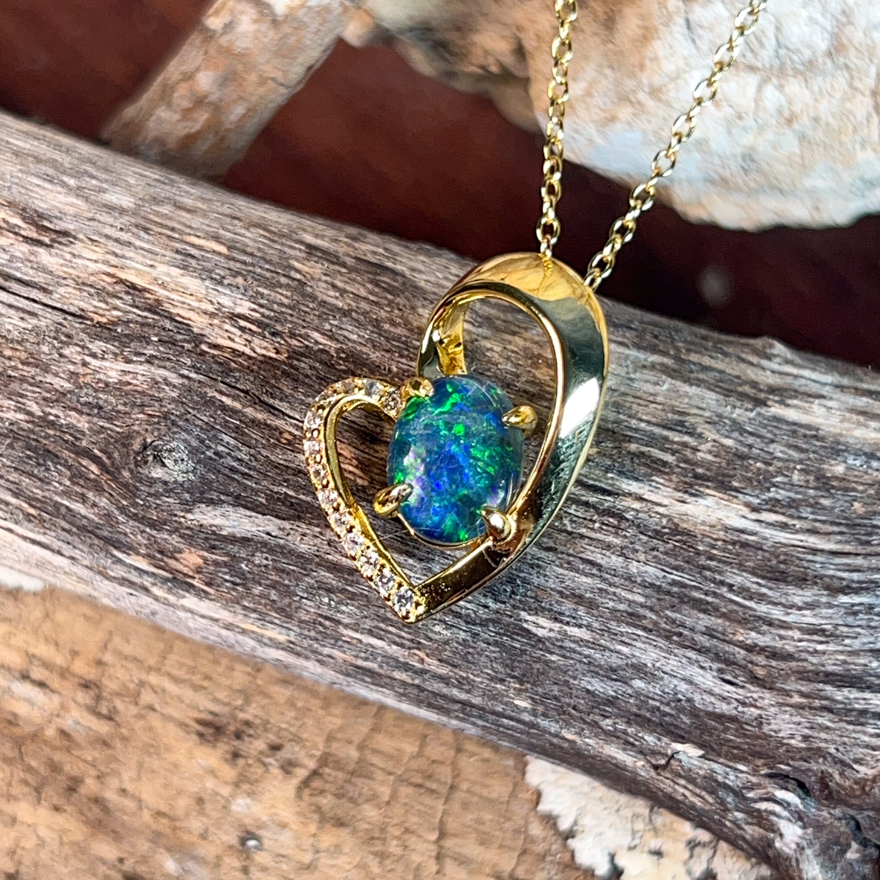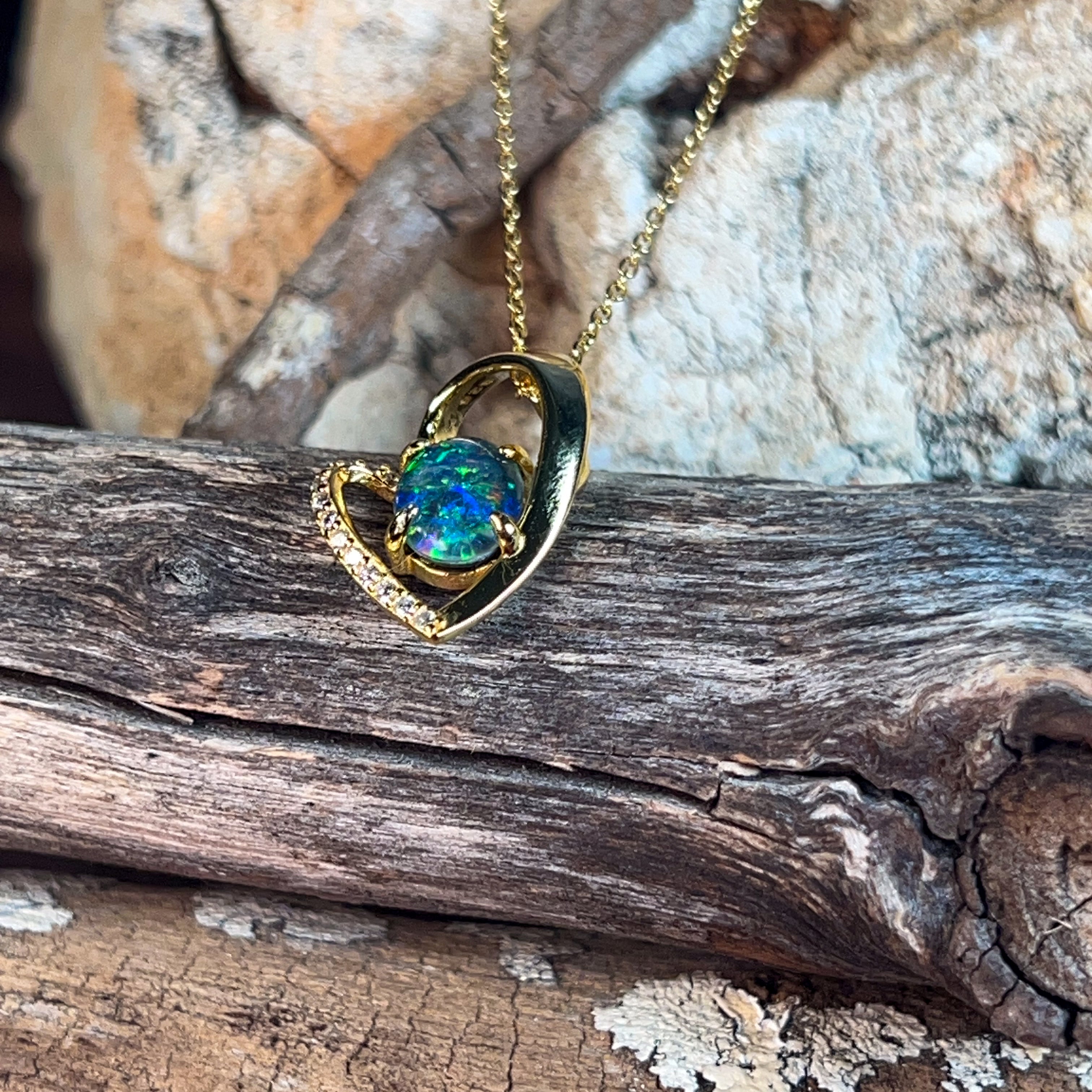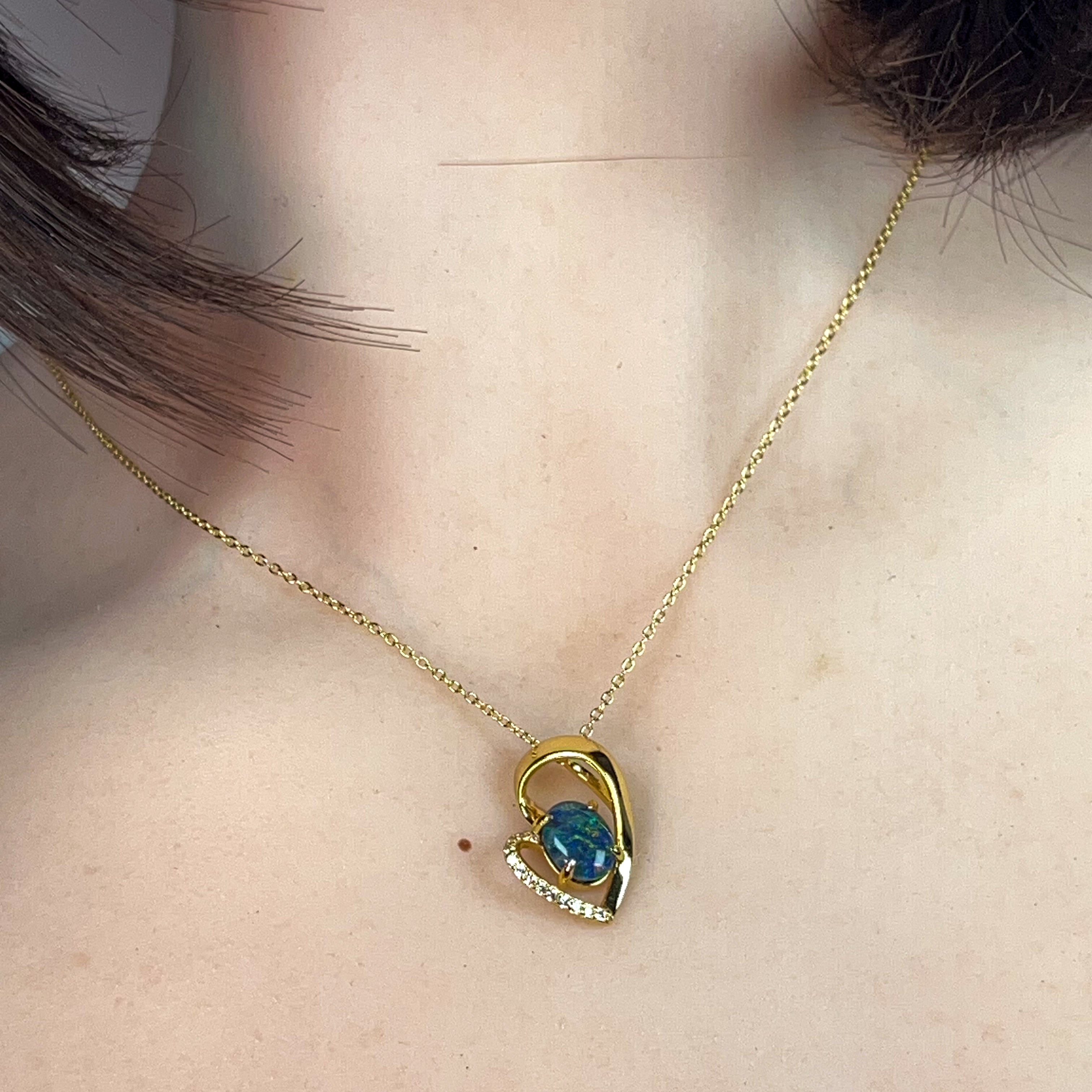 Wear your heart on your sleeve—or better yet, around your neck! This charming gold-plated pendant features a classic heart design showcasing a stunning 9x7mm opal triplet. The play of colour in the opal catches the light beautifully, making it the perfect everyday piece or thoughtful gift. Delicate yet eye-catching, this slider pendant adds a touch of warmth and elegance to any outfit. A timeless treasure that celebrates love and natural beauty.