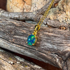 This elegant pendant features a stunning 8x6mm opal triplet securely held by a classic four-claw setting crafted from gold-plated silver. Its timeless design highlights the opal's vibrant play of color while ensuring durability and comfort. Perfect for adding a touch of sophistication to any outfit, this pendant is a versatile and enduring addition to your jewelry collection.