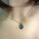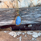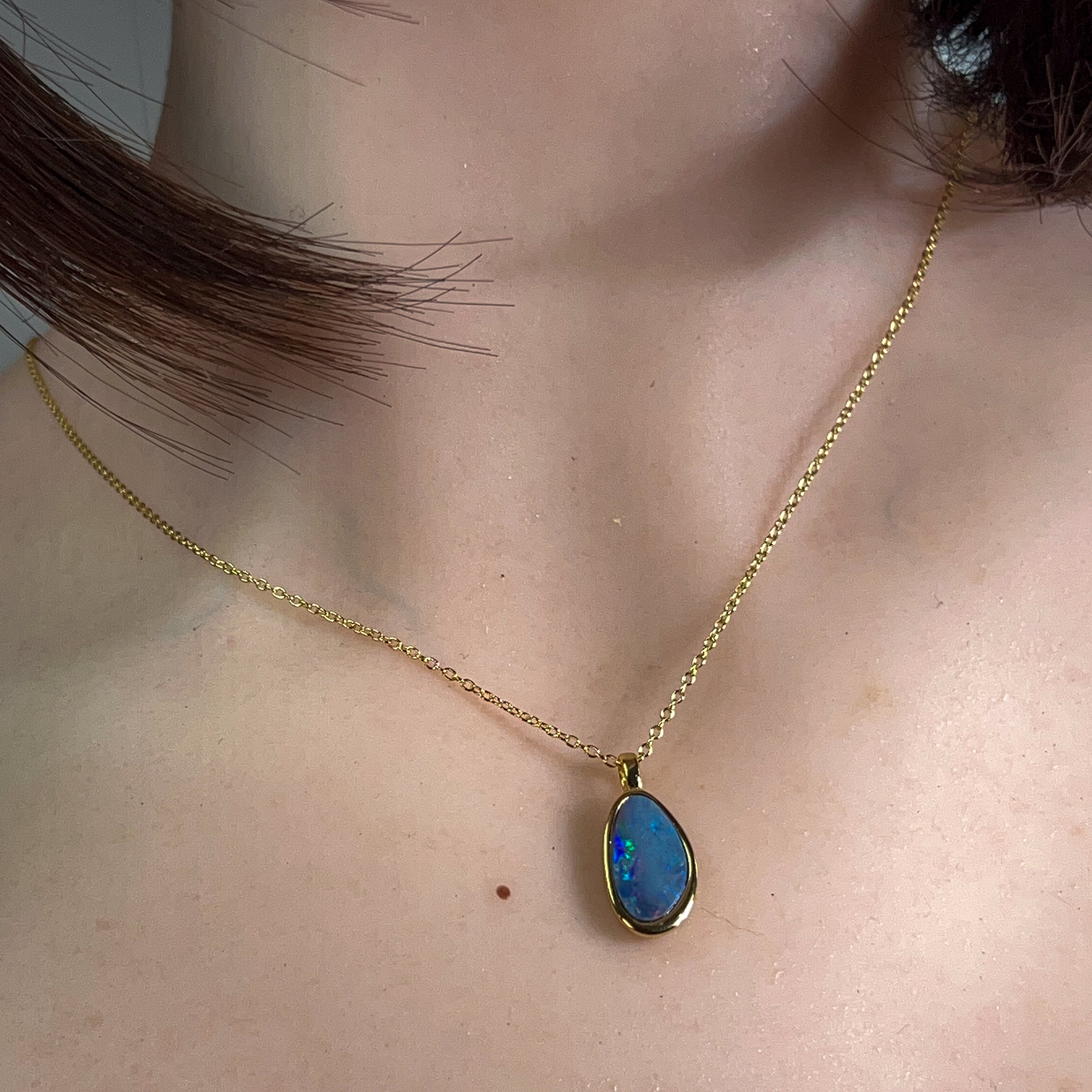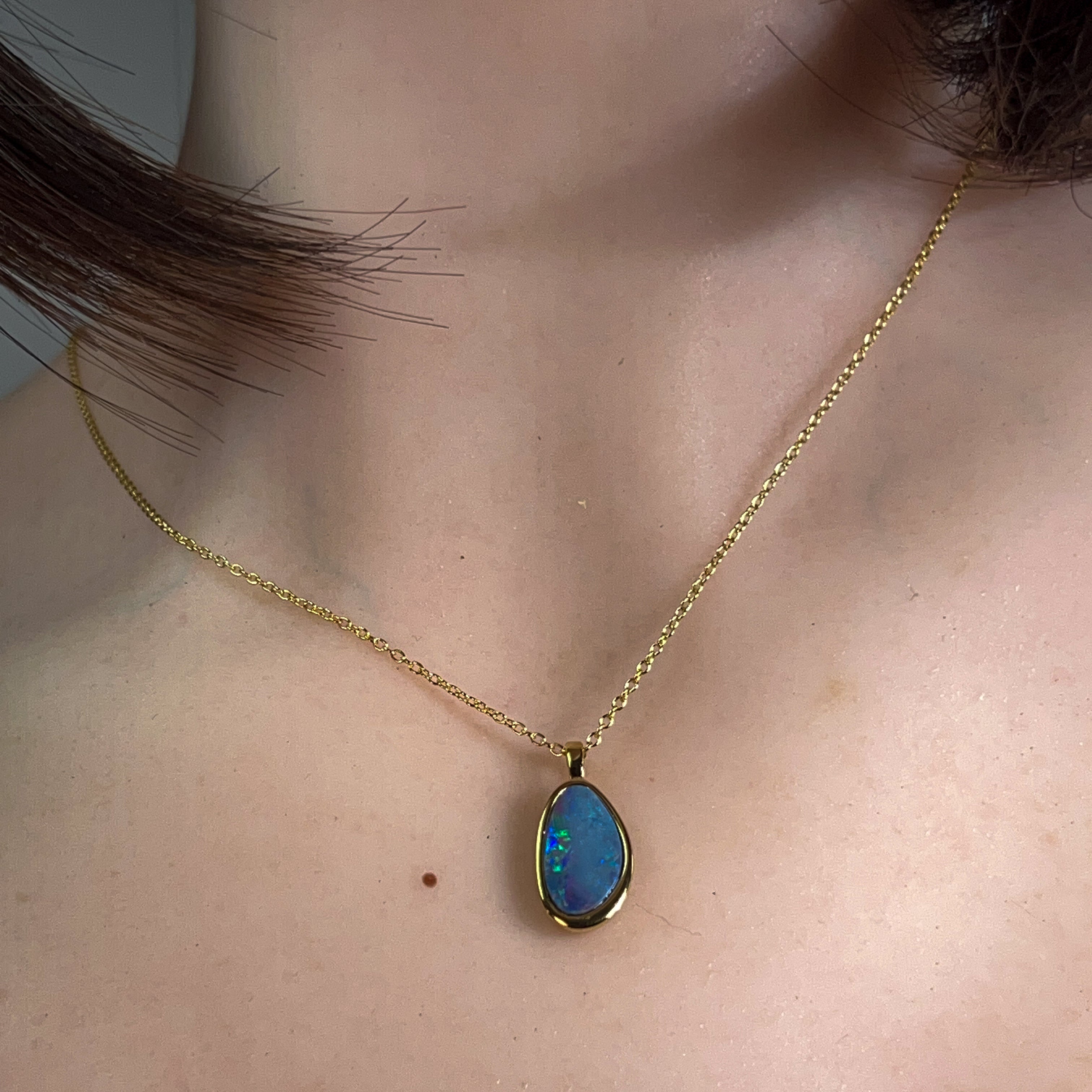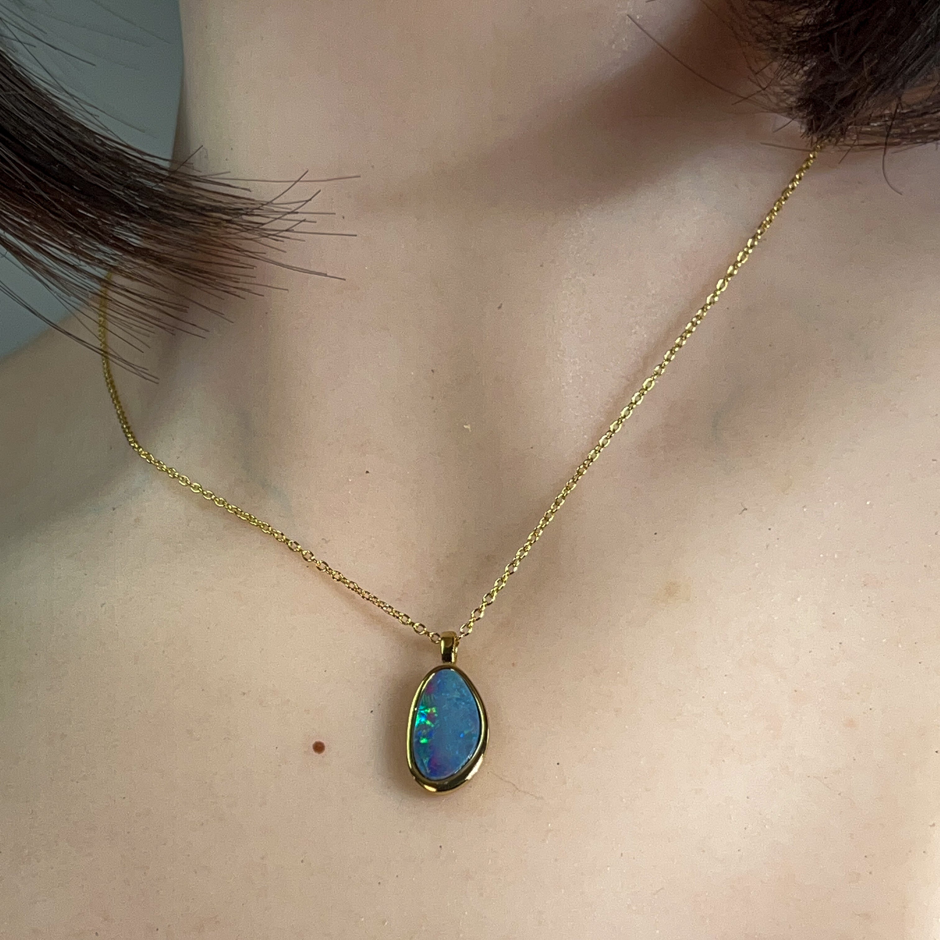 This delicate gold-plated silver pendant showcases a stunning 16x9mm opal doublet that captures light with mesmerizing play-of-colour. The refined design combines precious metals with nature's most enchanting gemstone, creating an elegant piece perfect for everyday wear or special occasions. The dainty proportions make it versatile enough to layer or wear solo, while the opal's unique iridescence ensures you'll always have a conversation-starting accessory. A timeless investment in understated luxury.