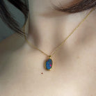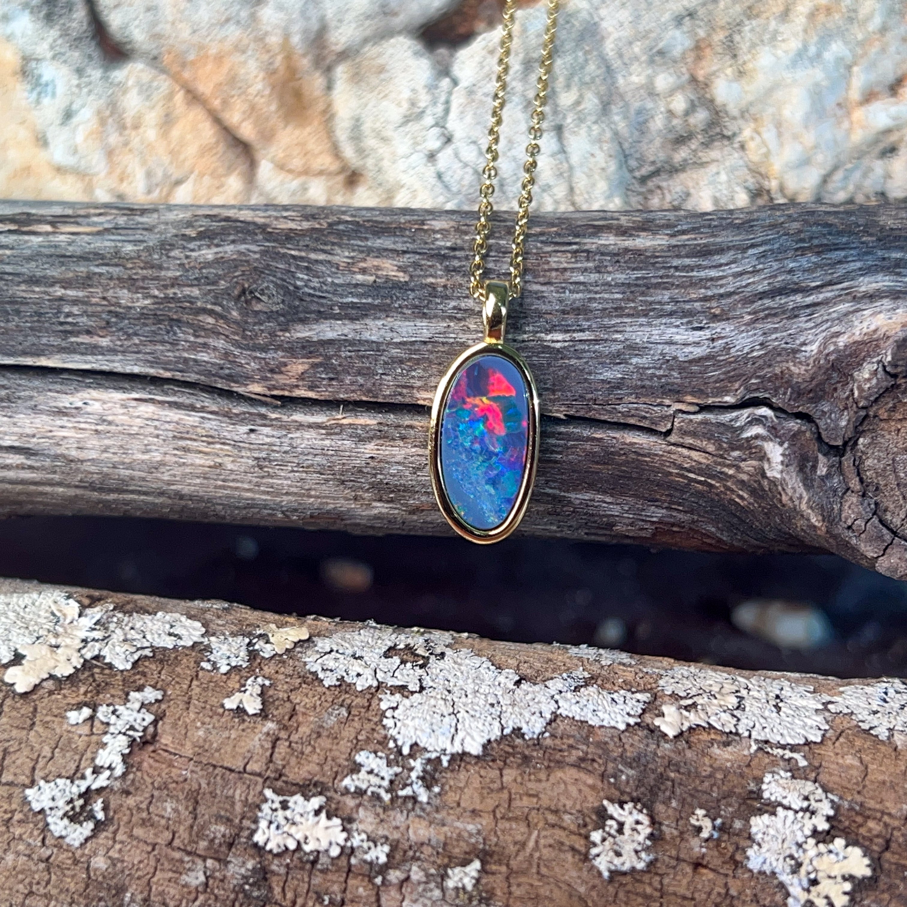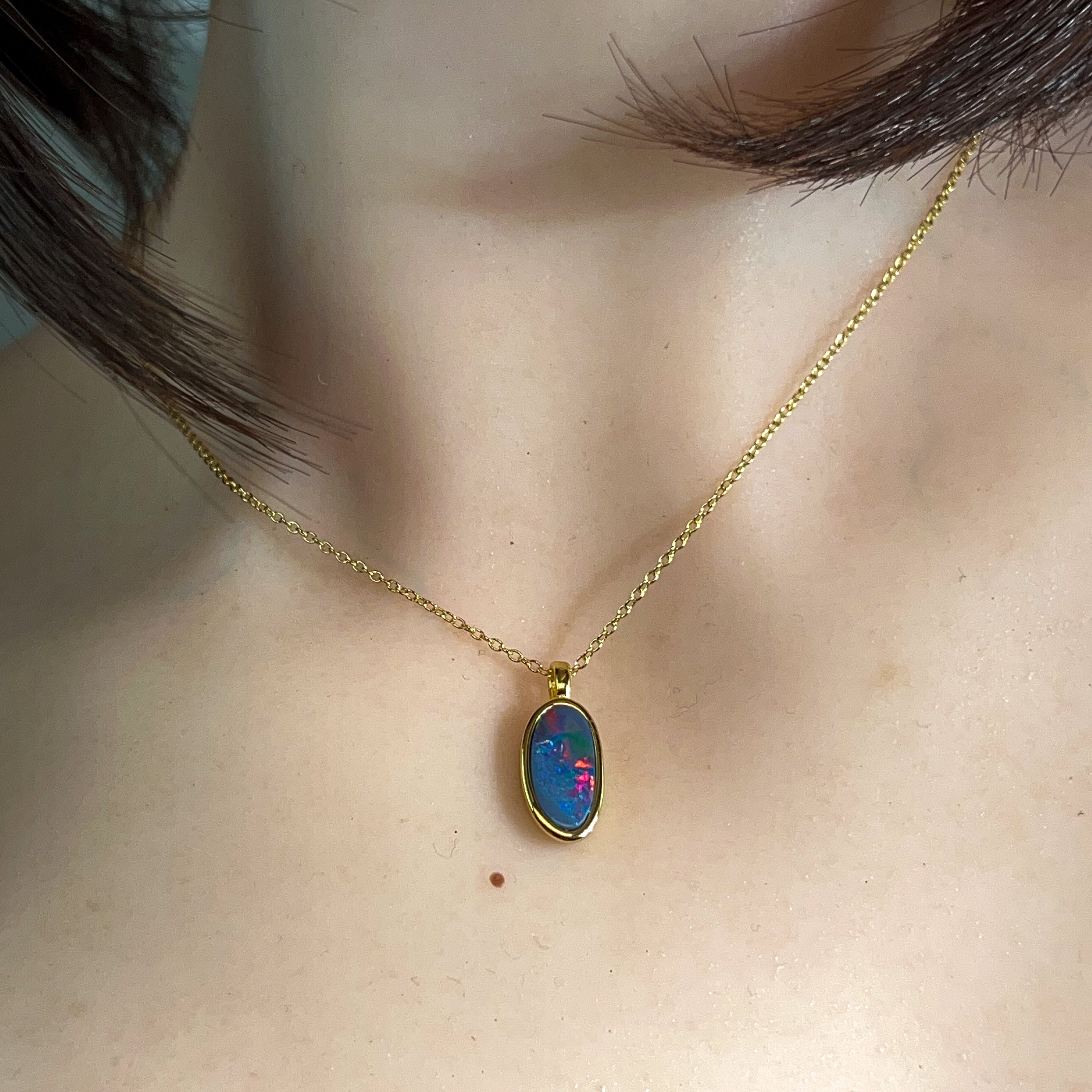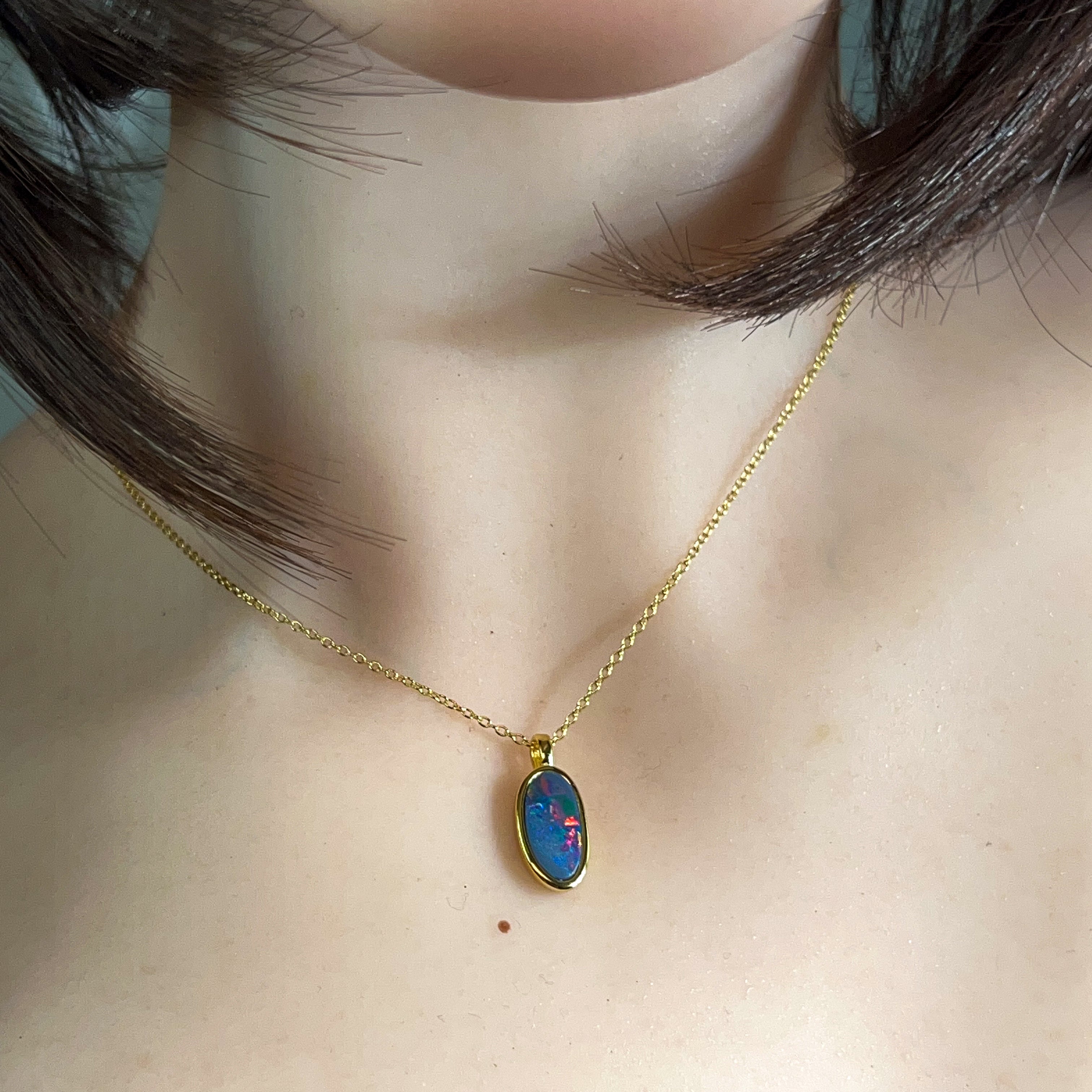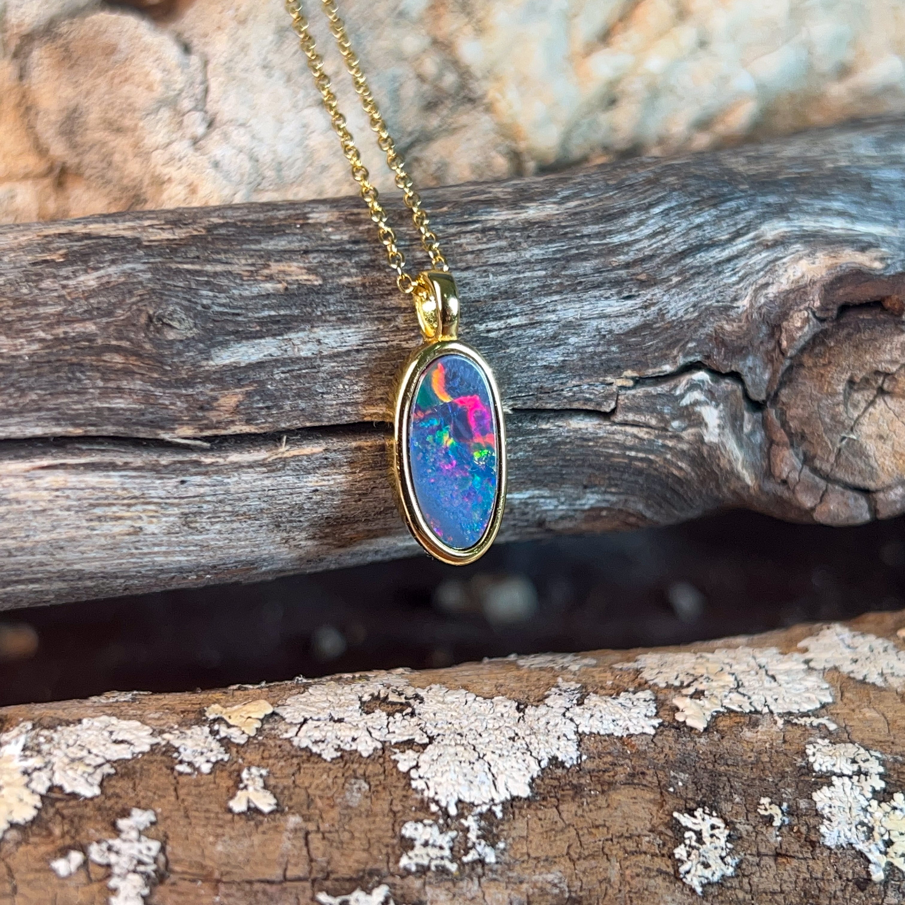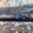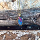 Dive into a splash of colour with this stunning opal doublet pendant! Featuring vibrant red and blue hues set in gleaming gold-plated silver, this petite 13x7mm beauty captures light like a tiny rainbow. Perfect for adding a playful pop of personality to any outfit, whether you're dressing up or keeping it casual. Let your jewellery do the talking with this eye-catching gem that brings joy and sparkle to your everyday style.