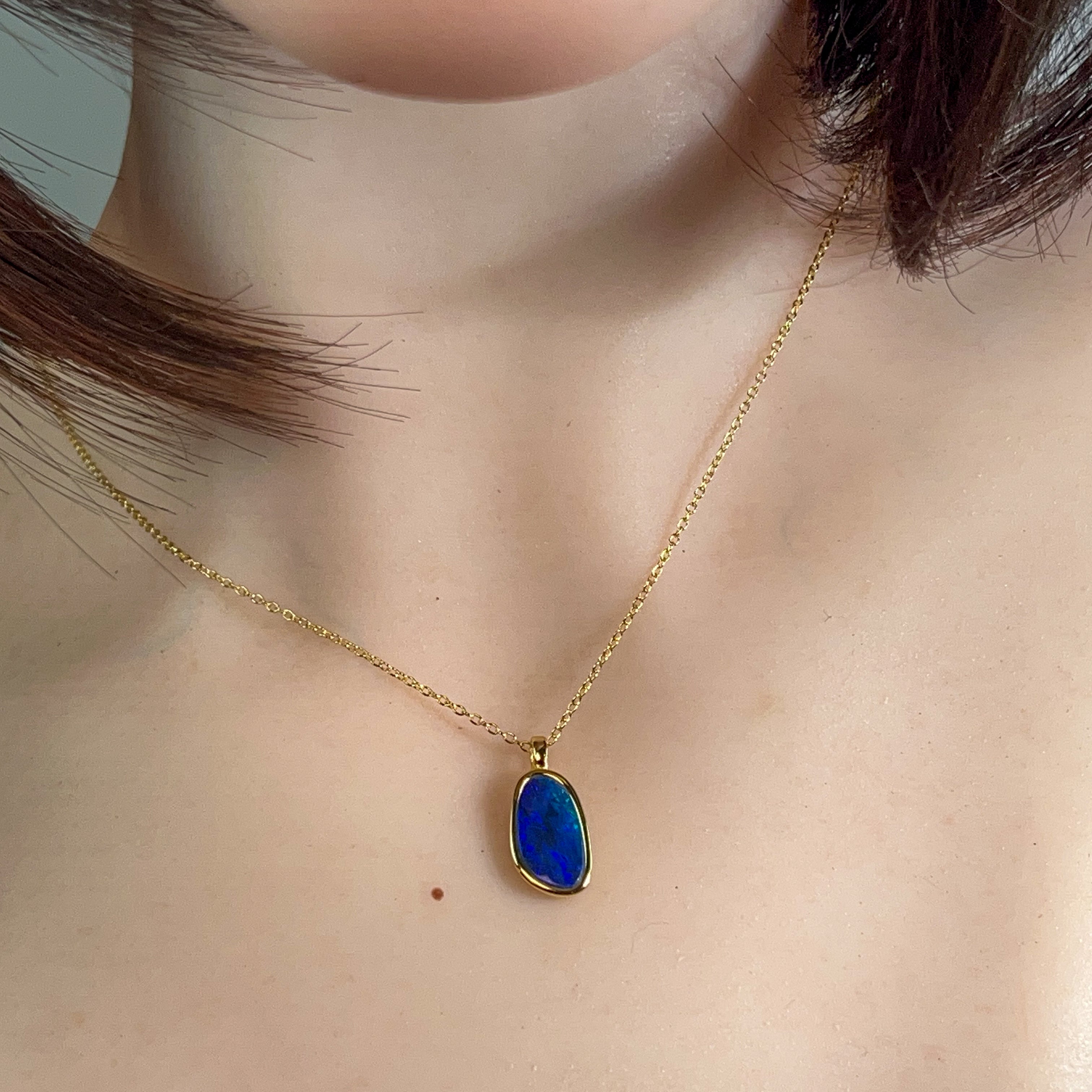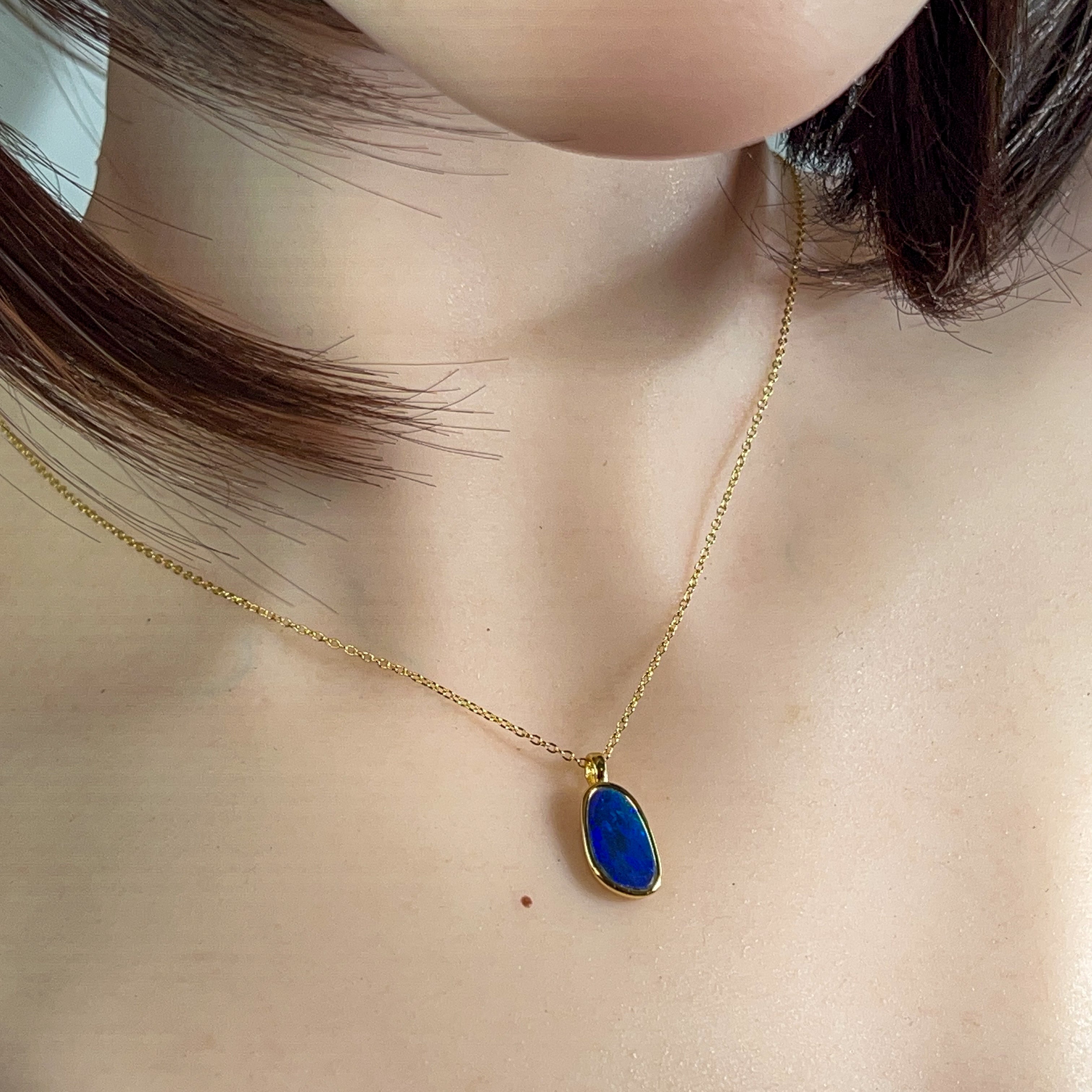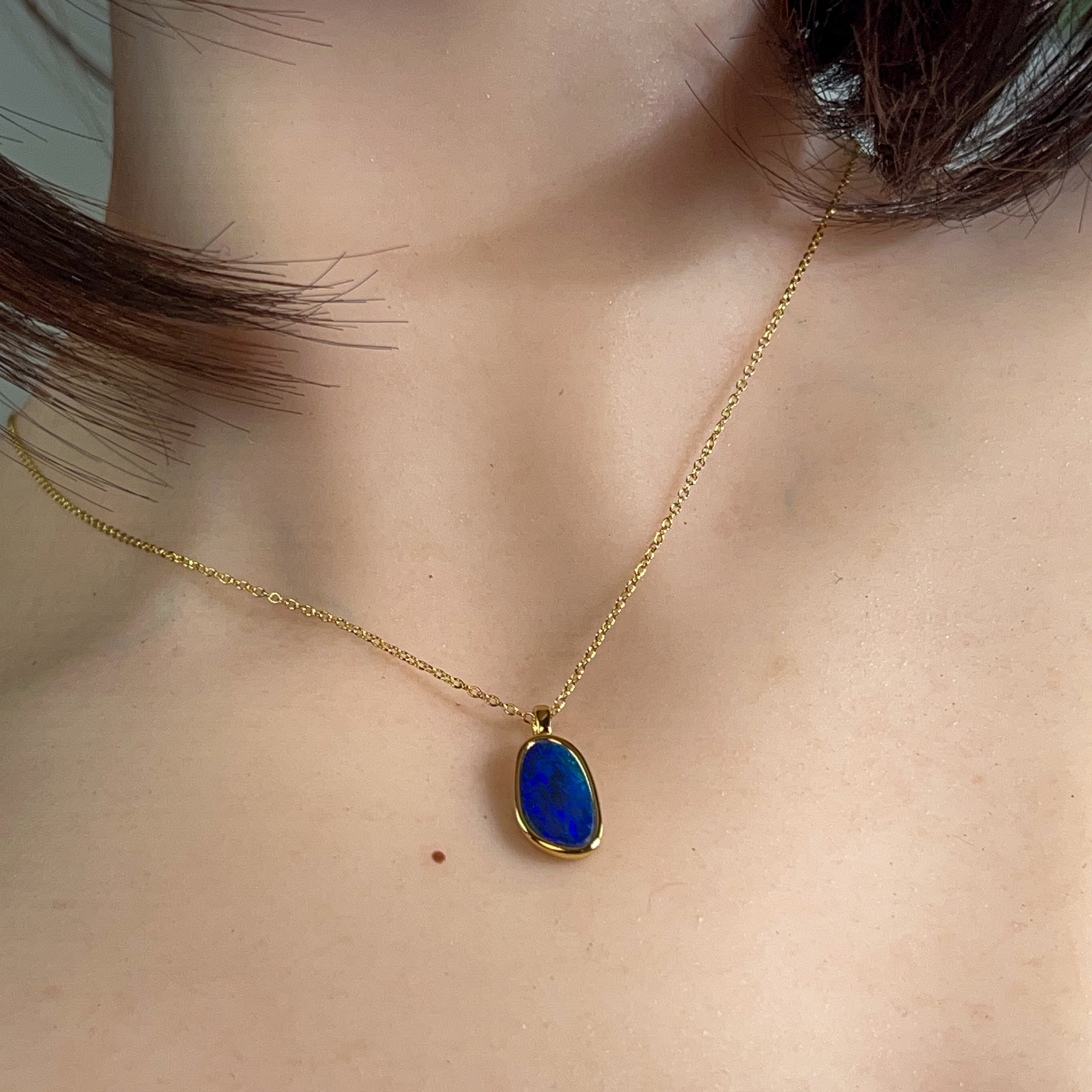 Elevate your everyday elegance with this exquisite gold-plated sterling silver opal doublet pendant. Measuring a refined 15x9mm, its delicate proportions make it the perfect statement piece for layering or wearing solo. The lustrous opal doublet showcases mesmerizing colour play that catches light beautifully, while the warm gold plating adds timeless sophistication. Crafted from quality sterling silver, this dainty pendant combines durability with understated luxury—ideal for those who appreciate fine jewellery that whispers rather than shouts.