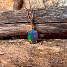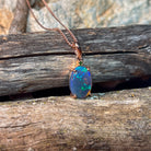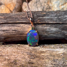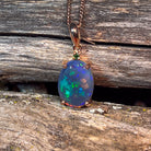 This elegant pendant features a stunning 14x10mm black opal, beautifully set in rose gold plating. Its rich, dark hues contrast with the warm rose gold tones, creating a timeless piece that enhances any outfit. Perfect for adding a touch of sophistication and unique charm to your jewelry collection.