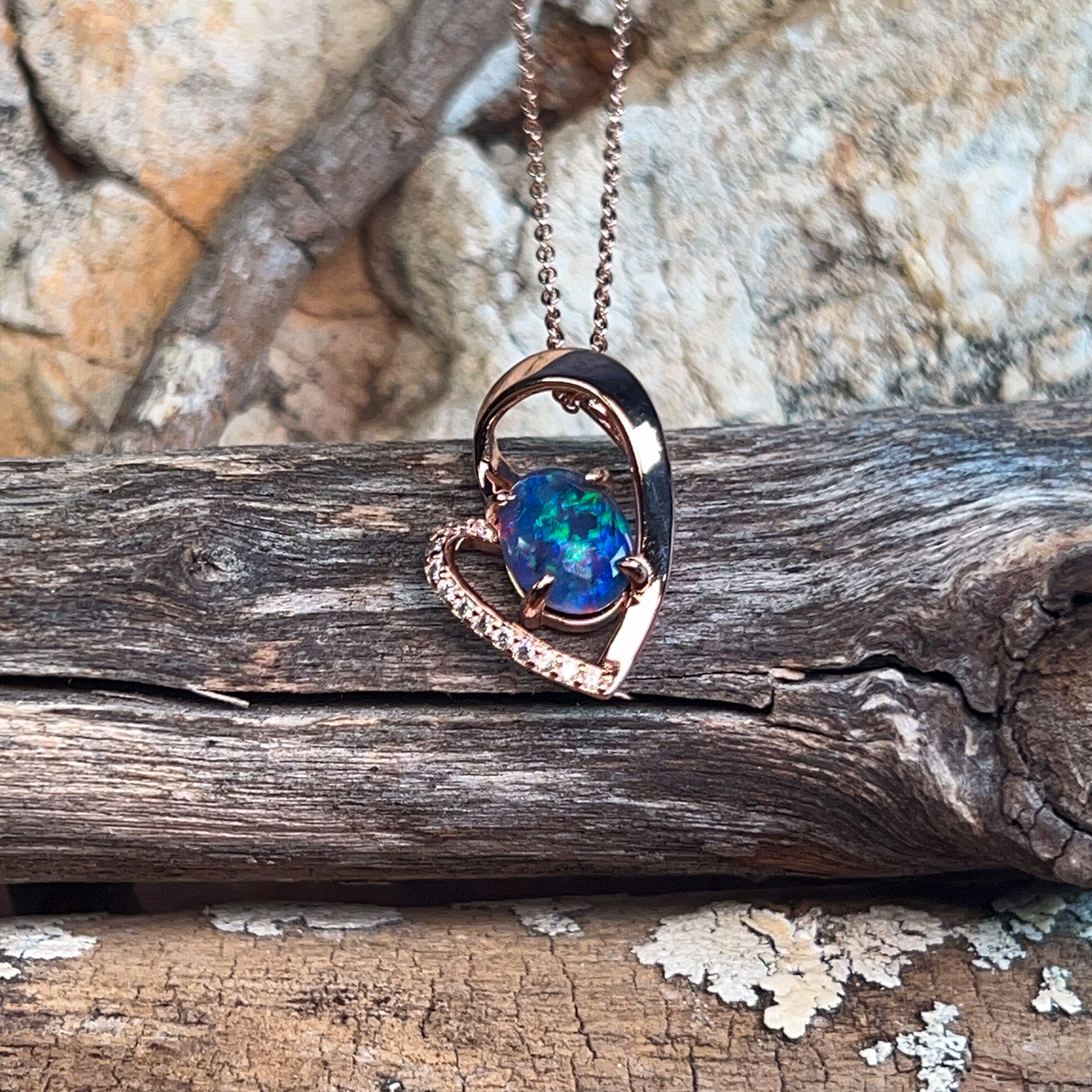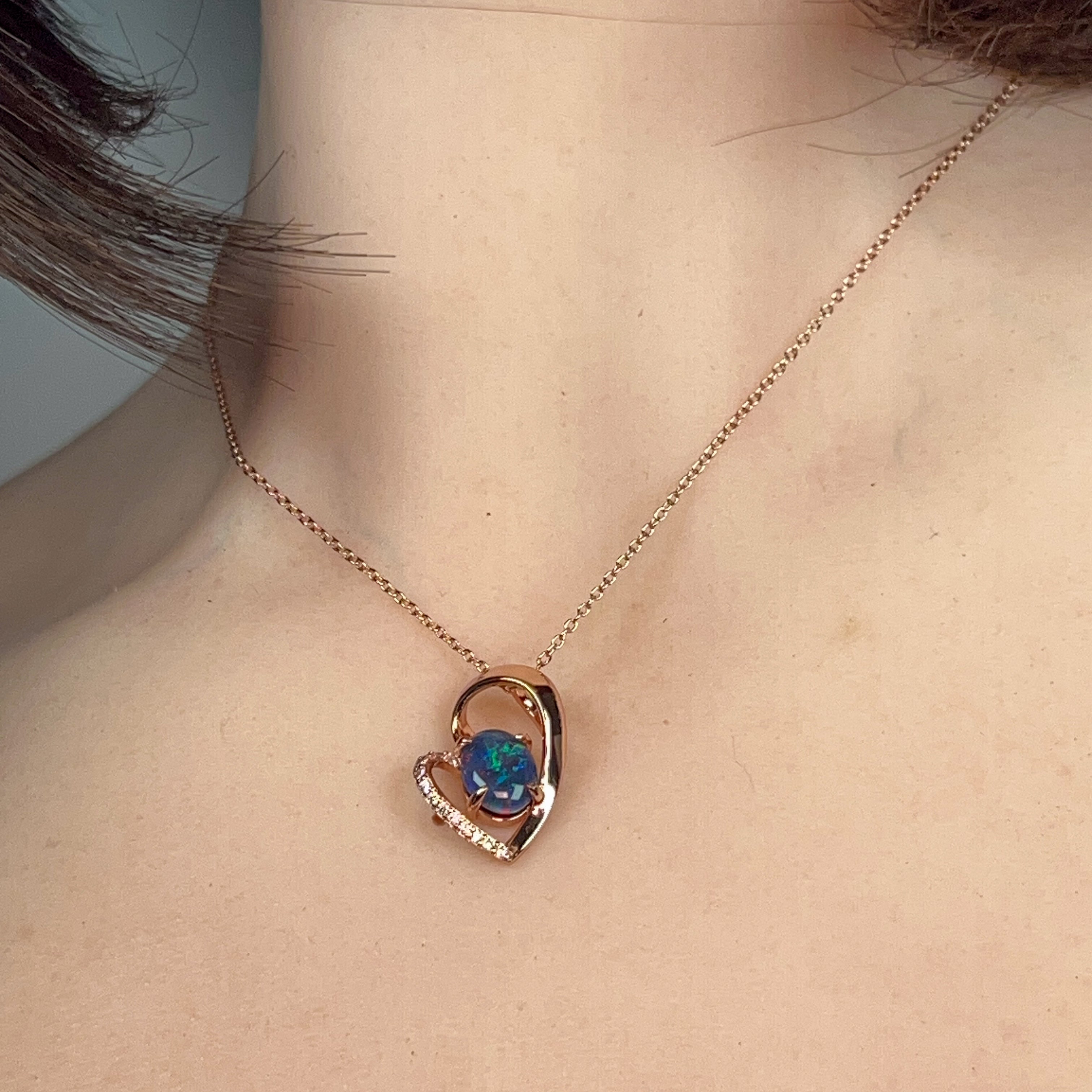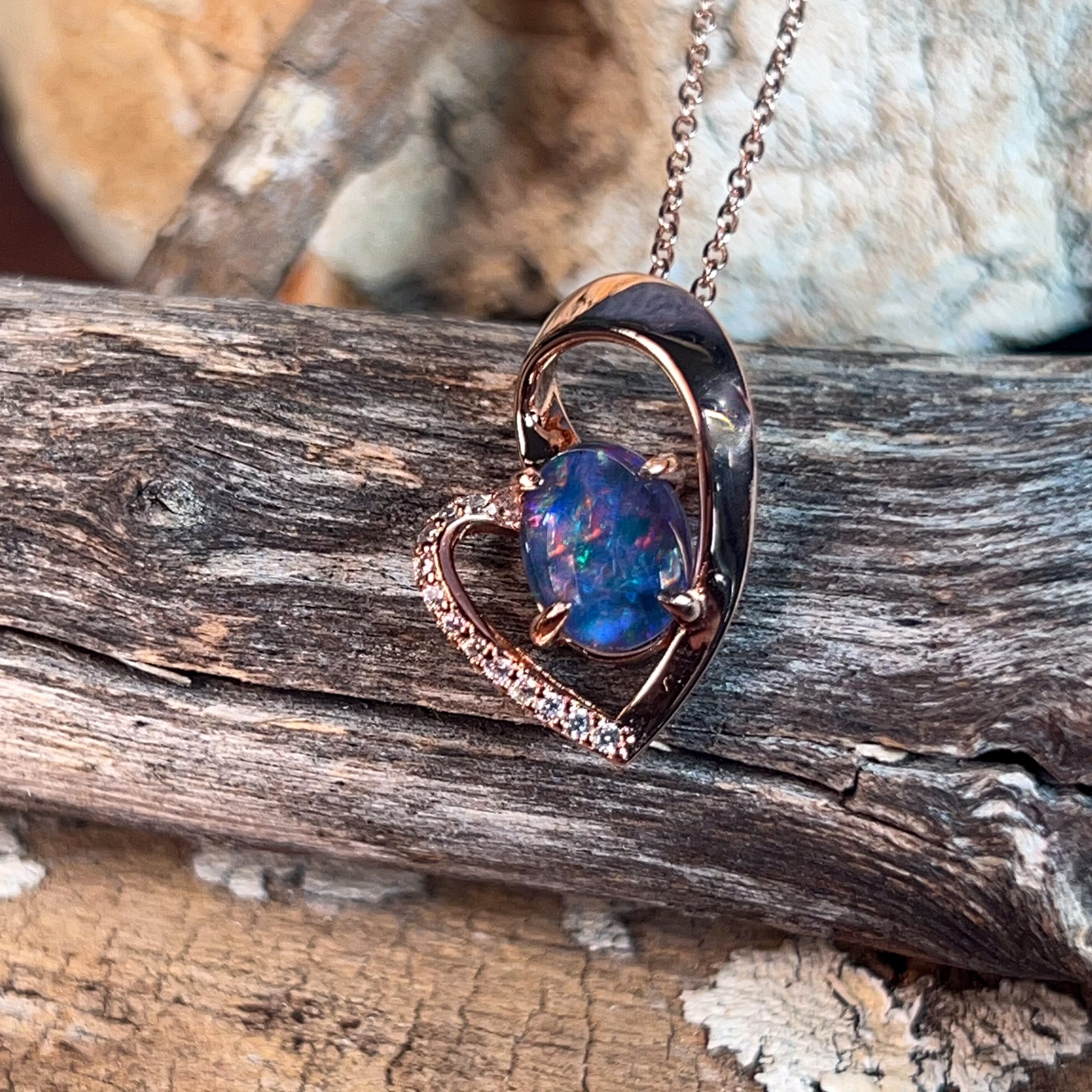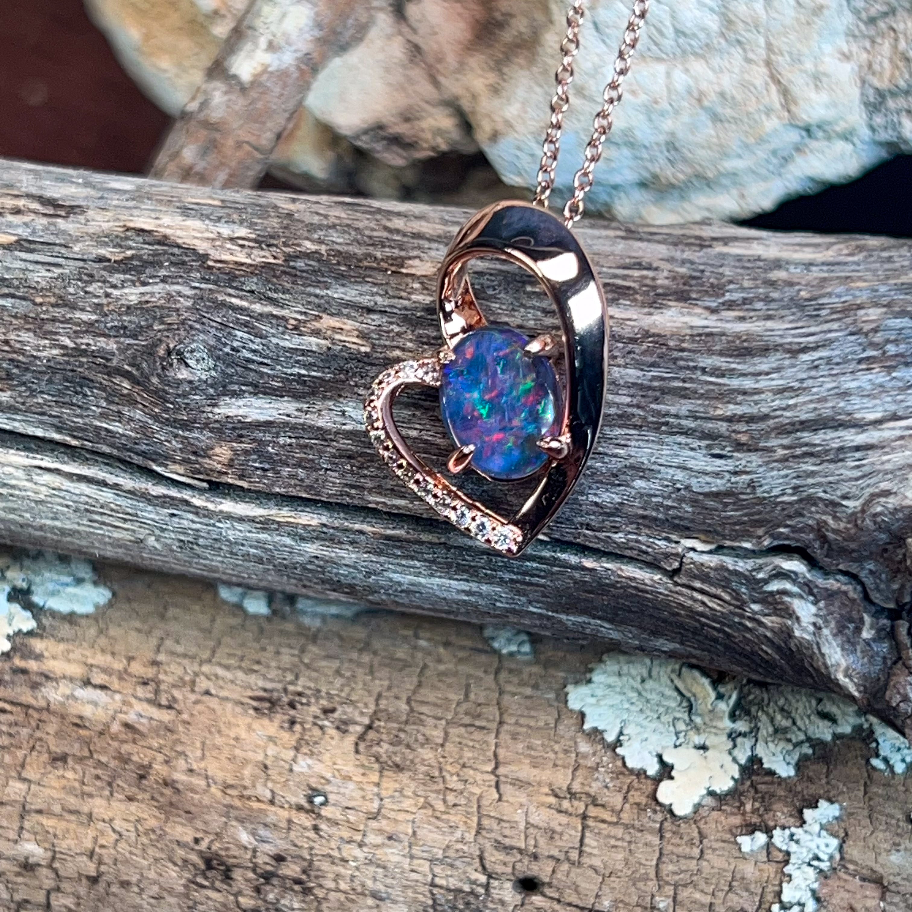 Wear your heart on your sleeve—literally! This charming rose gold-plated sterling silver pendant features a delicate heart design cradling a stunning 9x7mm opal triplet. The play of colour in the opal catches the light beautifully, making it the perfect everyday piece or thoughtful gift. Versatile, elegant, and just a touch romantic, this slider pendant adds instant warmth to any jewellery collection.