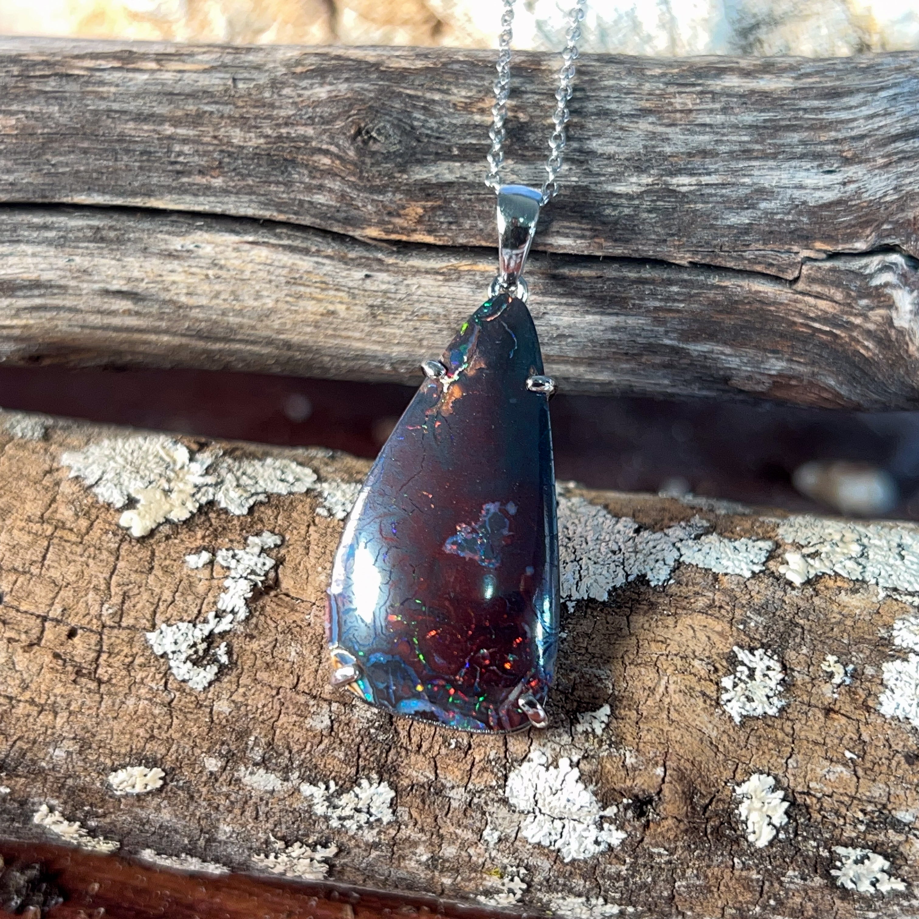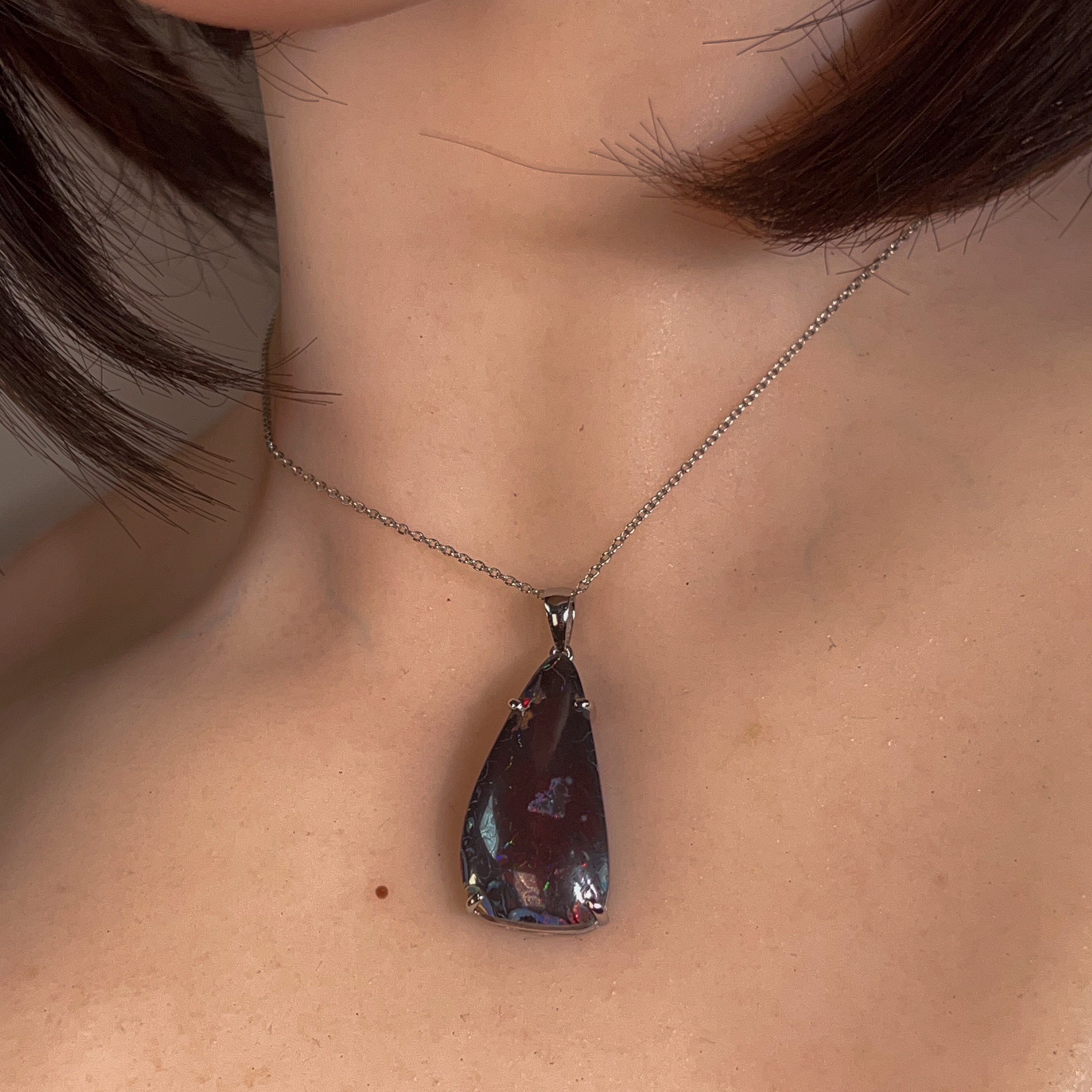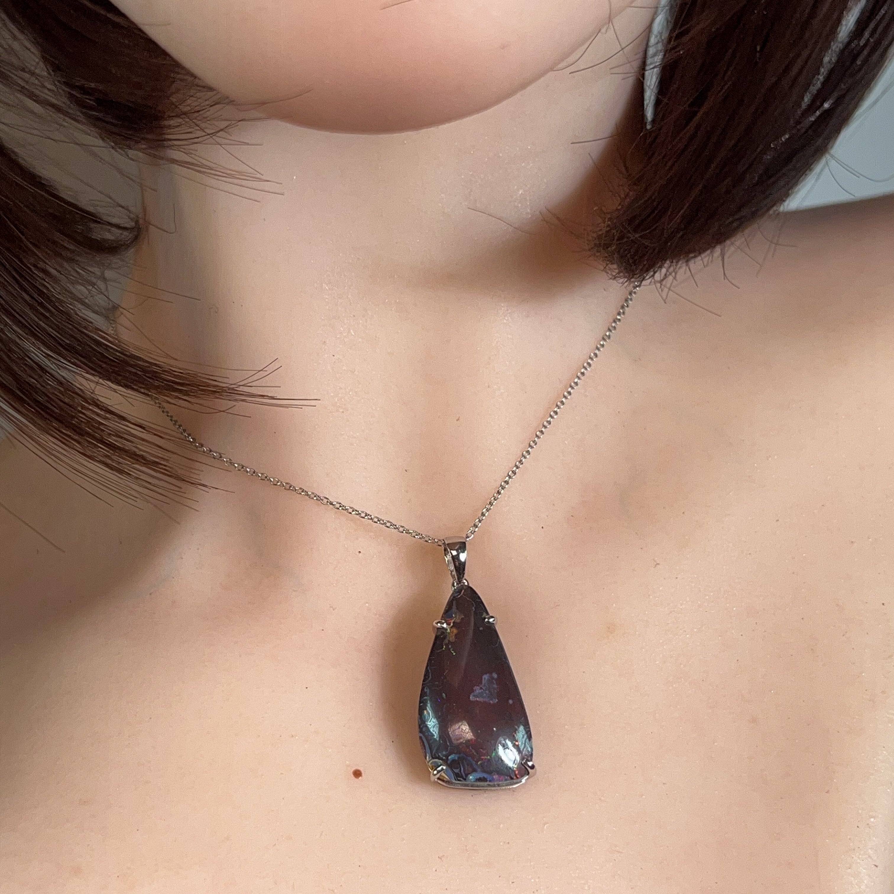 Silver Large Matrix Opal 32x16mm Pendant Showcase nature's artistry with this striking matrix opal pendant, where rich veins of colour dance across a substantial 32x16mm stone. Set in lustrous silver, this generous-sized piece makes an impressive statement without overwhelming your neckline. Matrix opals are prized for their unique patterns and durability, offering you a conversation-starting gemstone that's both beautiful and wearable for everyday elegance. Perfect for those who appreciate bold, natural beauty with authentic character.