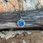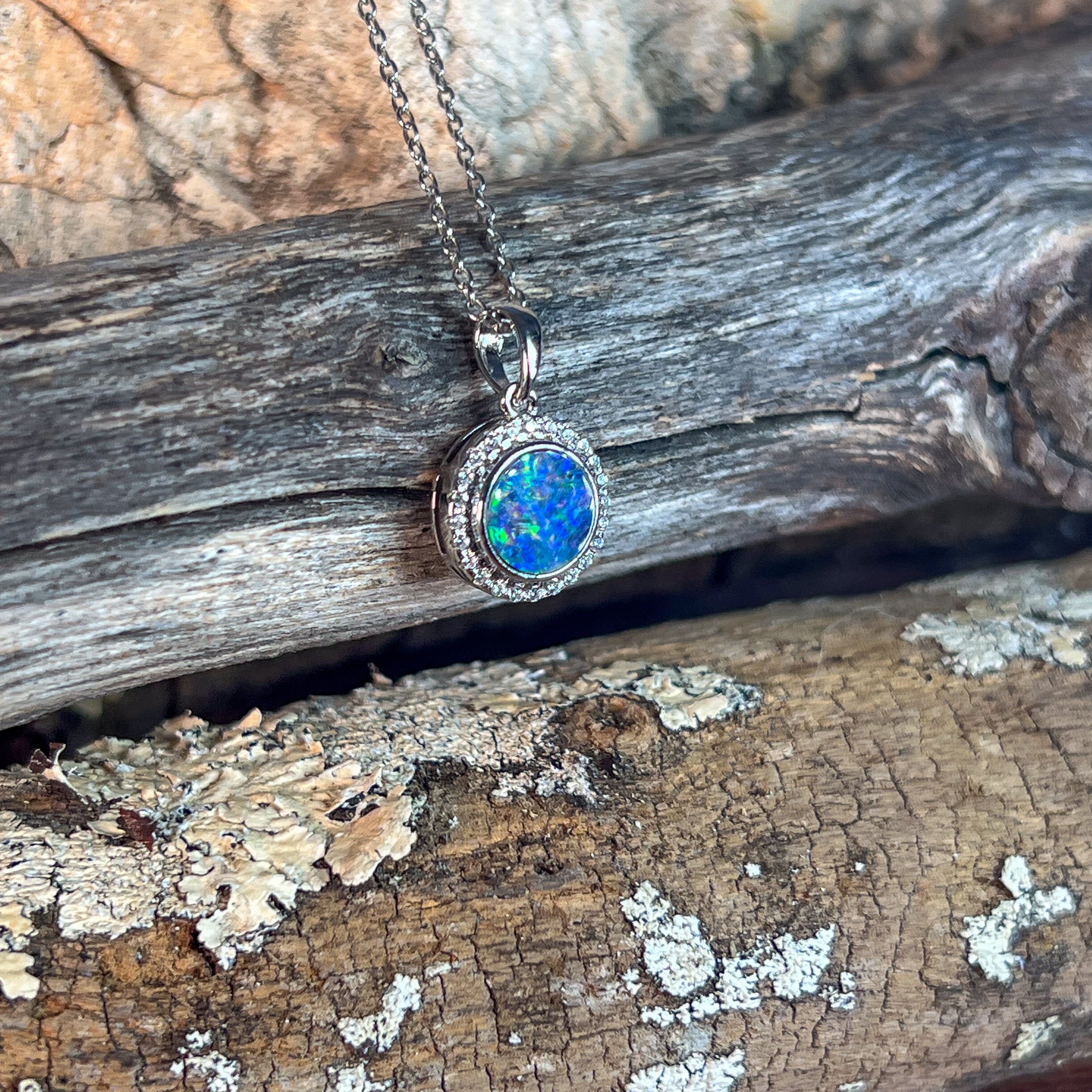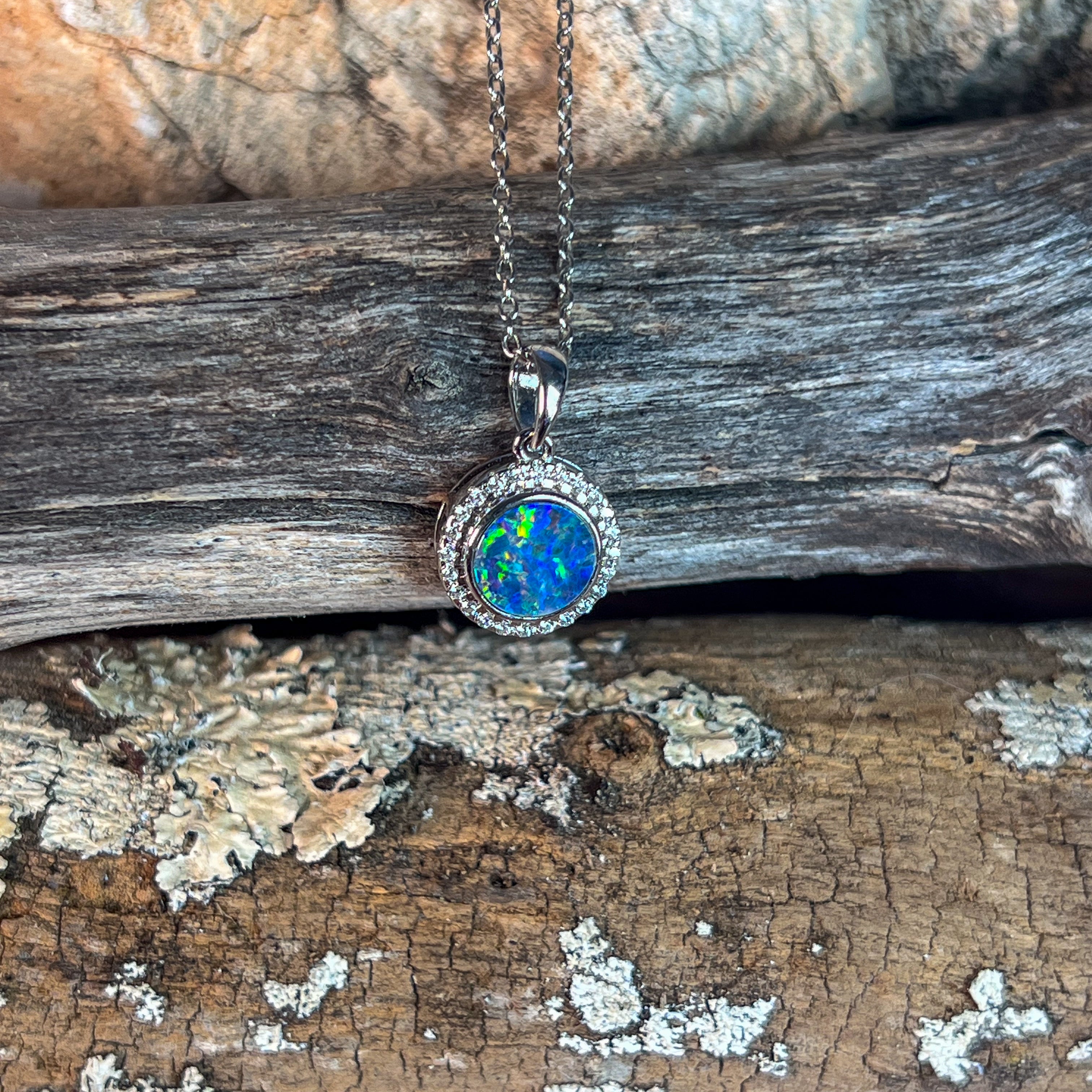 Elegant petite pendant featuring a stunning 7mm round Australian opal doublet at its heart, surrounded by 24 brilliant-cut cubic zirconia stones in a classic sterling silver cluster design. The opal displays vibrant red, blue, and green hues, weighing 0.73ct. Compact dimensions of 17x10mm make it perfect for everyday wear or layering. Total weight 1.15g. A timeless piece that captures the natural beauty of Australian opal in refined, understated style.