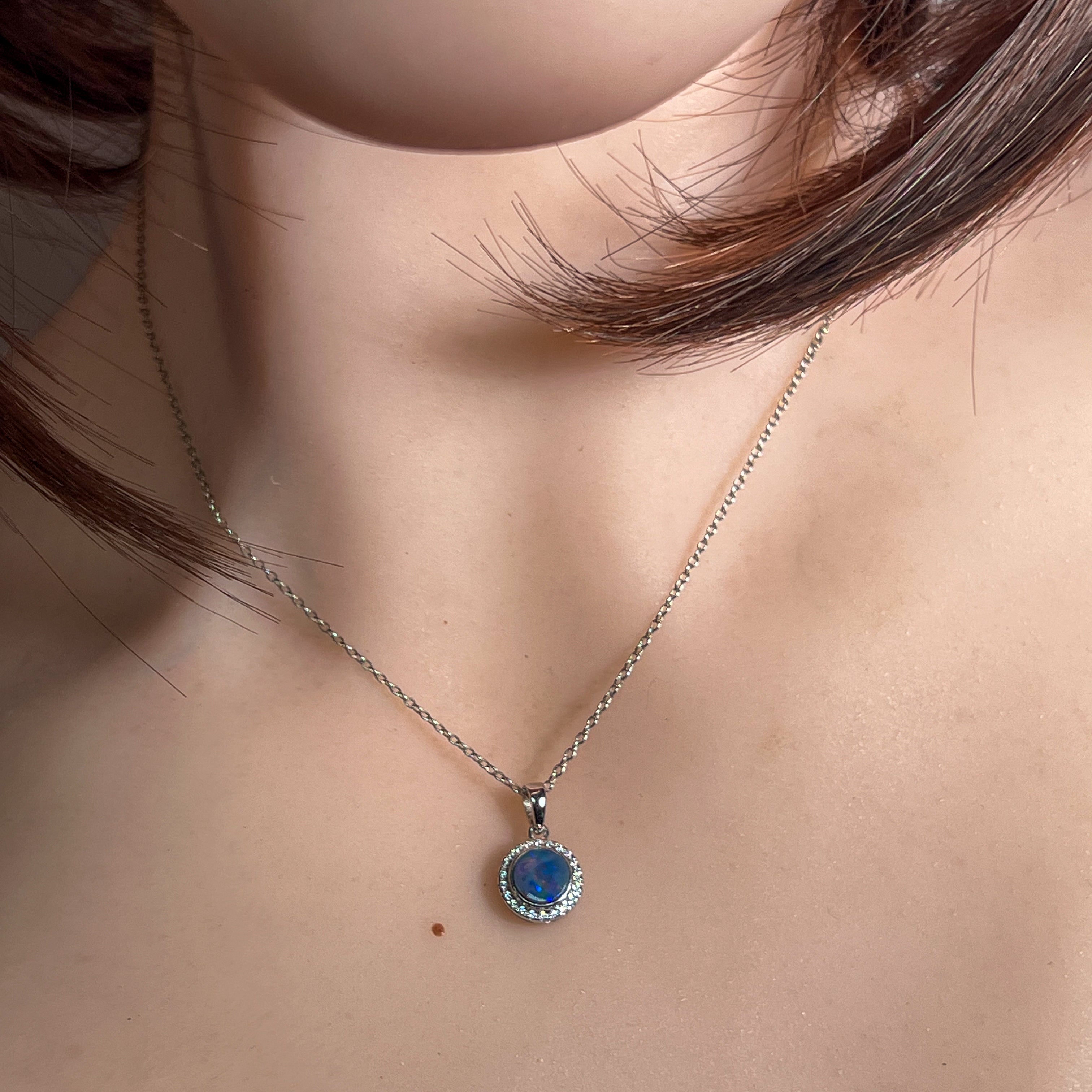Elegant petite cluster pendant featuring a vibrant 6.5mm Australian opal doublet at its heart, surrounded by 22 brilliant-cut cubic zirconia stones in a sterling silver circle design. The opal displays stunning red, blue, and green play-of-colour, while the sparkling accents catch light beautifully. Compact and refined at 15x10mm, this delicate piece weighs just 0.9g, making it perfect for everyday wear or layering. A timeless addition to any jewellery collection.