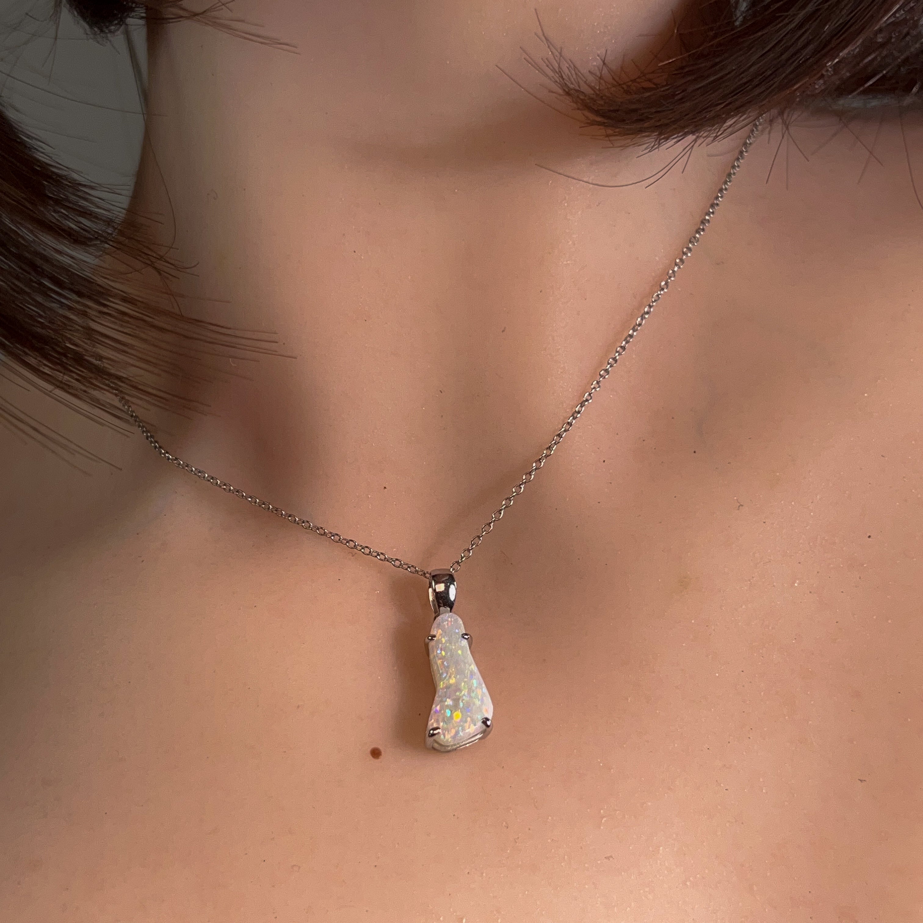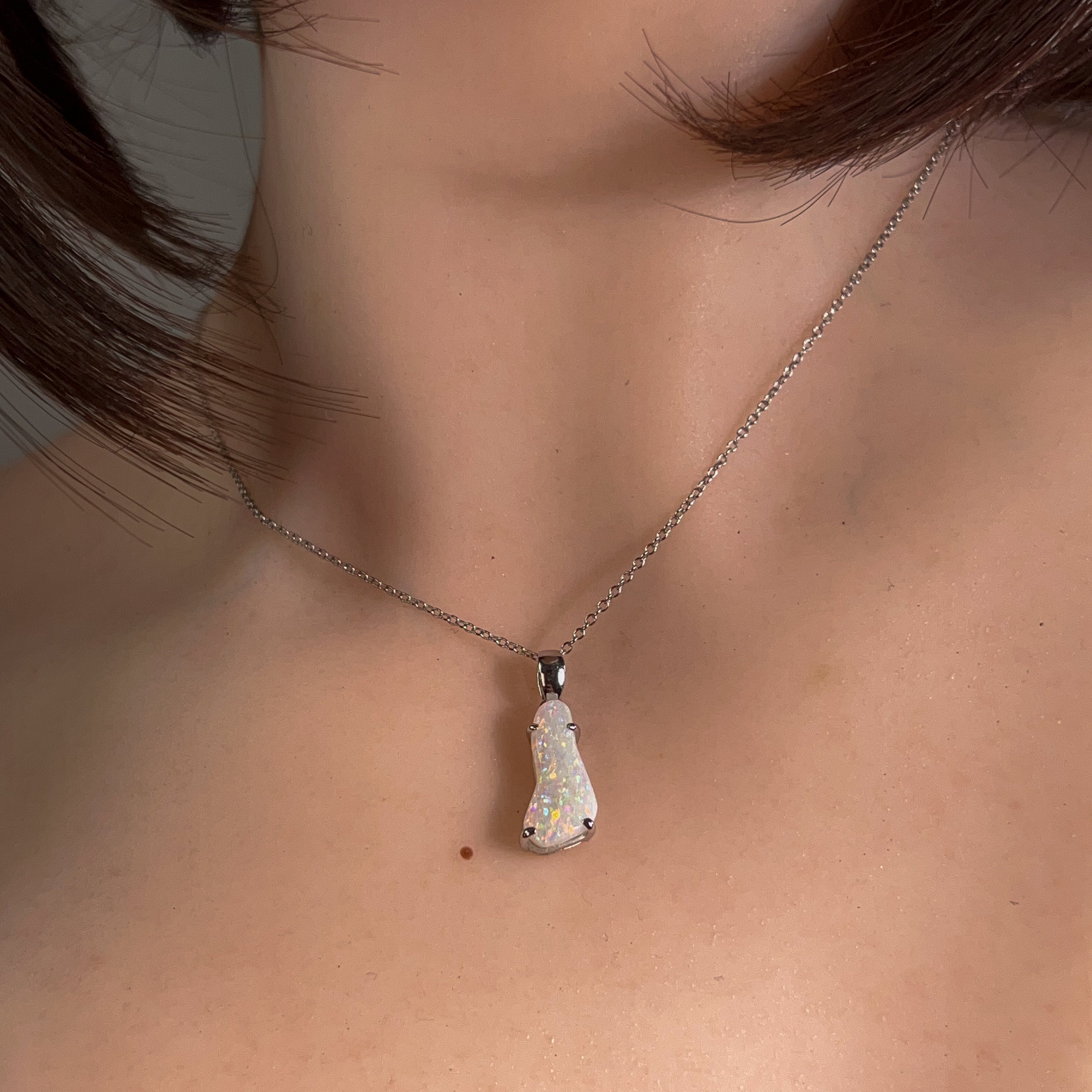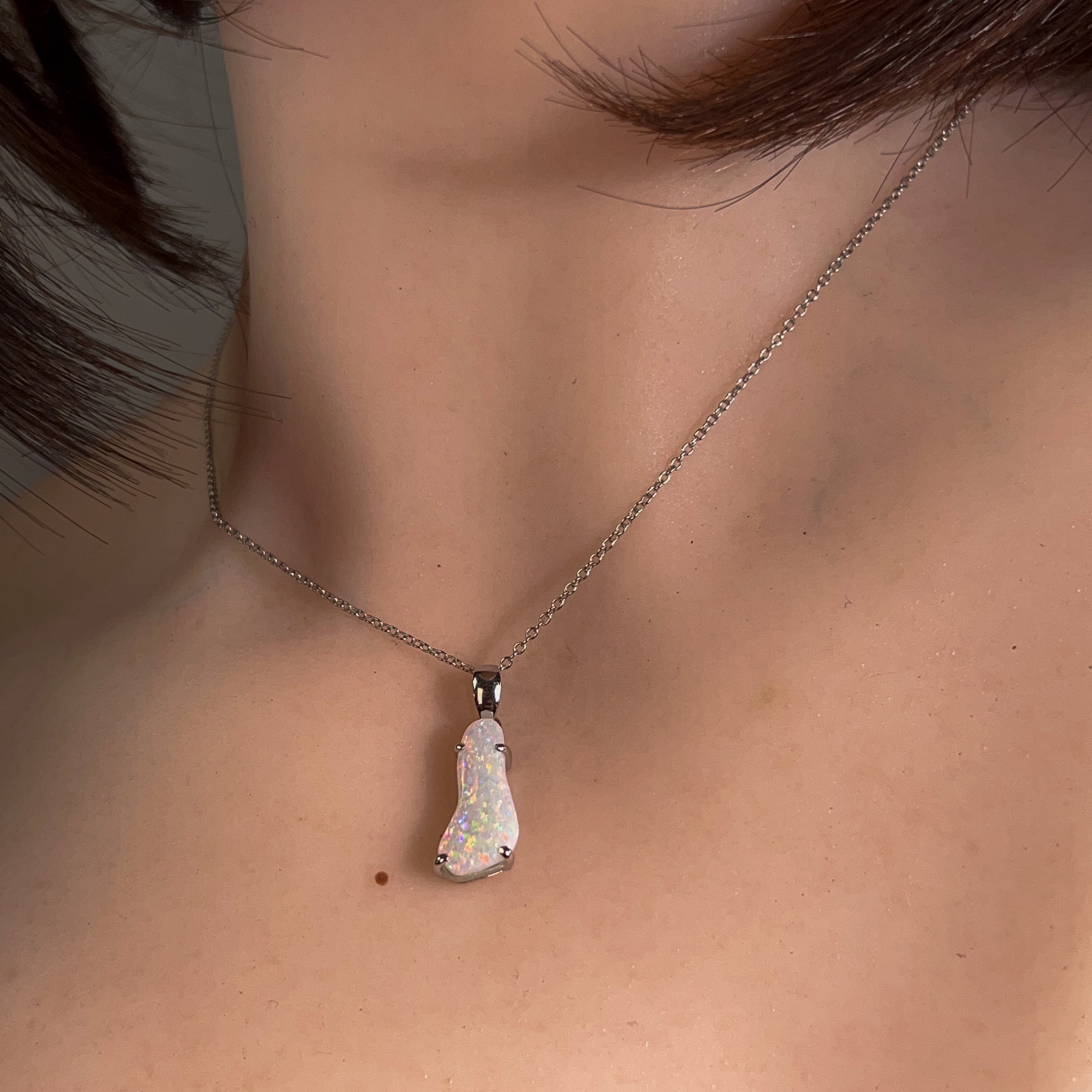 Discover the ethereal beauty of this sterling silver pendant, showcasing a captivating white opal freeform stone weighing 2.24 carats. Each piece celebrates the opal's mesmerizing play-of-colour, with its unique patterns and iridescent flashes that shift with every movement. Crafted in lustrous sterling silver, this pendant combines timeless elegance with natural artistry. Perfect for those seeking a distinctive statement piece that captures light and imagination, this freeform design ensures no two stones are identical. An investment in wearable art that transforms any ensemble into something truly extraordinary.