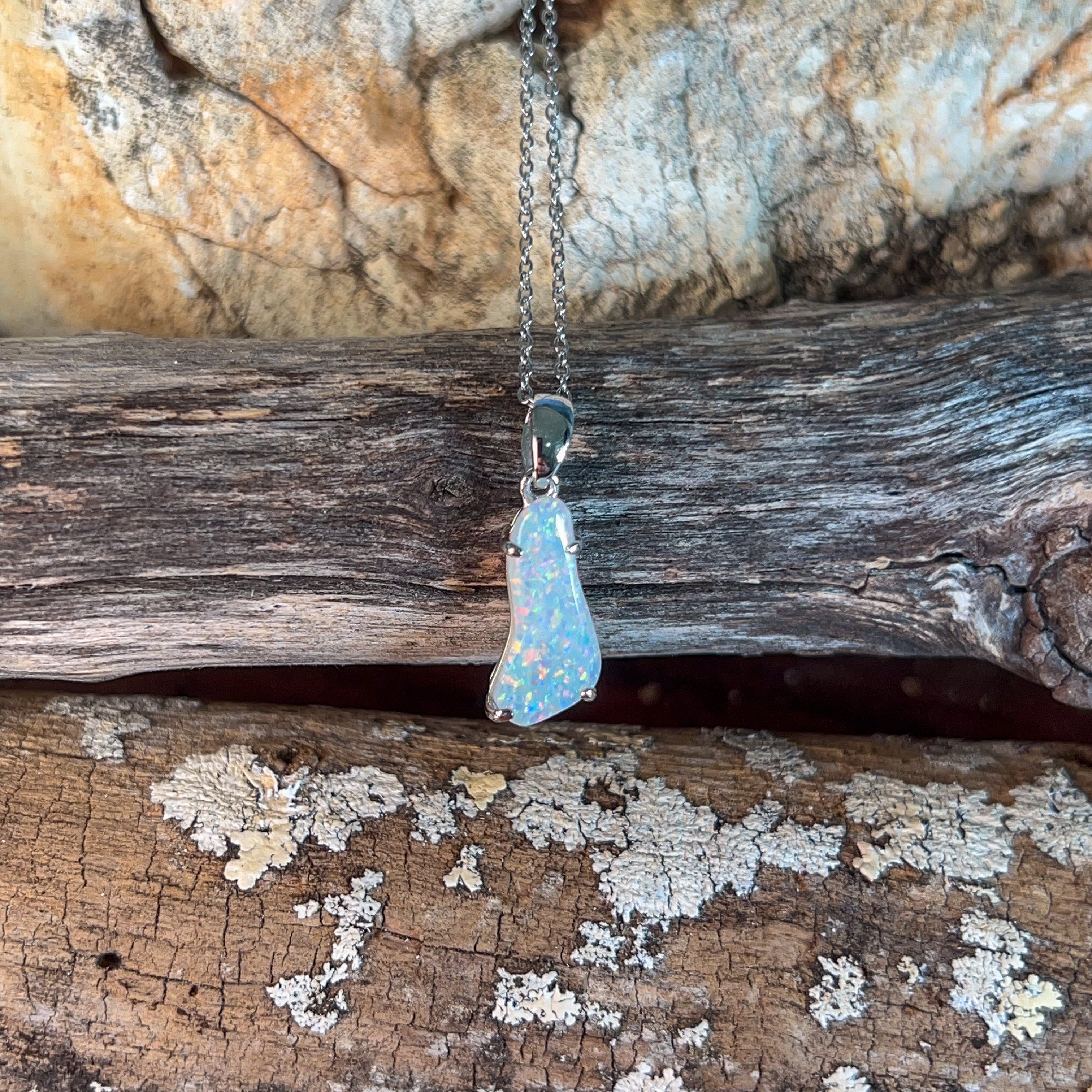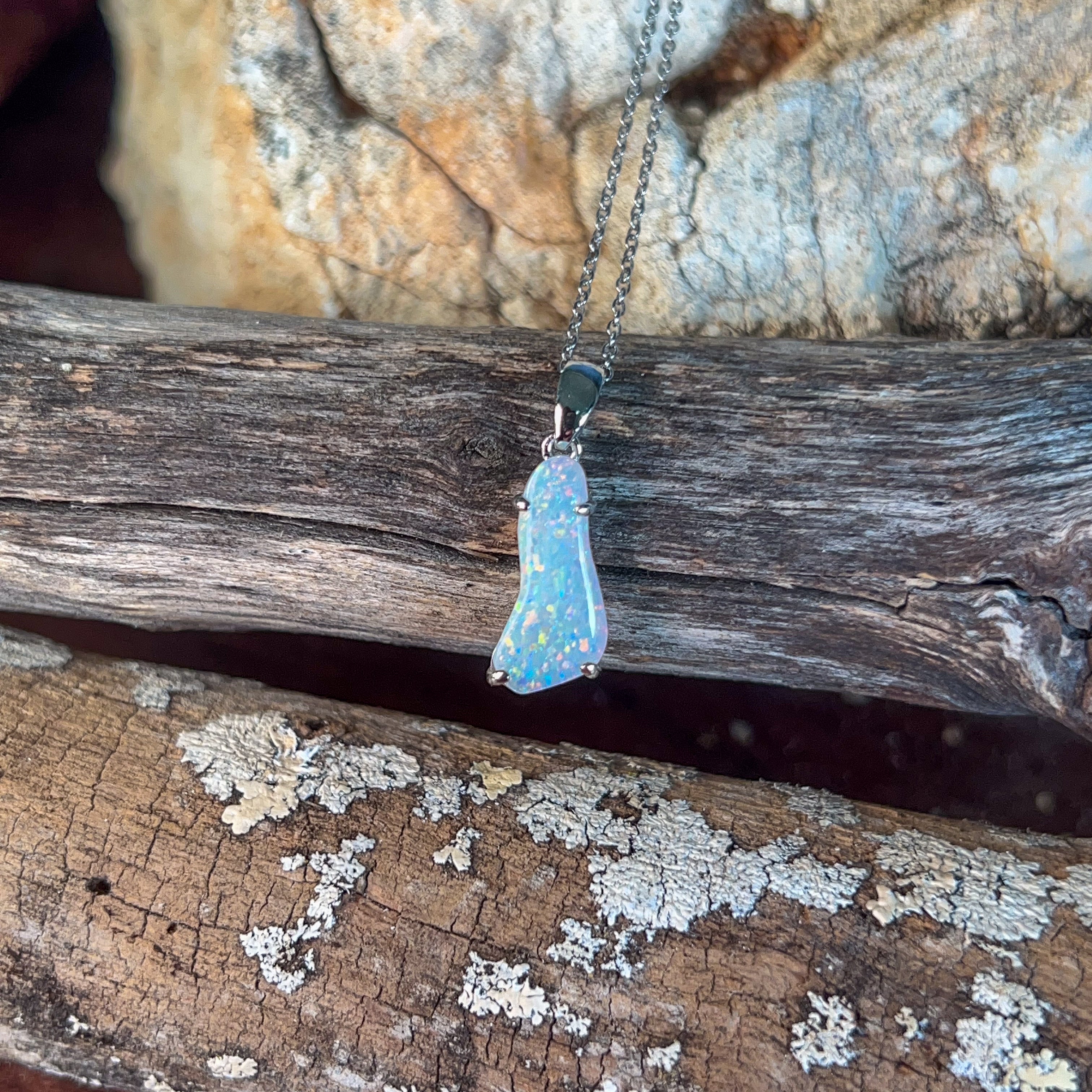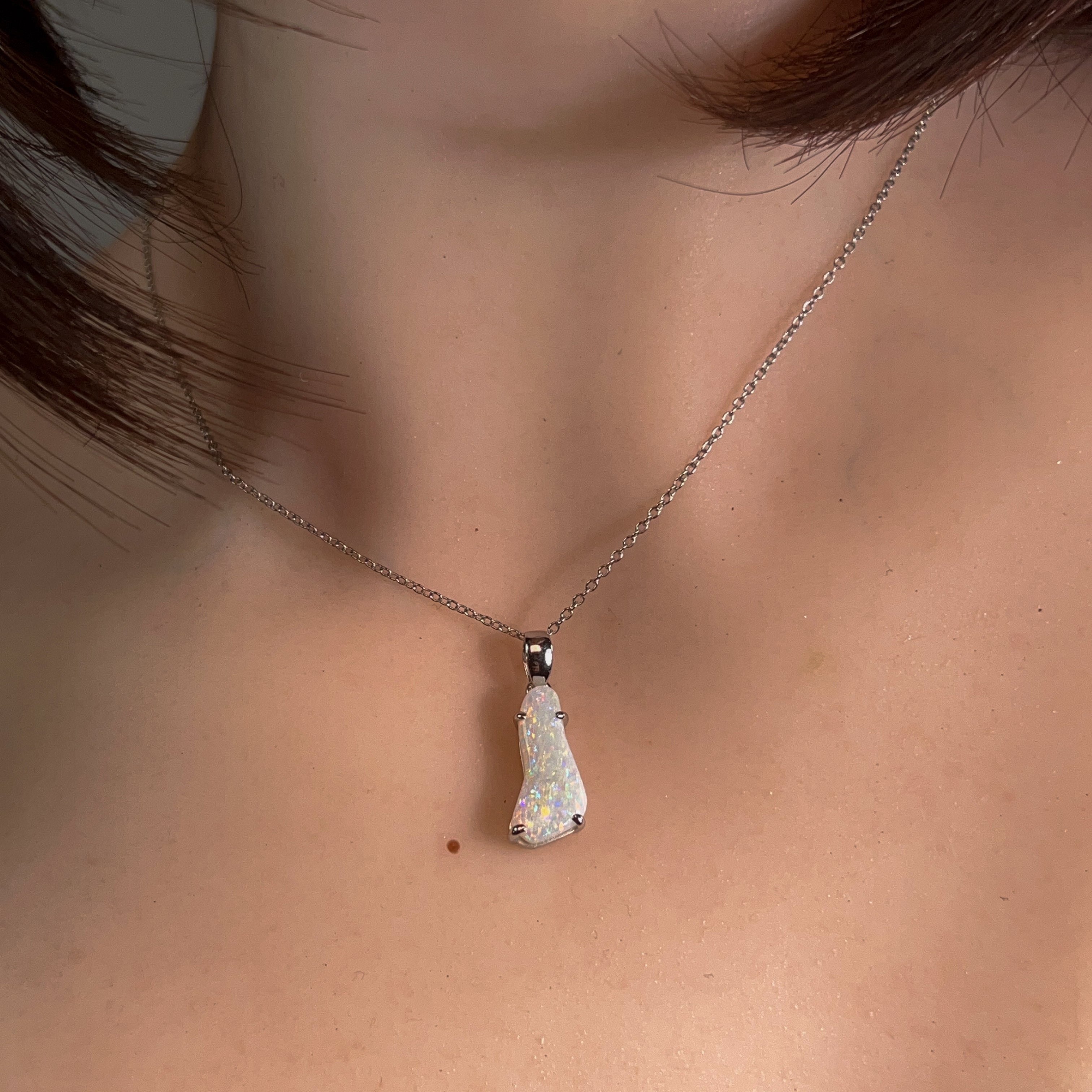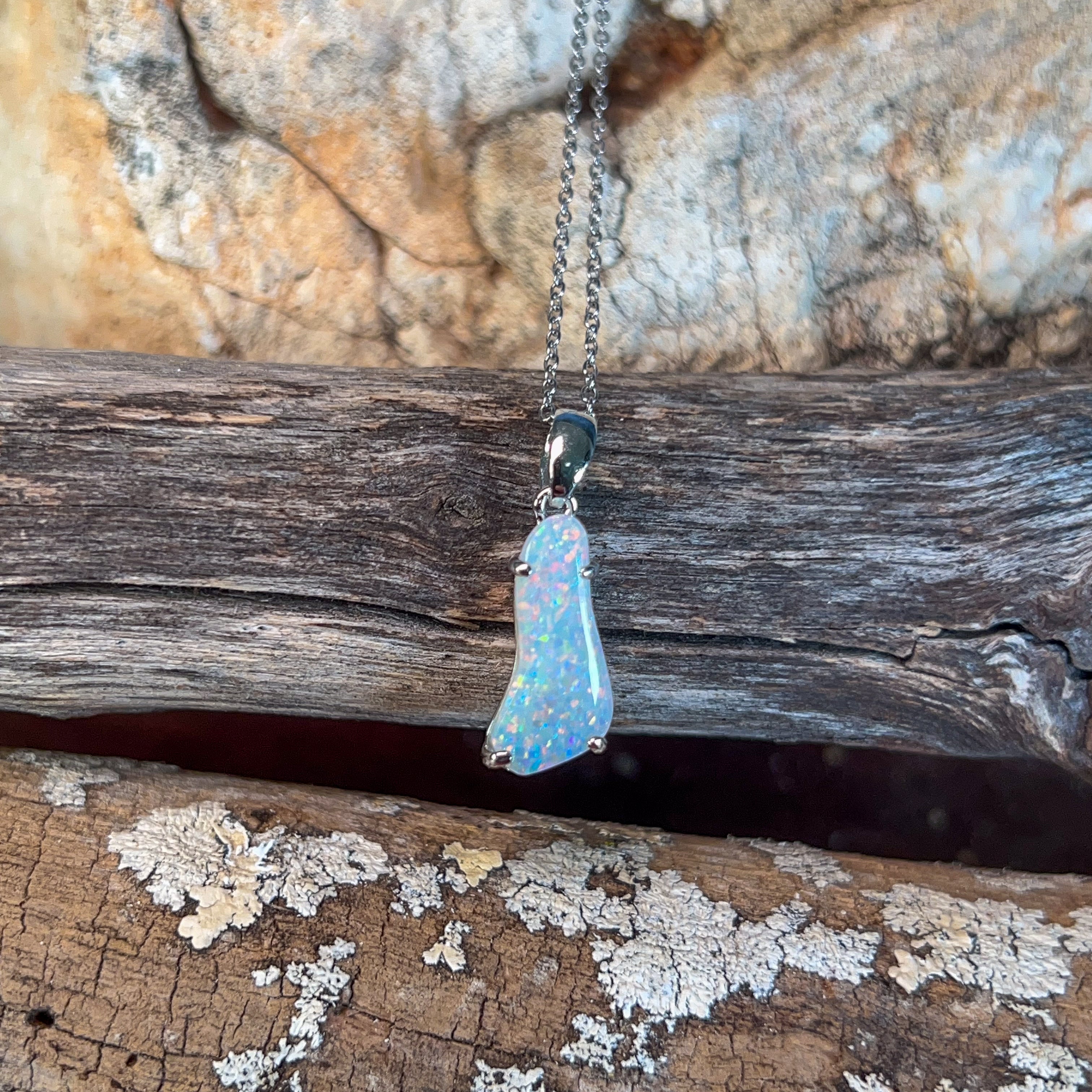 Discover the ethereal beauty of this sterling silver pendant, showcasing a captivating white opal freeform stone weighing 2.24 carats. Each piece celebrates the opal's mesmerizing play-of-colour, with its unique patterns and iridescent flashes that shift with every movement. Crafted in lustrous sterling silver, this pendant combines timeless elegance with natural artistry. Perfect for those seeking a distinctive statement piece that captures light and imagination, this freeform design ensures no two stones are identical. An investment in wearable art that transforms any ensemble into something truly extraordinary.