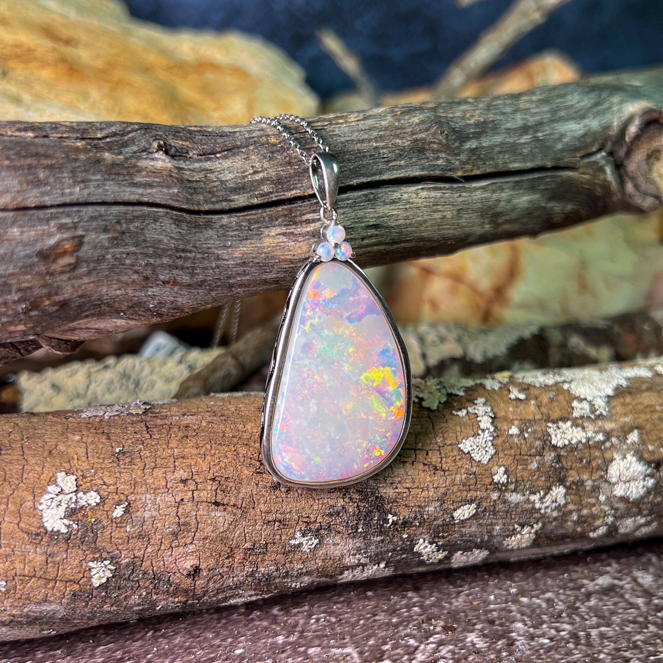 This stunning Sterling Silver White Opal pendant will make a bold and elegant statement. Featuring a beautiful white opal, this pendant is sure to catch the eye and add a touch of sophistication to any outfit. Elevate your style with the shimmering beauty of this opal pendant.