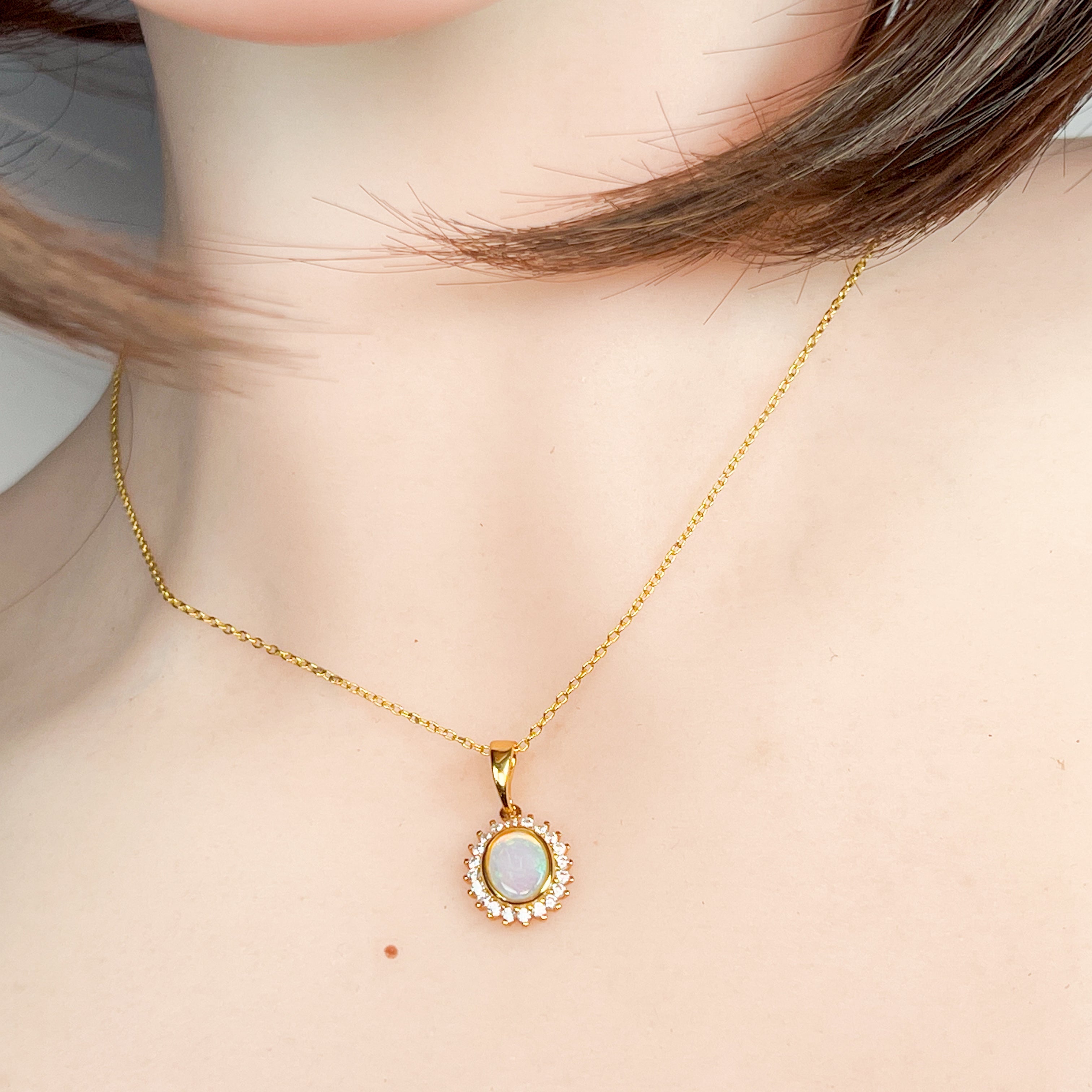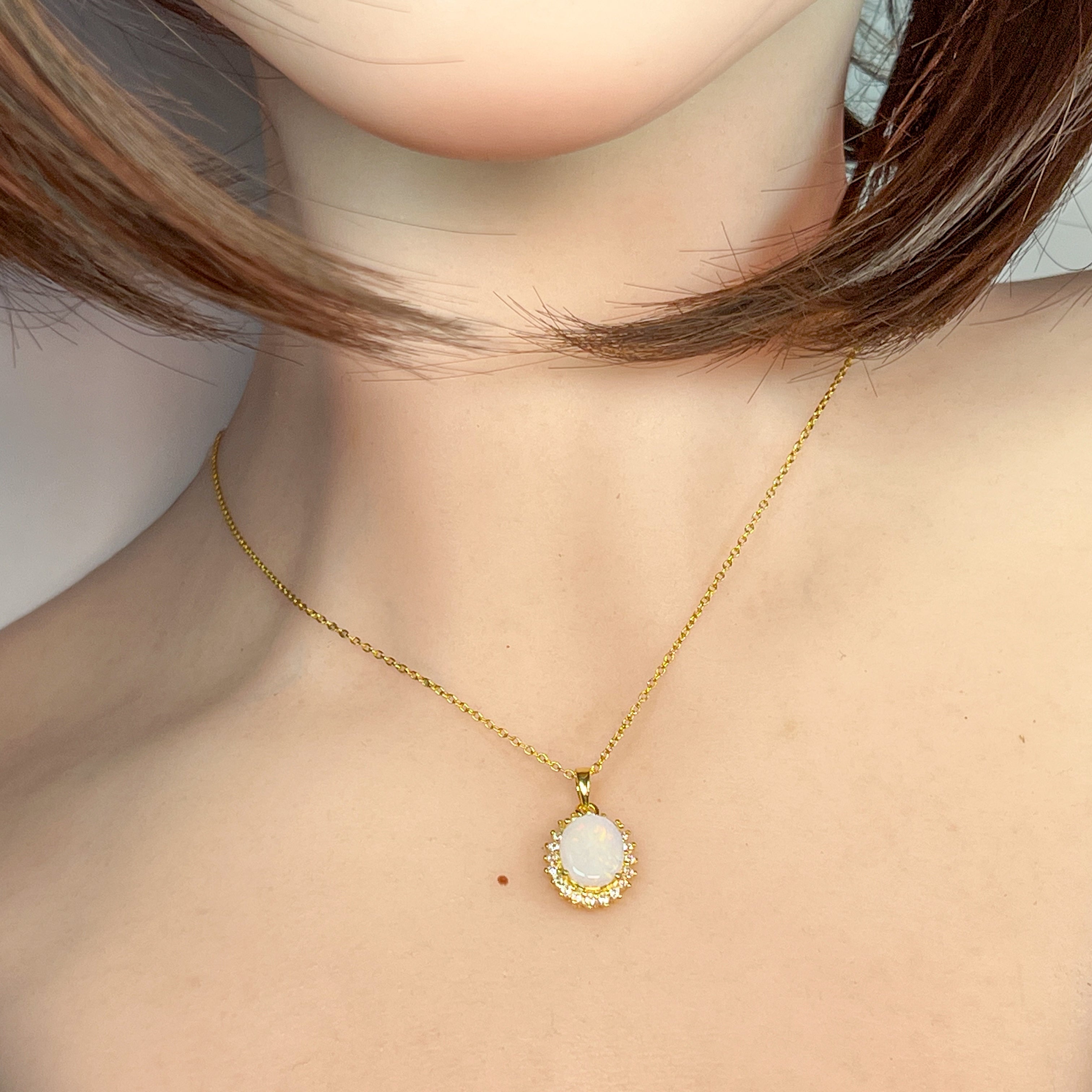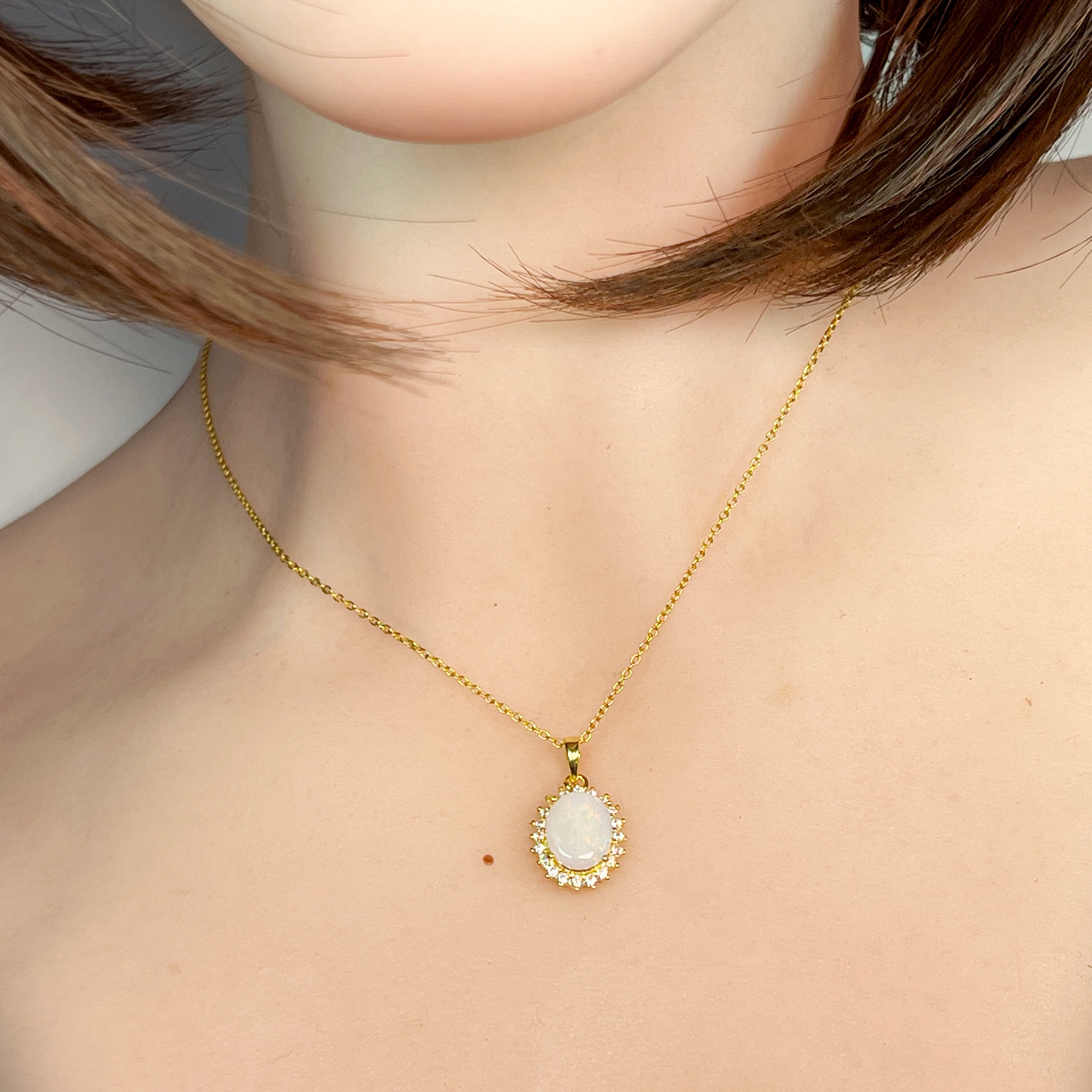 An opal gold necklace with a short pendant, such as the 18KT Yellow Gold Crystal Opal and Diamond Pendant, is excellent for people with short necklines.