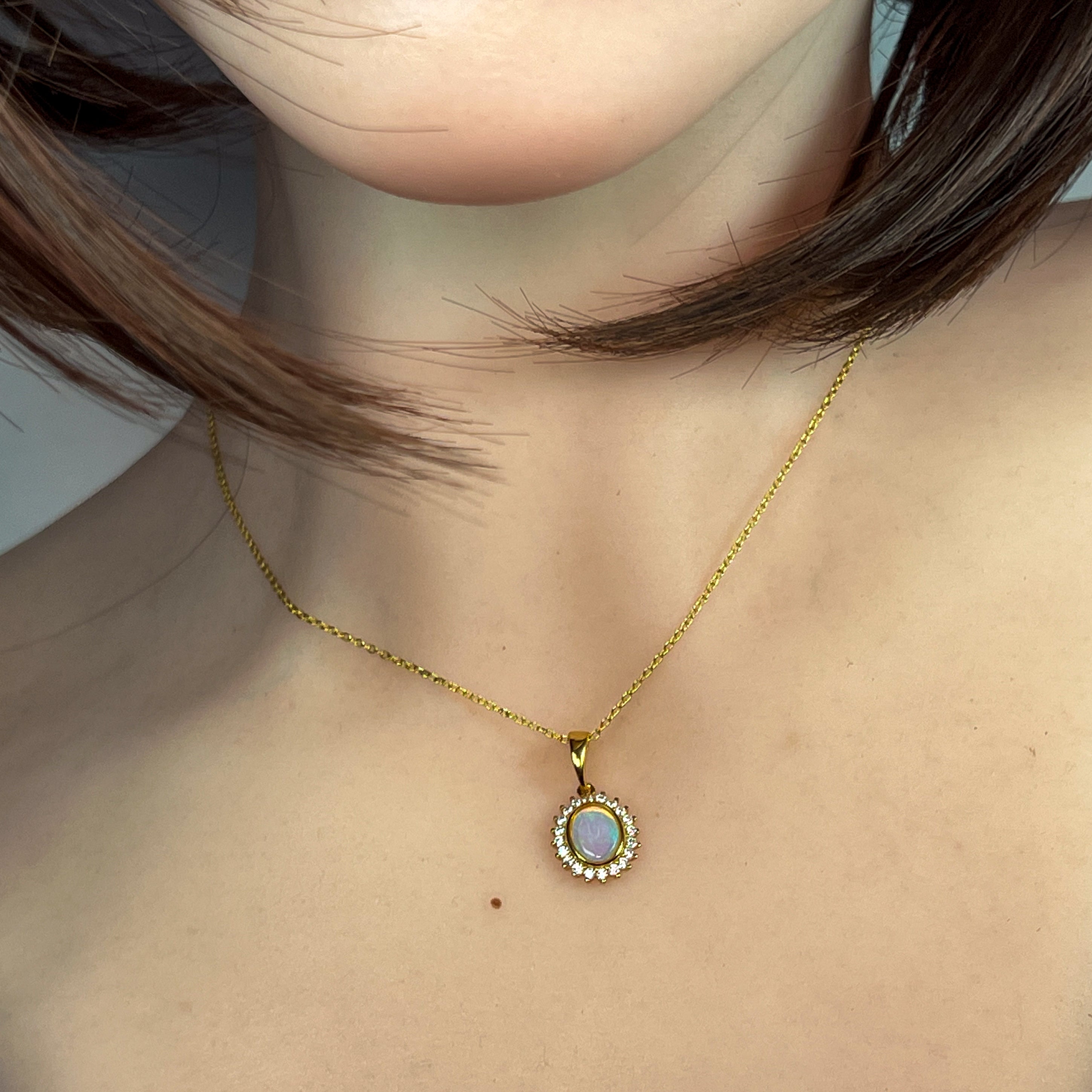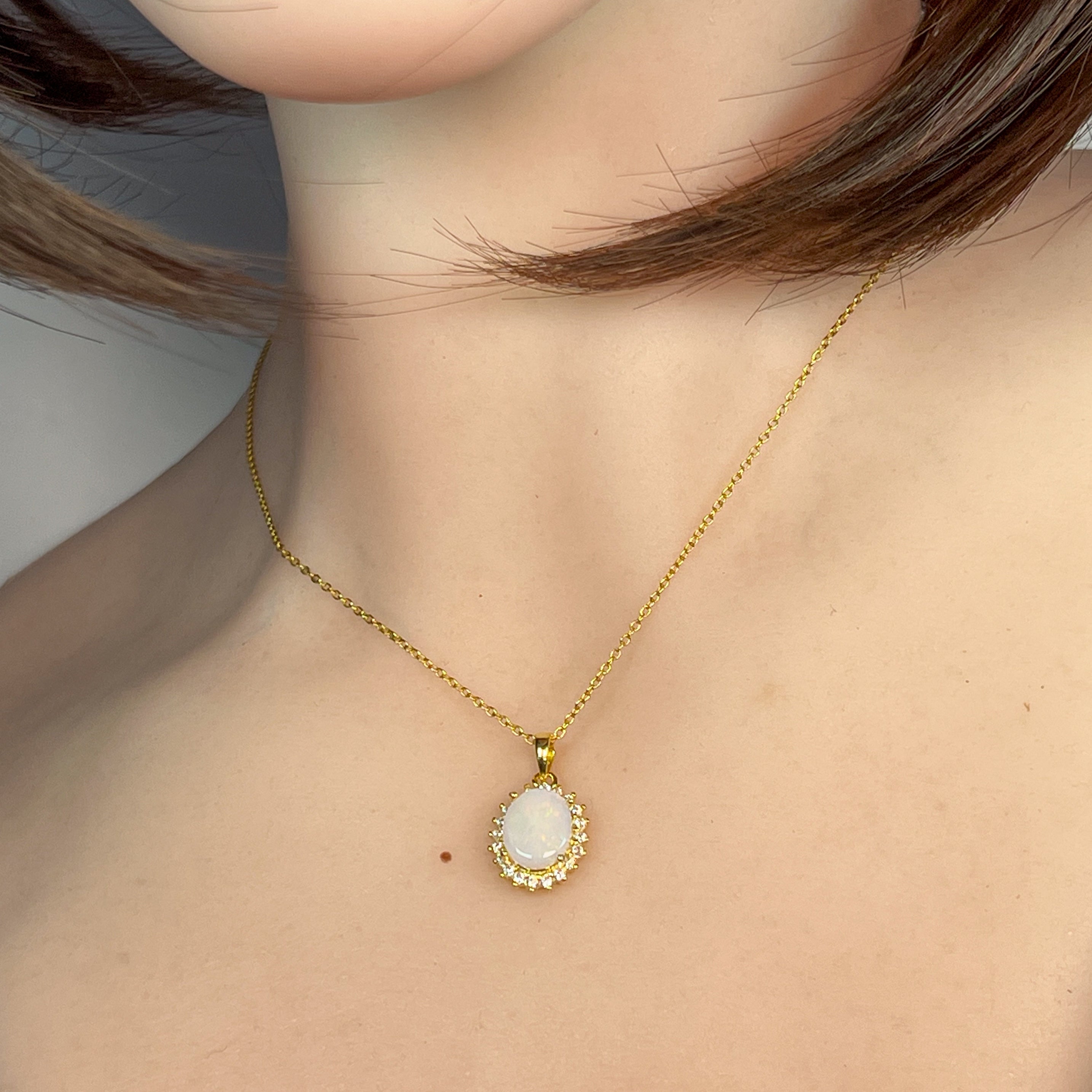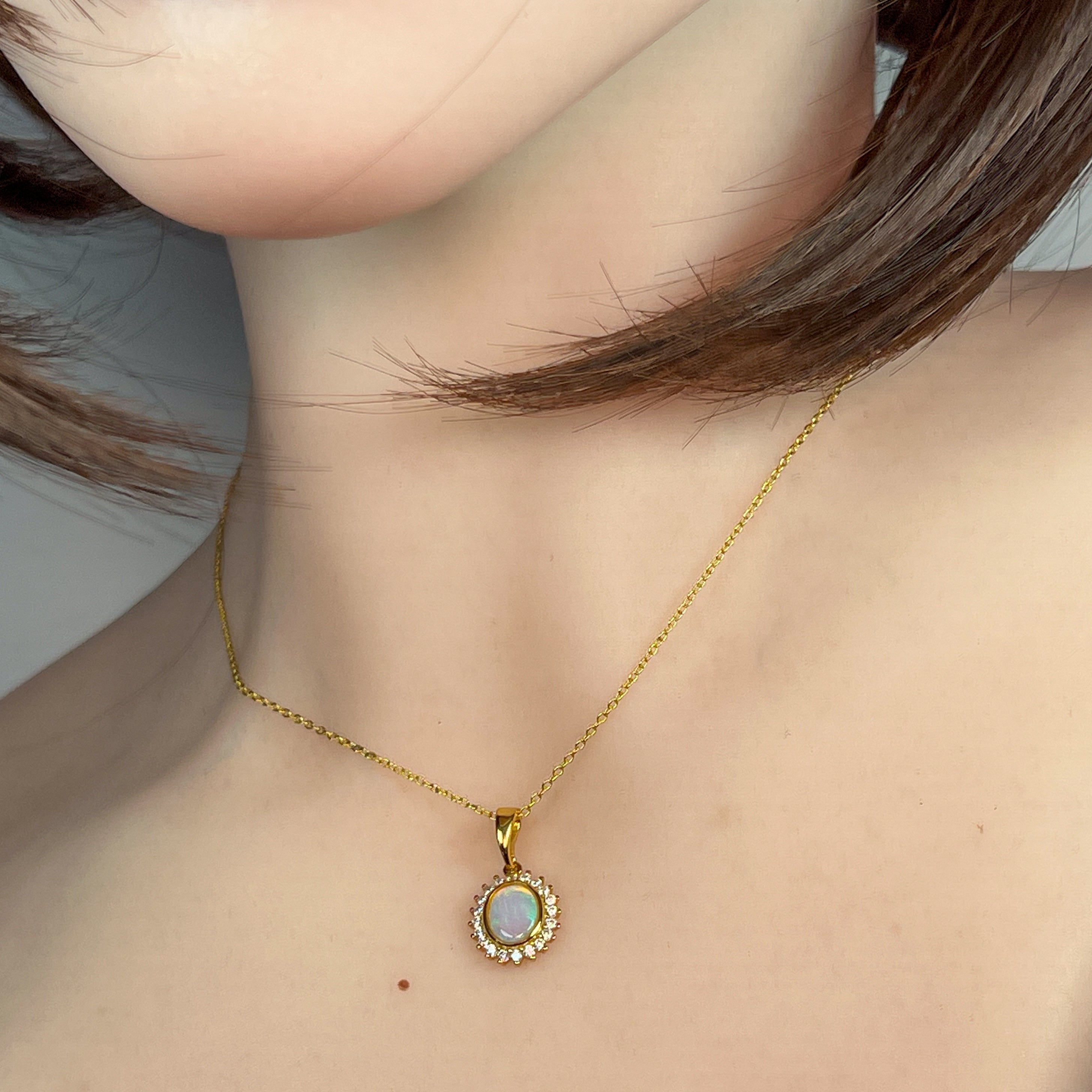 An opal gold necklace with a short pendant, such as the 18KT Yellow Gold Crystal Opal and Diamond Pendant, is excellent for people with short necklines.