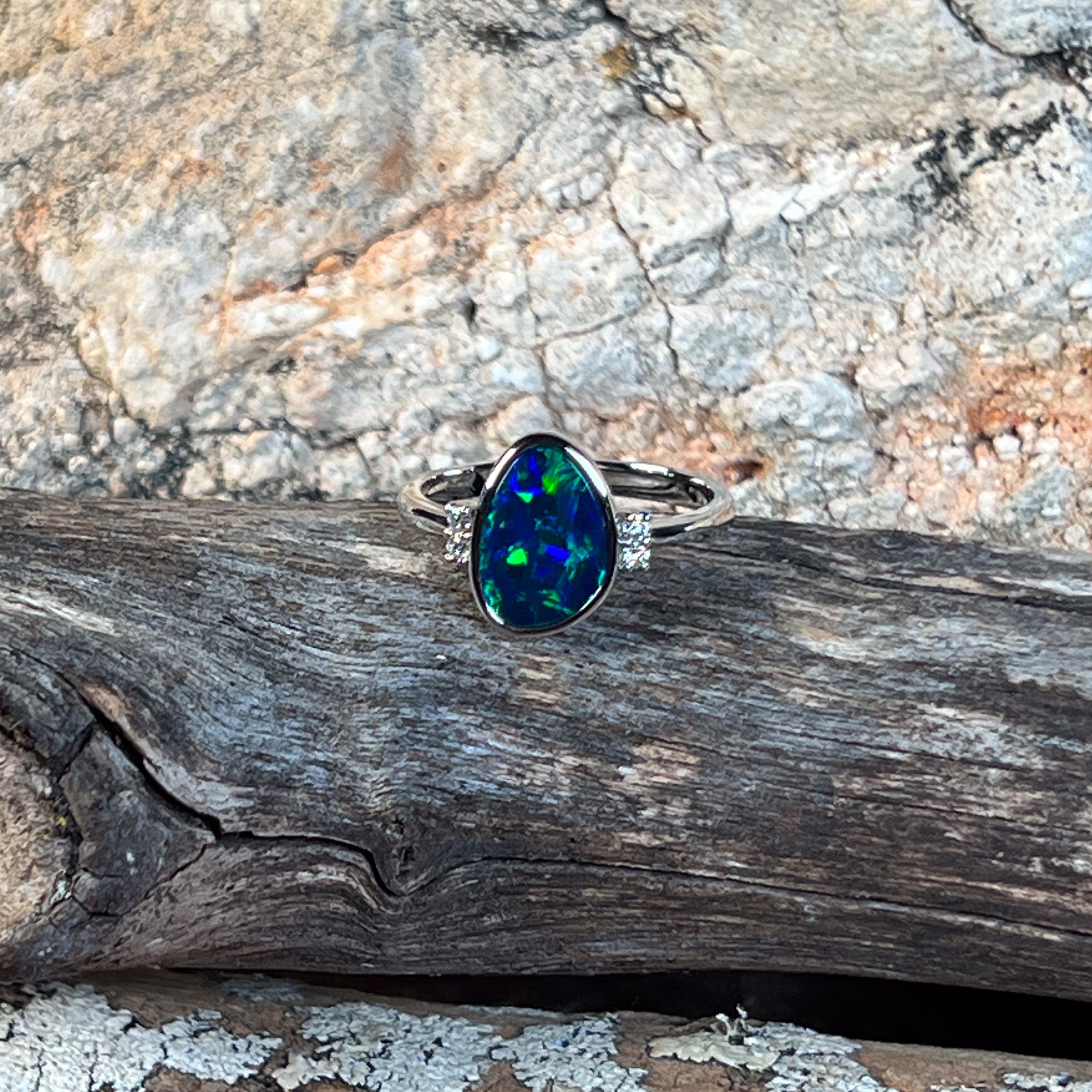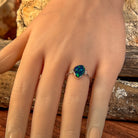 Dive into enchantment with this stunning 14kt white gold ring, where a mesmerizing 1.58ct opal doublet steals the show with its deep forest and ocean hues. Complemented by sparkling 0.08ct diamonds that catch the light like dewdrops on morning leaves, this piece captures the magic of nature's most captivating palette. Perfect for those who adore jewellery that tells a story of mystery and wonder, this ring brings a touch of the wild, serene beauty of untamed landscapes straight to your finger.