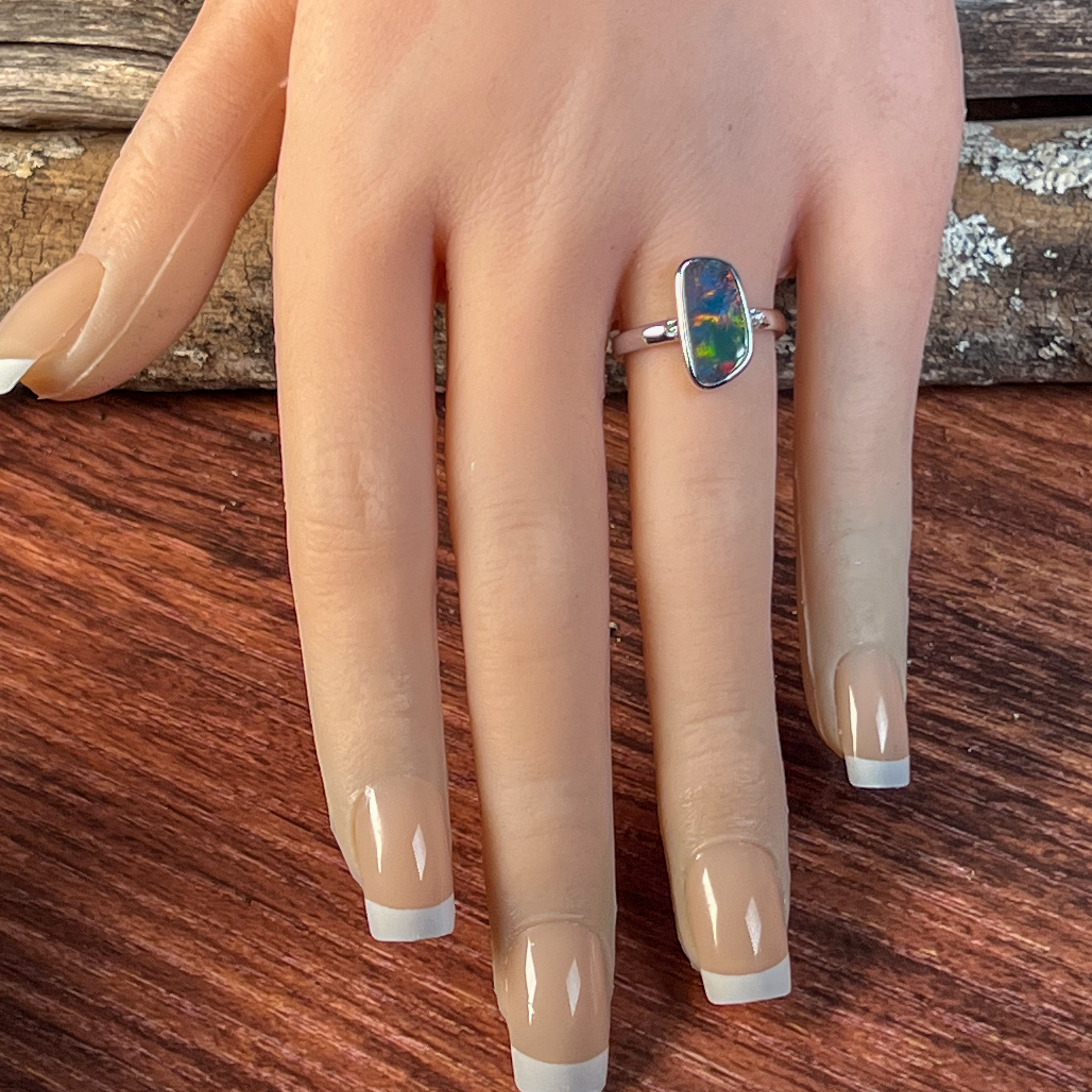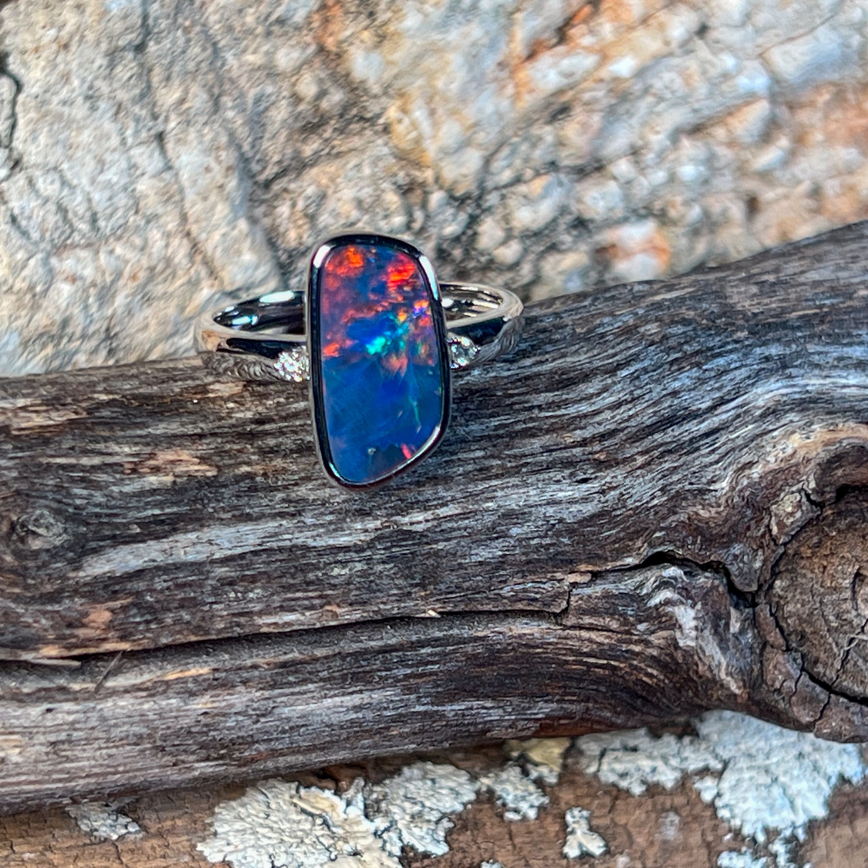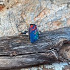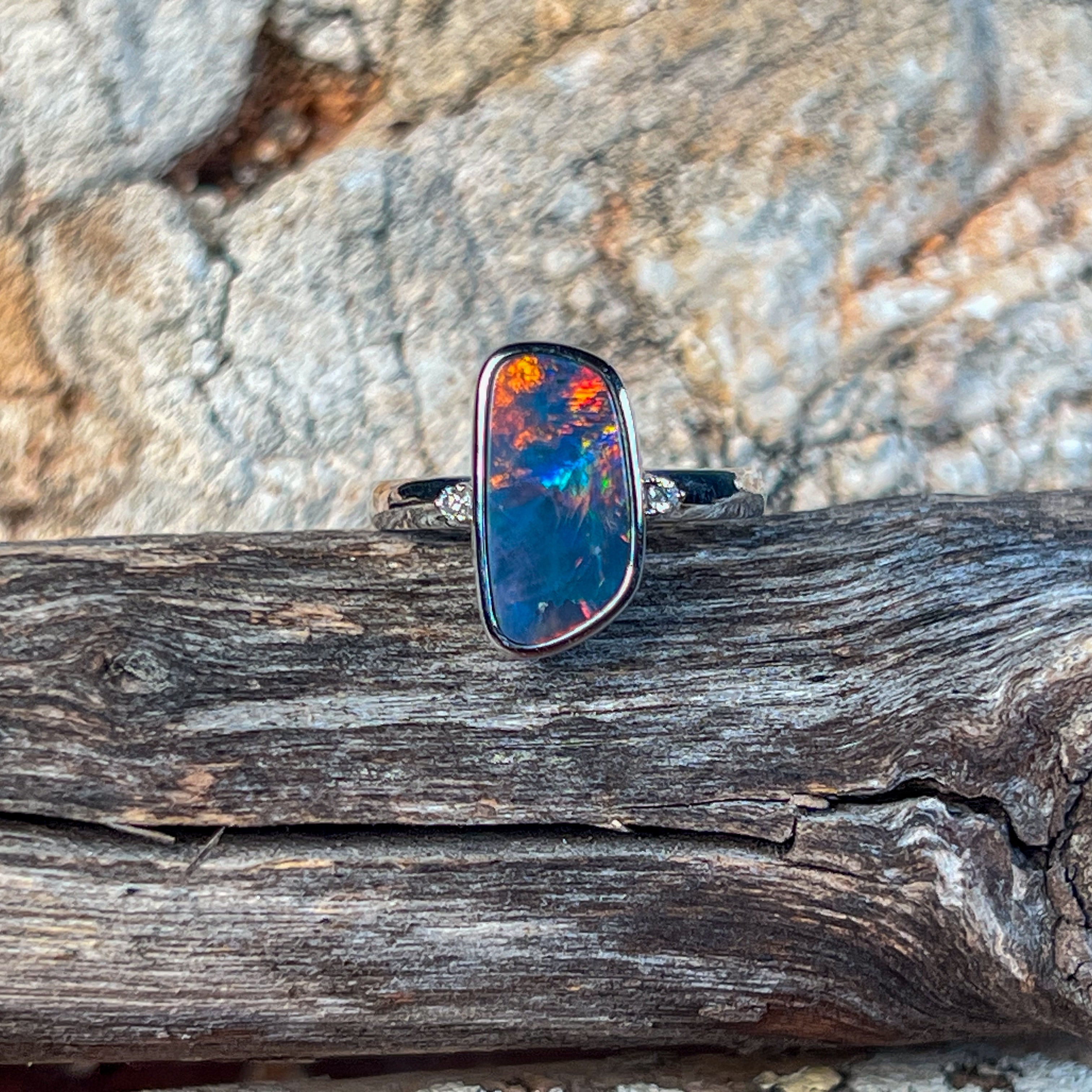 14kt White Gold Red Blue Opal doublet and diamond ring