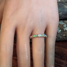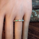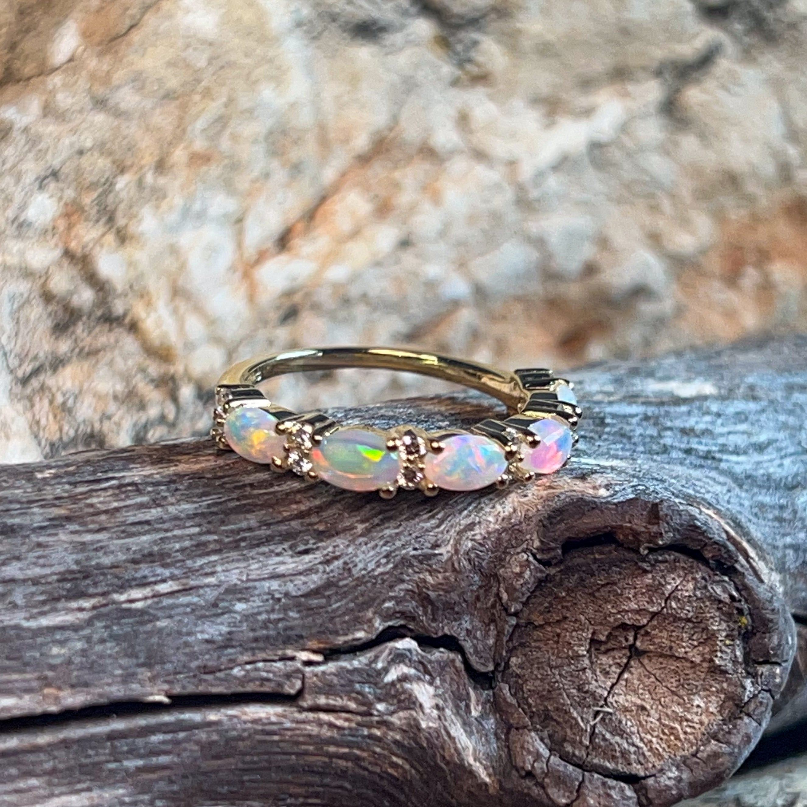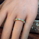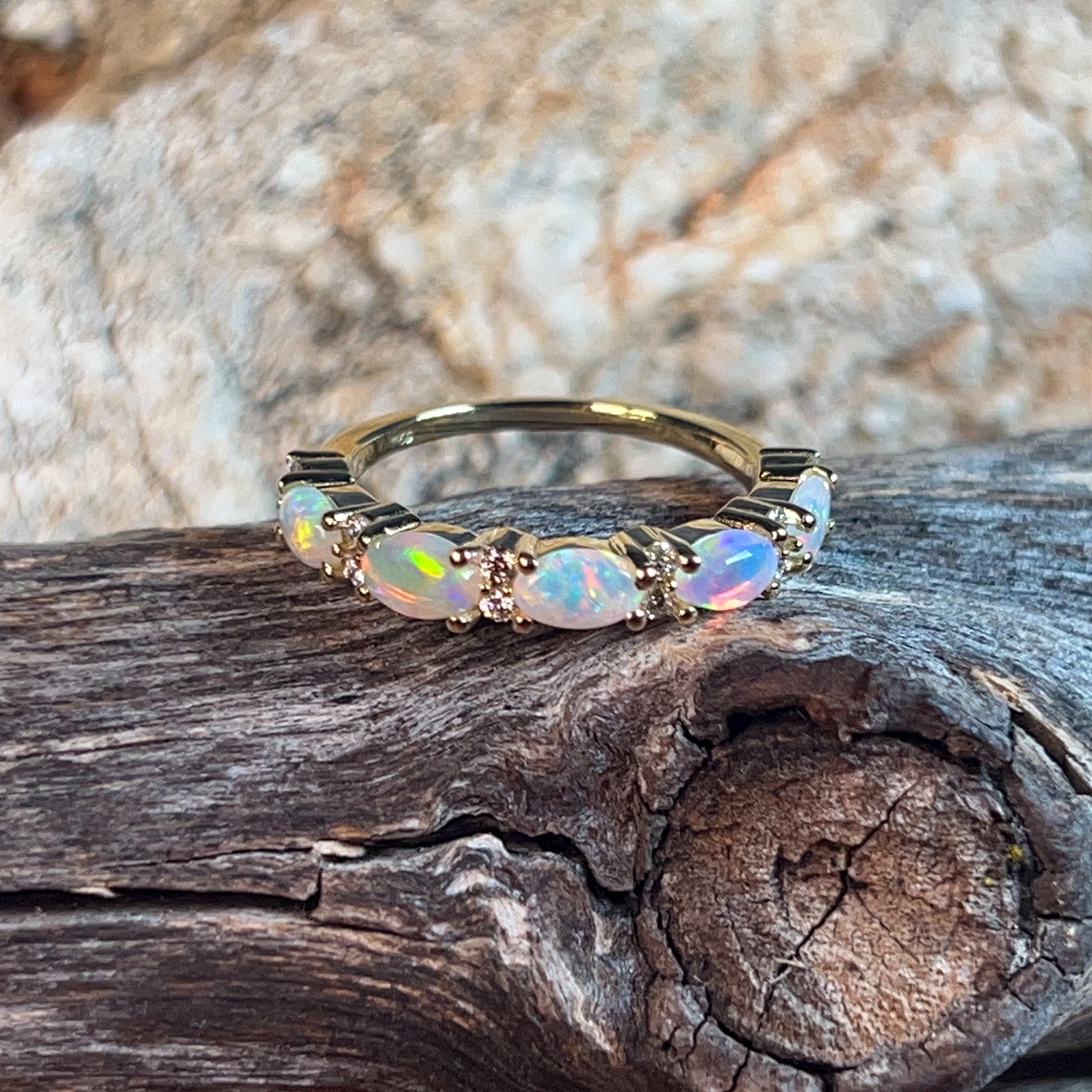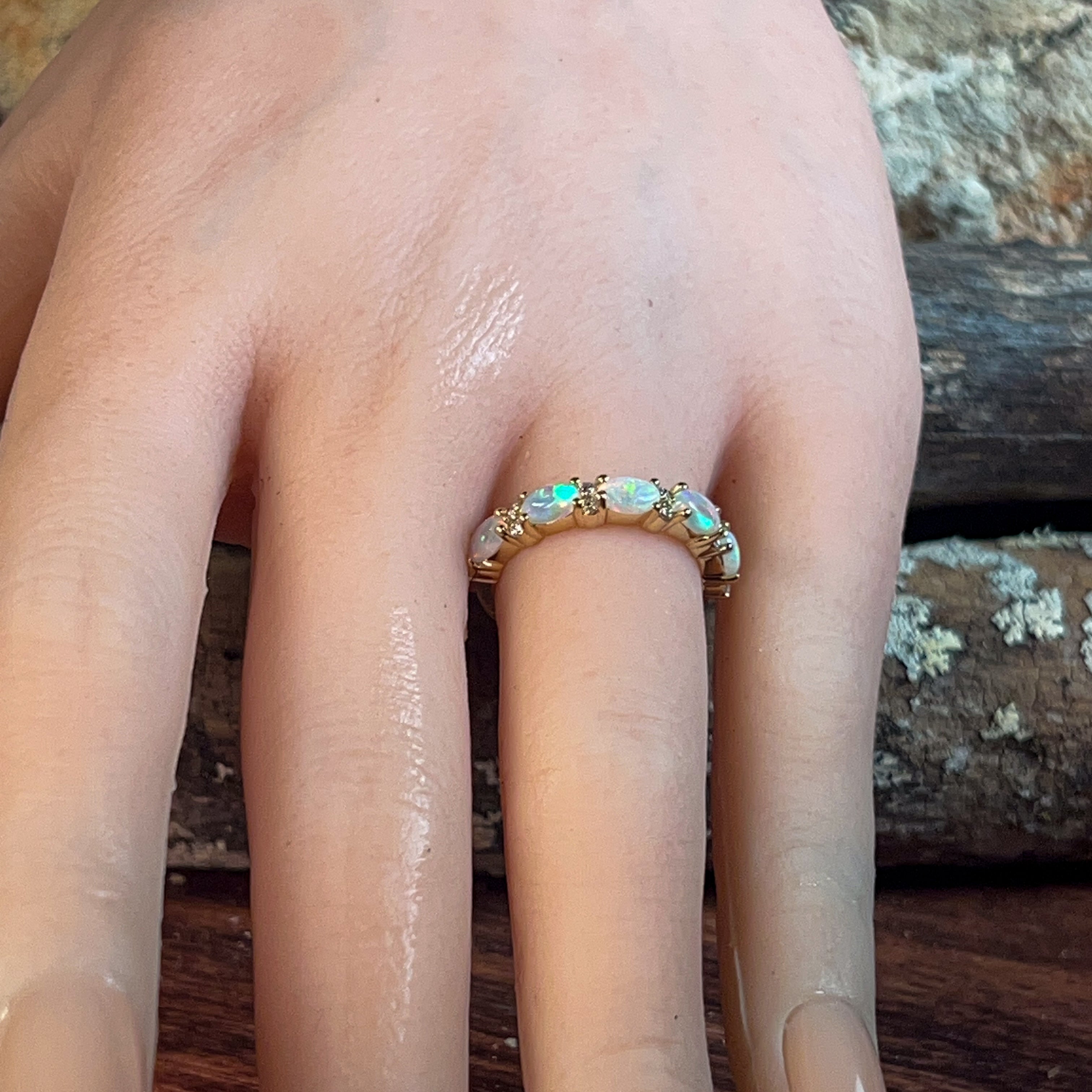 Celebrate forever with this stunning 18kt yellow gold eternity ring, where lustrous opals dance alongside sparkling diamonds in a timeless design. Each opal catches the light with mesmerizing flashes of colour, creating a ring that's as unique as your love story. The continuous band symbolises endless devotion, while the luxurious gold setting ensures this beauty will be treasured for generations. Perfect for those who dare to be different—because your engagement ring should be as extraordinary as you are.