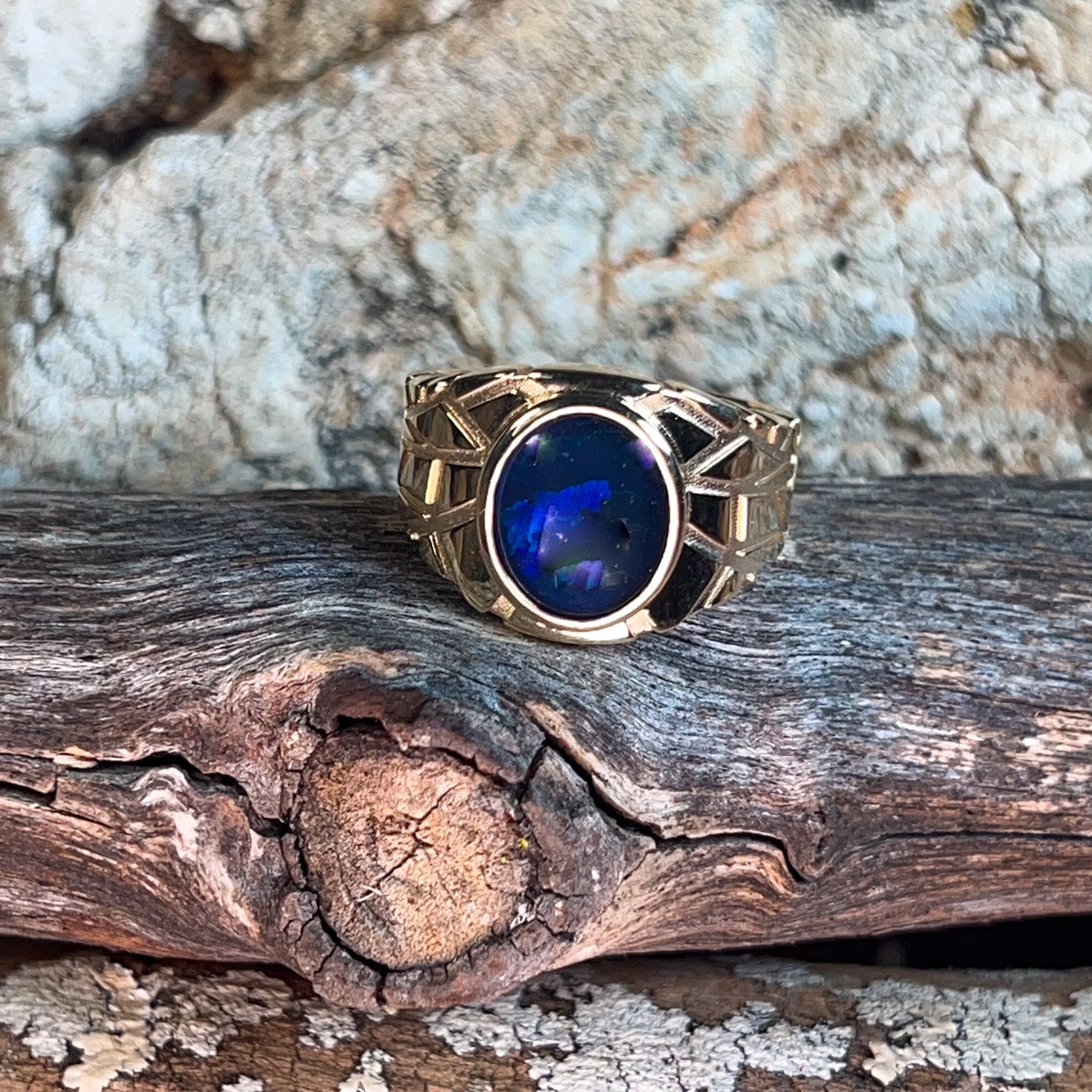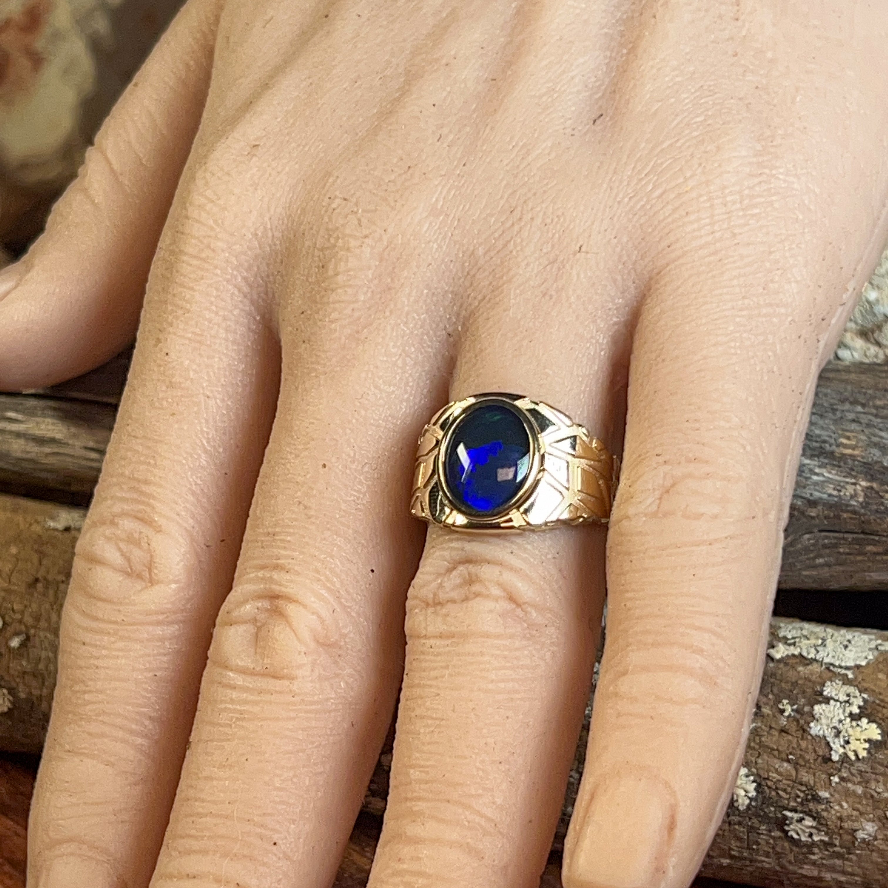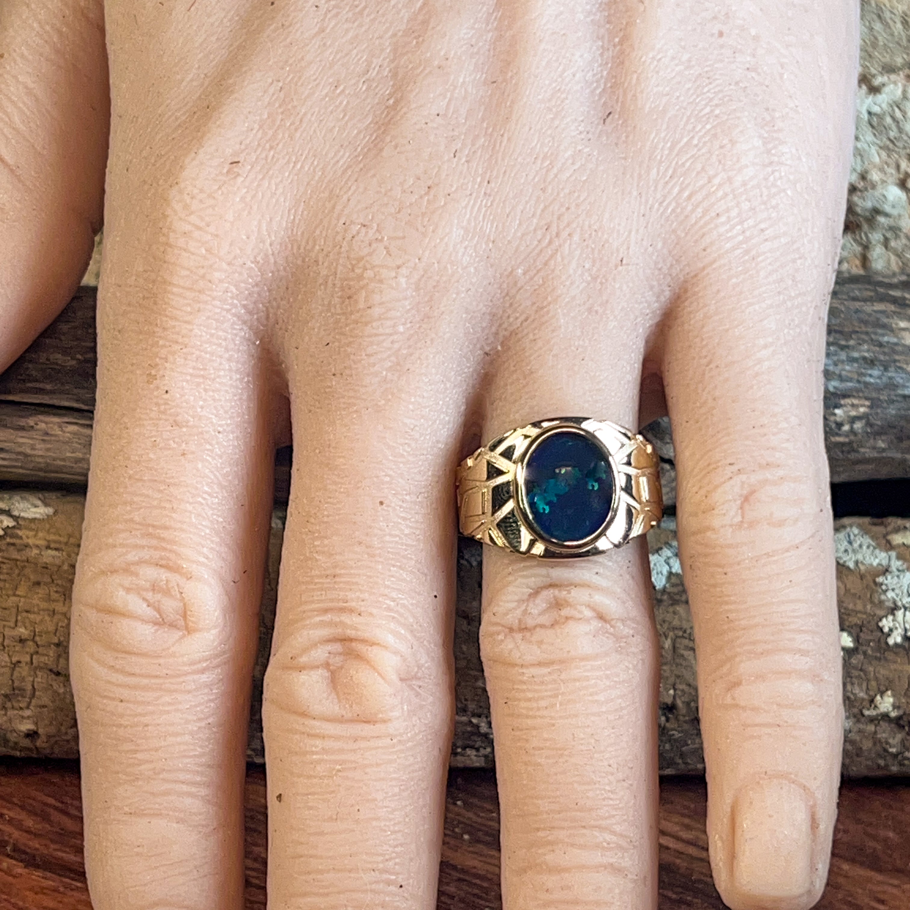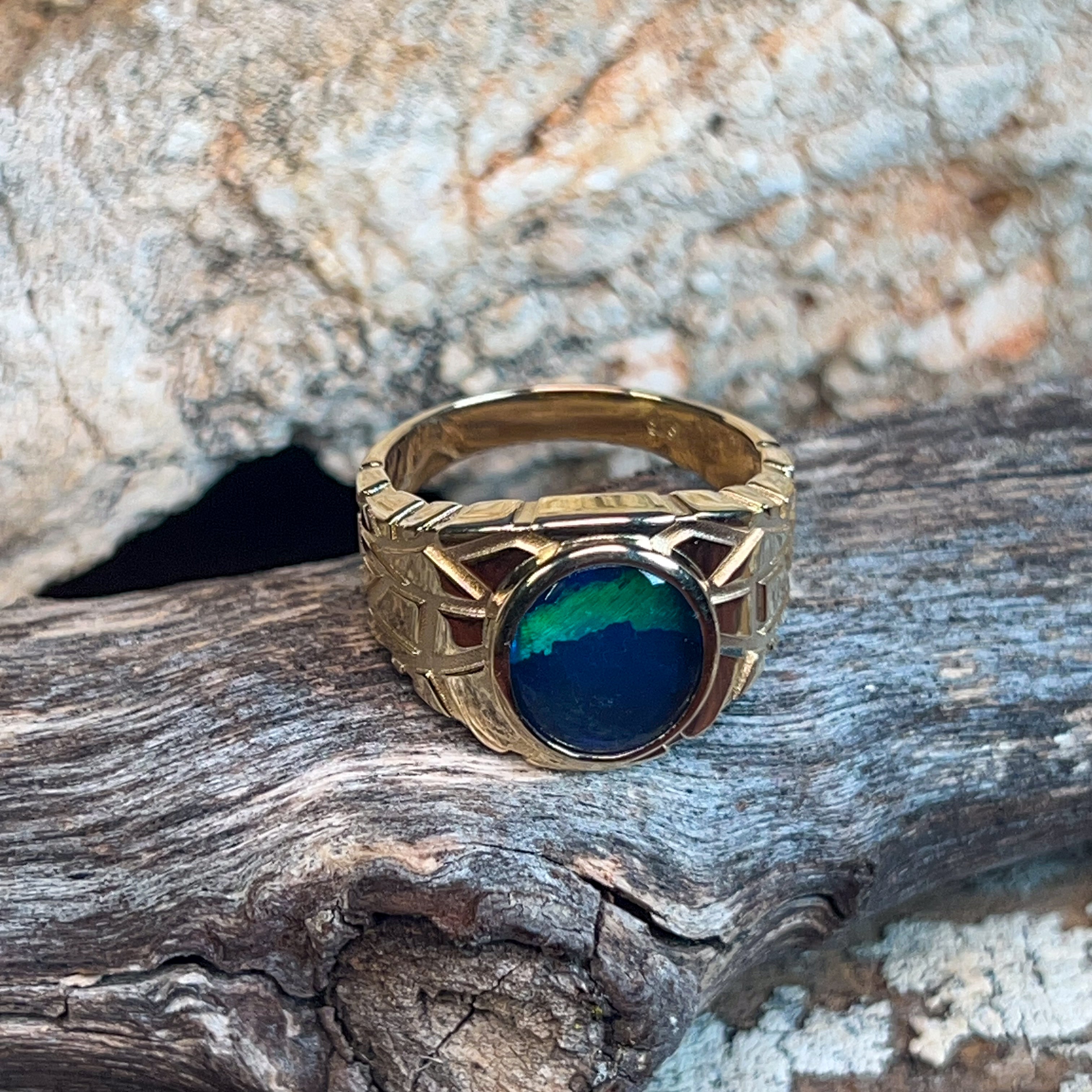 9kt Yellow Gold gents signet style ring with a 12x10mm Opal triplet bezel set