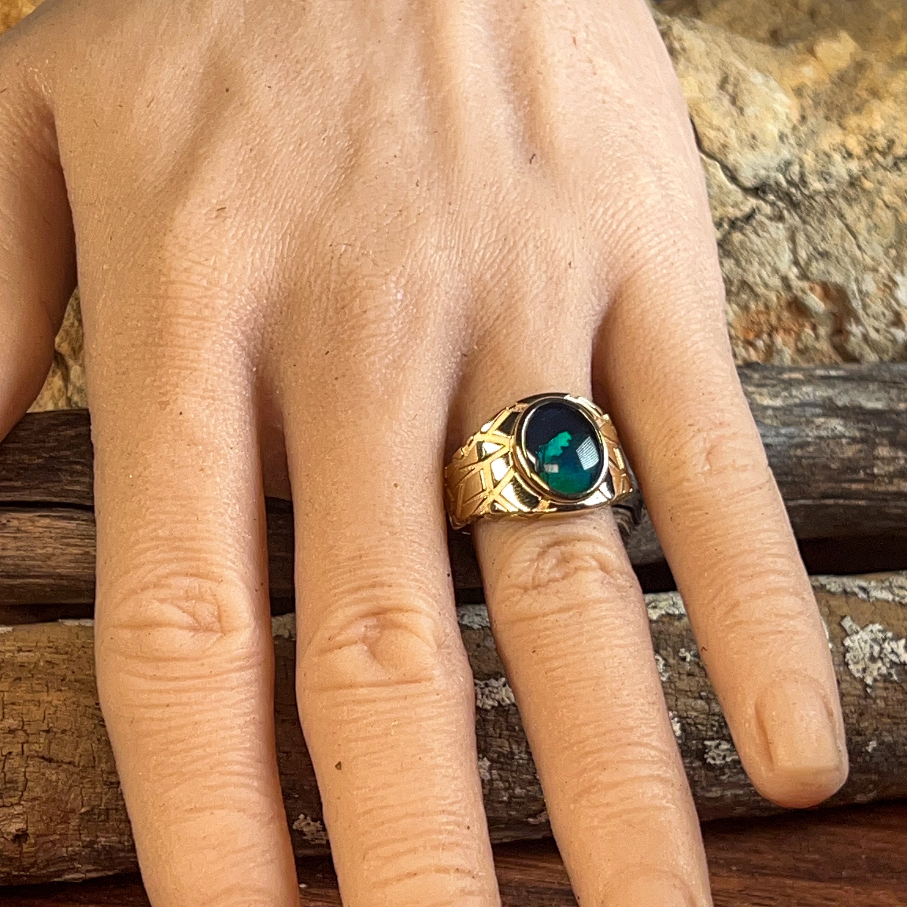 Make a statement with this charming 9kt yellow gold gents signet ring, where timeless style meets natural beauty. The striking 12x10mm opal triplet takes centre stage in a classic bezel setting, showcasing those mesmerising flashes of colour that make opals so captivating. Perfect for the modern gentleman who appreciates a touch of personality—this patterned beauty works equally well as an everyday treasure or a special occasion showstopper. Solid gold craftsmanship meets playful gemstone magic.
